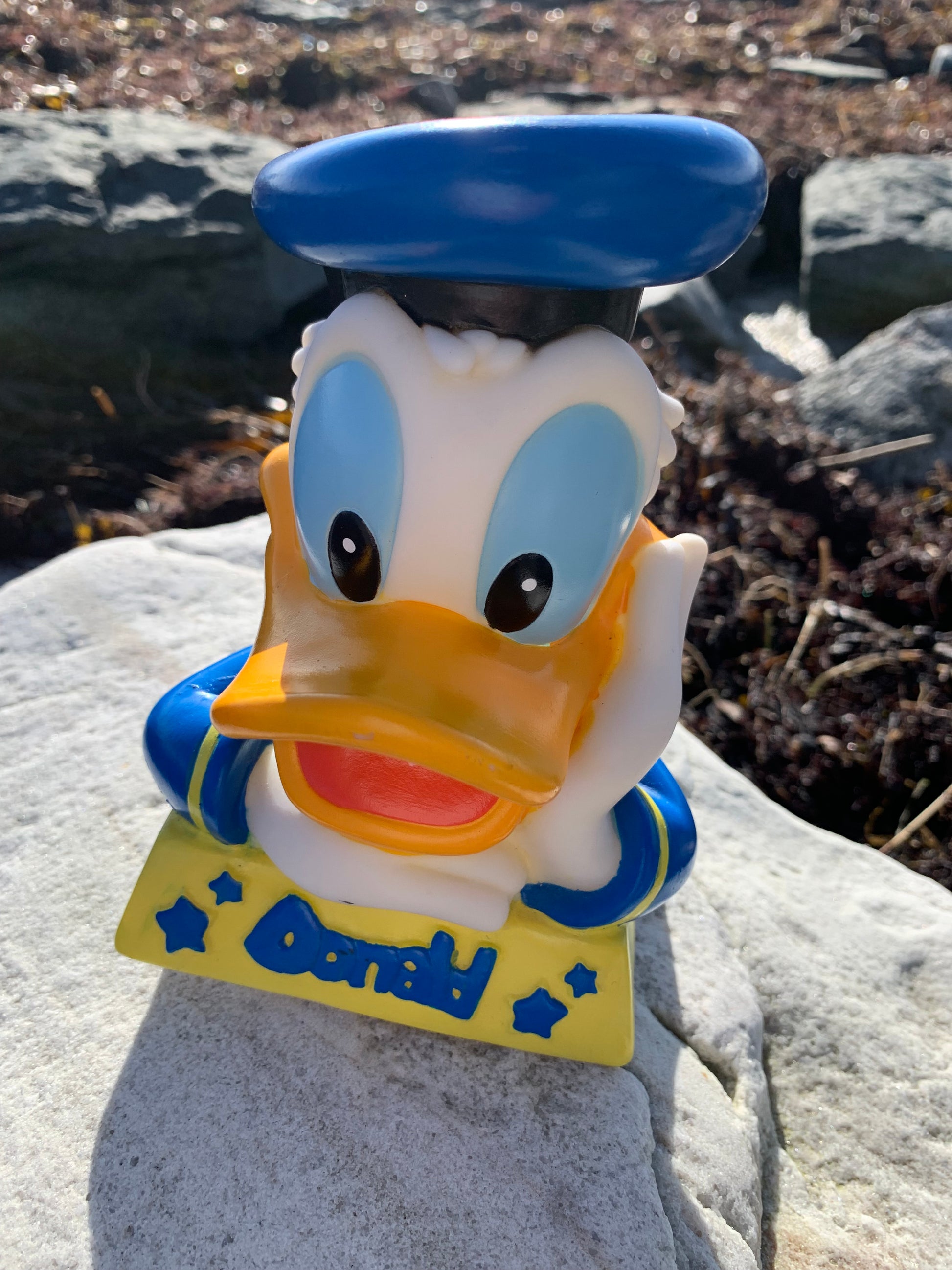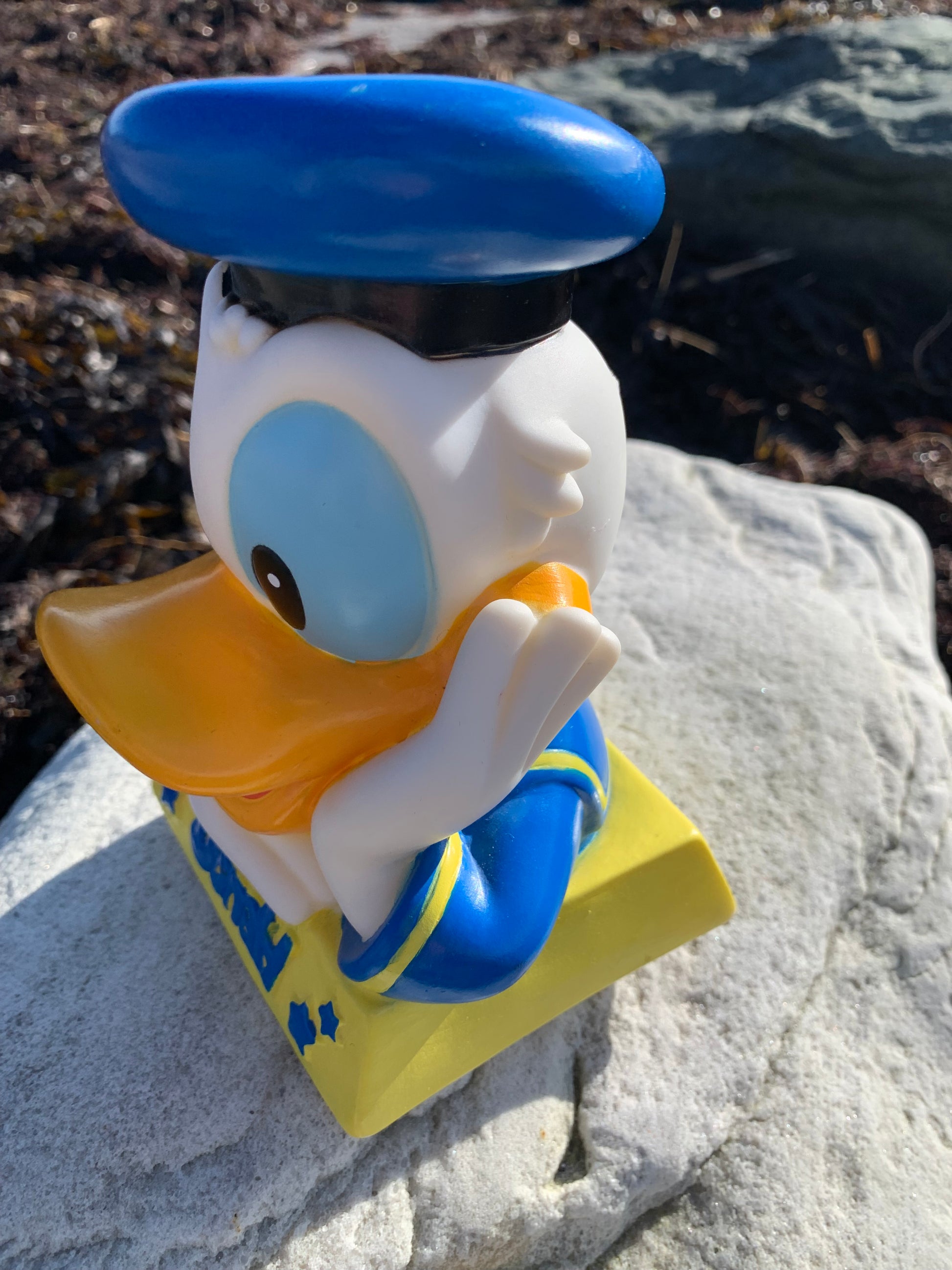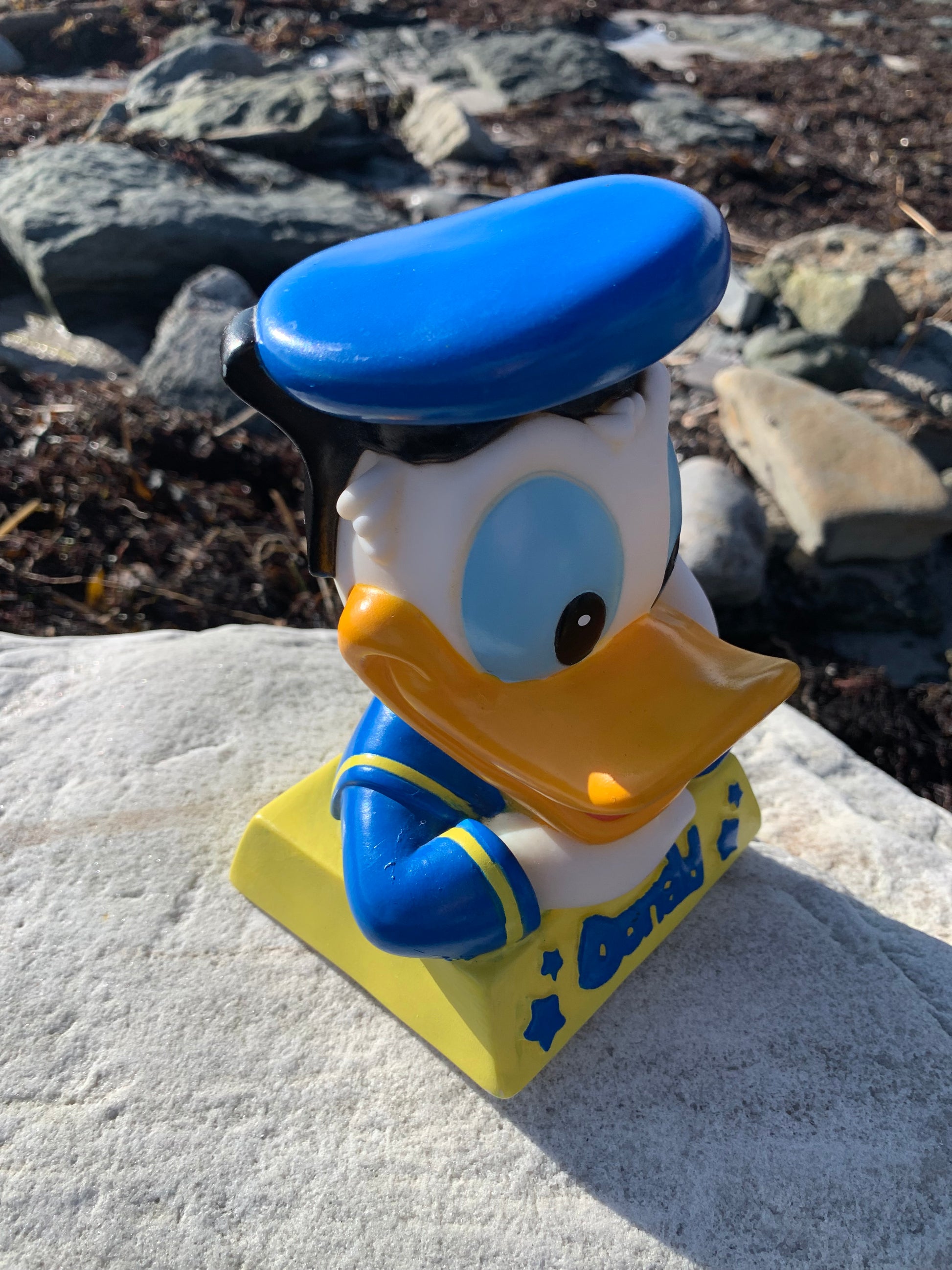 Original Donald Duck Sparschwein von Disney, hergestellt aus Kunststoff.