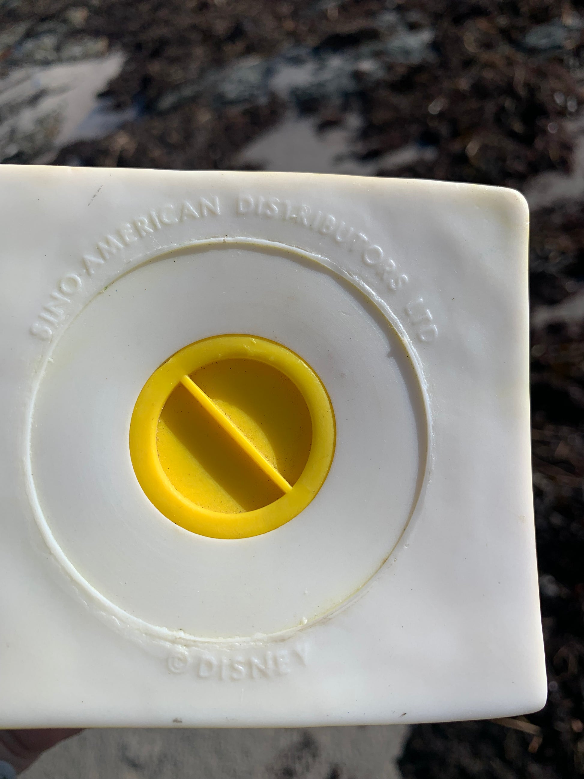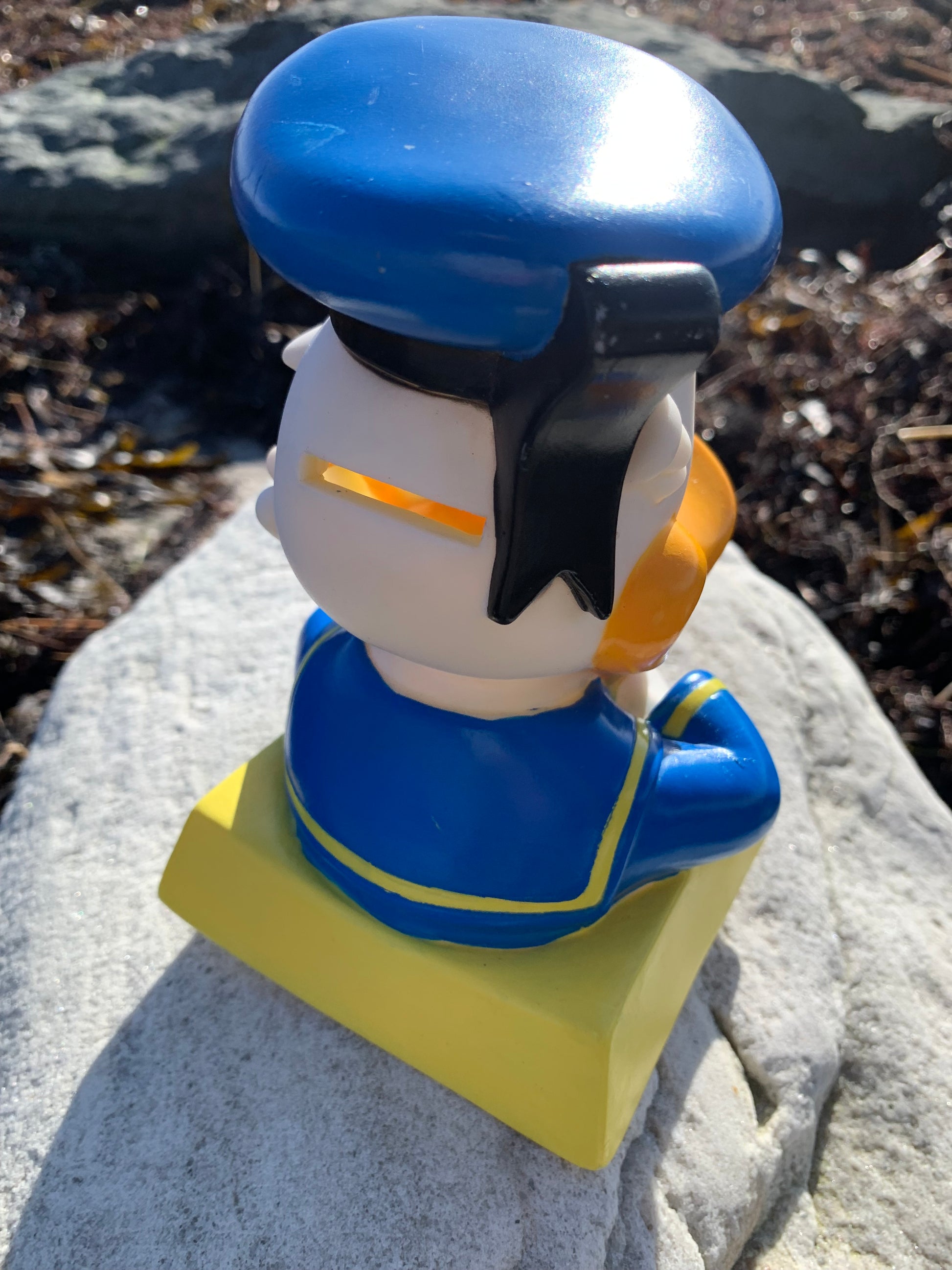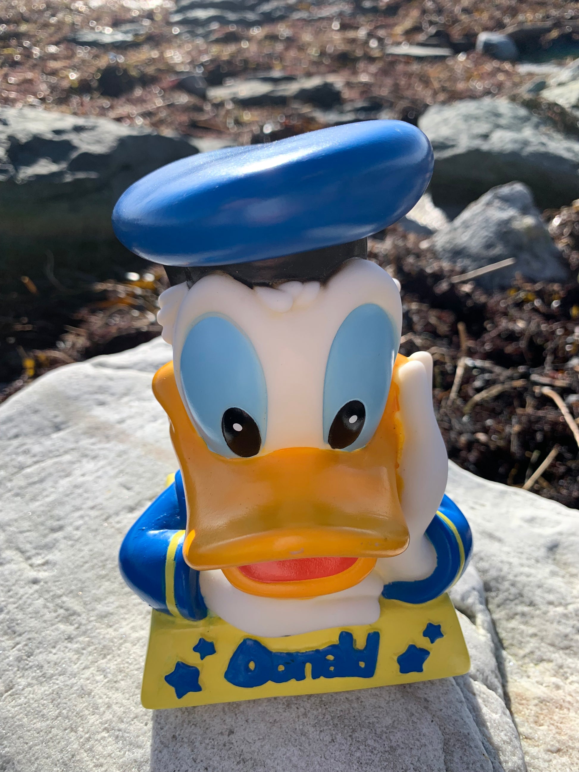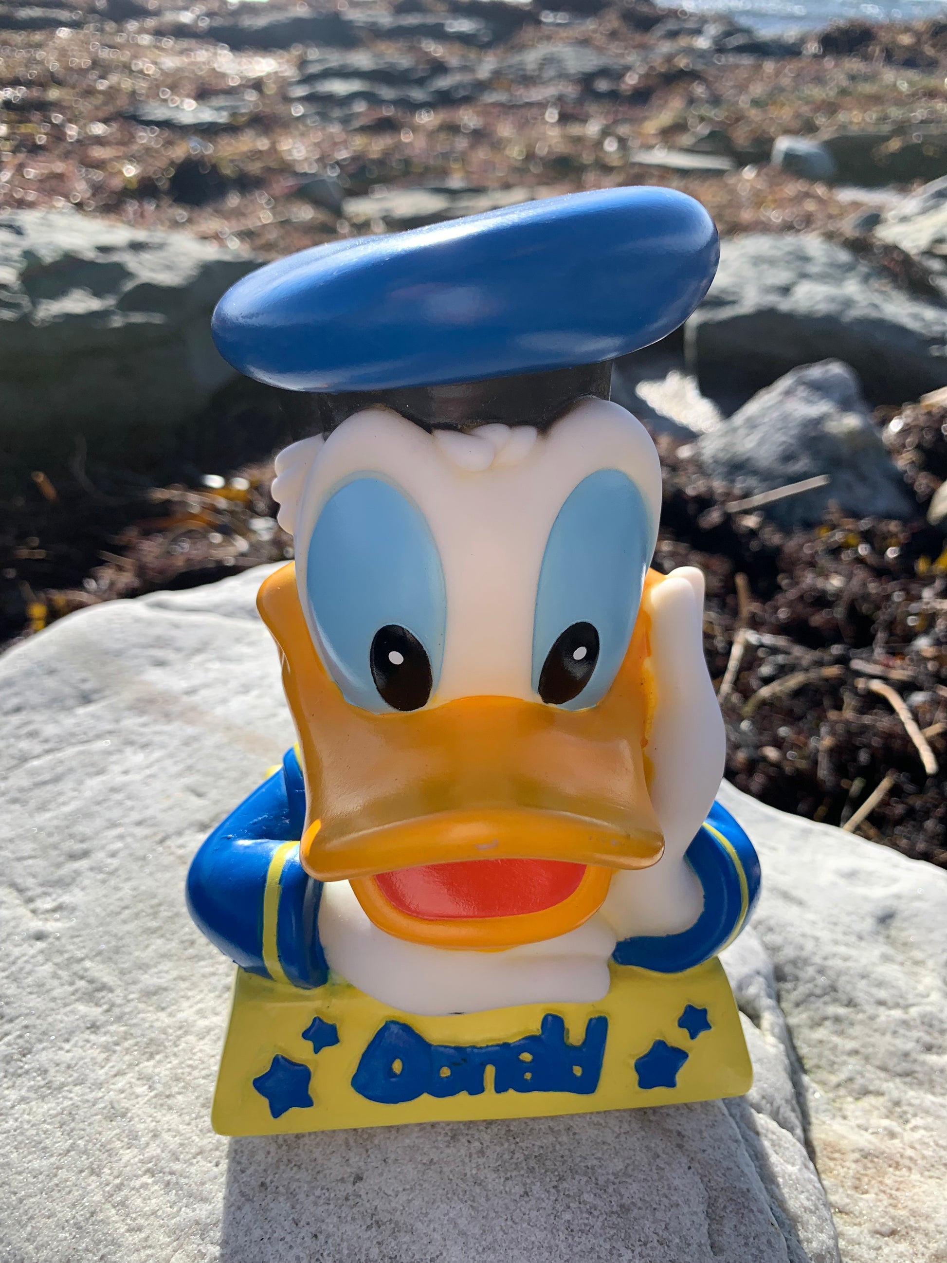 Original Donald Duck Sparschwein von Disney, hergestellt aus Kunststoff.
