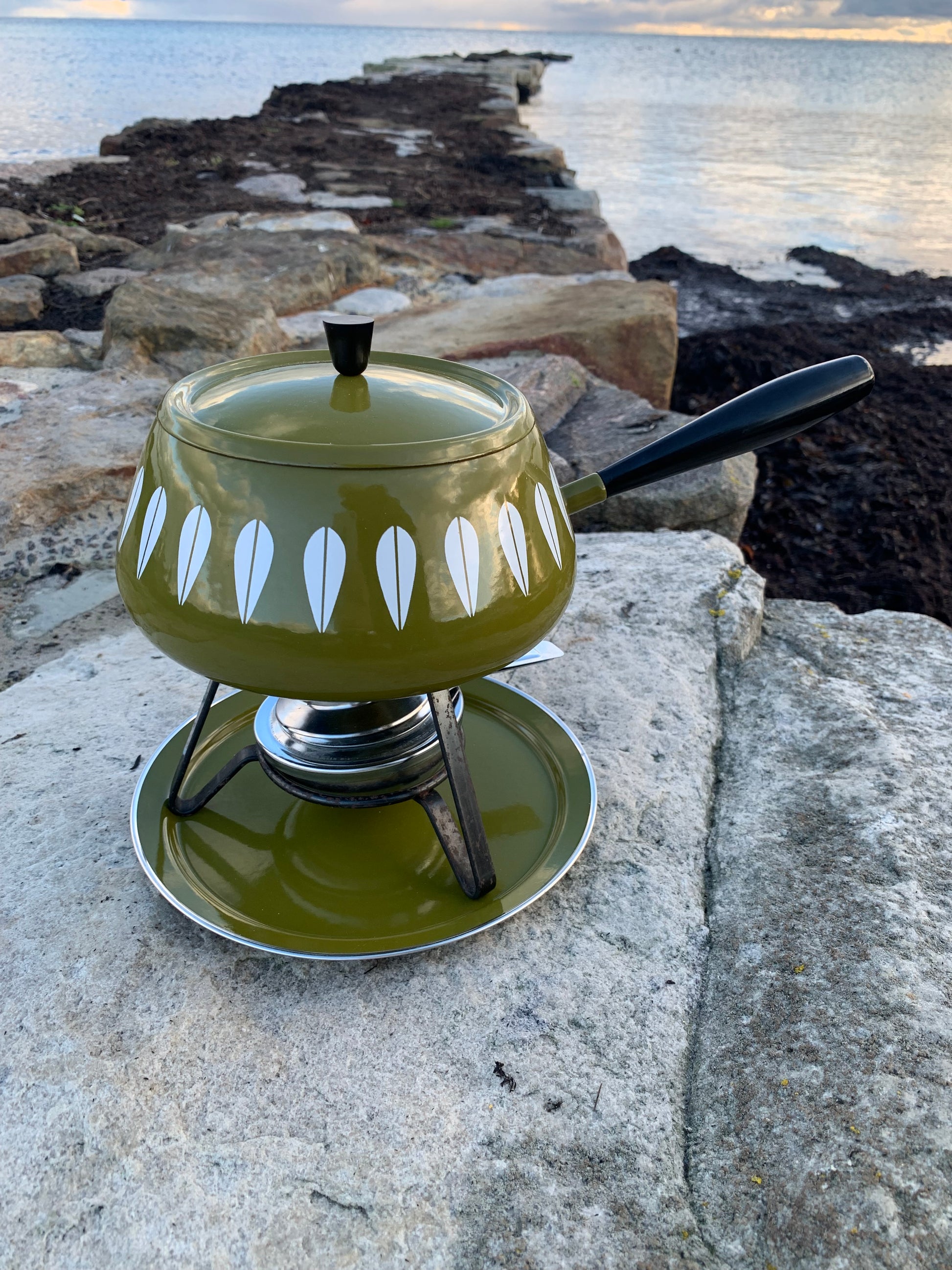 Seltenes und wunderschönes Exemplar des klassischen Cathrineholm Lotus Fondue-Sets. Der Topf und die anderen Teile weisen, dem Alter entsprechend, nur sehr geringe Gebrauchsspuren auf (der Deckel hat eine kleine Emaille-Absplitterung – siehe Foto). Hier wurde Recycling in seiner schönsten Form meisterhaft umgesetzt.
