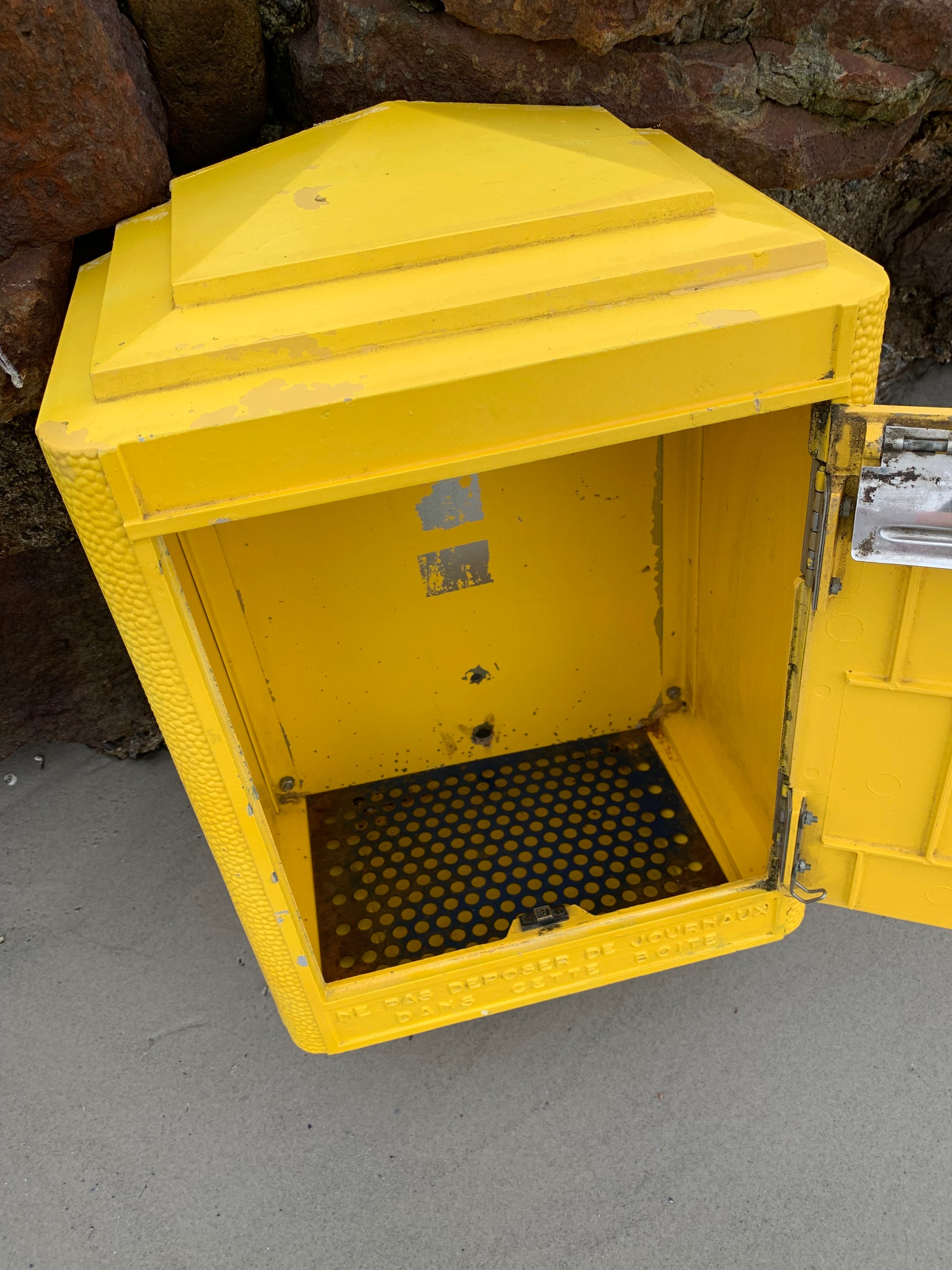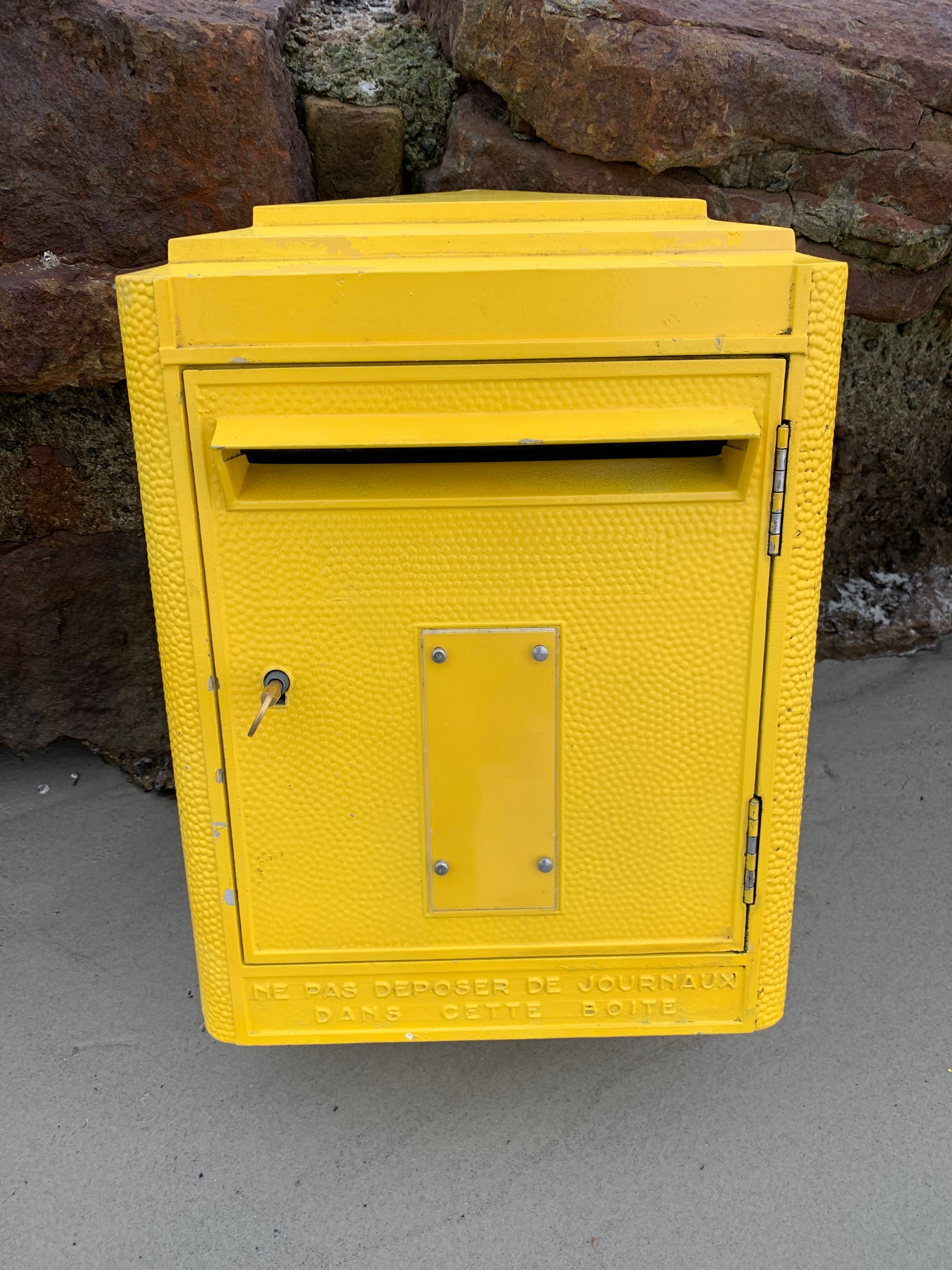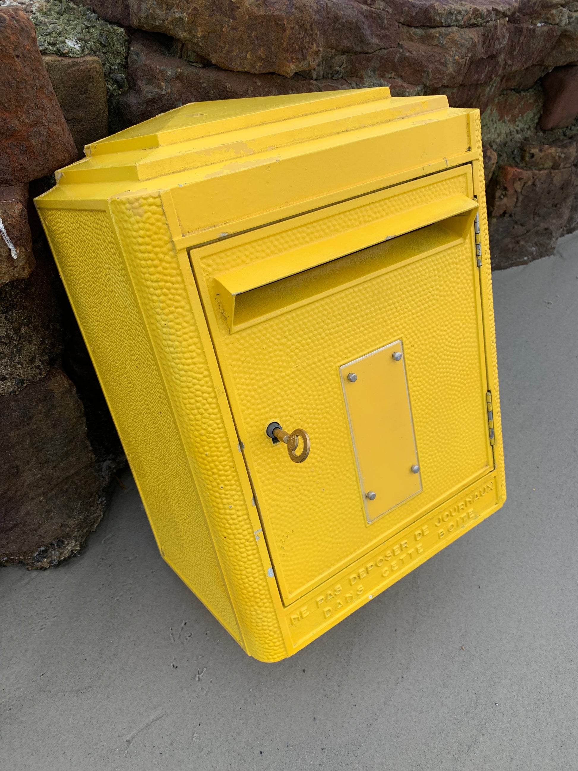 Wunderschöner alter französischer Briefkasten, gefunden in Frankreich. Der Briefkasten ist authentisch und charmant mit seiner schönen Patina. Er wurde seit 1950 in der Gießerei Dejoie in dieser offiziellen Form entworfen und in Nantes aus 100 % recycelbarem Aluminium gefertigt, wovon 30 % aus Recyclingmaterialien bestehen. Der Briefkasten verfügt über ein funktionierendes Schloss und den dazugehörigen Originalschlüssel.