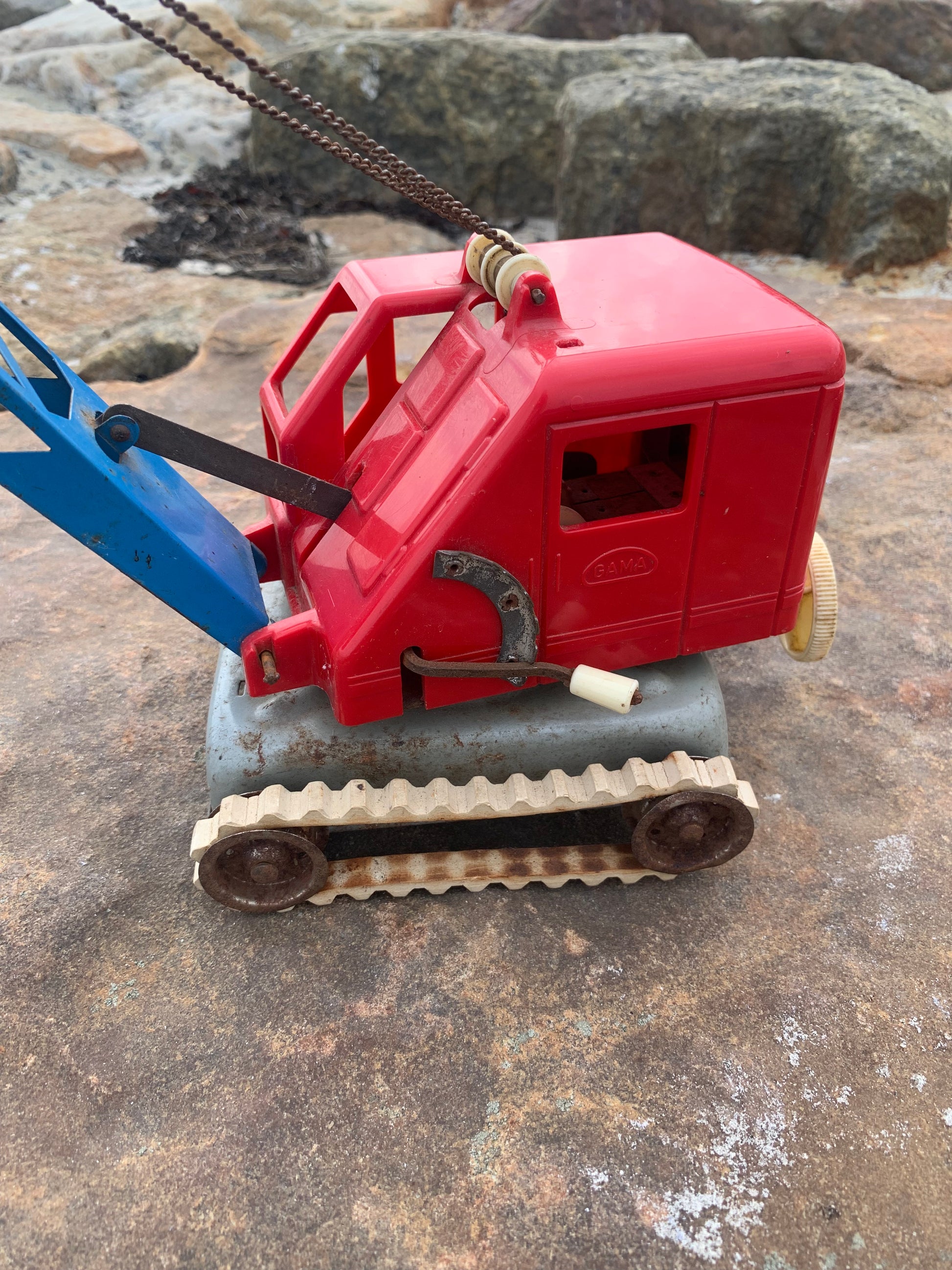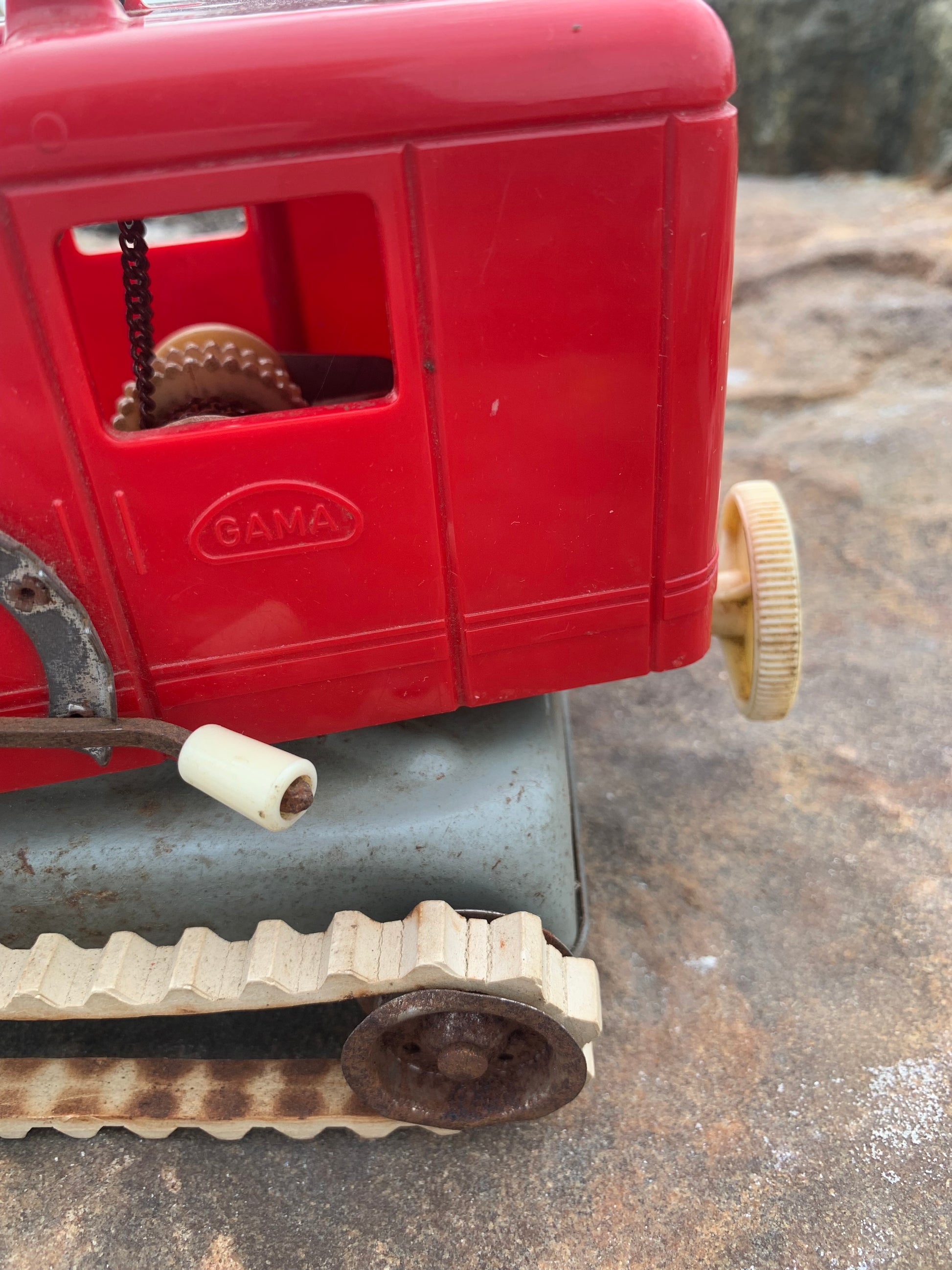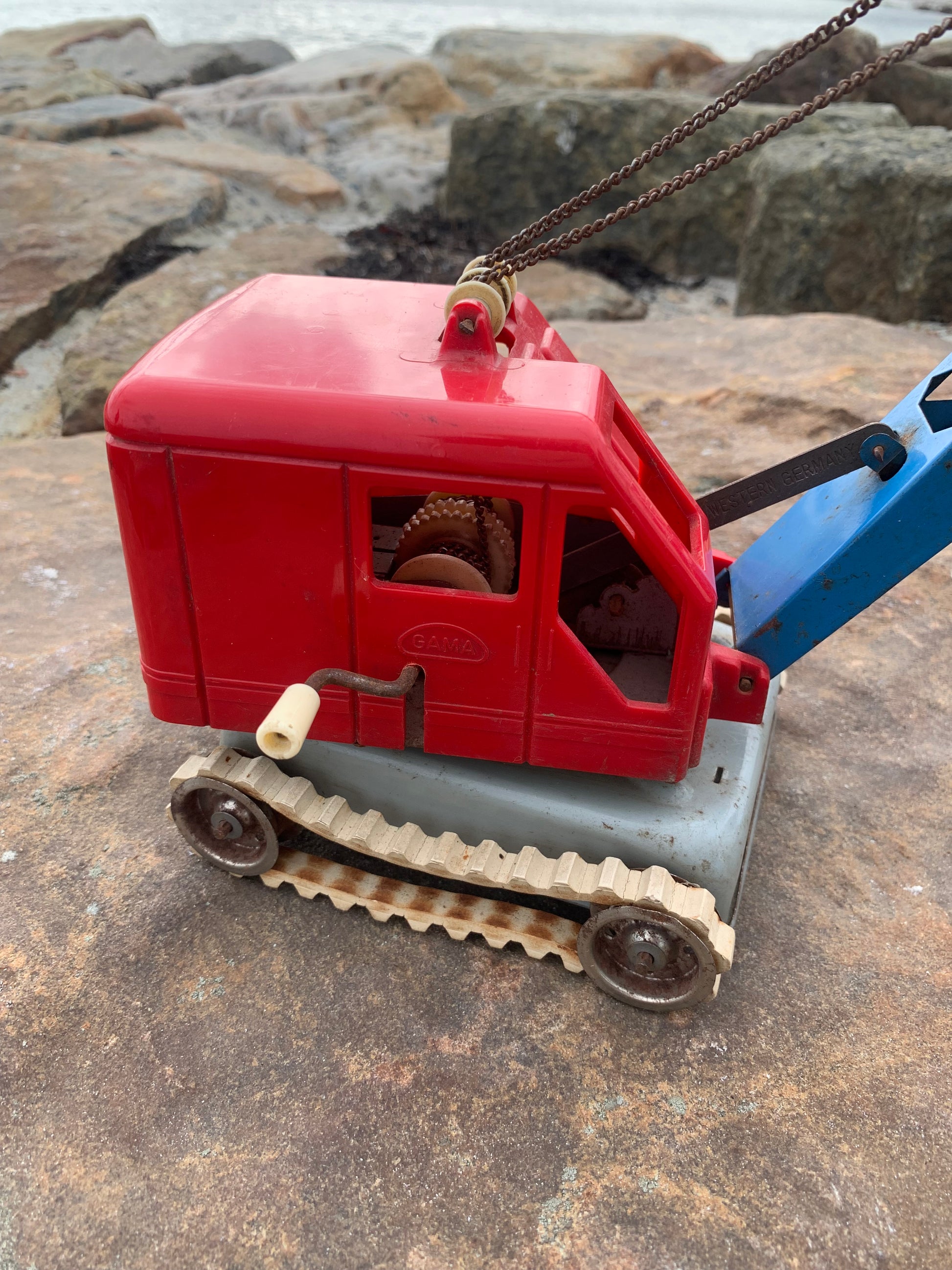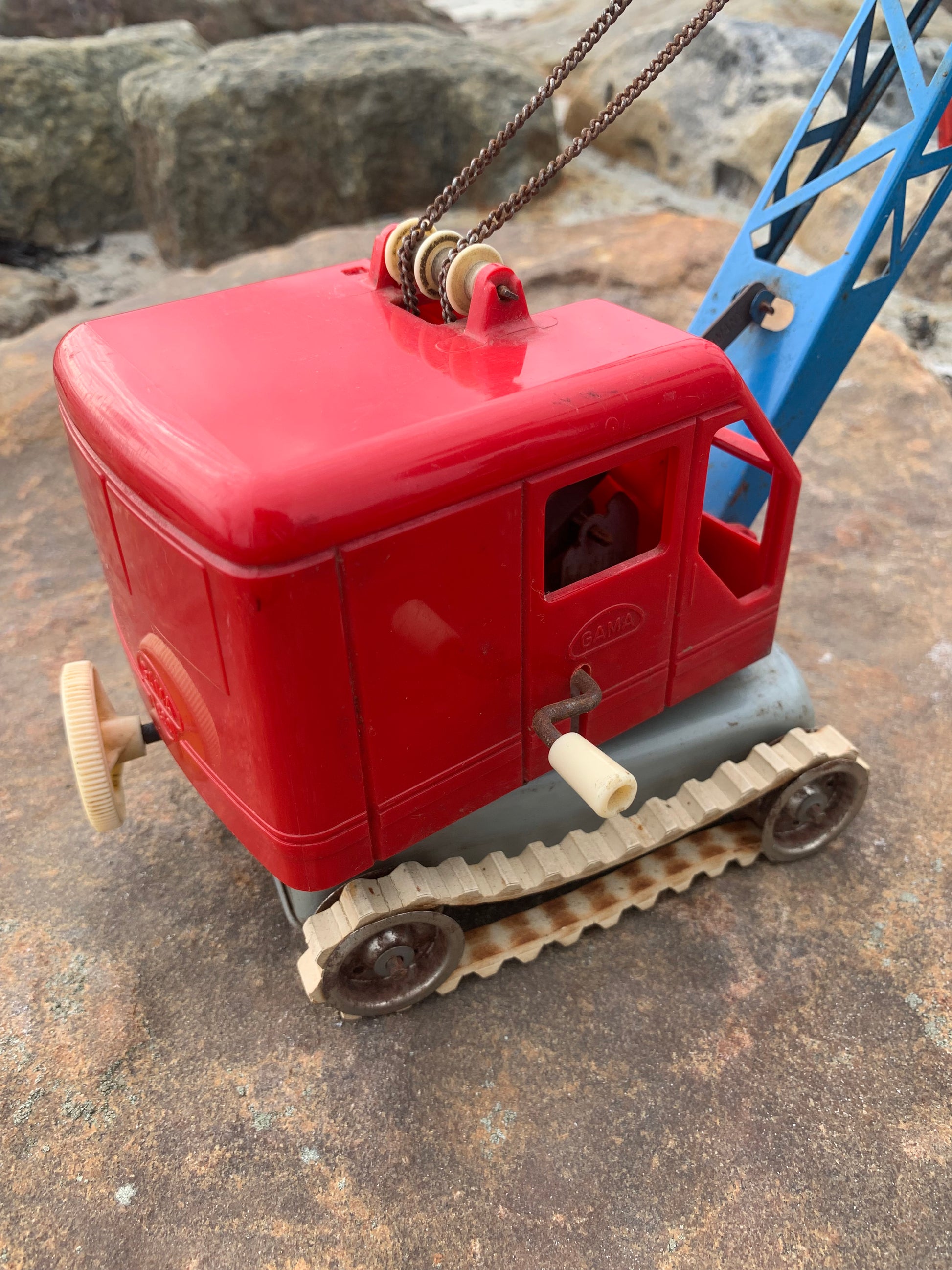 Wunderschöner alter GAMA Kran, vermutlich aus den 50er Jahren. Der Kran funktioniert und ist unglaublich charmant mit seinen authentischen Gebrauchsspuren.