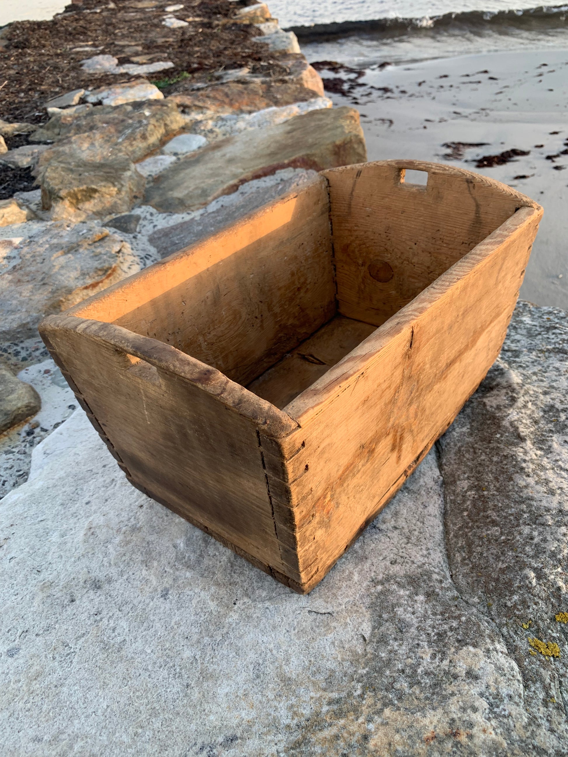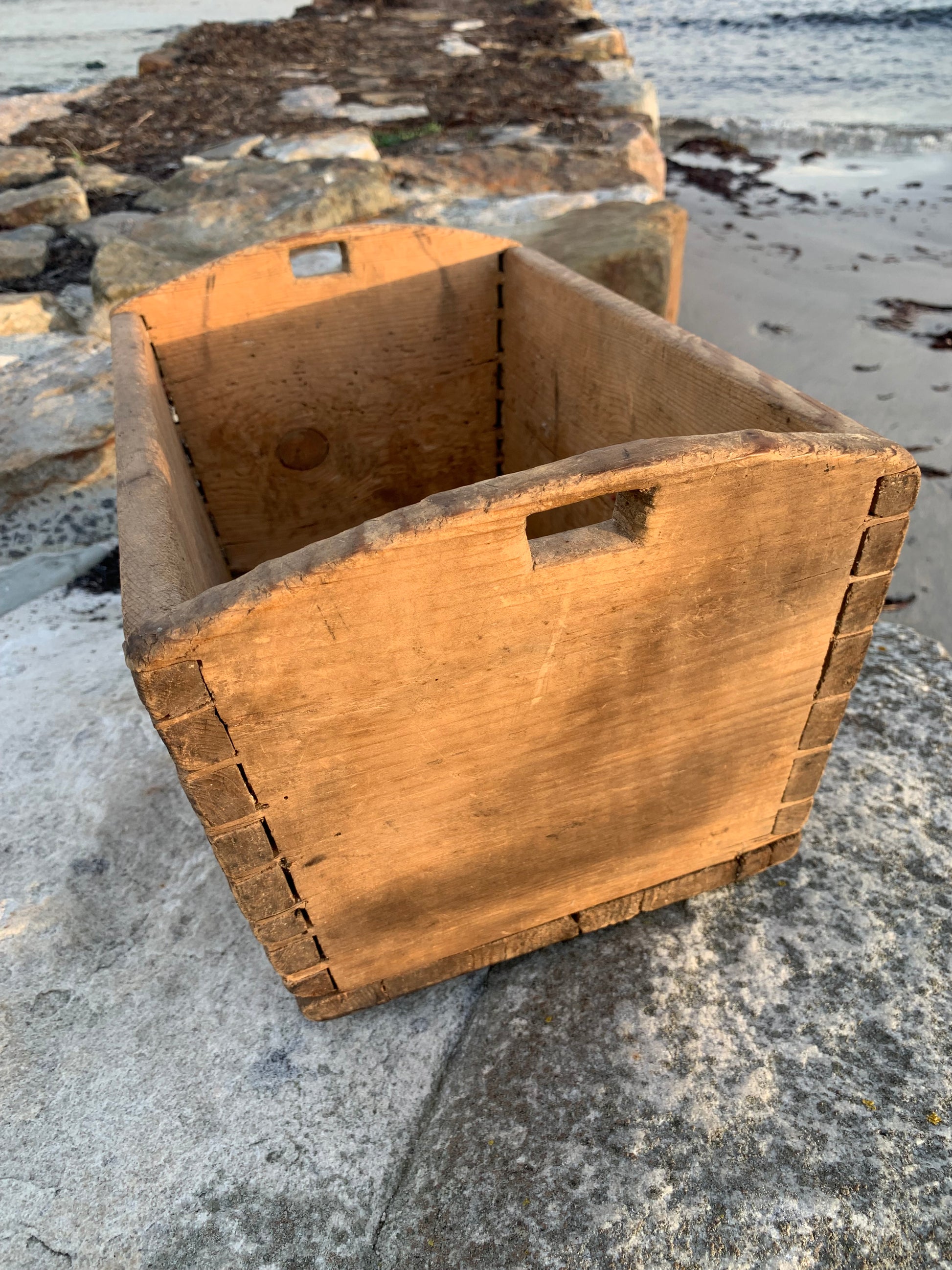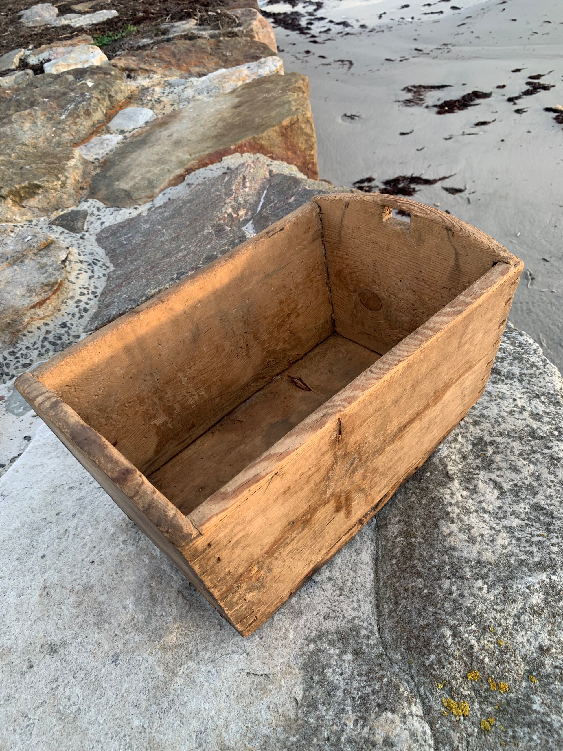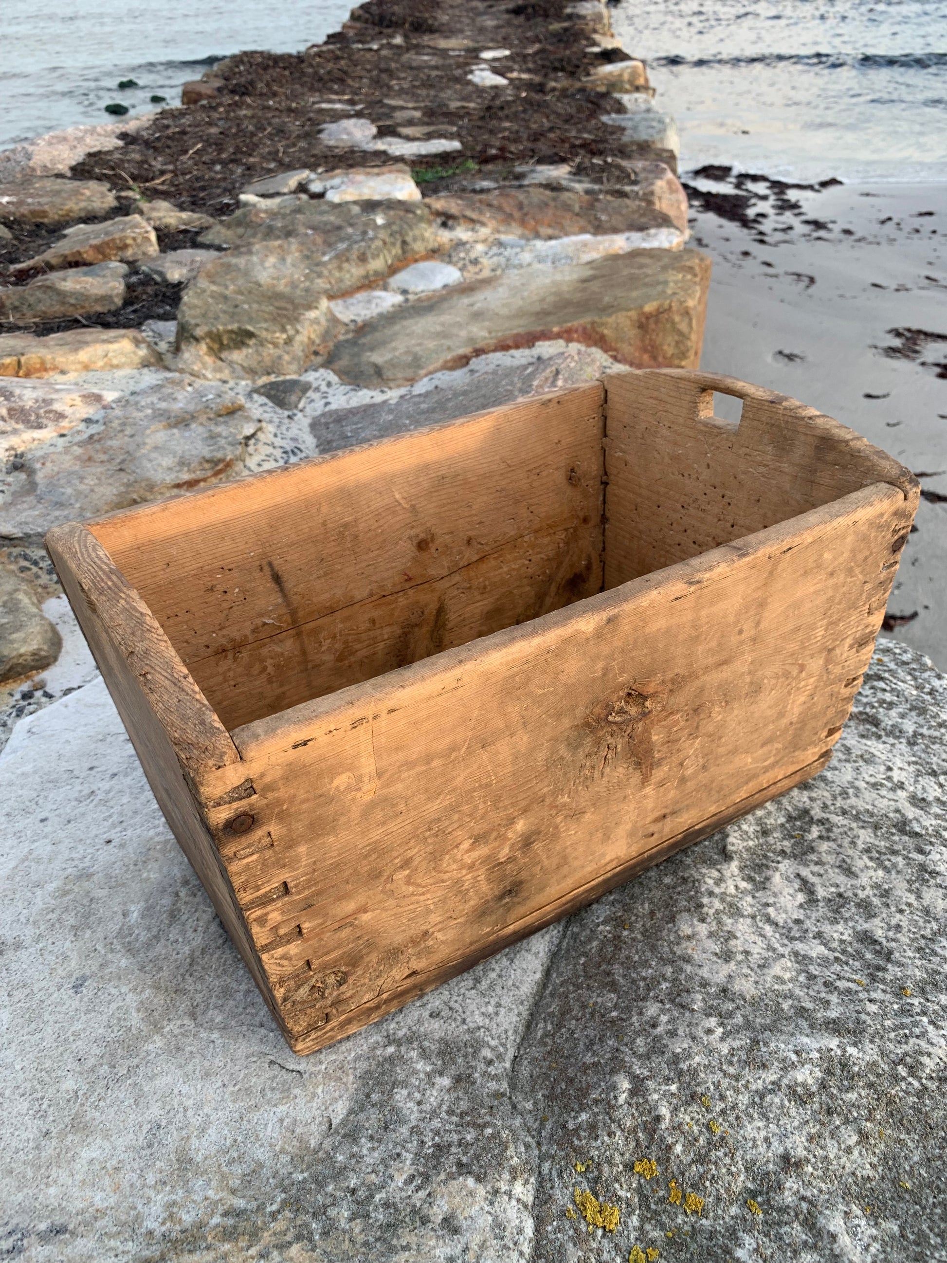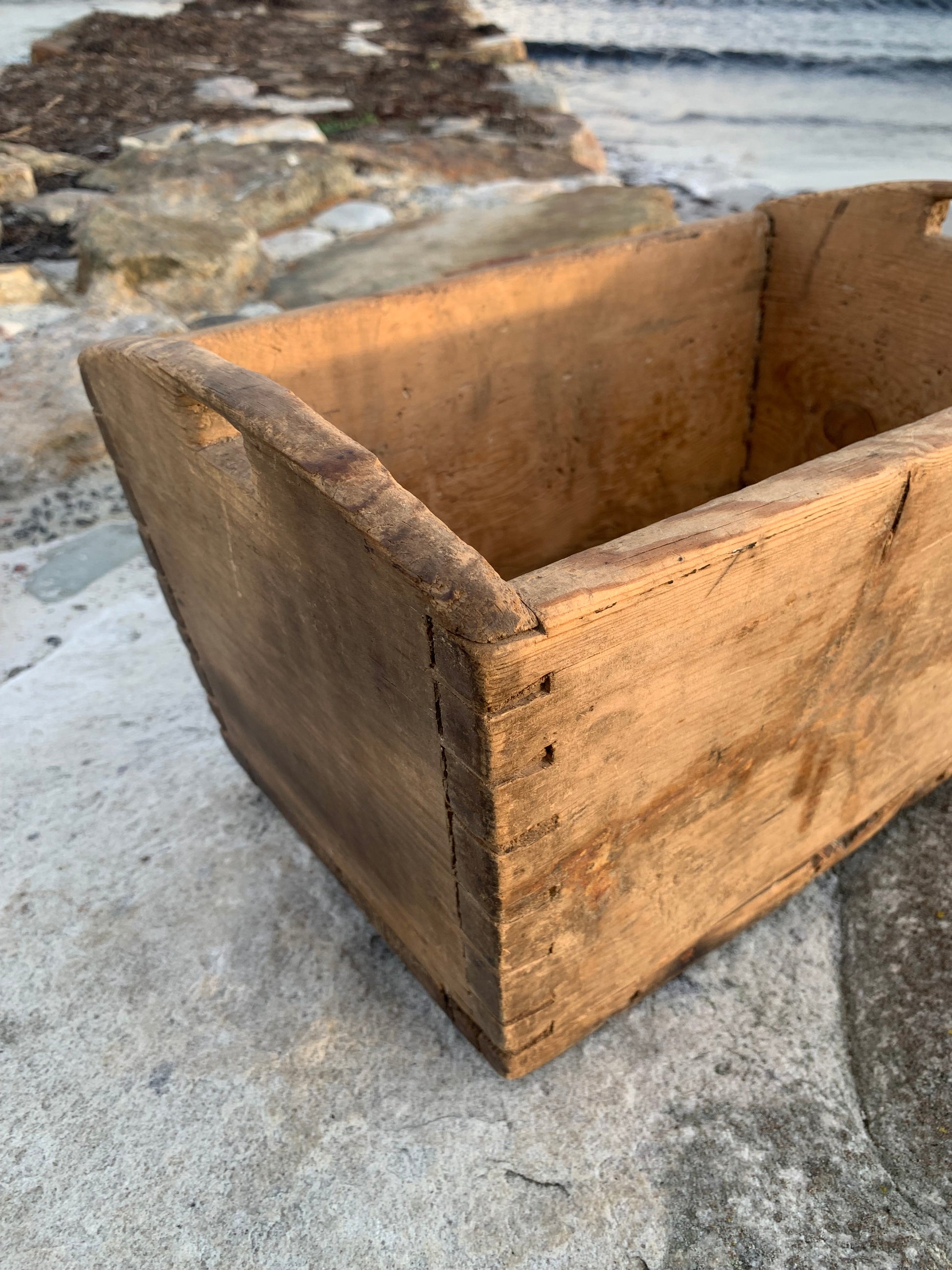 Alte und sehr charmante Holzkiste mit Griff. Die Kiste weist einige feine handwerkliche Details auf (die Ecken sind zusammengeklebt) und hat einen Ausdruck, der über viele Jahre hinweg entstanden ist.