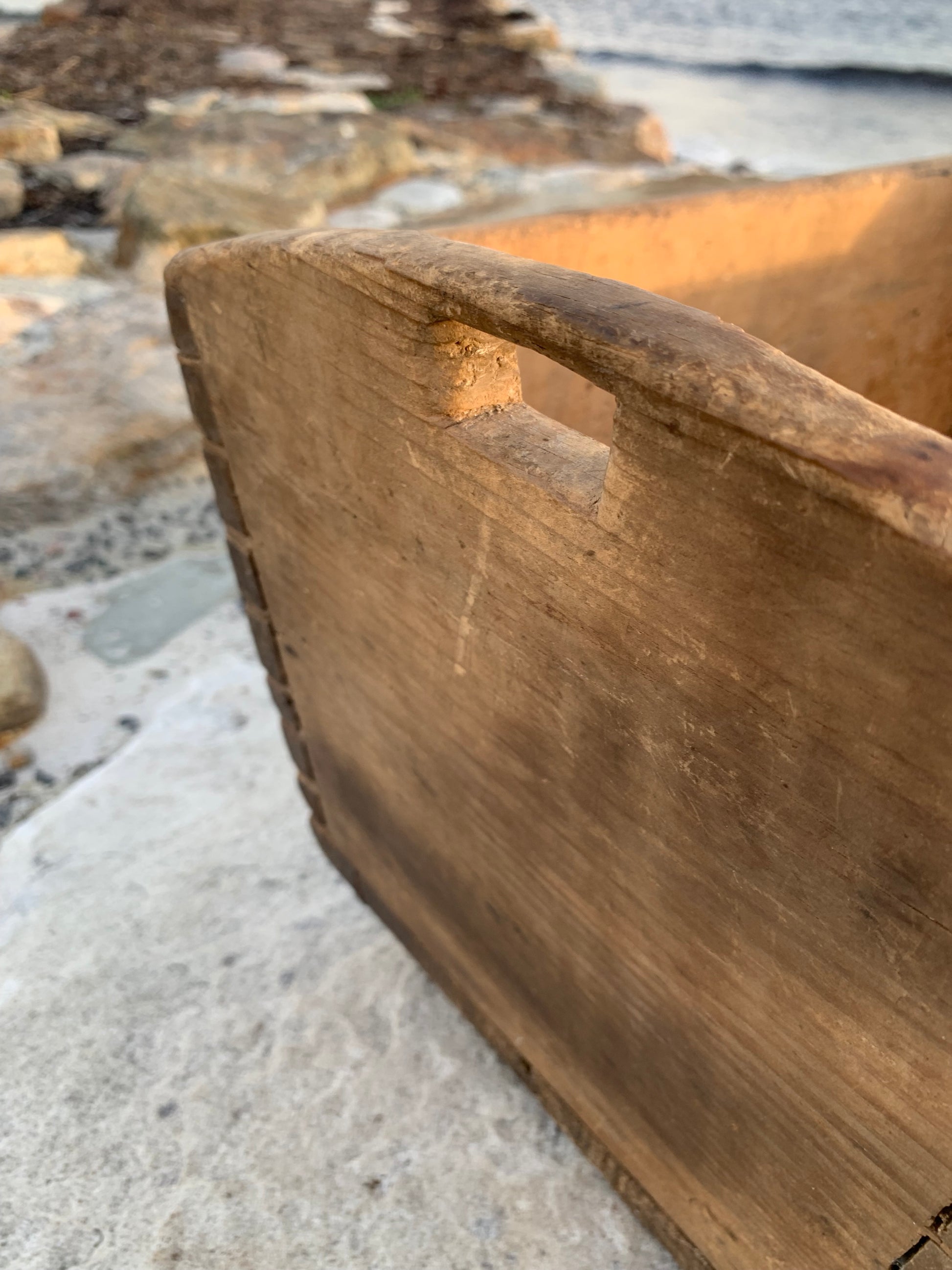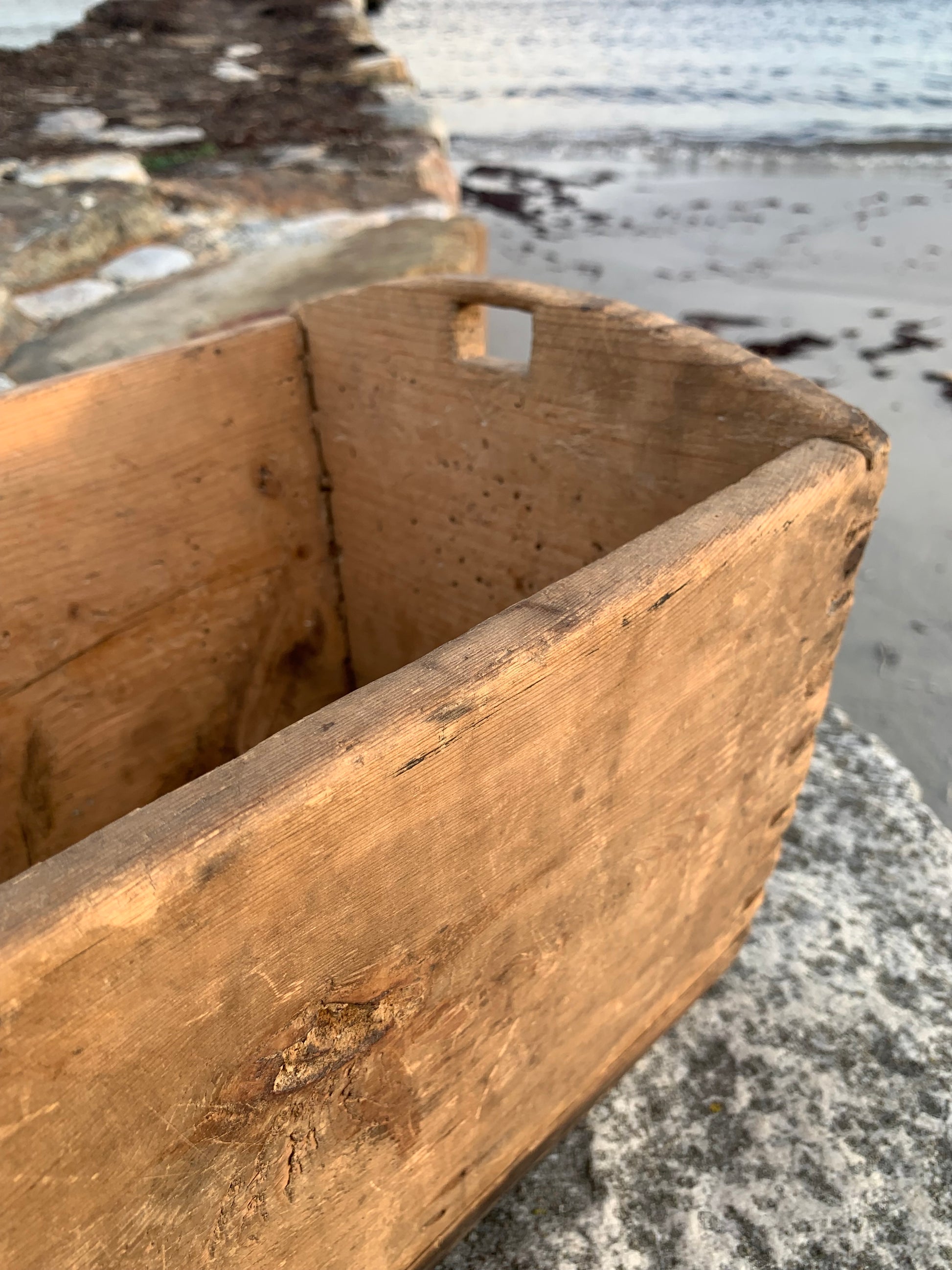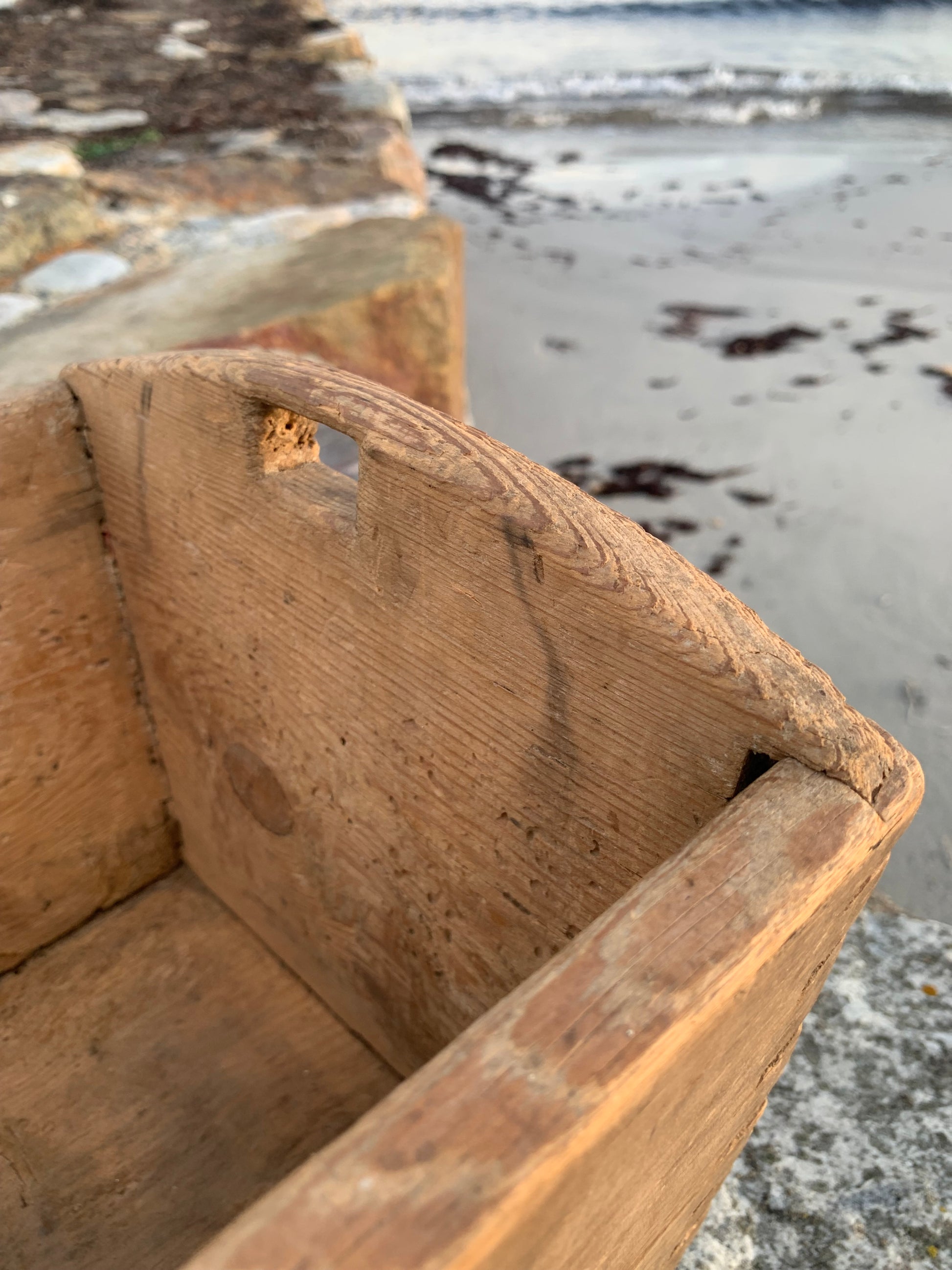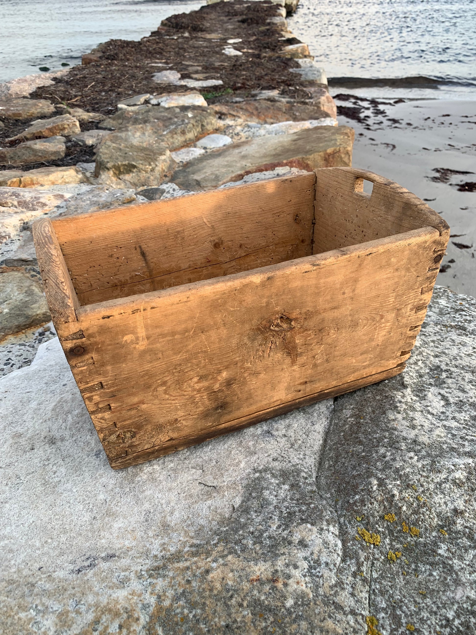 Alte und sehr charmante Holzkiste mit Griff. Die Kiste weist einige feine handwerkliche Details auf (die Ecken sind zusammengeklebt) und hat einen Ausdruck, der über viele Jahre hinweg entstanden ist.