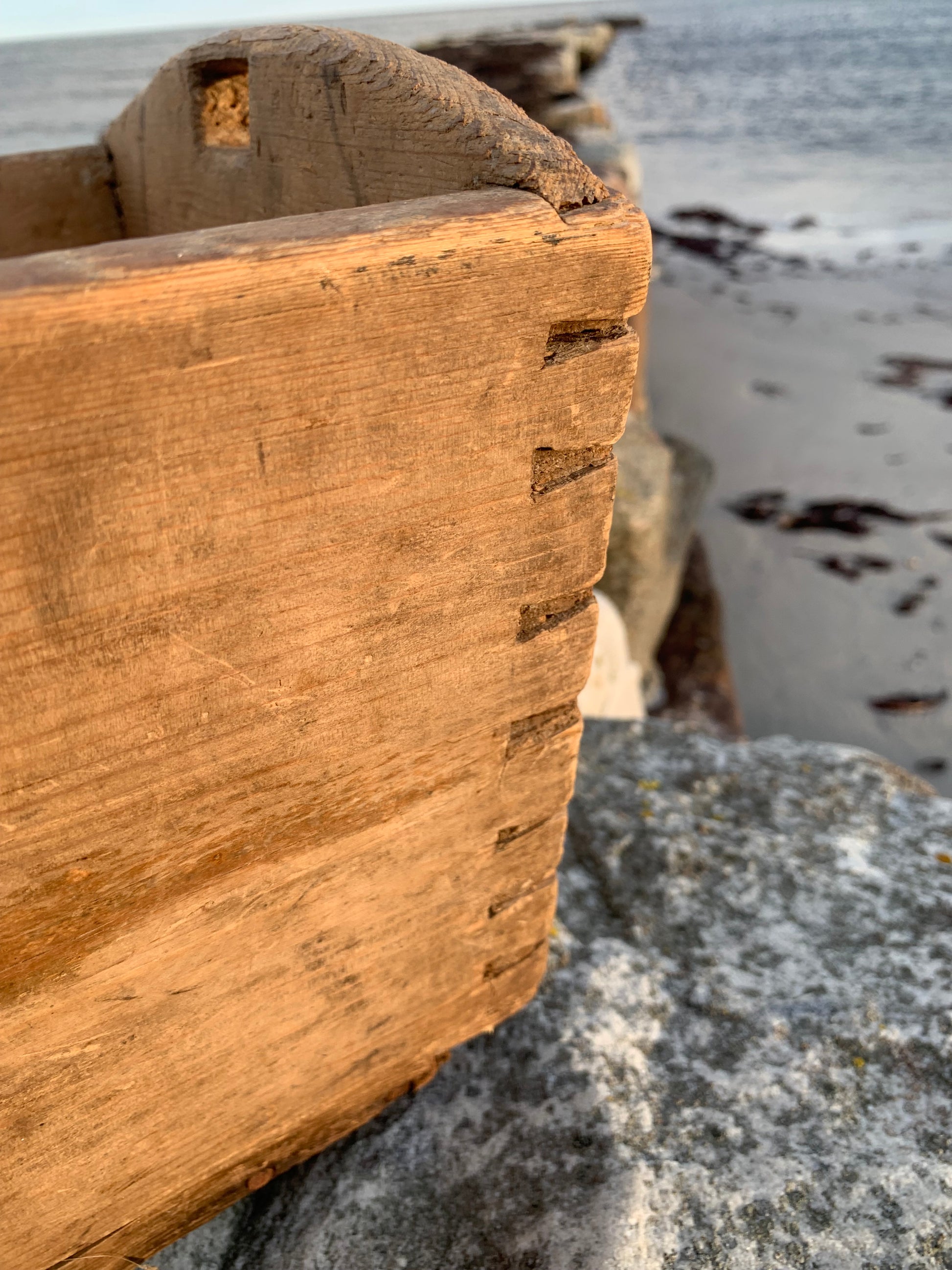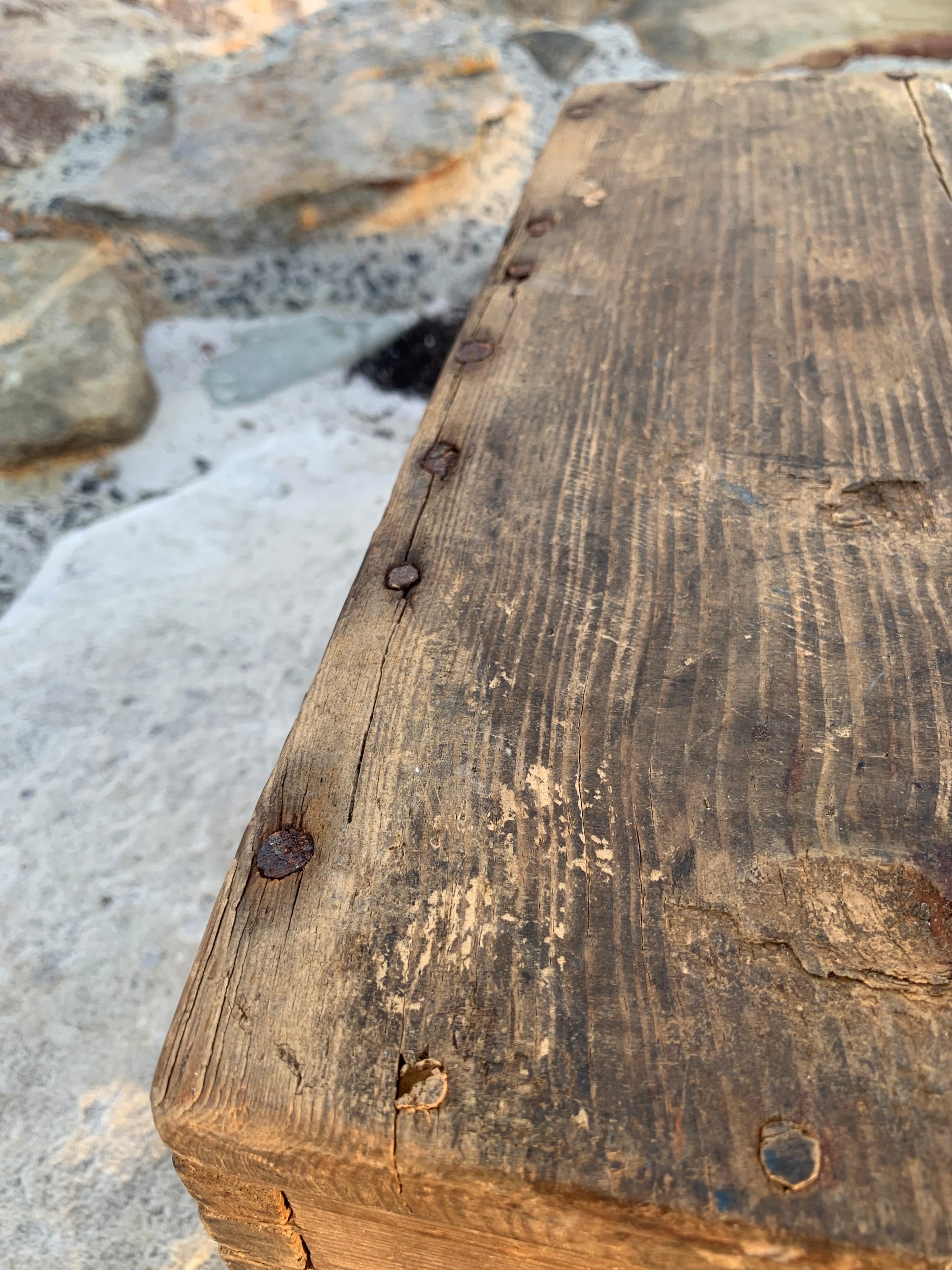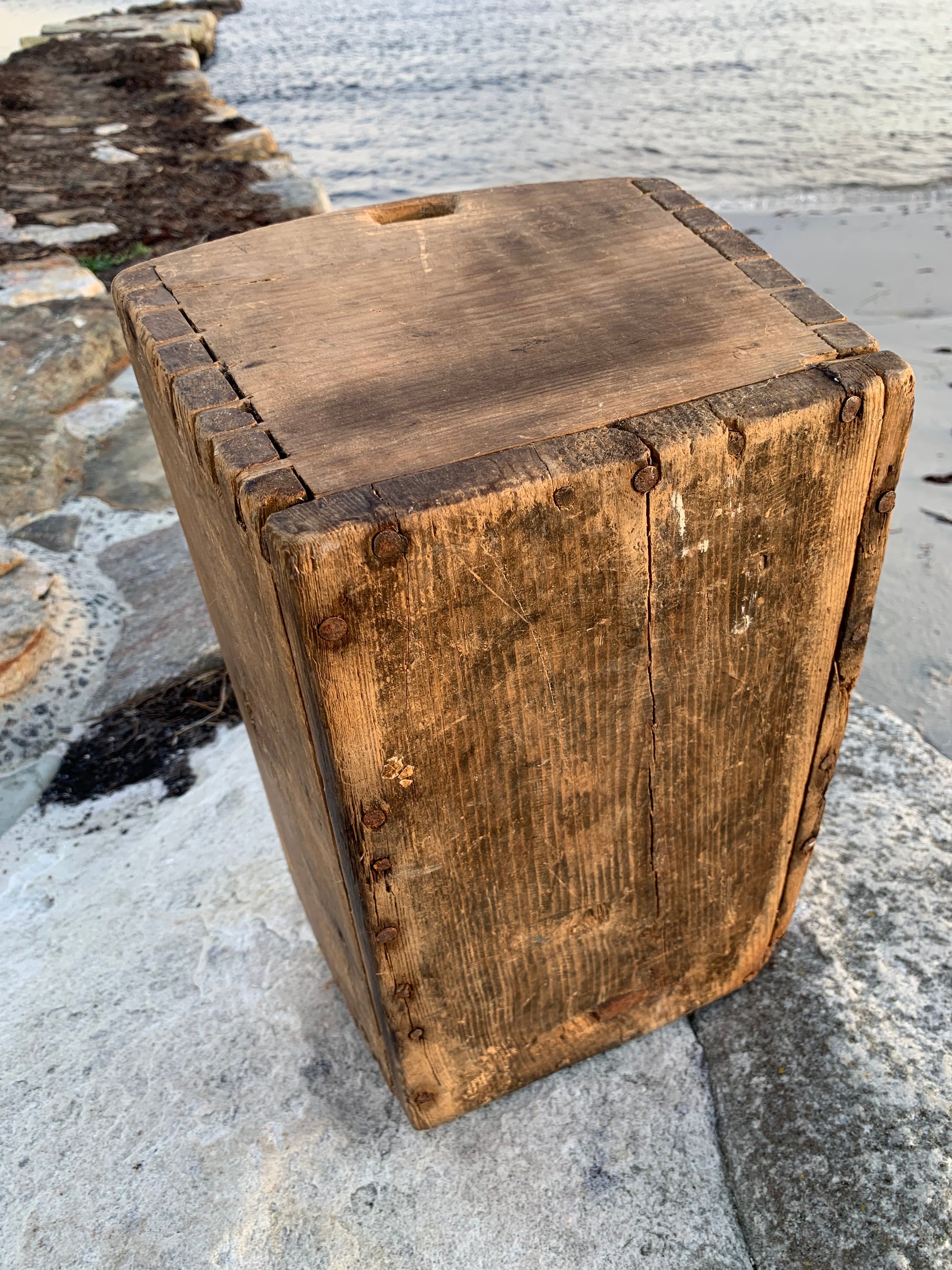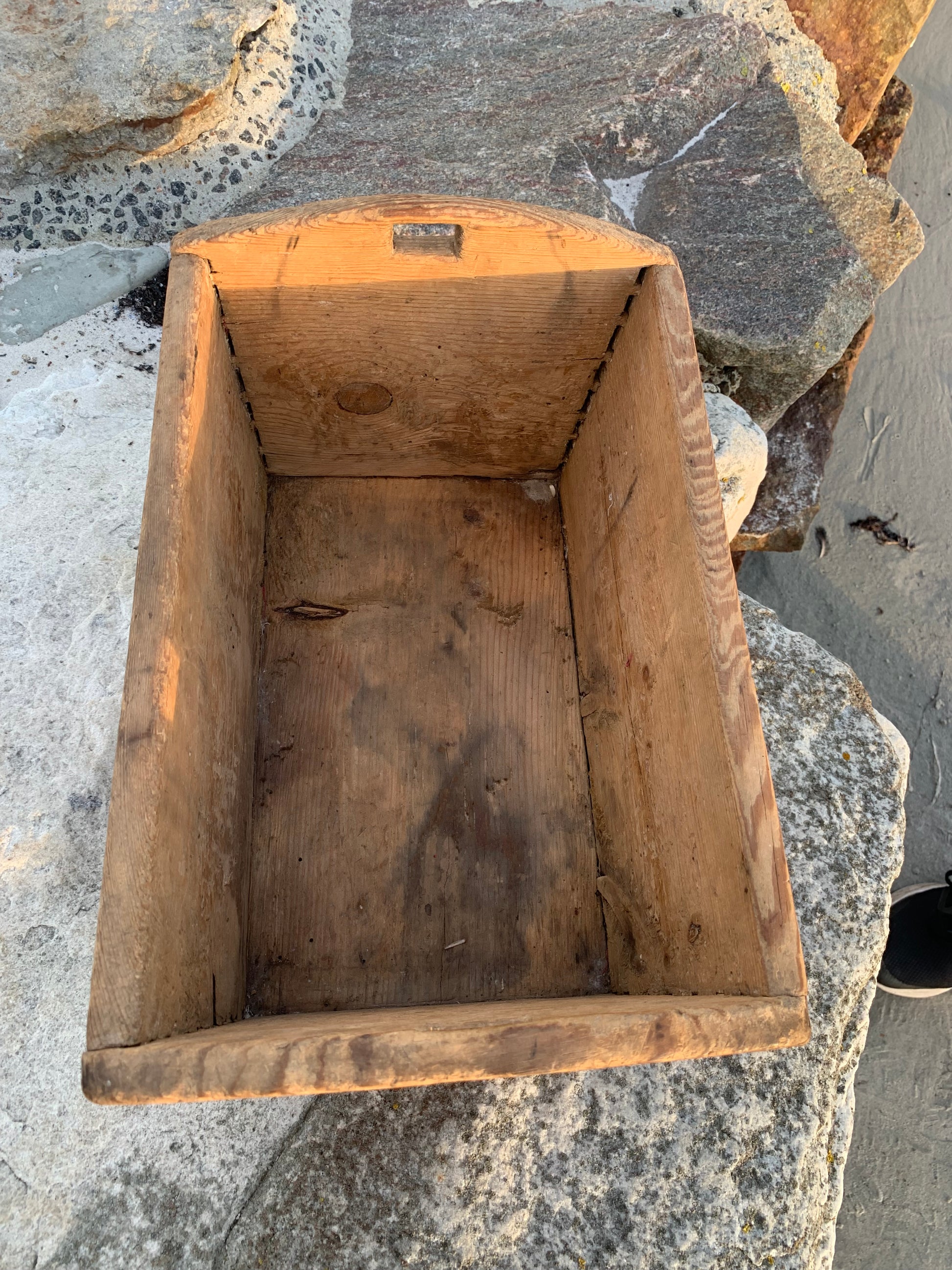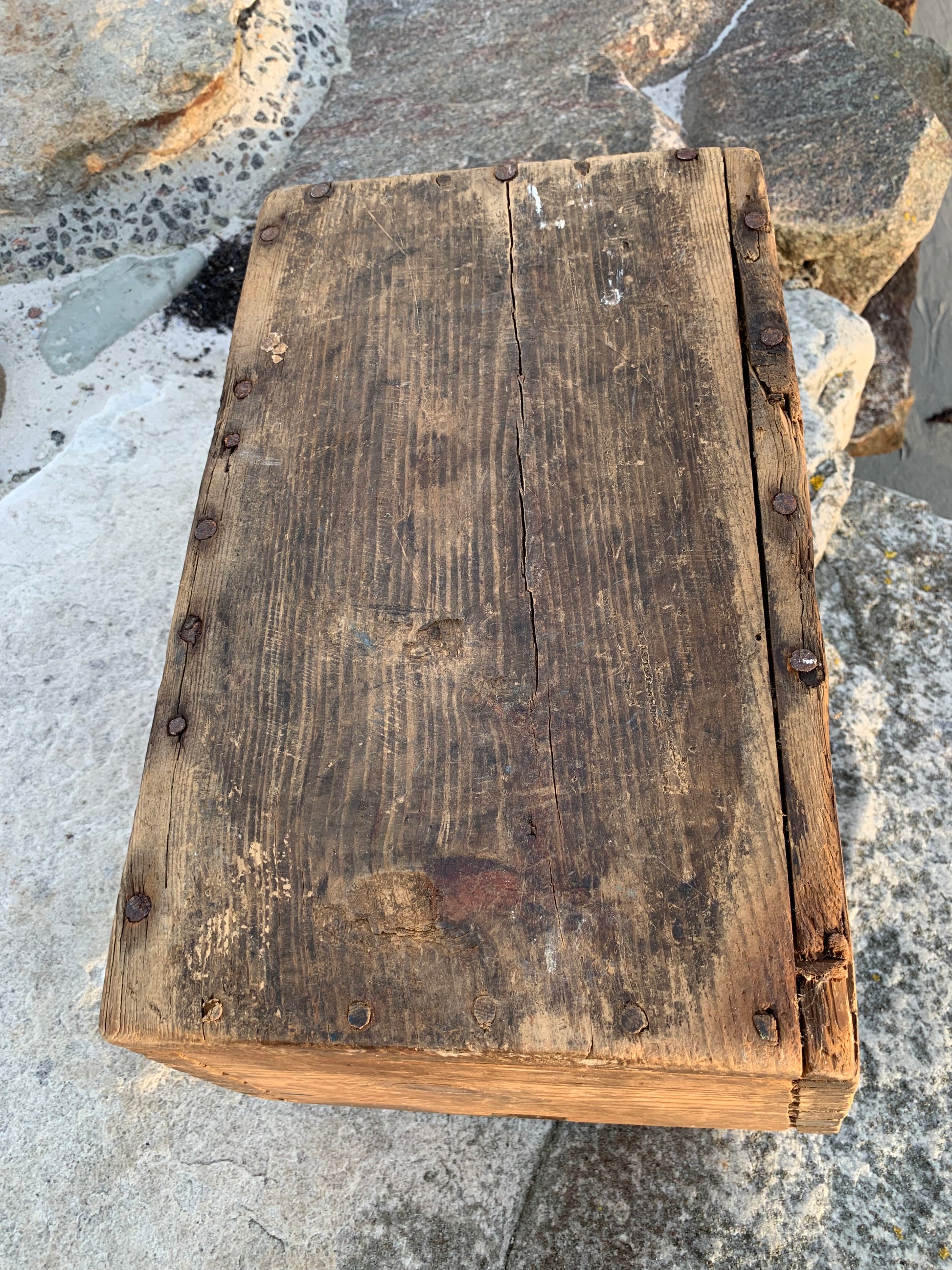 Alte und sehr charmante Holzkiste mit Griff. Die Kiste weist einige feine handwerkliche Details auf (die Ecken sind zusammengeklebt) und hat einen Ausdruck, der über viele Jahre hinweg entstanden ist.