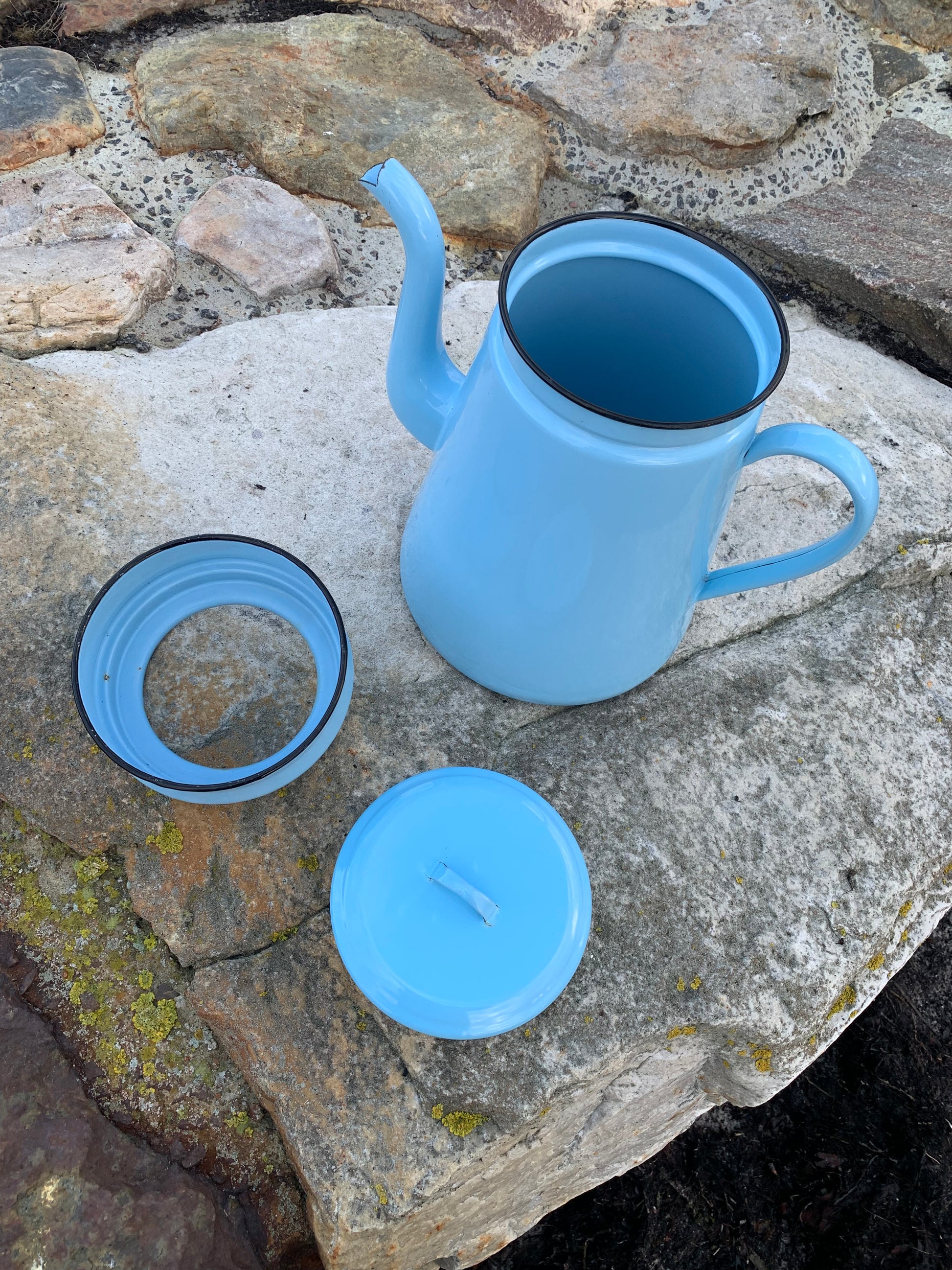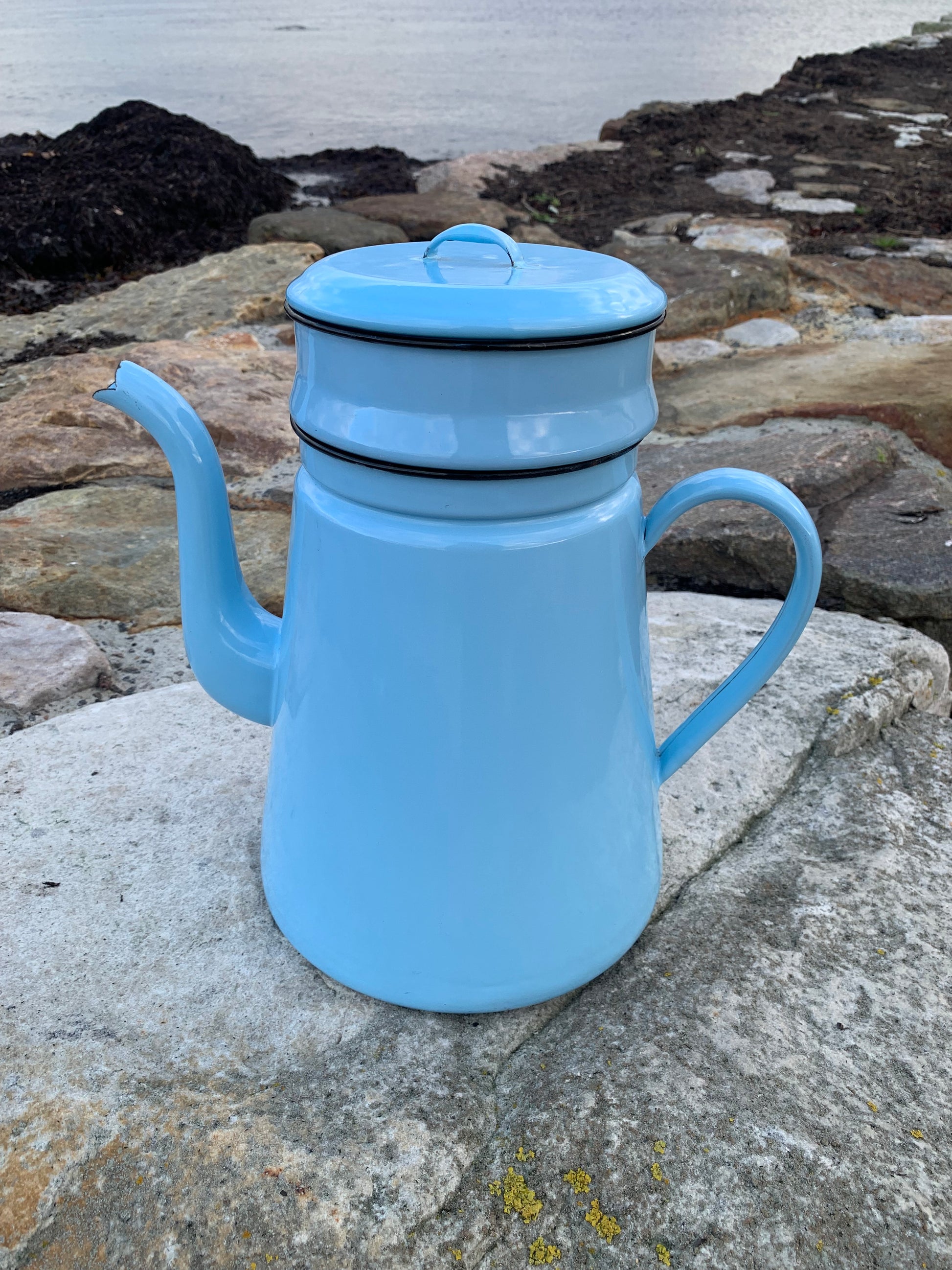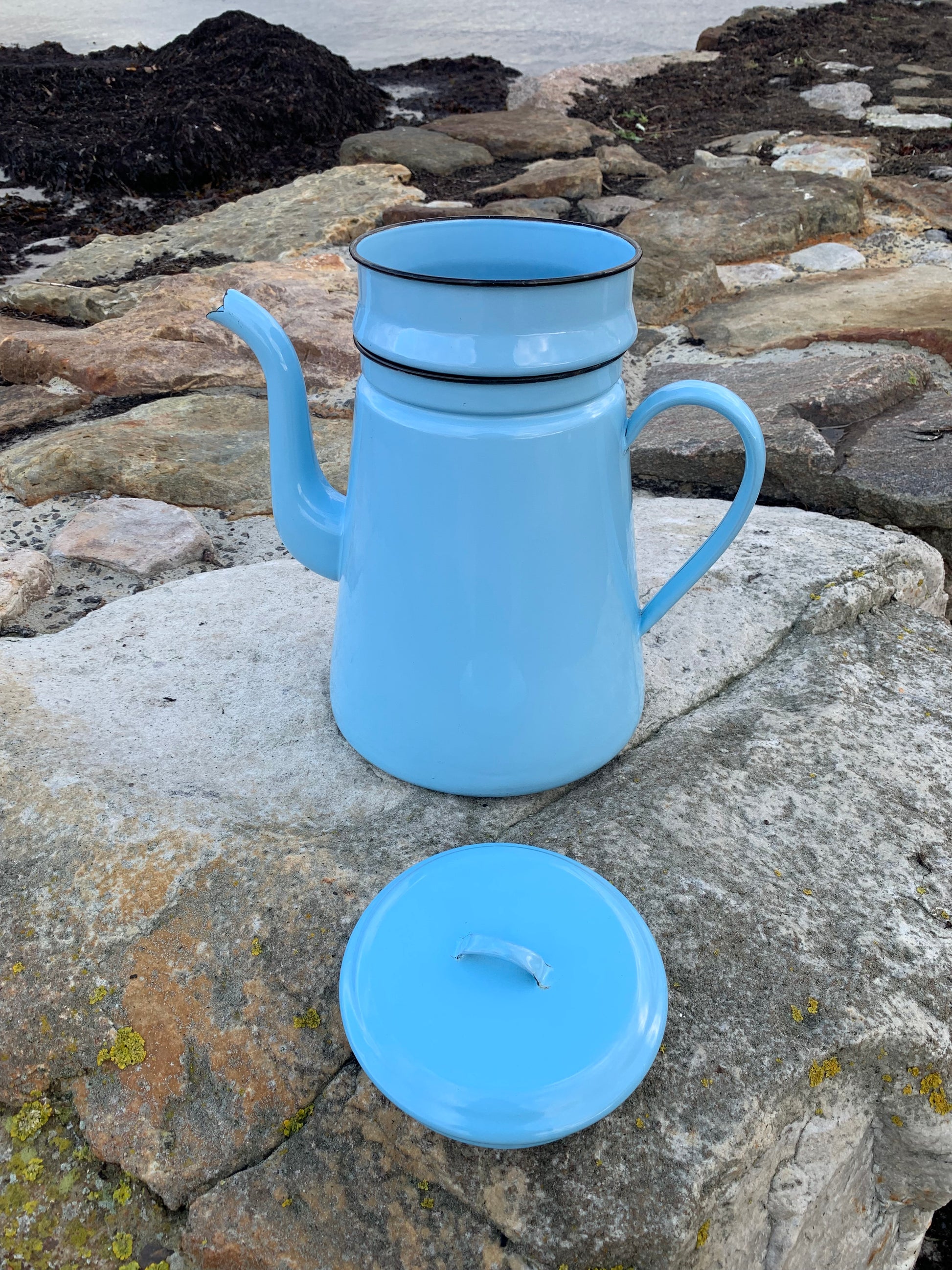 Große, wunderschöne Emaillekanne von Glud & Marstrand. Die Kanne gehört zu den selteneren Exemplaren. Sie weist einige kleine Emailleabplatzungen auf (siehe Foto), befindet sich aber insgesamt in einem schönen Vintage-Zustand.