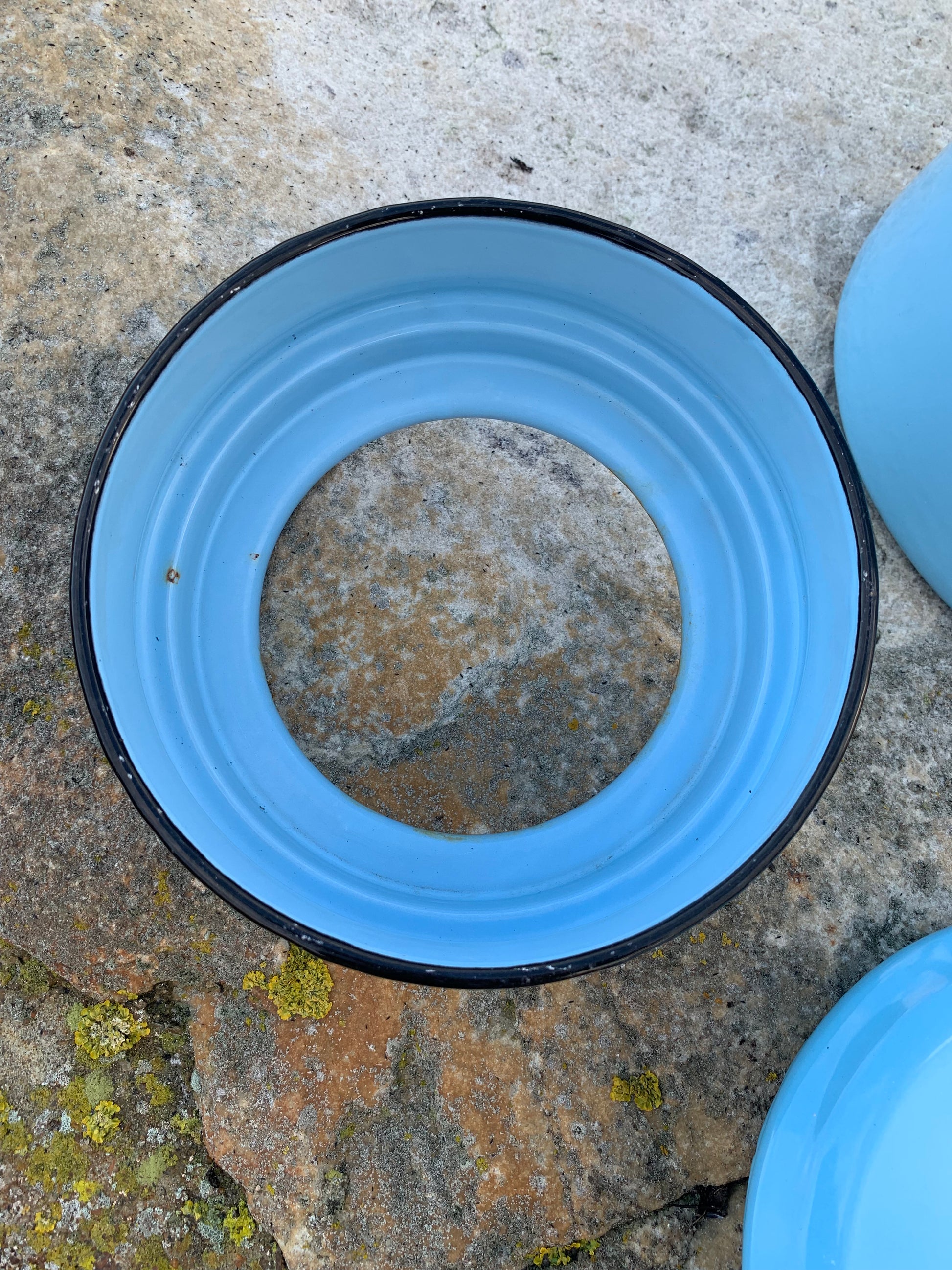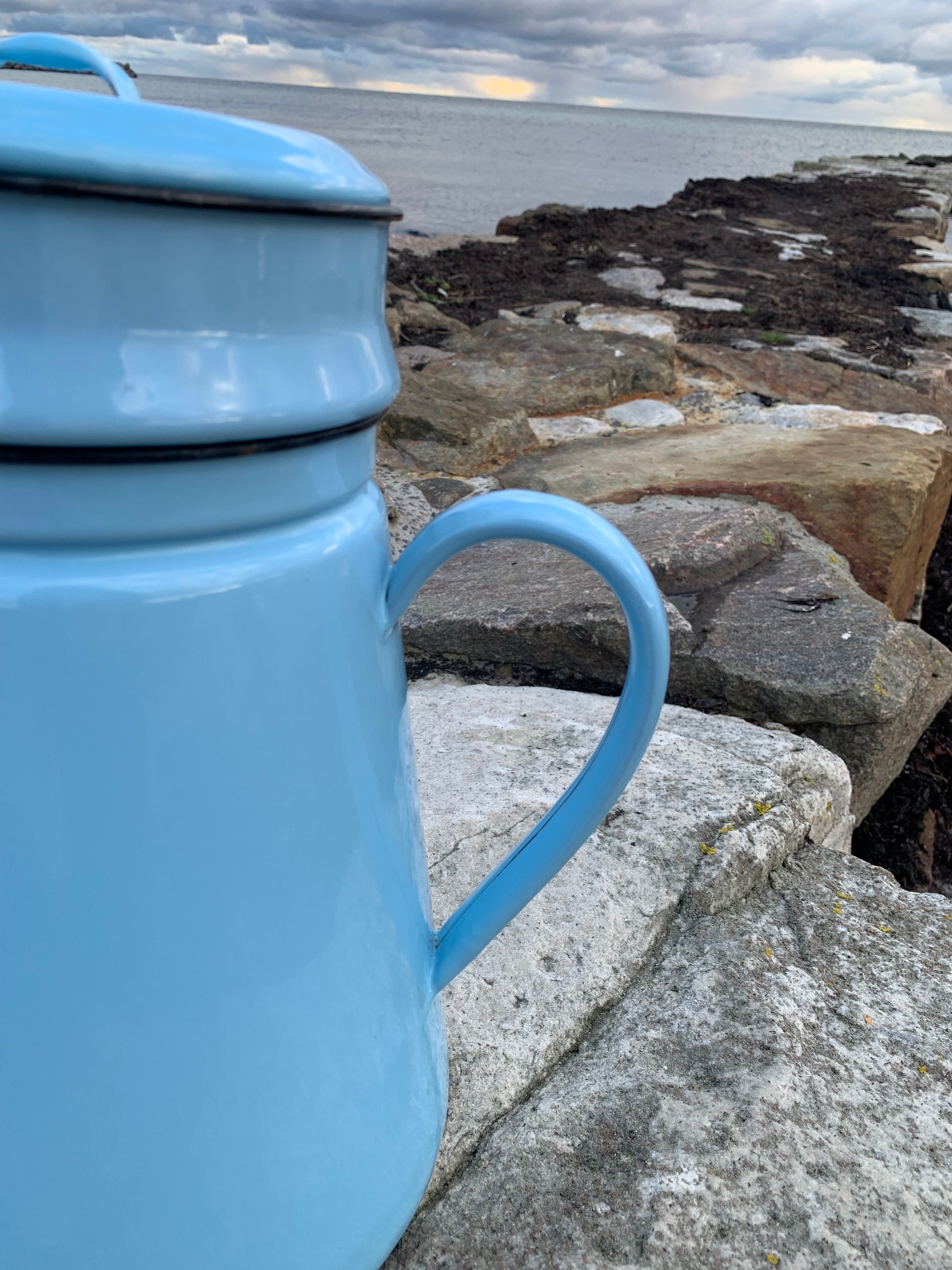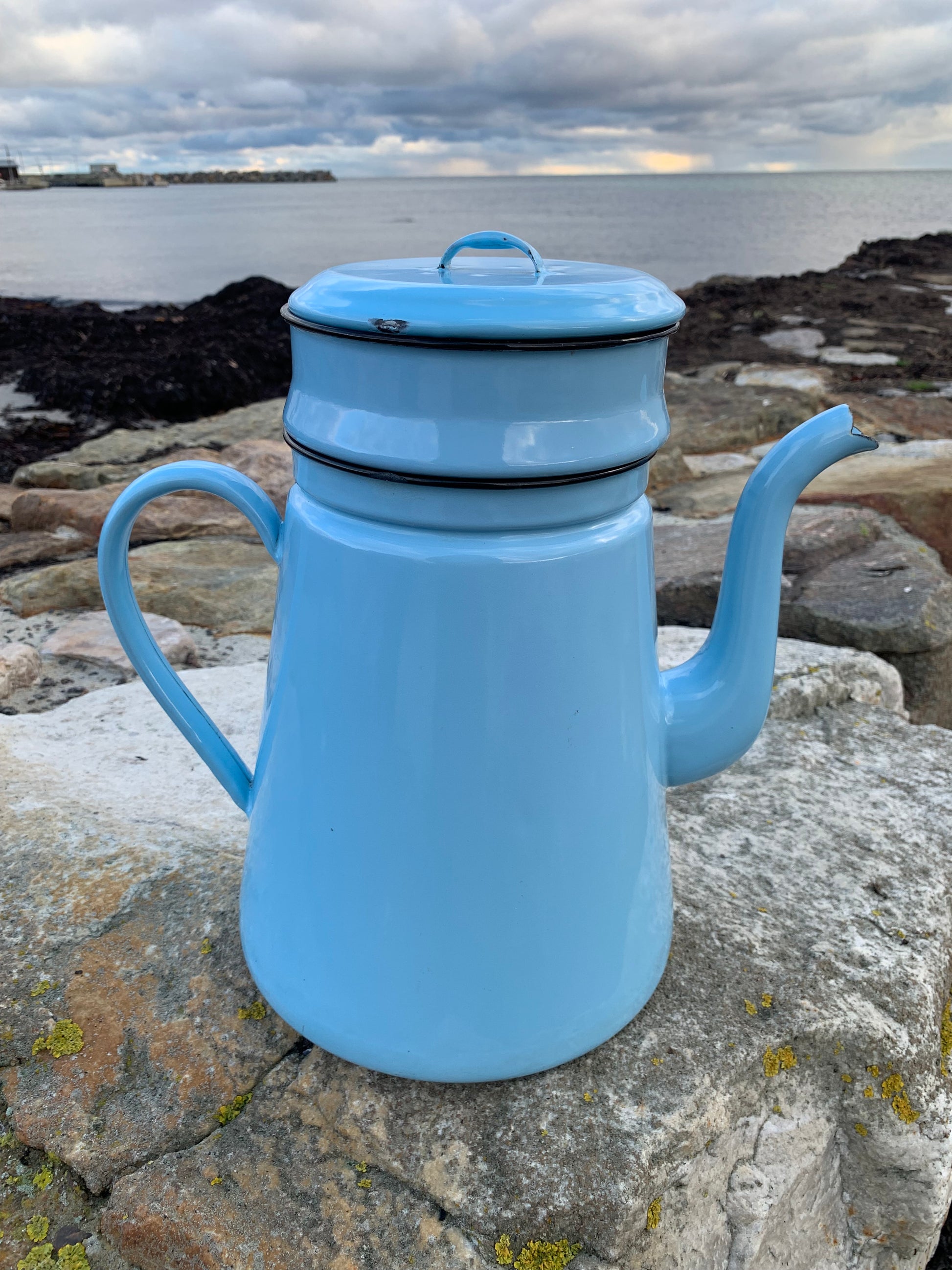 Große, wunderschöne Emaillekanne von Glud & Marstrand. Die Kanne gehört zu den selteneren Exemplaren. Sie weist einige kleine Emailleabplatzungen auf (siehe Foto), befindet sich aber insgesamt in einem schönen Vintage-Zustand.