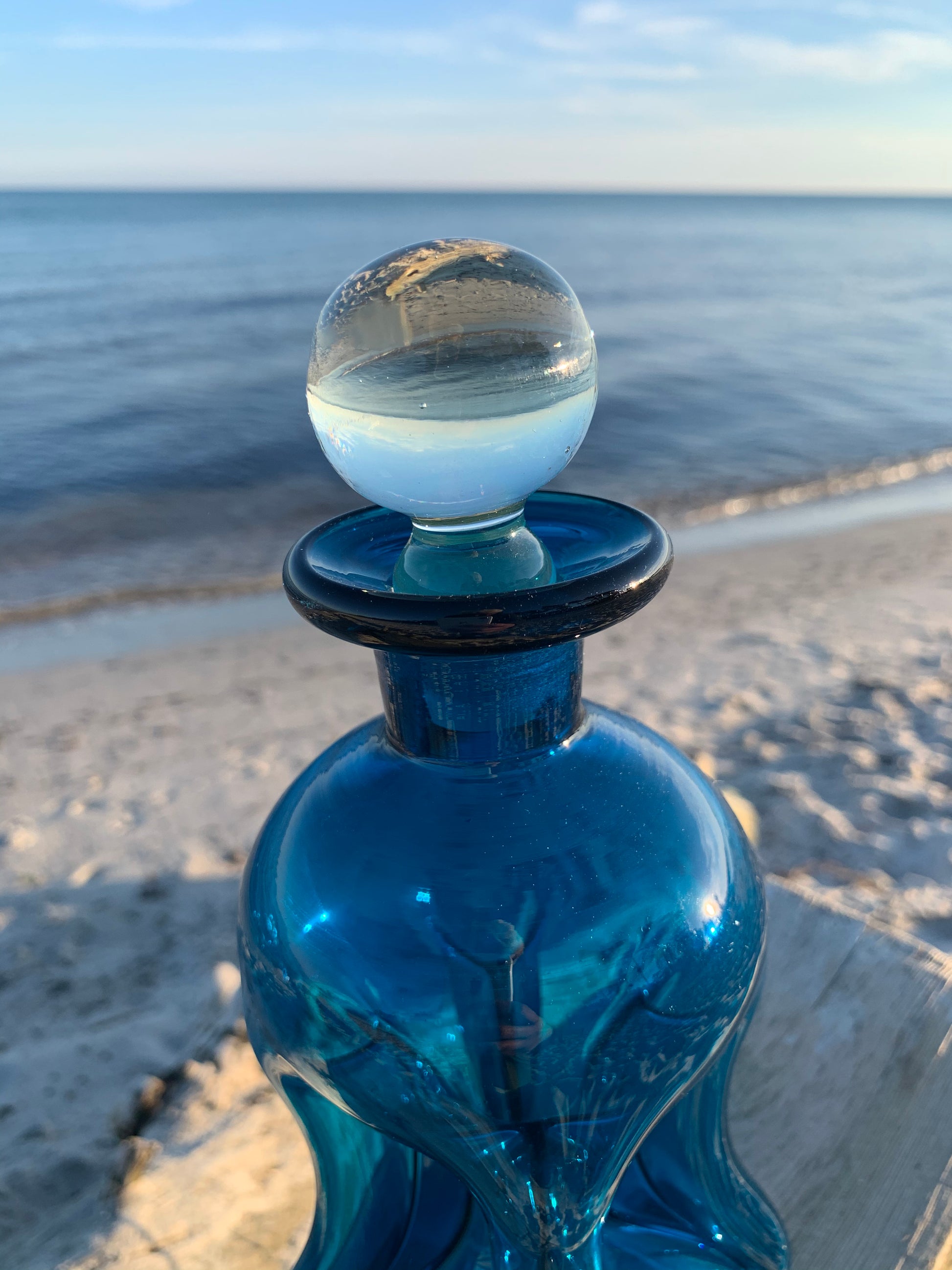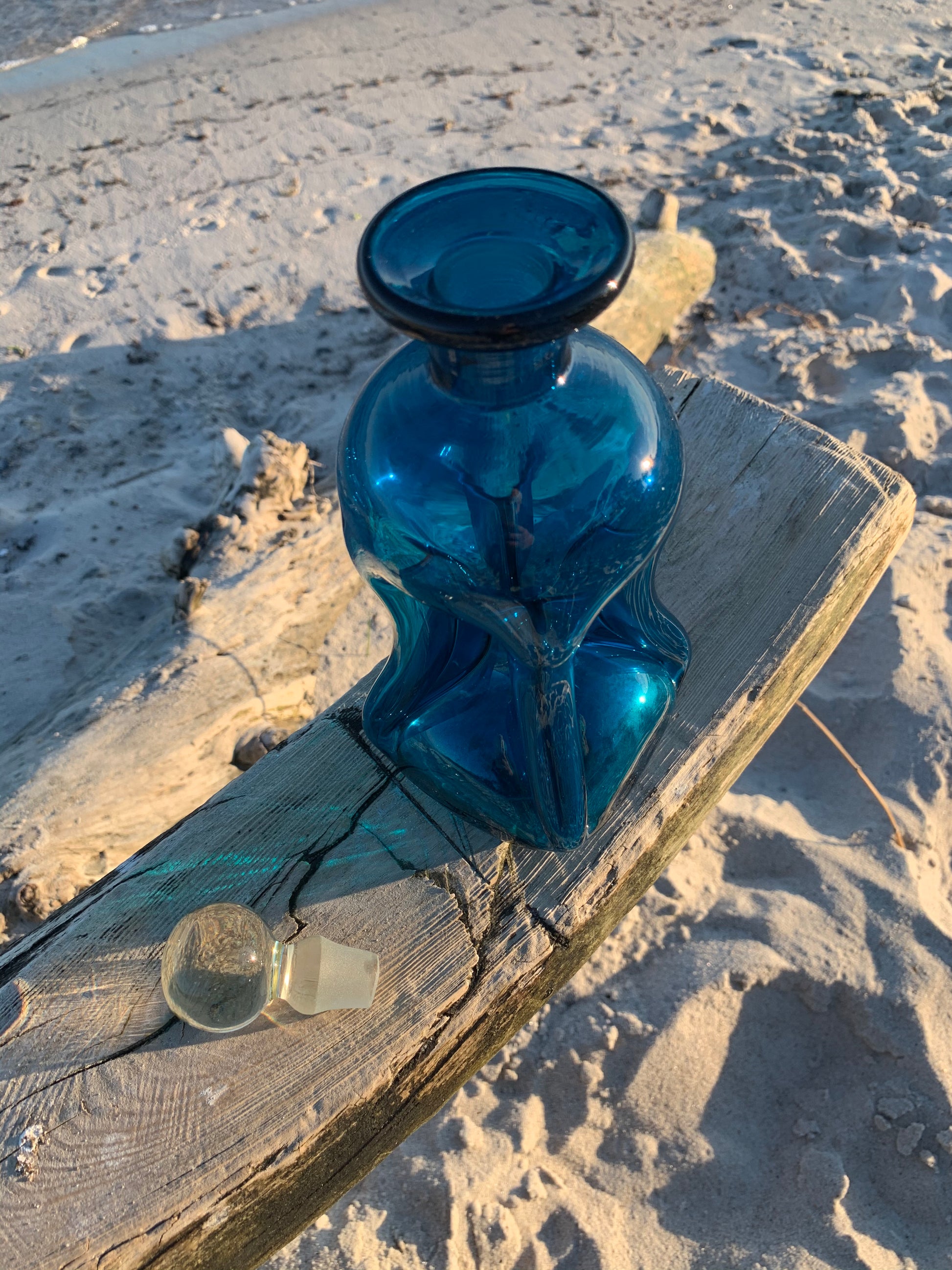 Schöne Holmegaard Chuck Flasche mit Glasstopfen. Die Flasche hat einige altersbedingte Gebrauchsspuren.