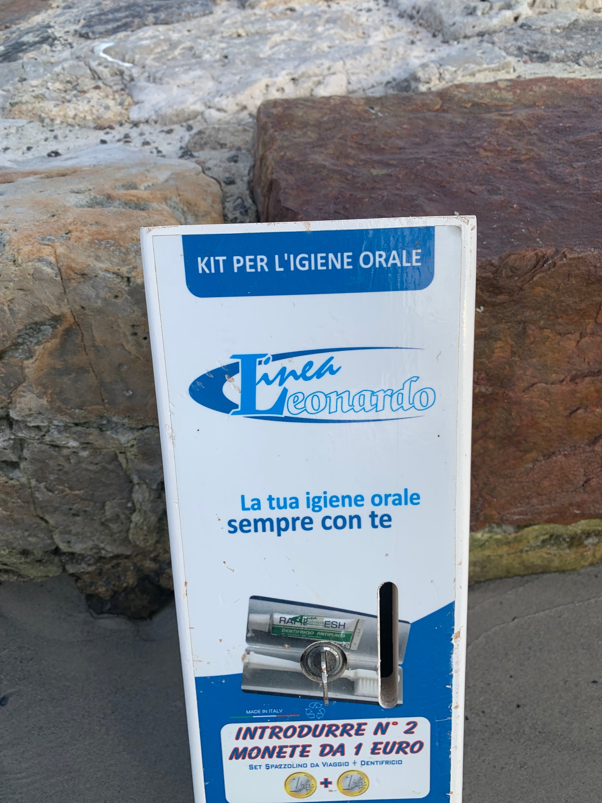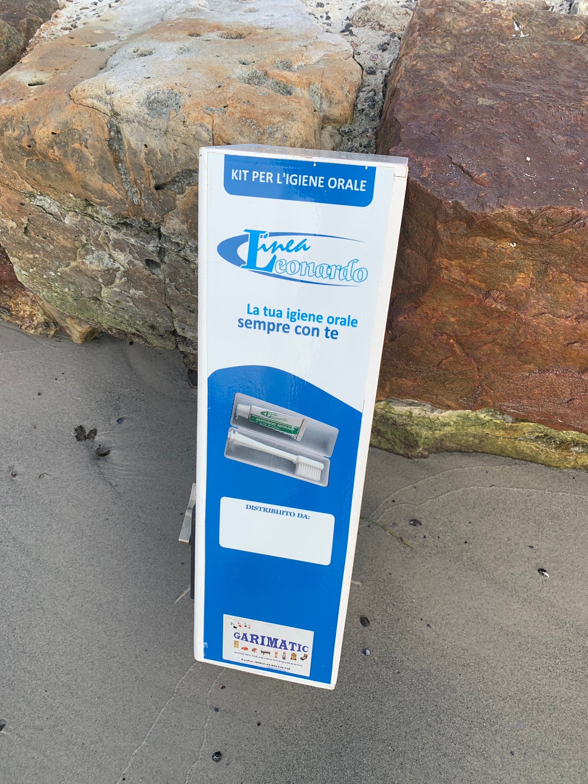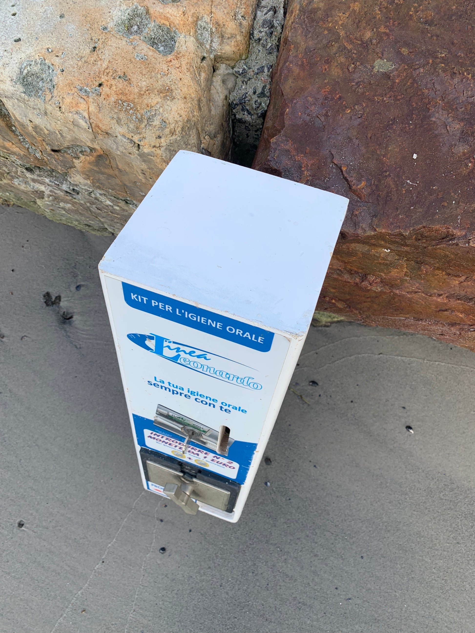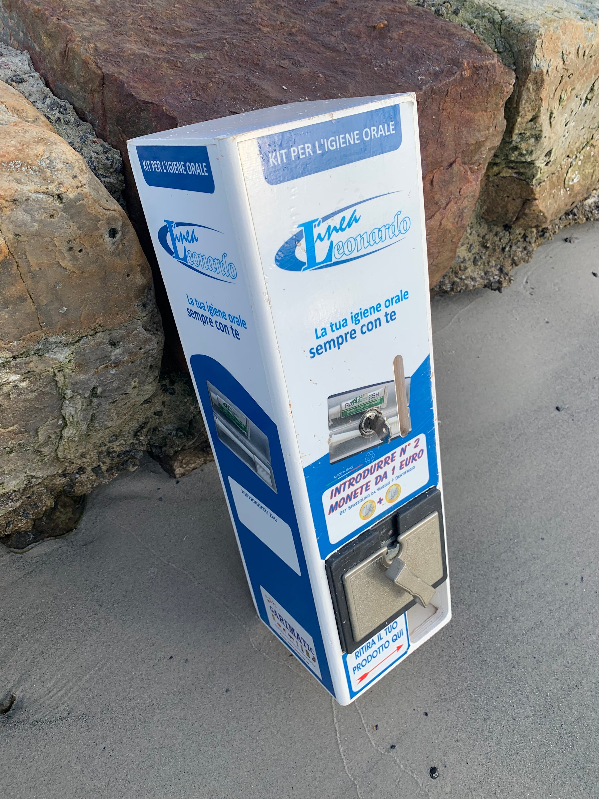 Ein witziger Verkaufsautomat aus Italien. Früher konnte man darin eine Zahnbürste mit Zahnpasta entnehmen. Wir garantieren die Funktion nicht, aber er ist dekorativ.