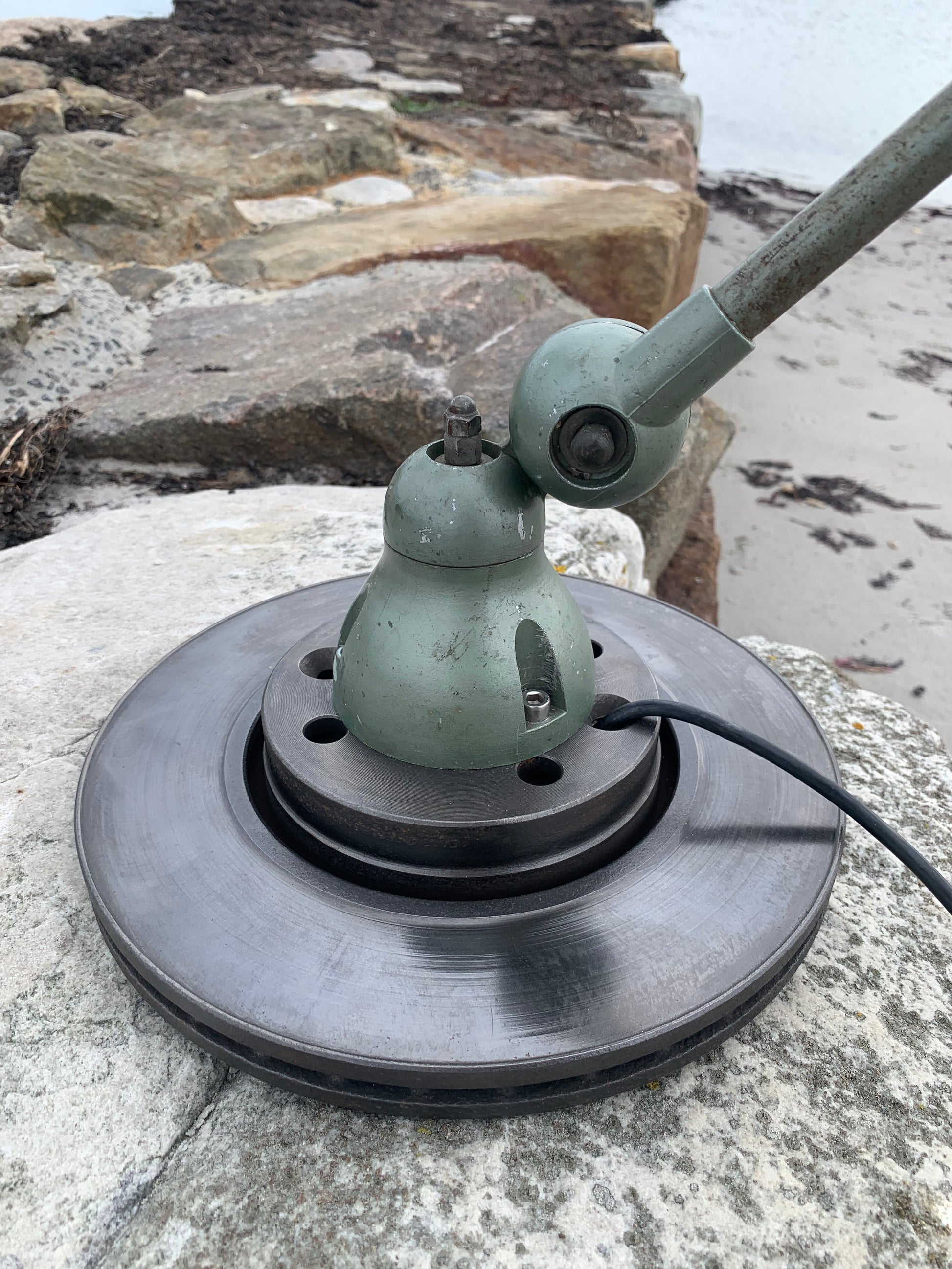 Wunderschöne Jieldé-Lampe in einem schönen Grün. Der Zahn der Zeit hat an der Lampe ihren Tribut gefordert, sie erscheint mit viel Patina und richtet sich an diejenigen unter Ihnen, die das Perfekte im Unperfekten sehen.