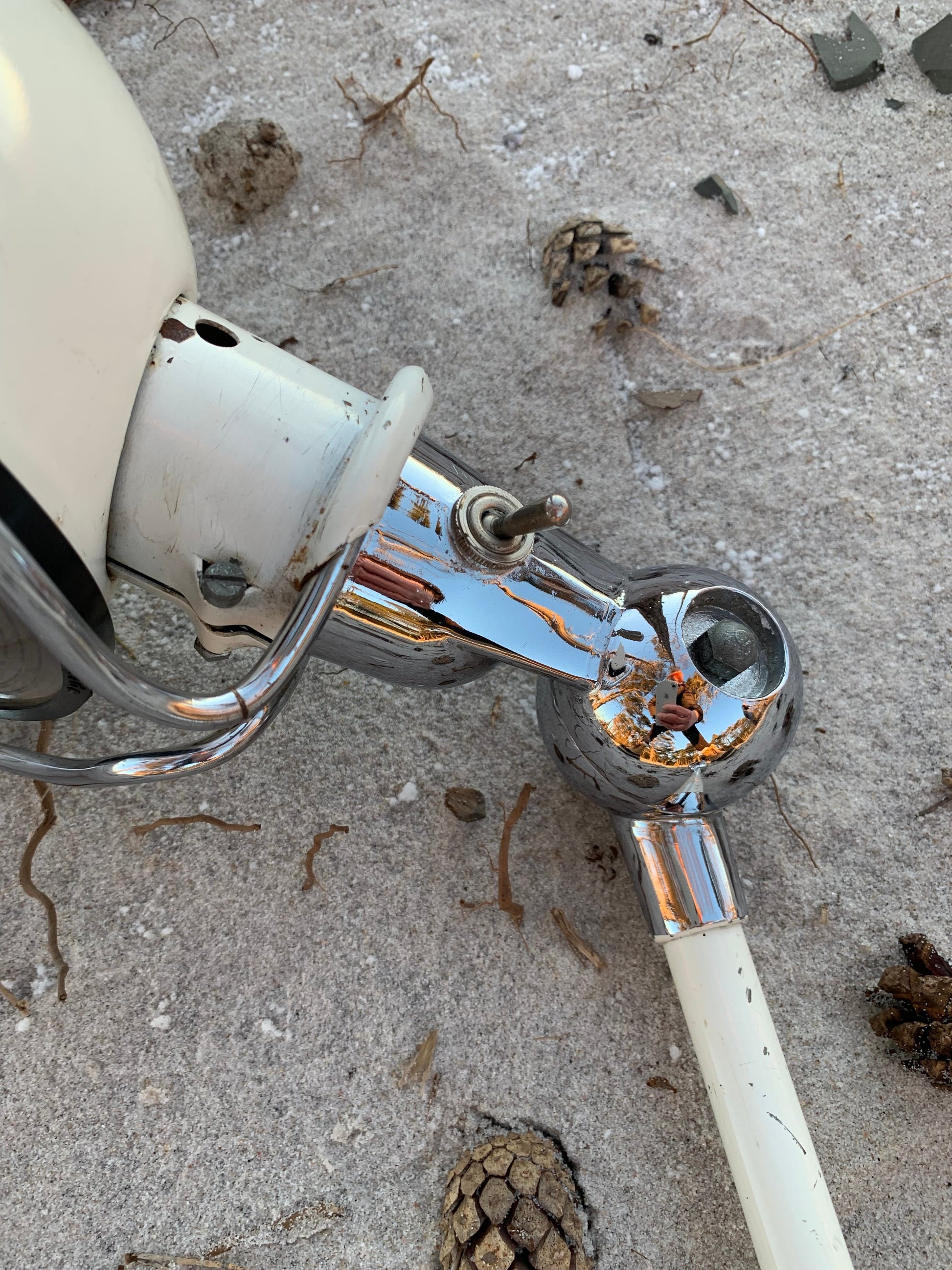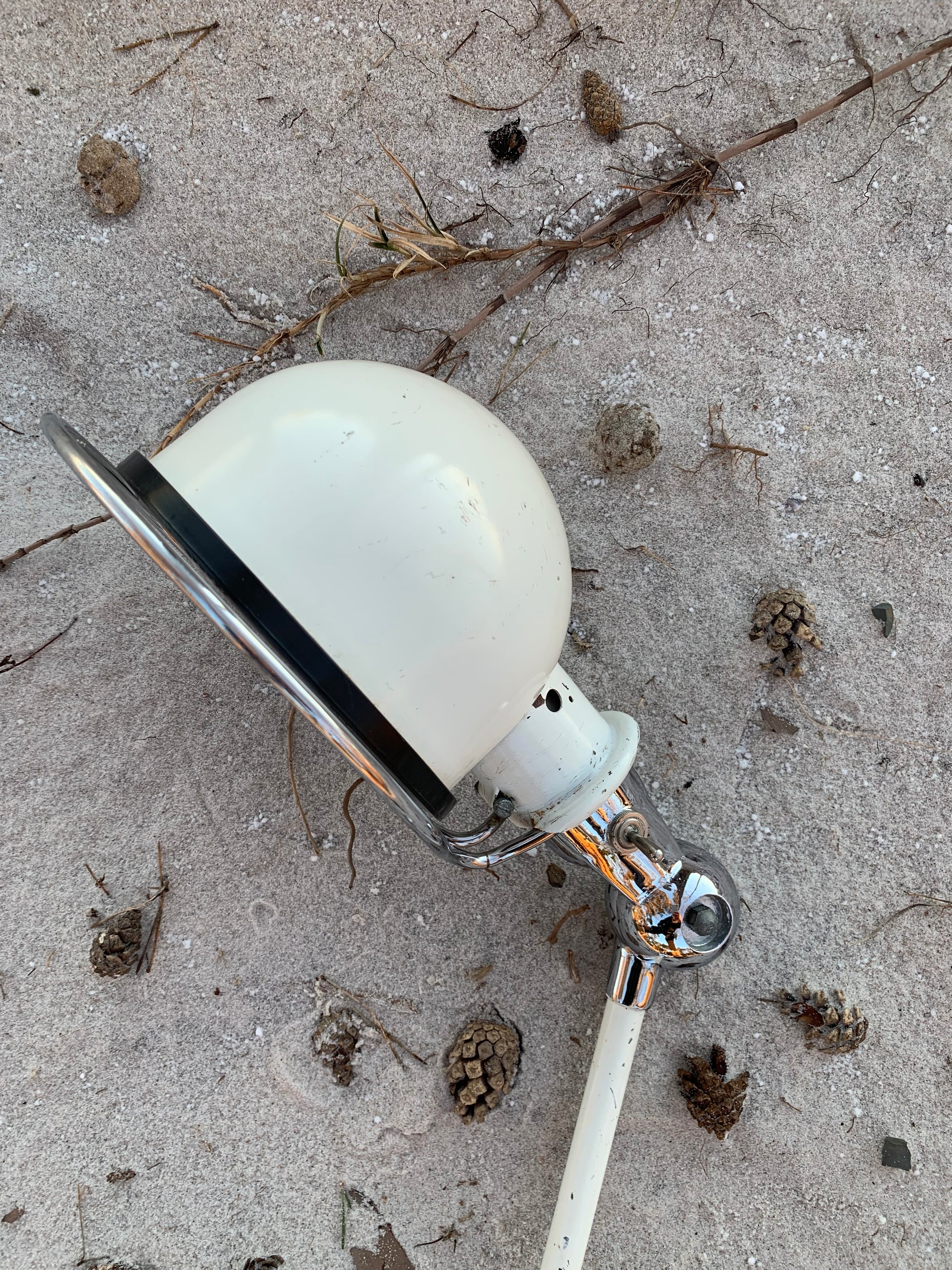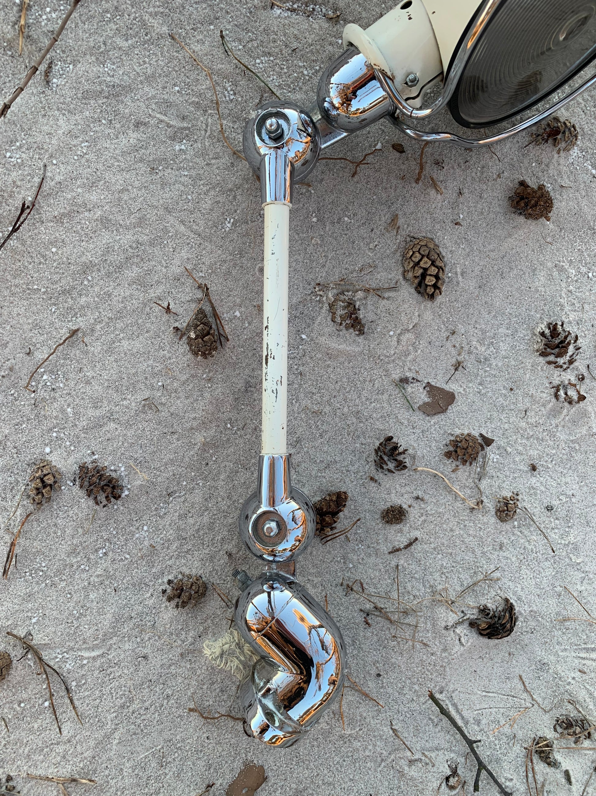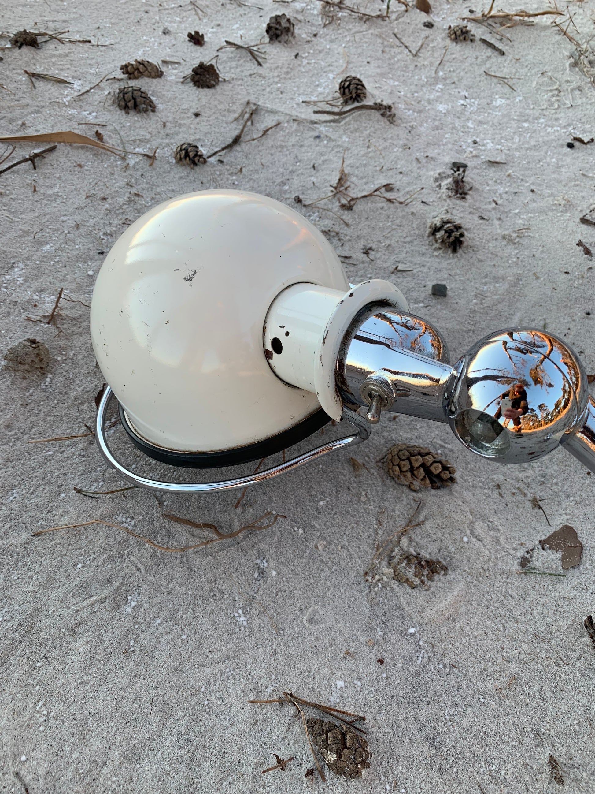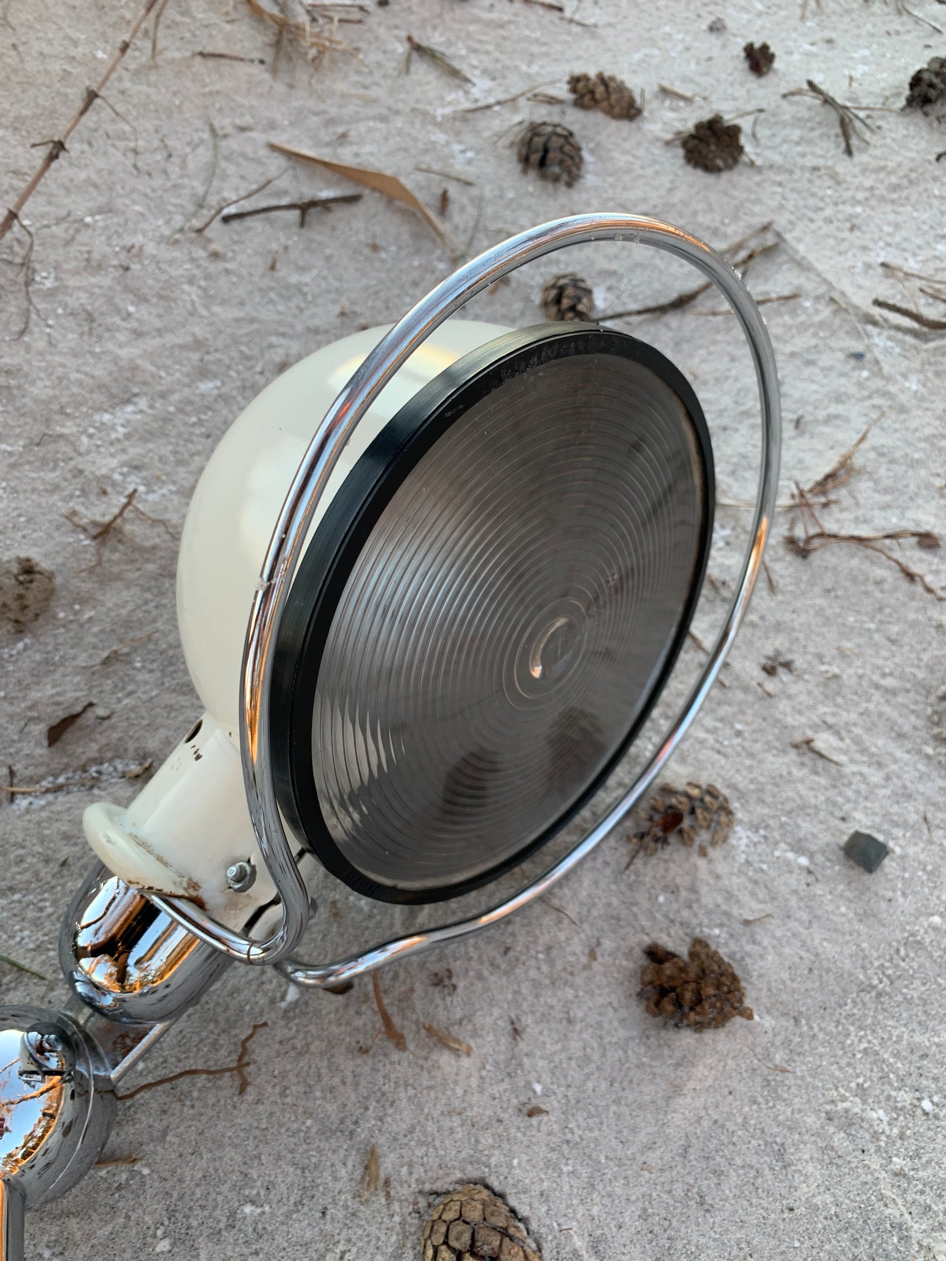 Selten gesehene Version der schönen Jieldé-Lampe. Diese Lampe in Weiß und Chrom stammt aus einer Klinik. Die Lampe hat eine schöne Patina und eine Streulichtblende, die aber bei Bedarf abgenommen werden kann.