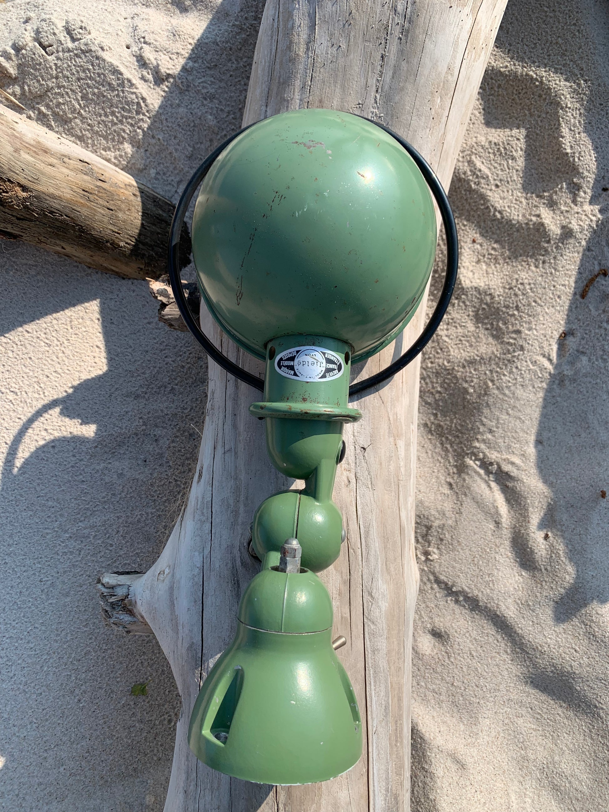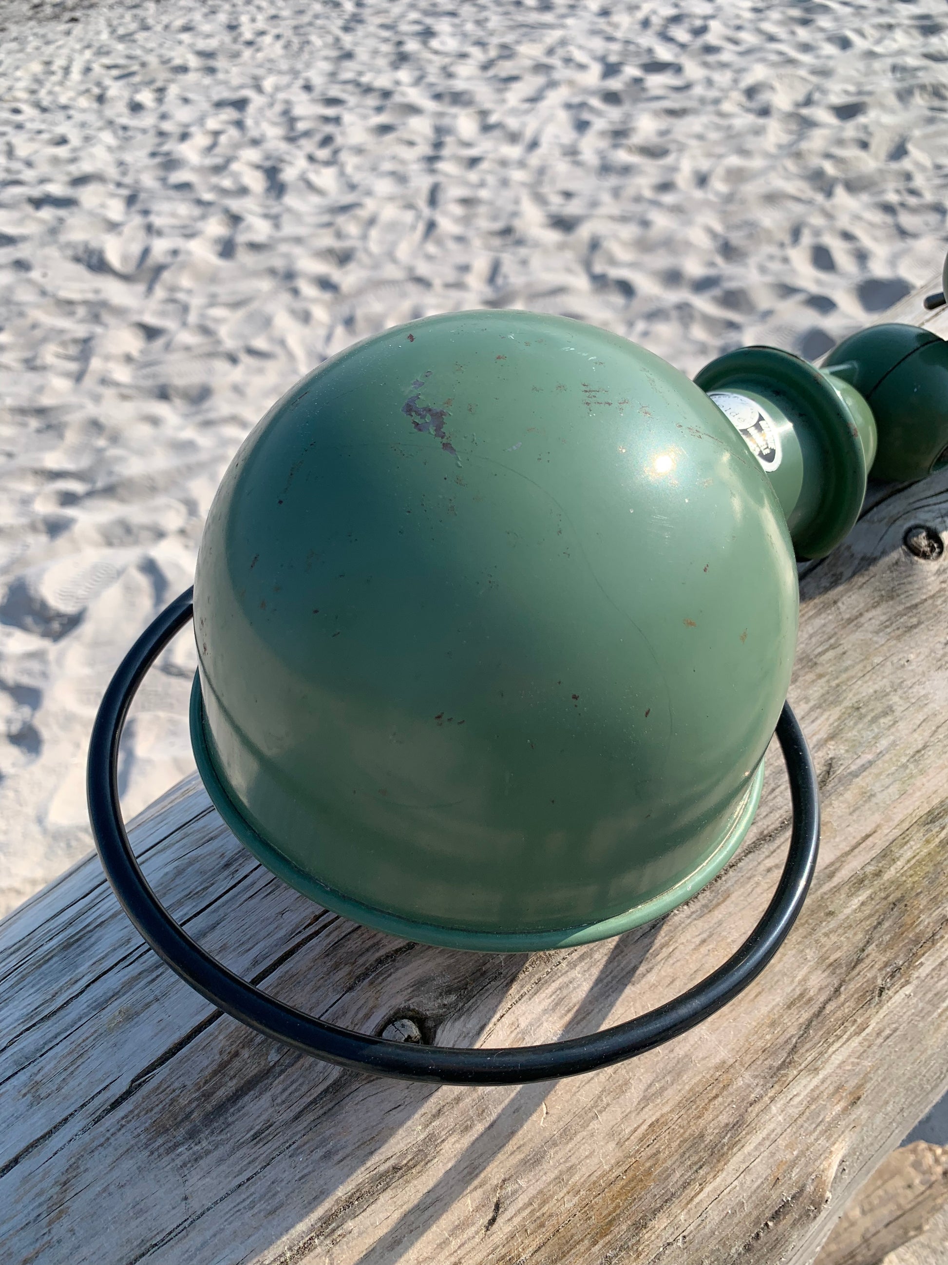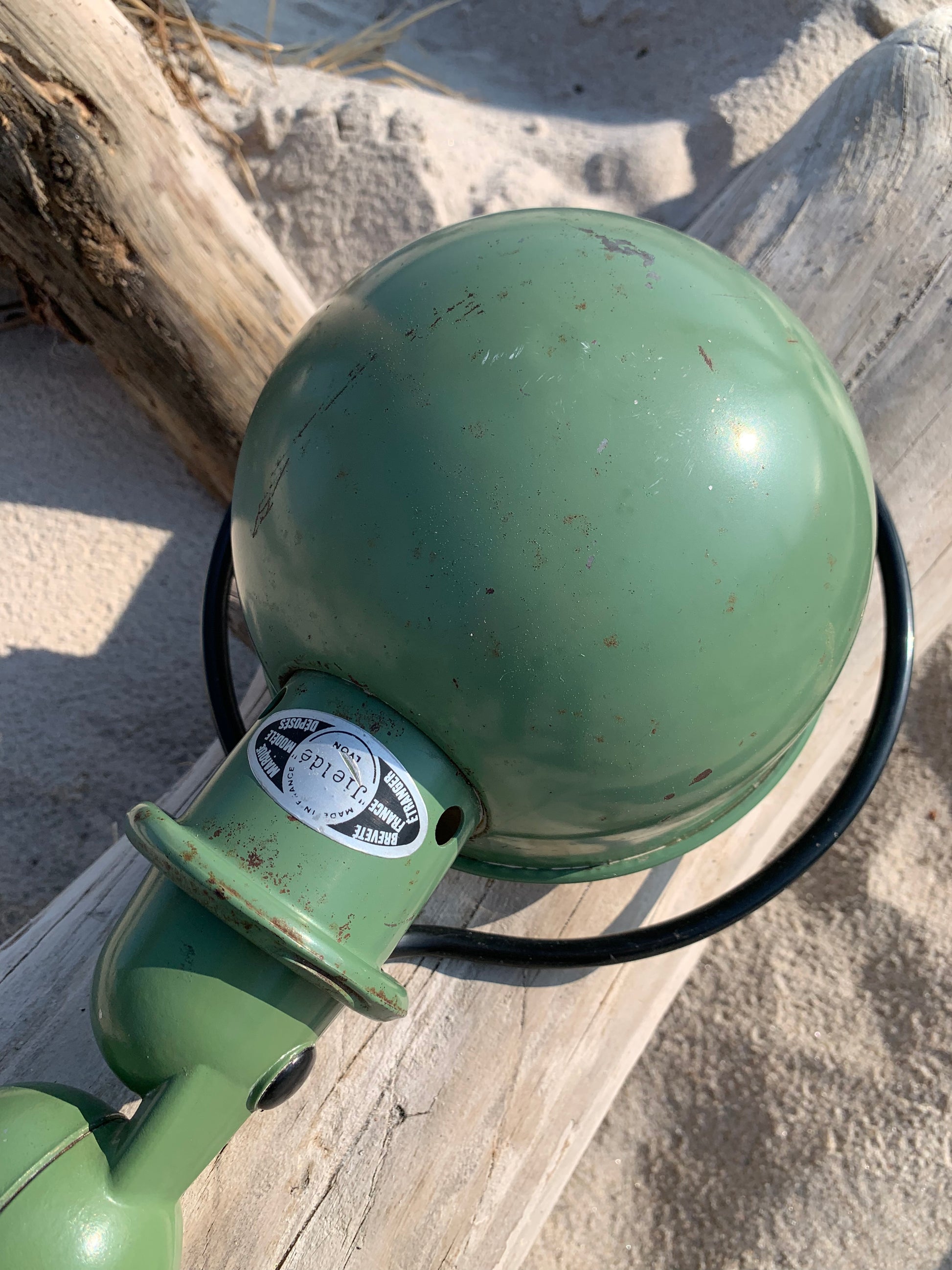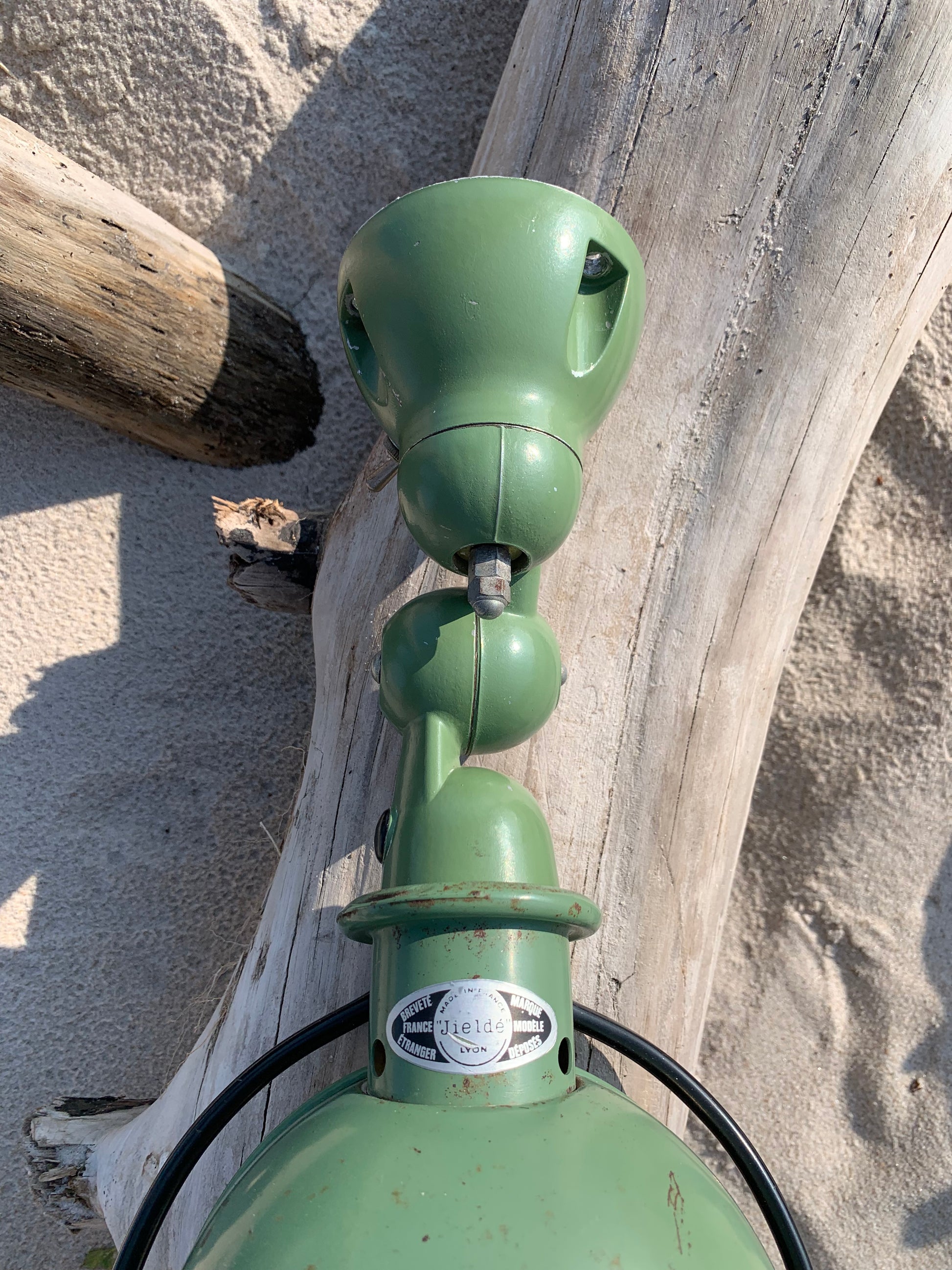 Wunderschöne grüne Jieldé-Lampe mit Patina. Die Lampe richtet sich an Sie, die im Unvollkommenen das Perfekte sehen.