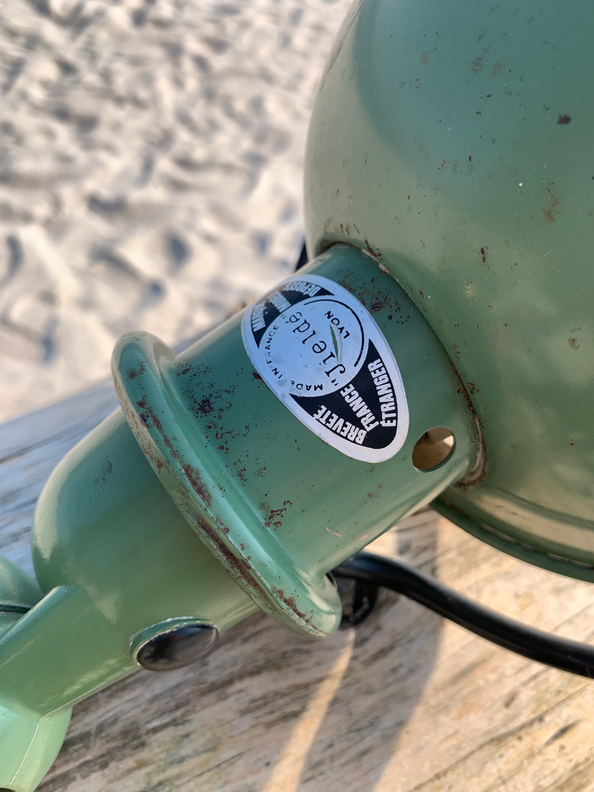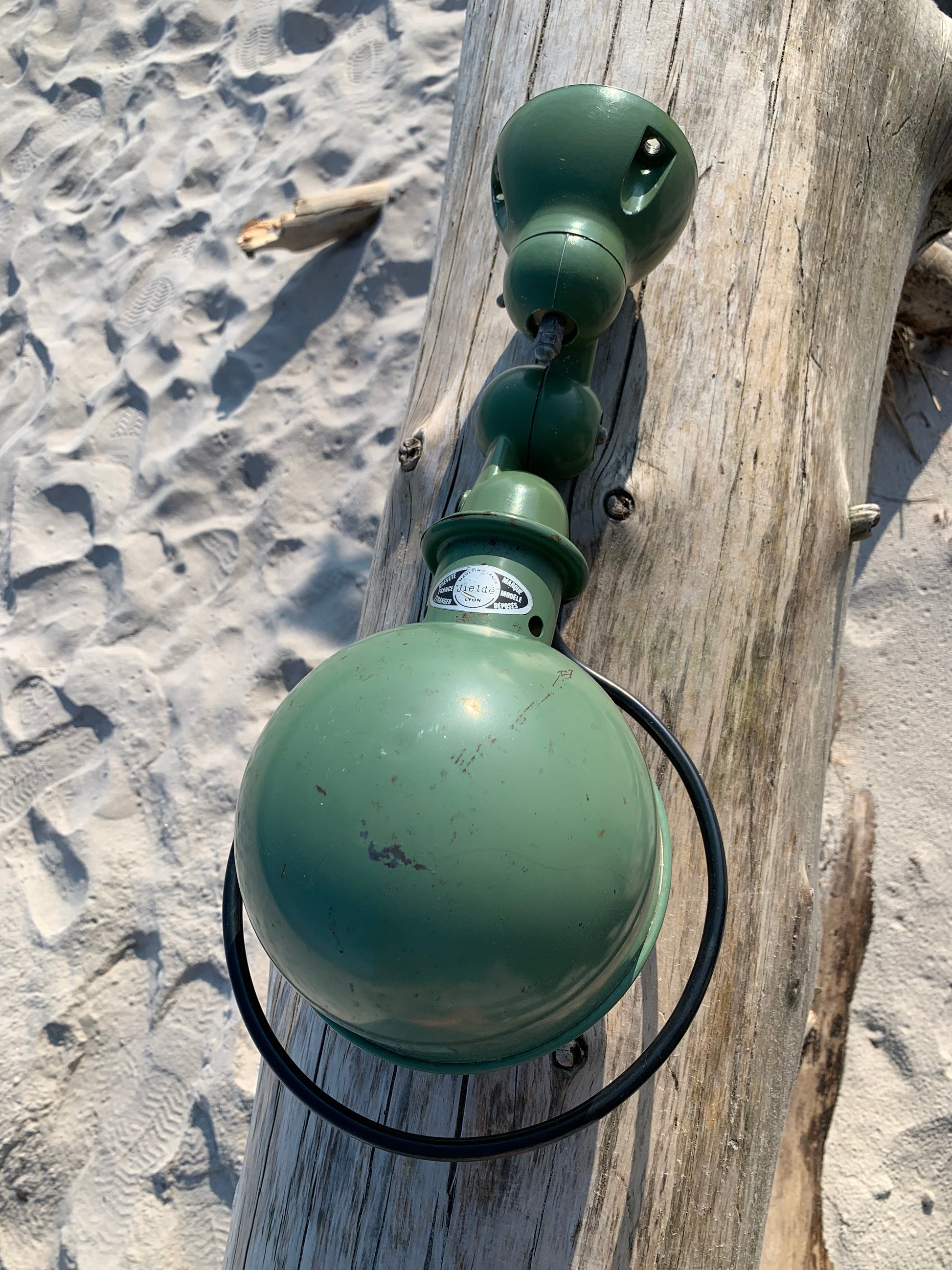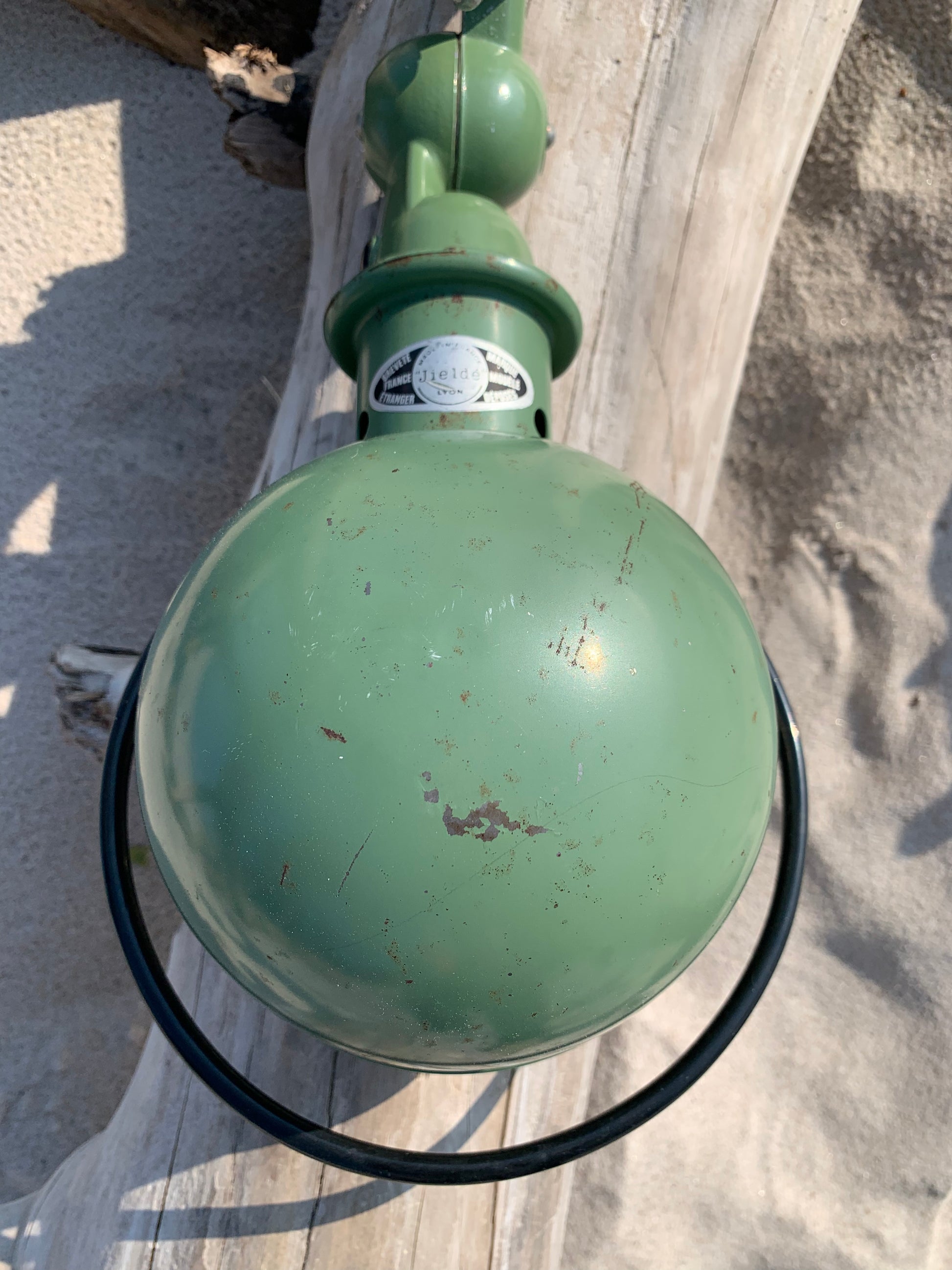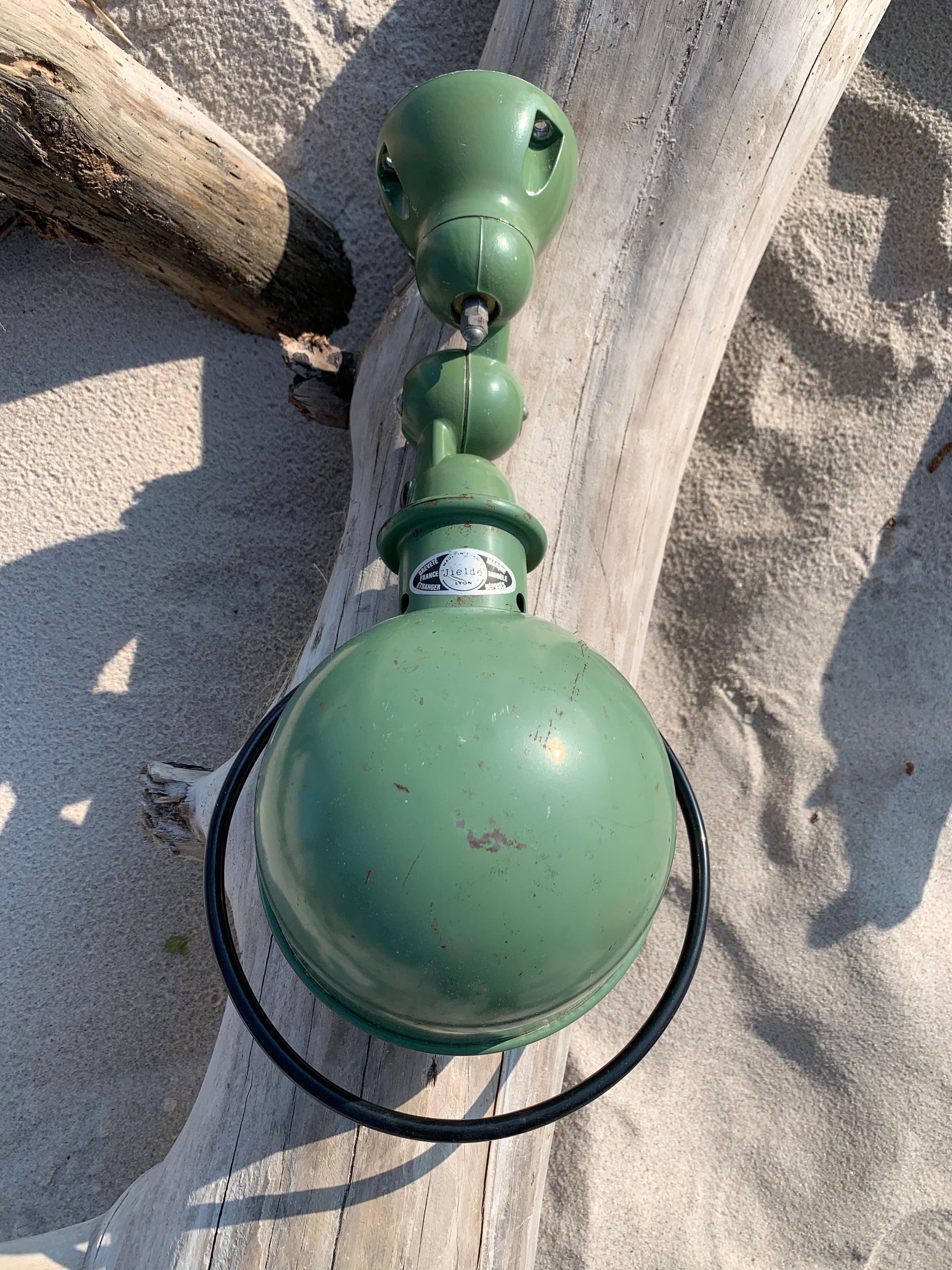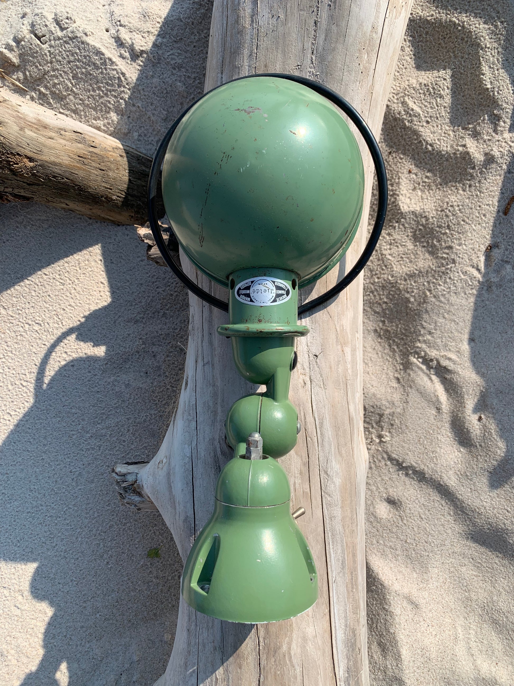 Wunderschöne grüne Jieldé-Lampe mit Patina. Die Lampe richtet sich an Sie, die im Unvollkommenen das Perfekte sehen.