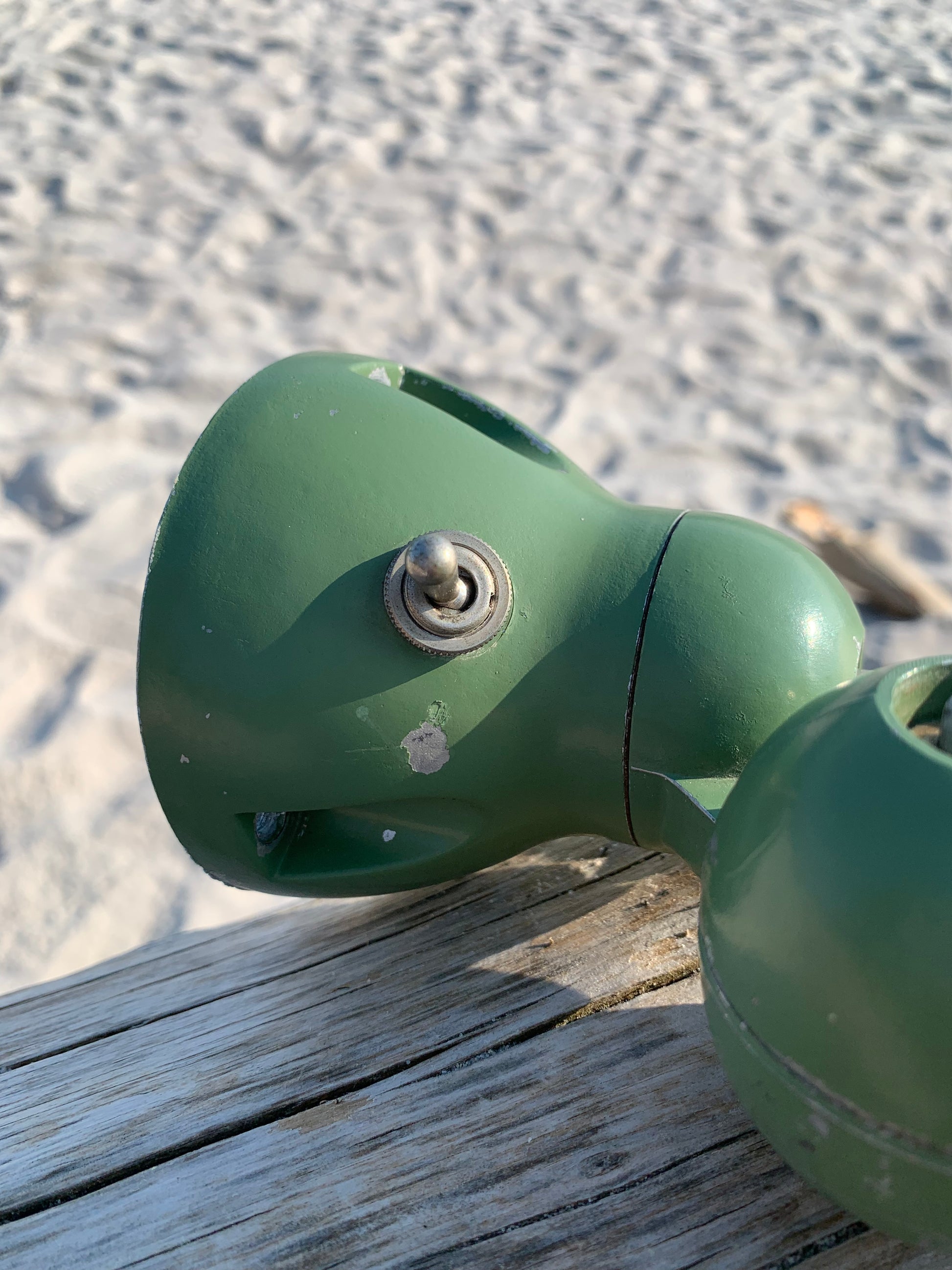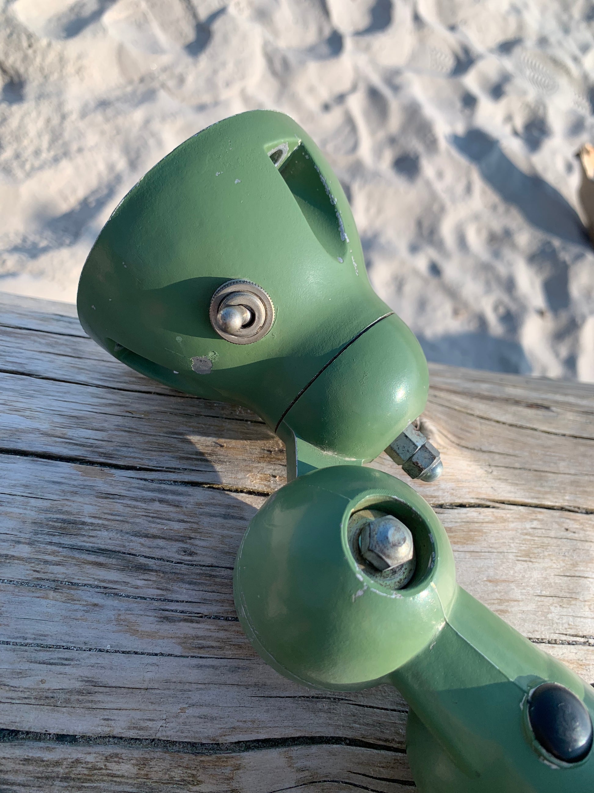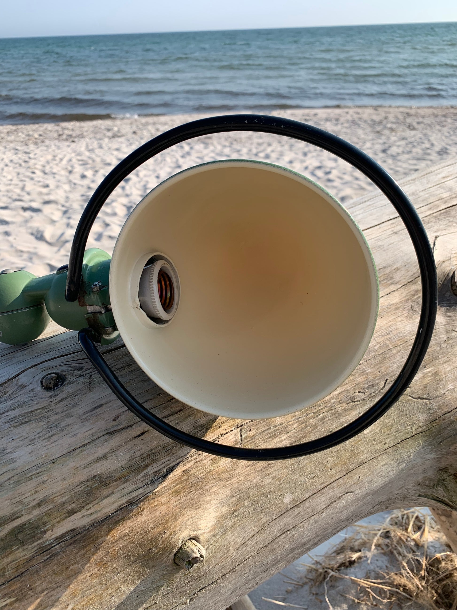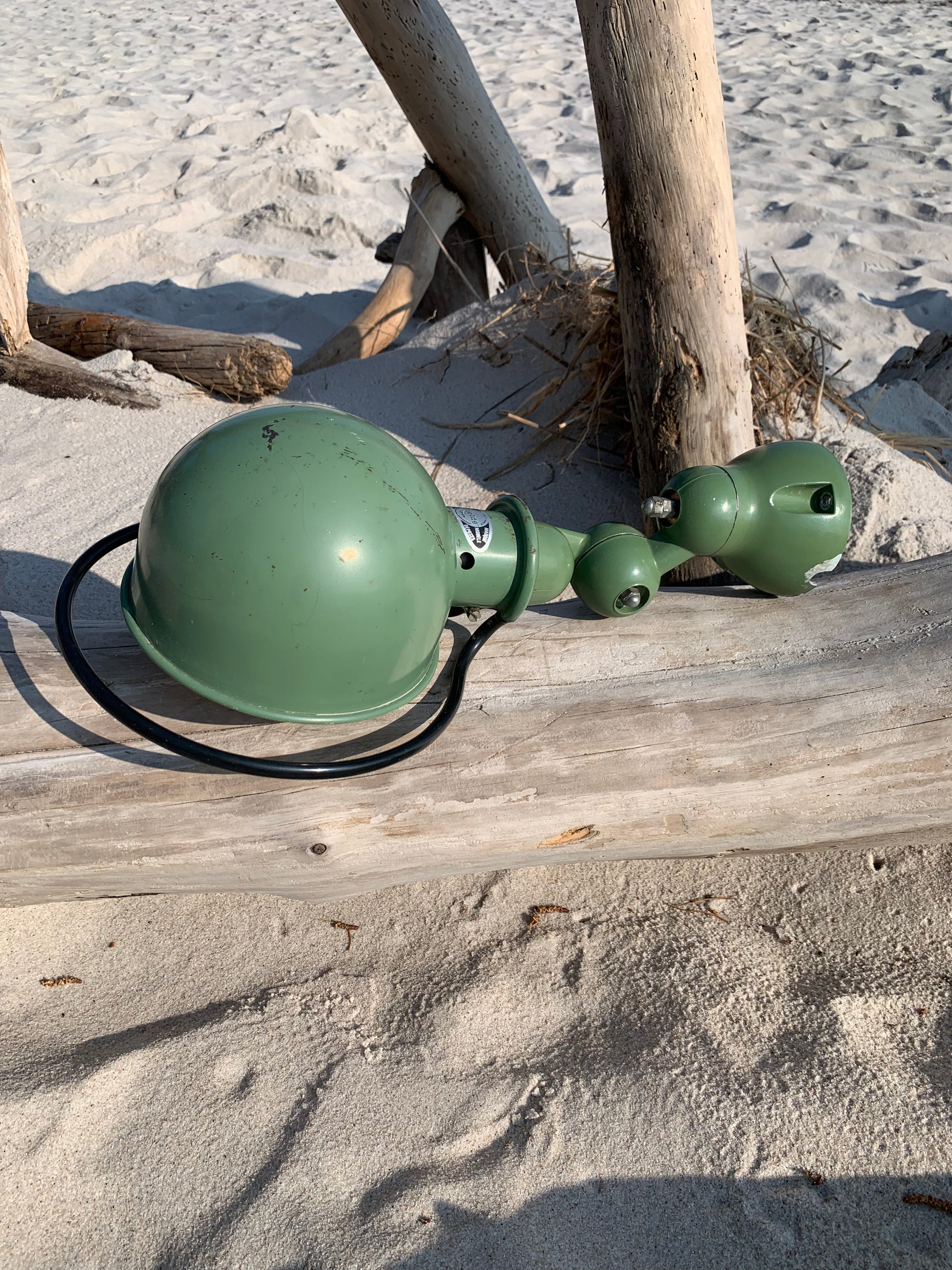 Wunderschöne grüne Jieldé-Lampe mit Patina. Die Lampe richtet sich an Sie, die im Unvollkommenen das Perfekte sehen.