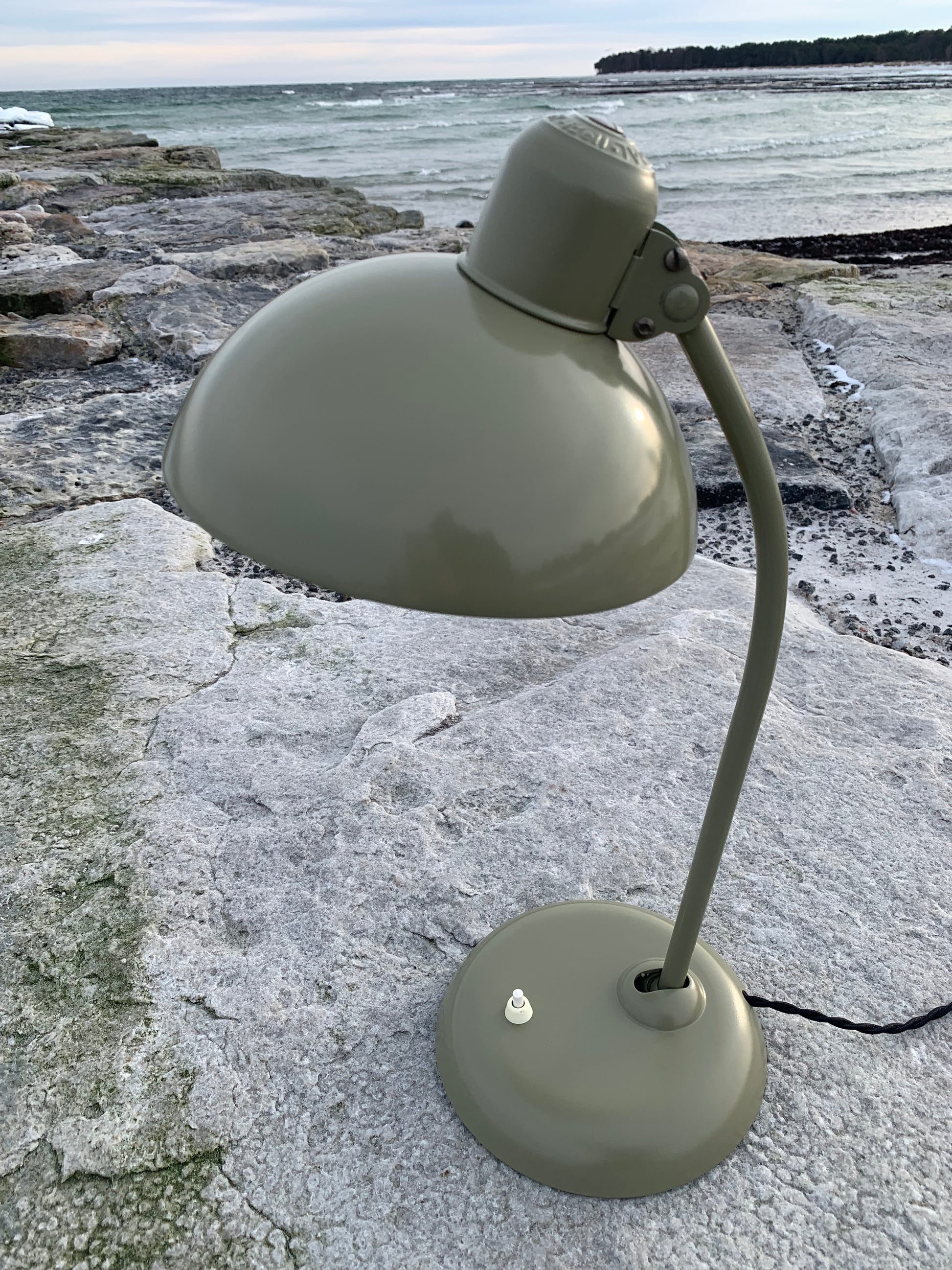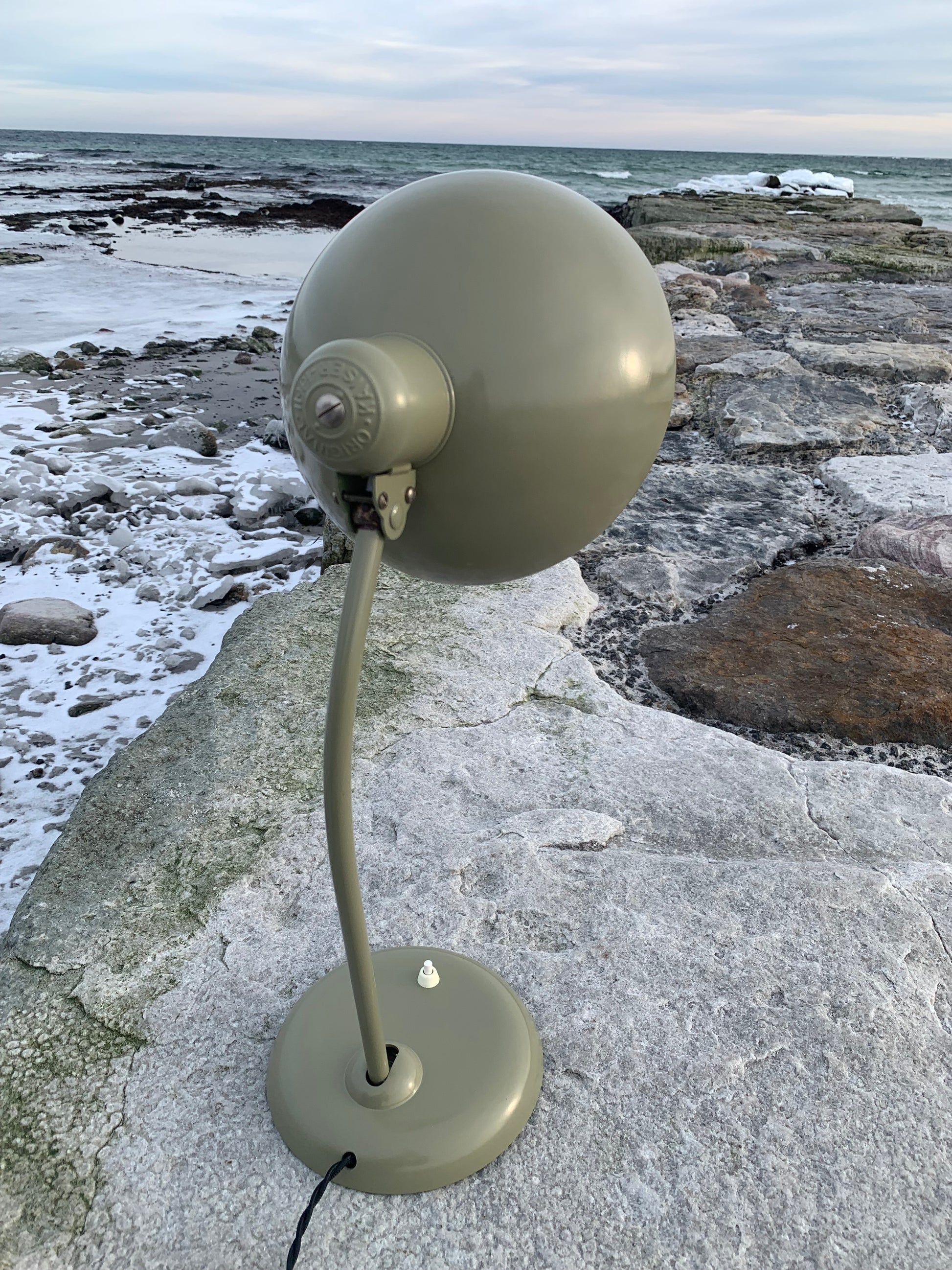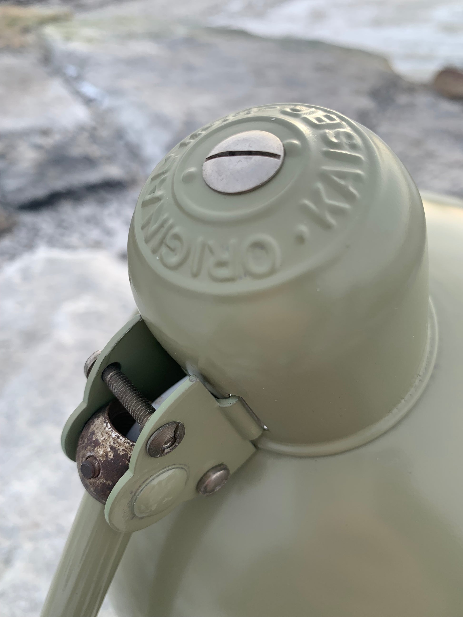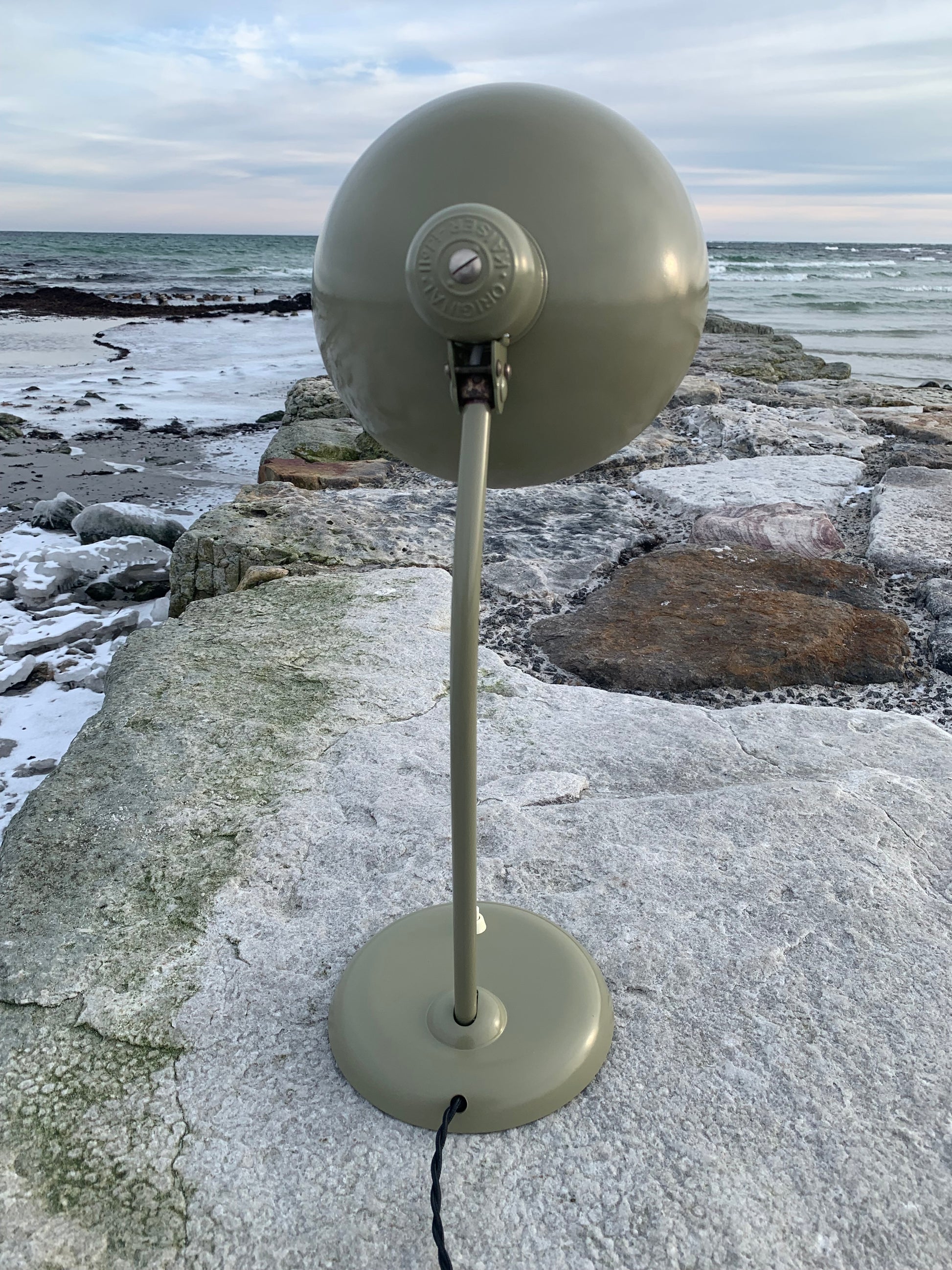 Dieses Exemplar wurde sorgfältig restauriert und präsentiert sich mit neuem Lack und neuer Verkabelung. Trotz der Restaurierung hat die Vintage-Lampe ihren Charme bewahrt. Man erkennt noch immer die charmanten Gebrauchsspuren, die eine solche Lampe (unserer Meinung nach) auch haben sollte.