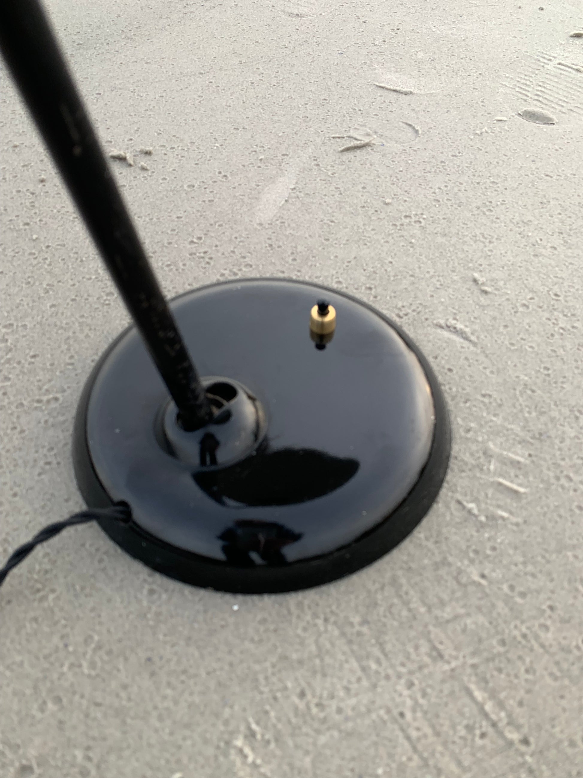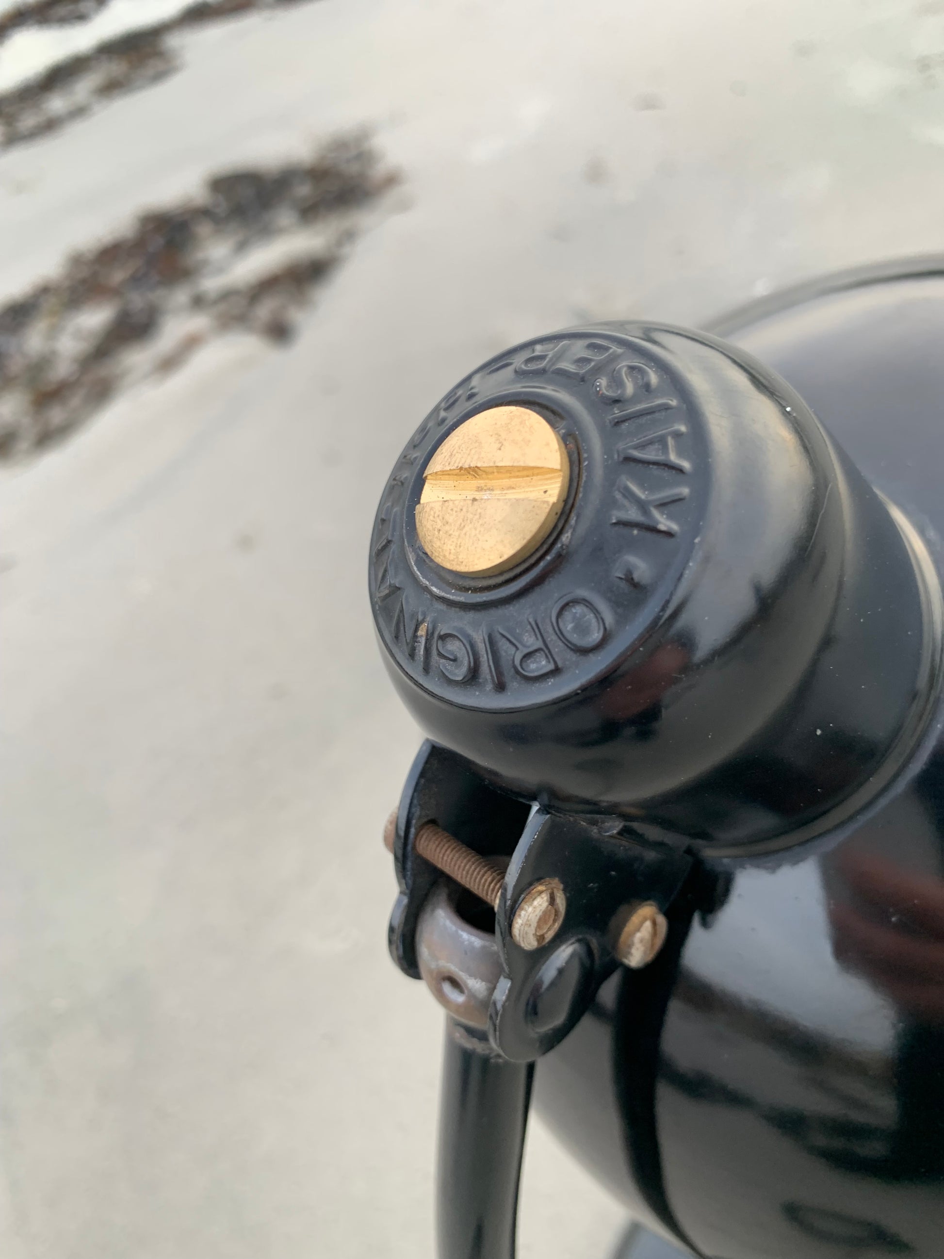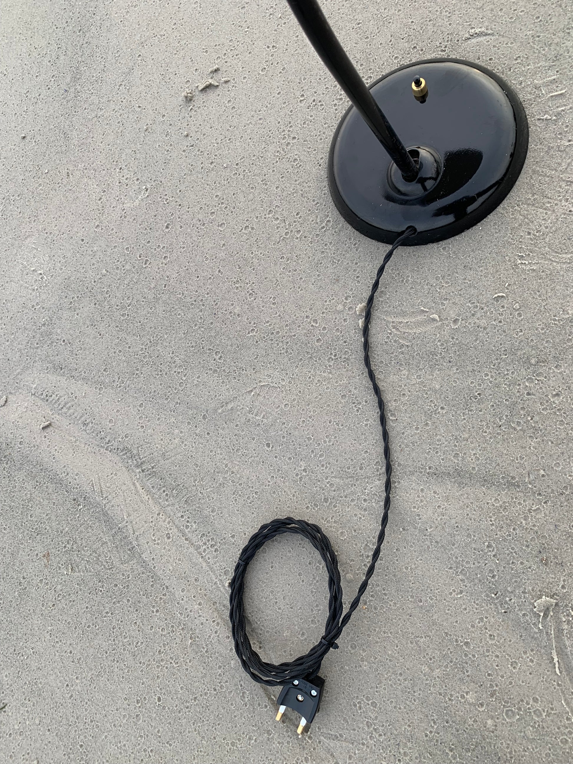 Dieses Exemplar erscheint mit der Originallackierung und neuen Kabeln. Die Lampe weist ein paar altersbedingte Gebrauchsspuren auf, die eine solche Lampe (unserer Meinung nach) fast haben müsste. Der Schatten am Bildschirmrand ist nur ein Spiegelbild des Fotografen.