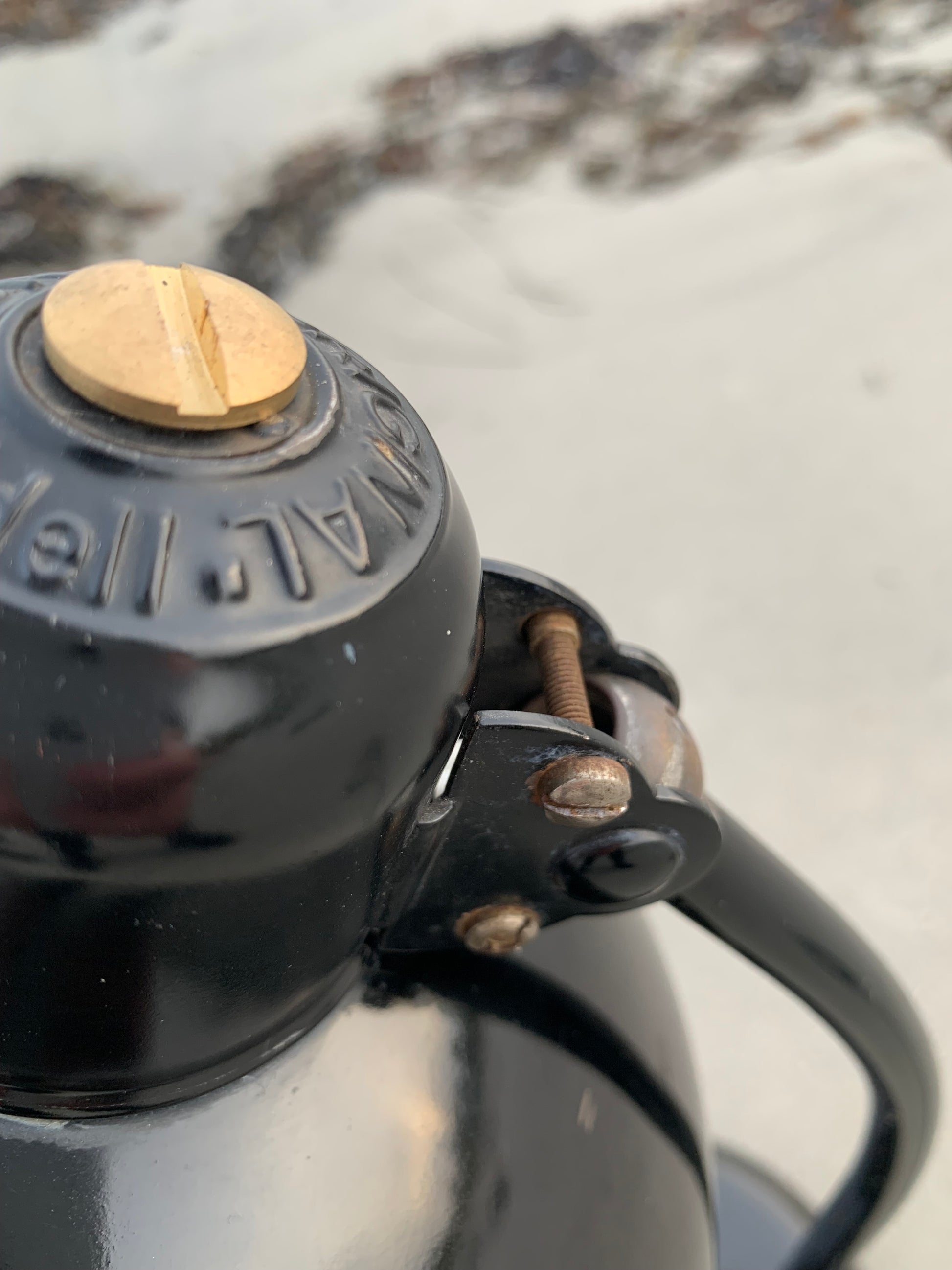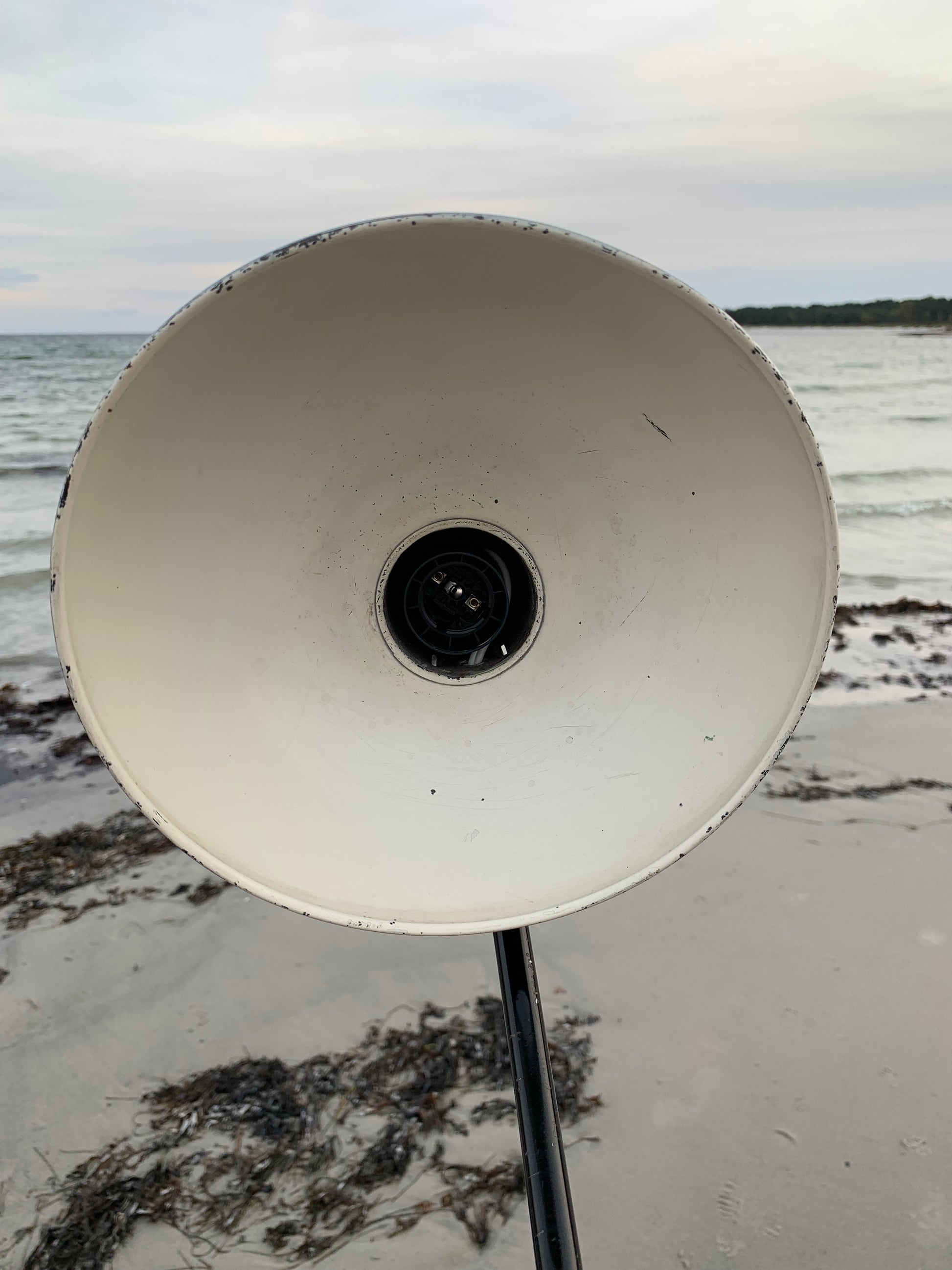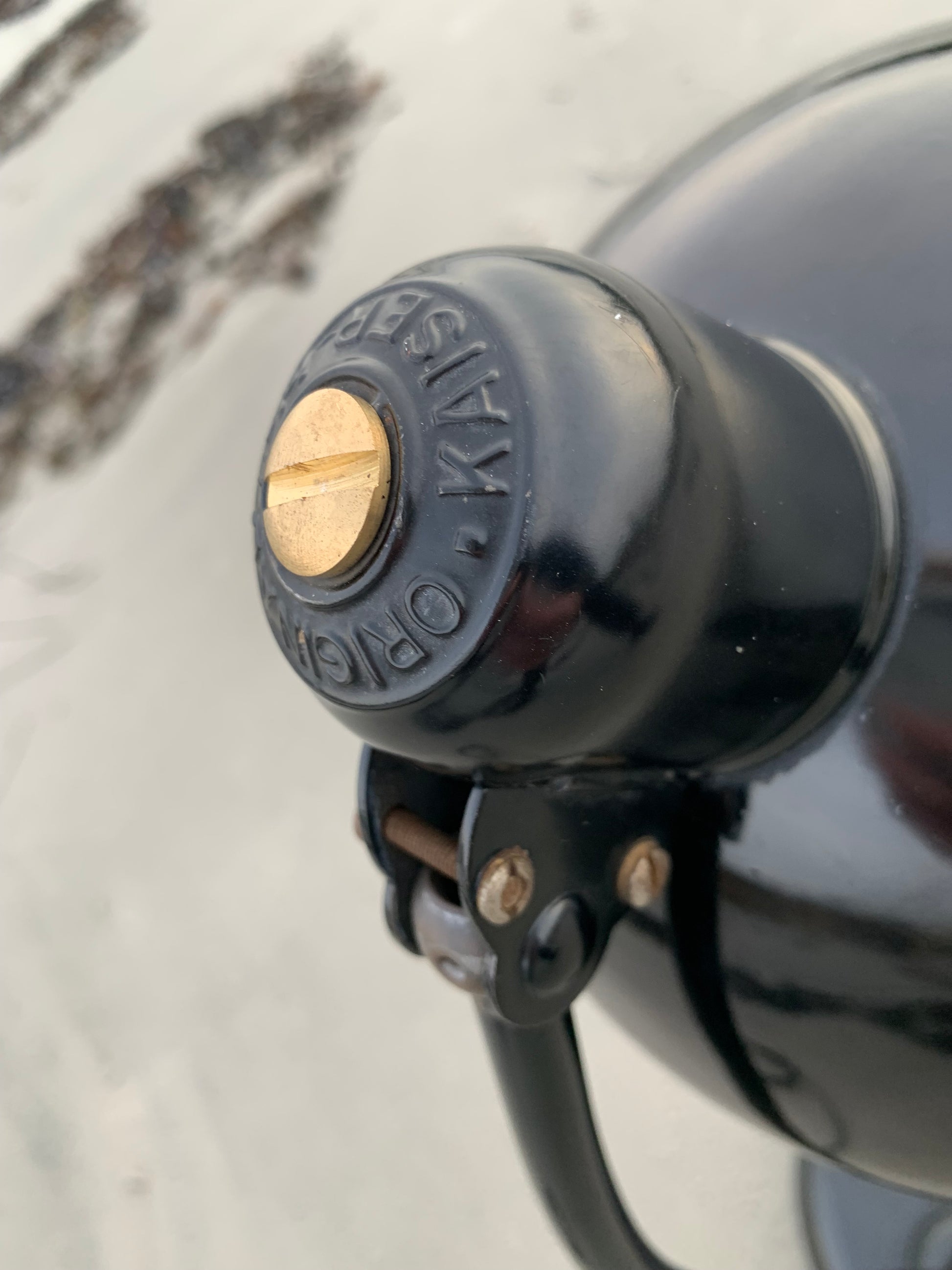 Dieses Exemplar erscheint mit der Originallackierung und neuen Kabeln. Die Lampe weist ein paar altersbedingte Gebrauchsspuren auf, die eine solche Lampe (unserer Meinung nach) fast haben müsste. Der Schatten am Bildschirmrand ist nur ein Spiegelbild des Fotografen.