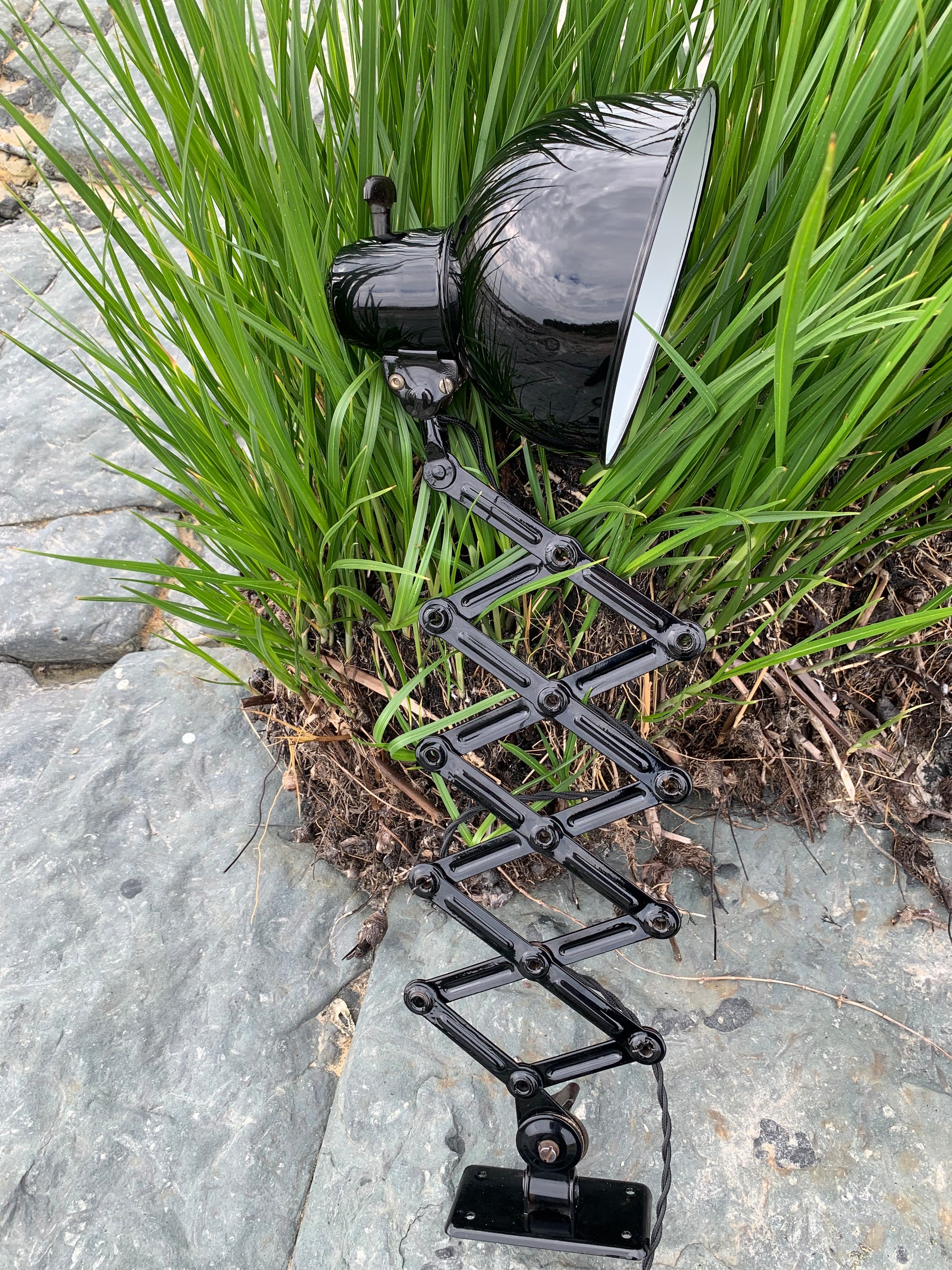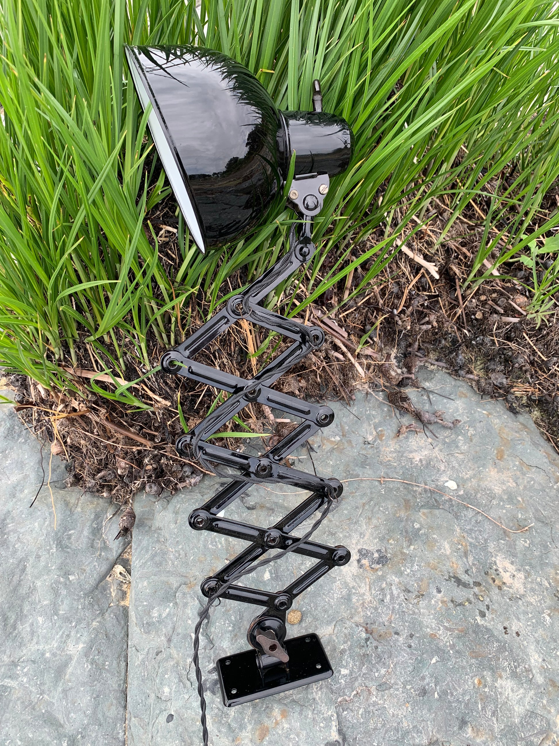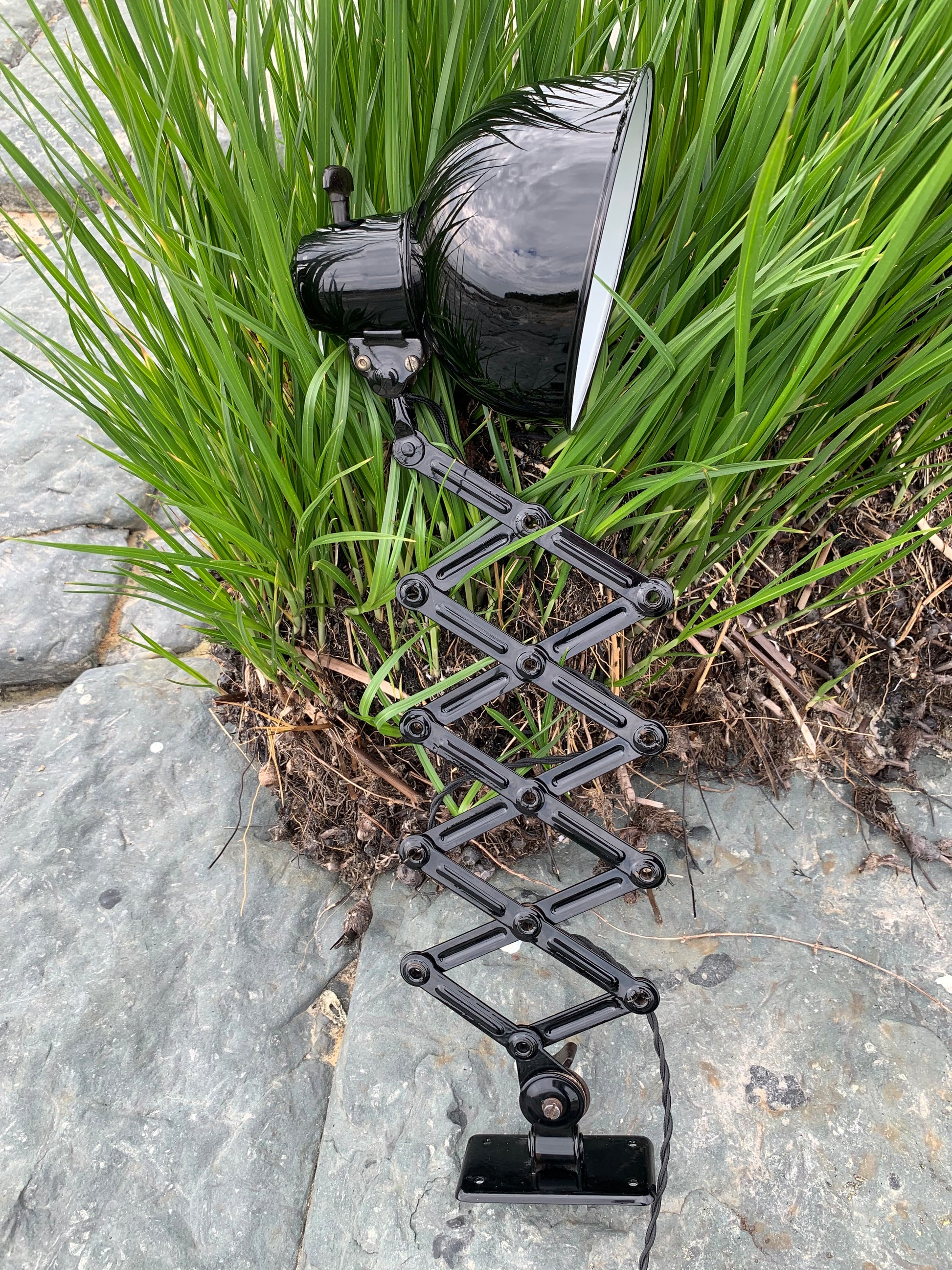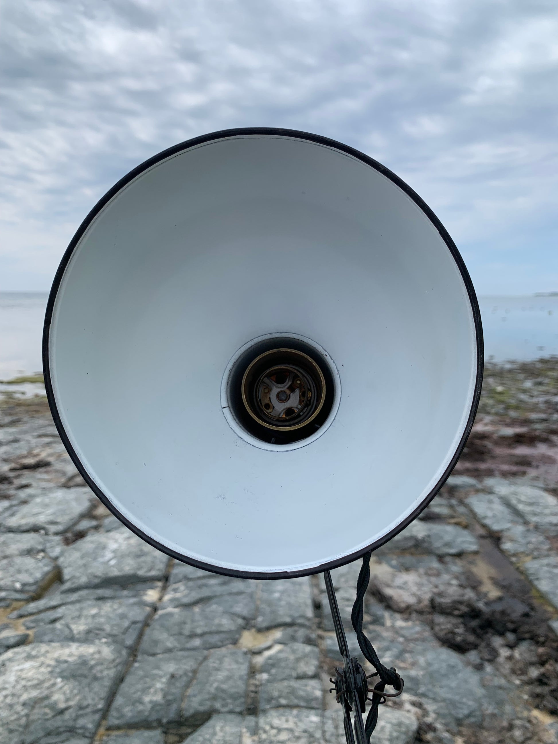 Dieses Exemplar wurde sorgfältig restauriert und erscheint mit neuer Lackierung und neuer Verkabelung. Trotz der Restaurierung hat die Vintage-Lampe ihren Charme bewahrt. Man erkennt immer noch, dass die Lampe einige charmante Gebrauchsspuren aufweist, die eine solche Lampe (unserer Meinung nach) fast haben sollte.