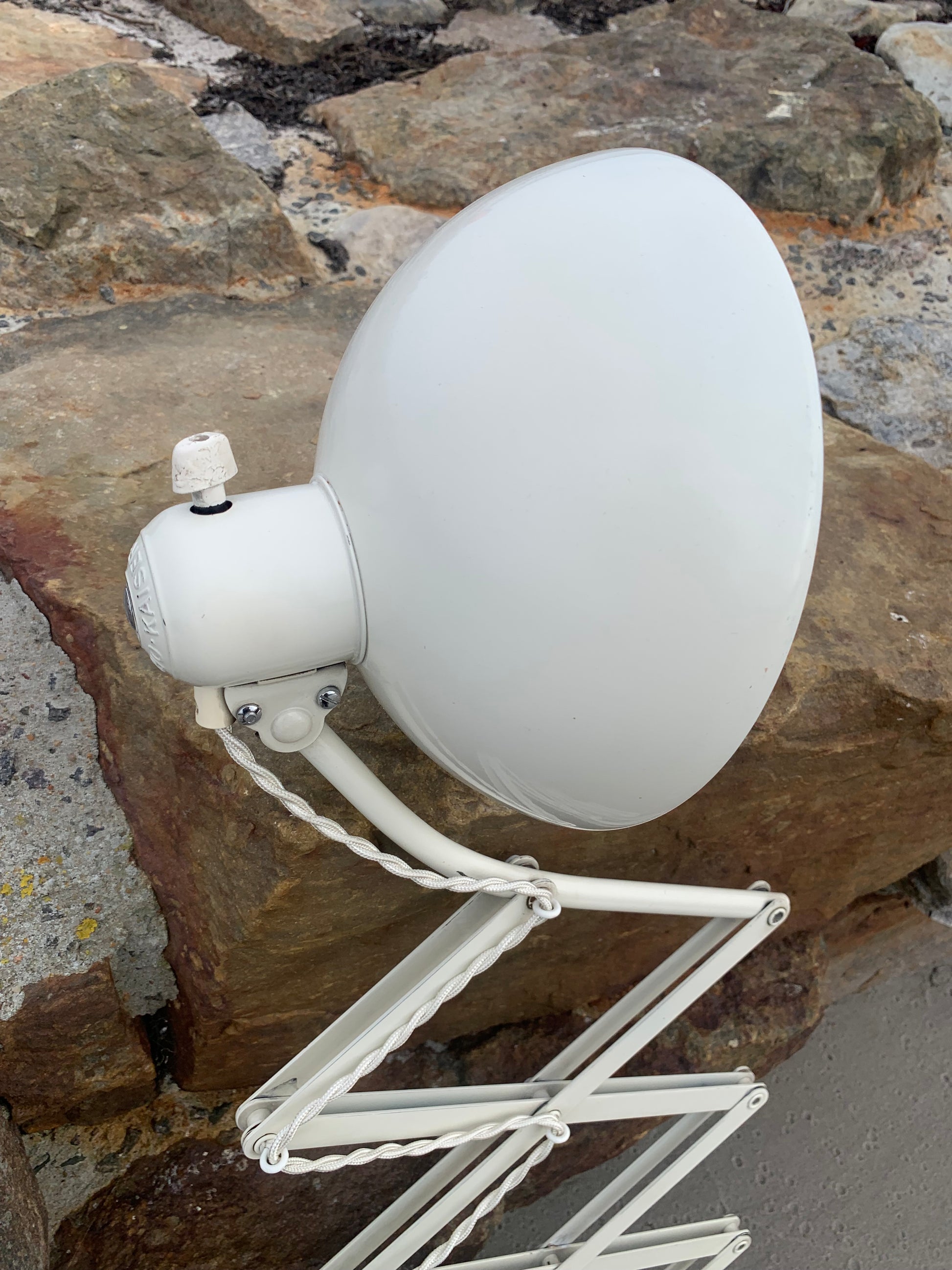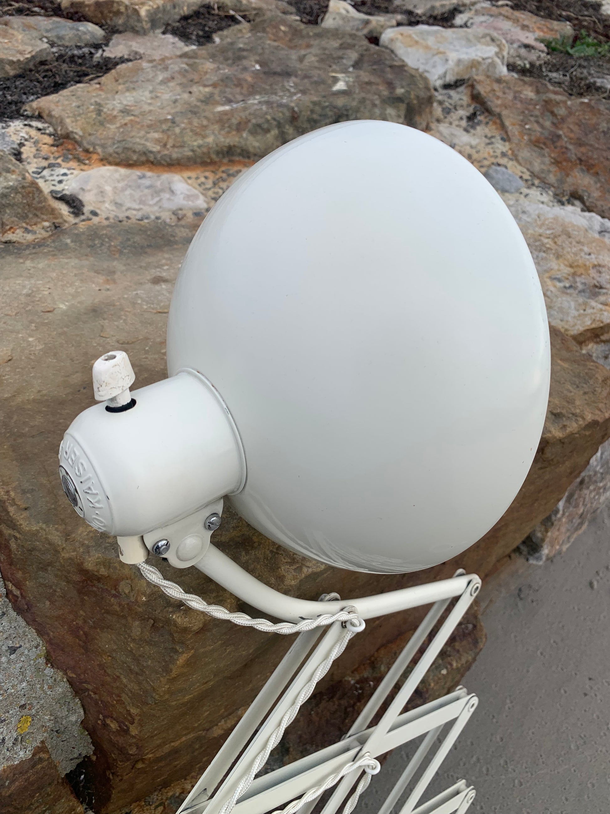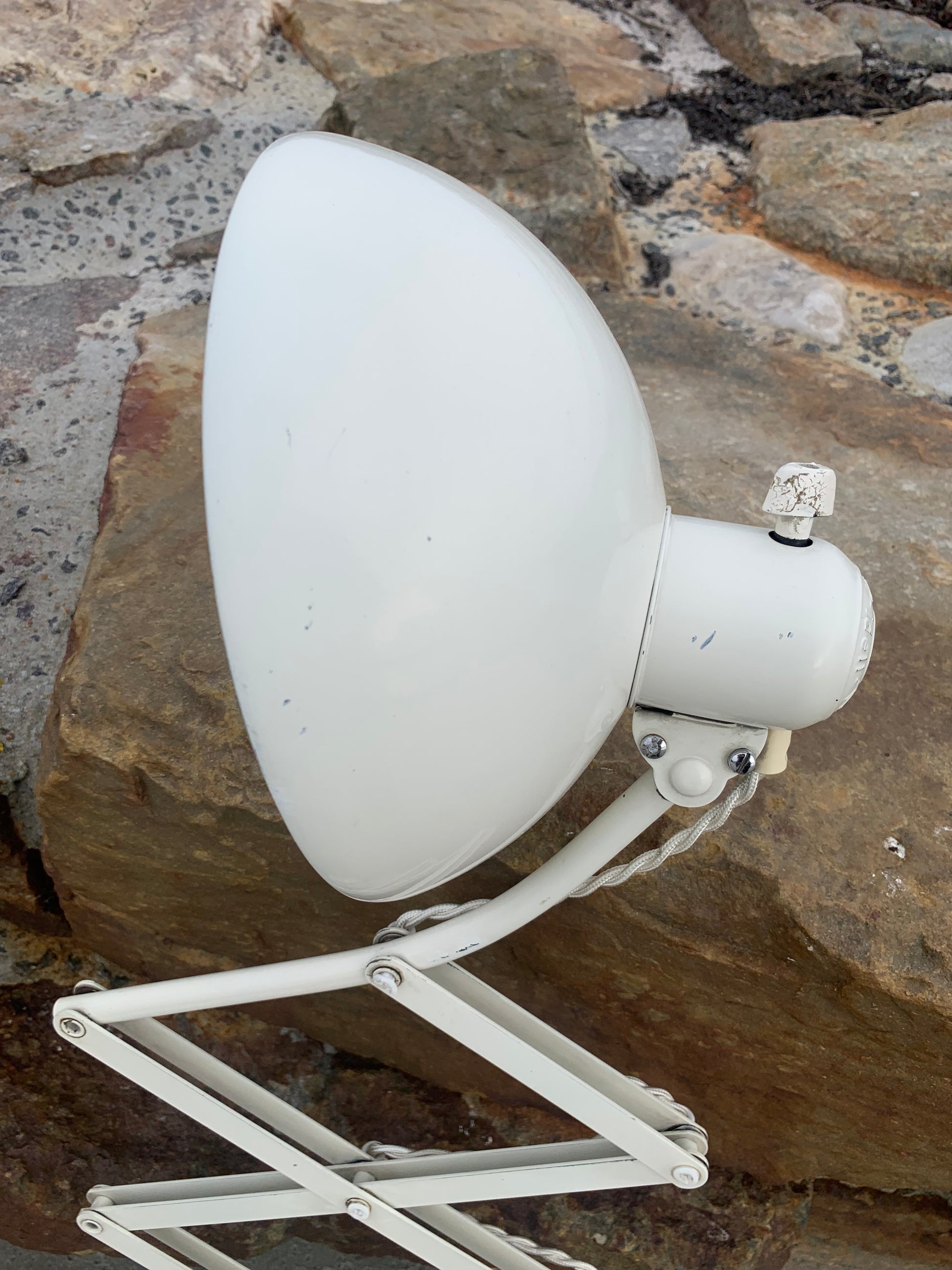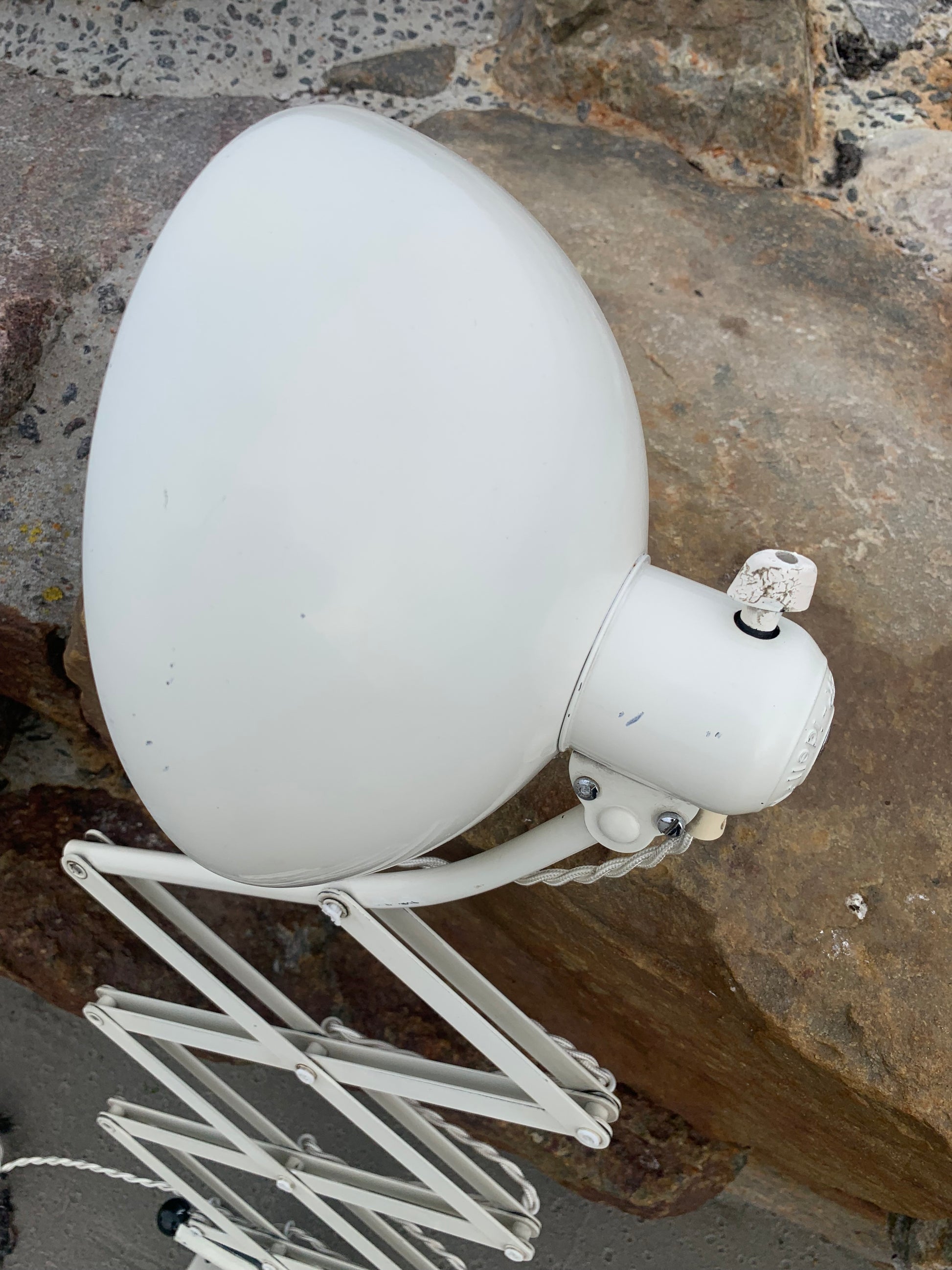 Dieses Exemplar verfügt über den Originallack und neue Kabel. Die Lampe weist altersbedingte Gebrauchsspuren auf, die eine solche Lampe (unserer Meinung nach) haben sollte.