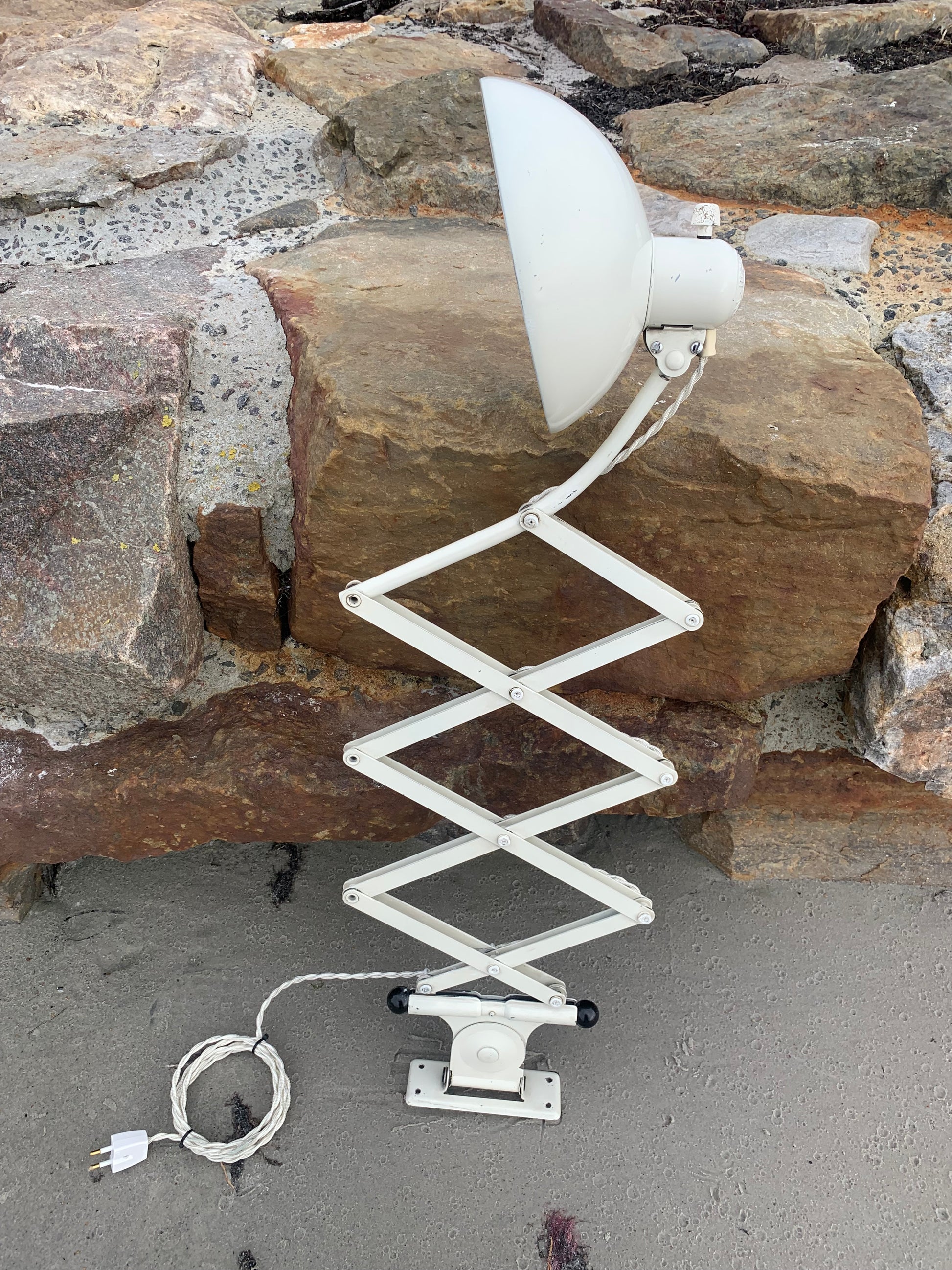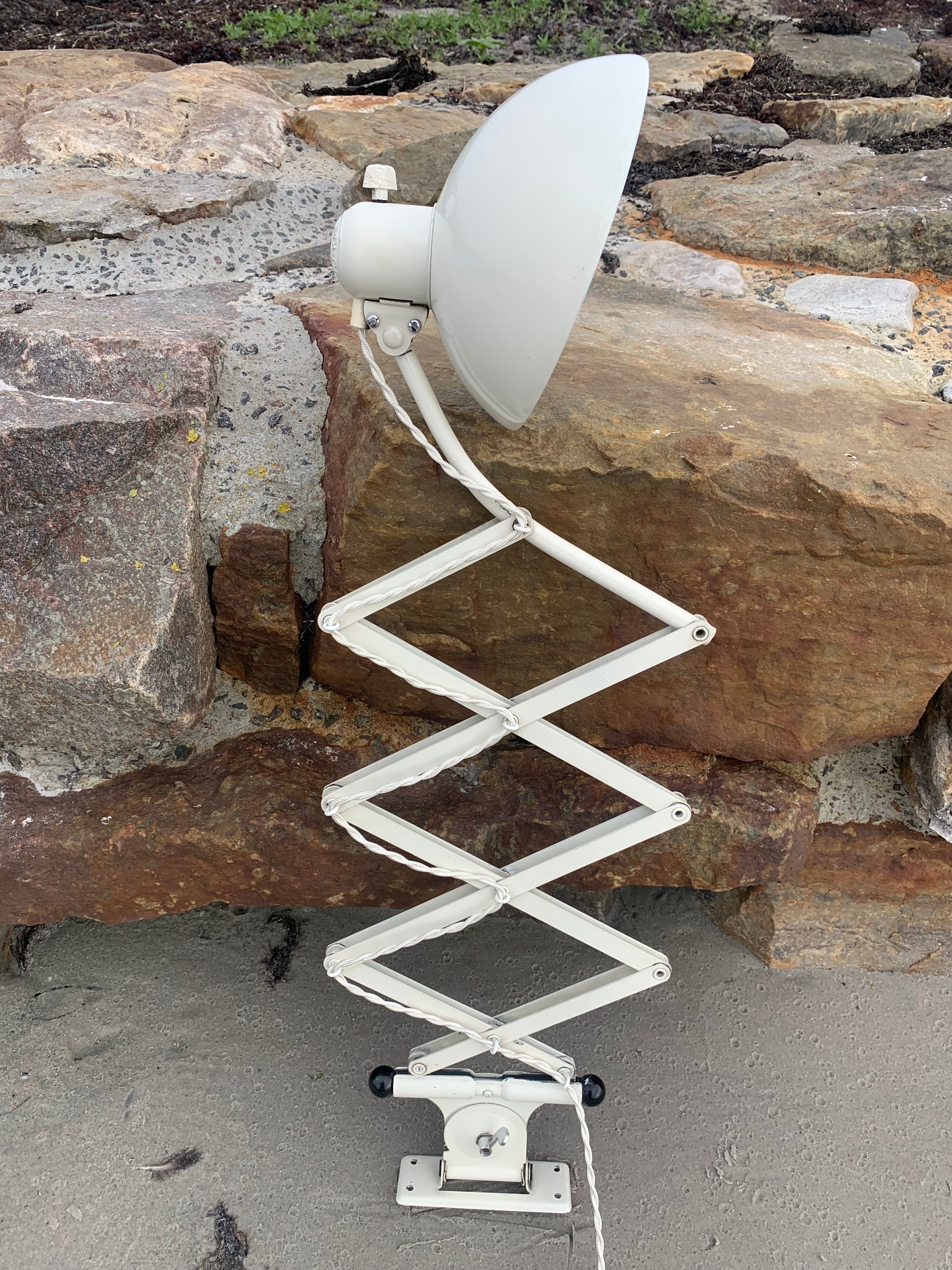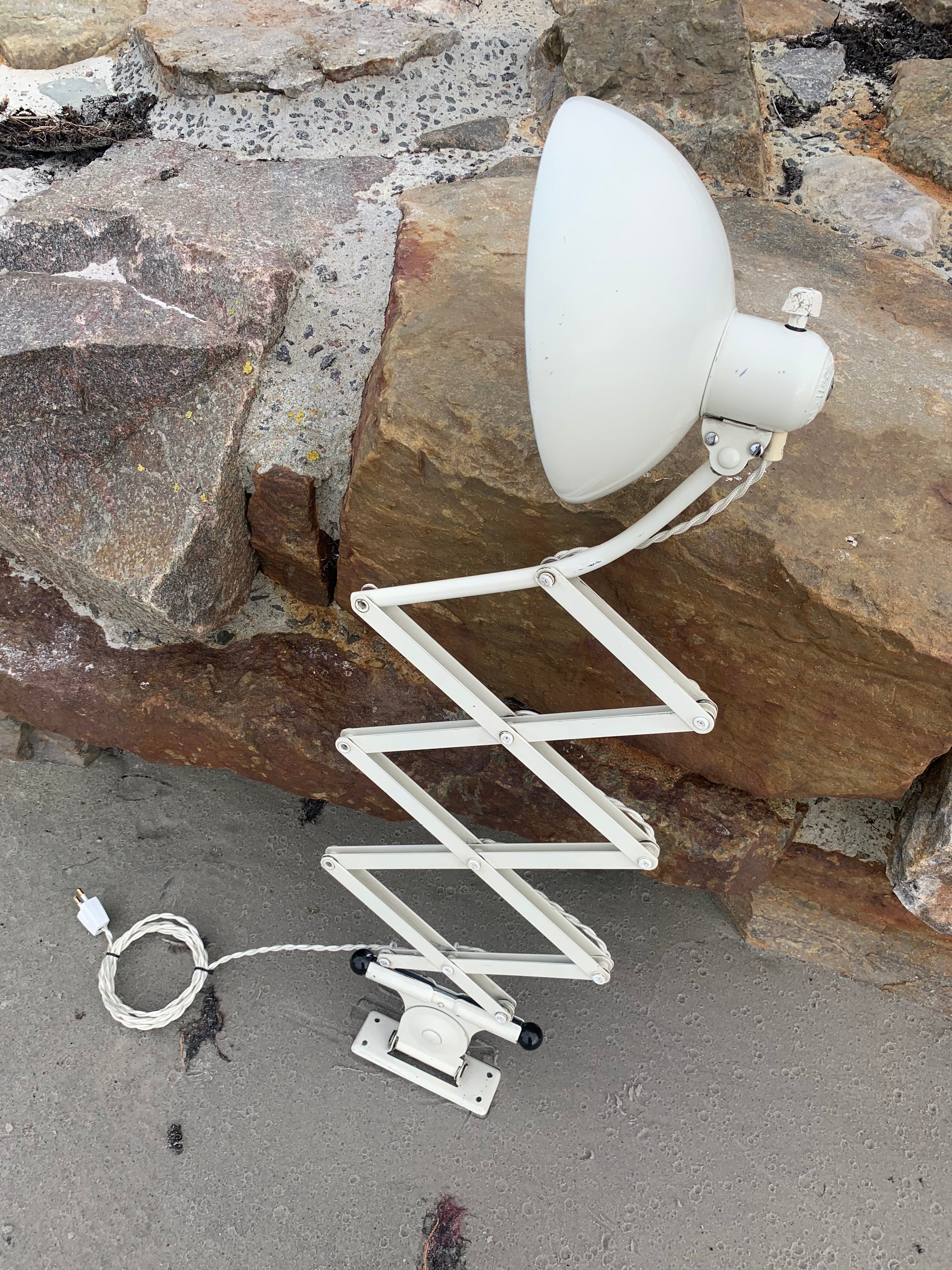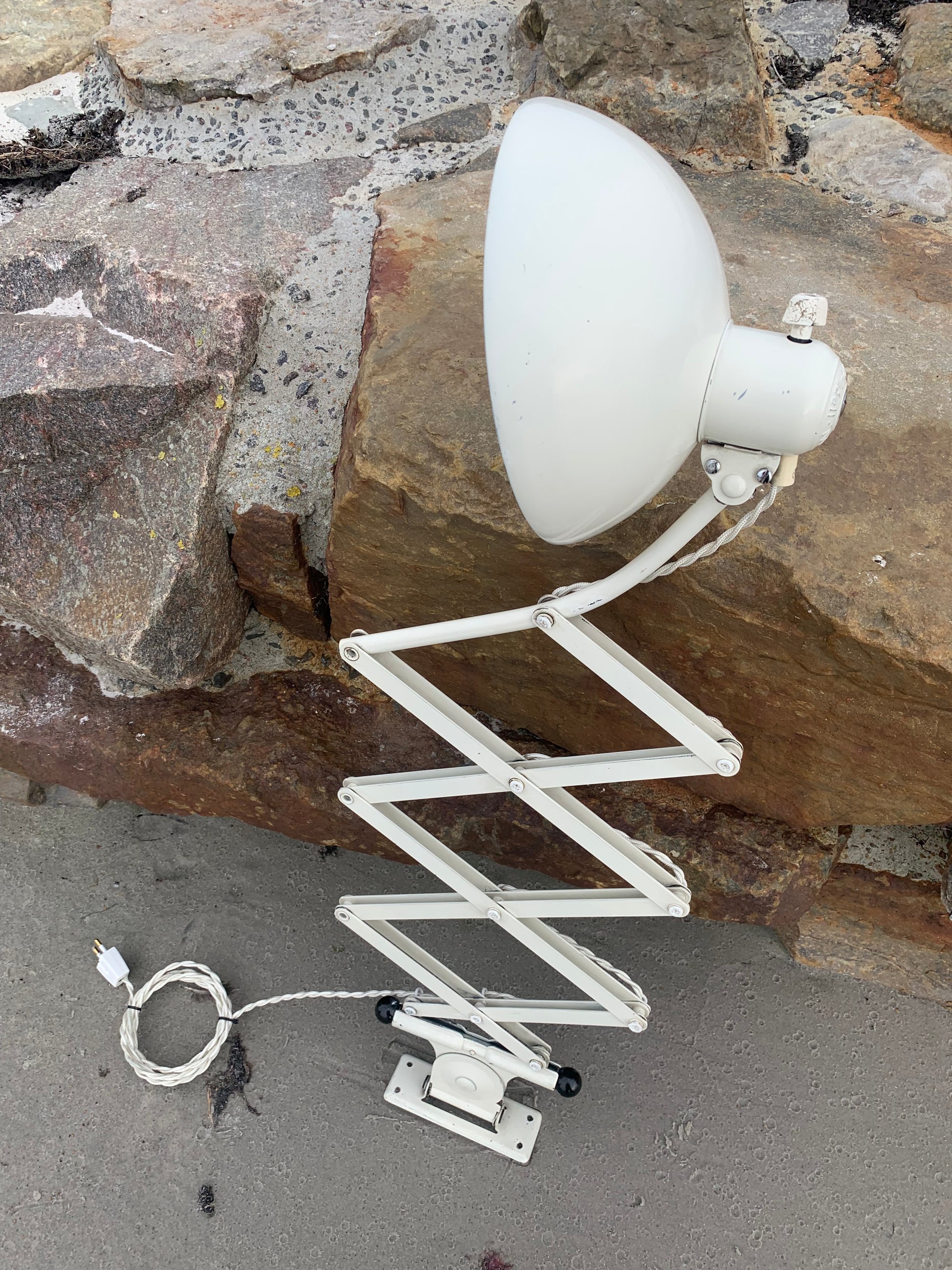 Dieses Exemplar verfügt über den Originallack und neue Kabel. Die Lampe weist altersbedingte Gebrauchsspuren auf, die eine solche Lampe (unserer Meinung nach) haben sollte.