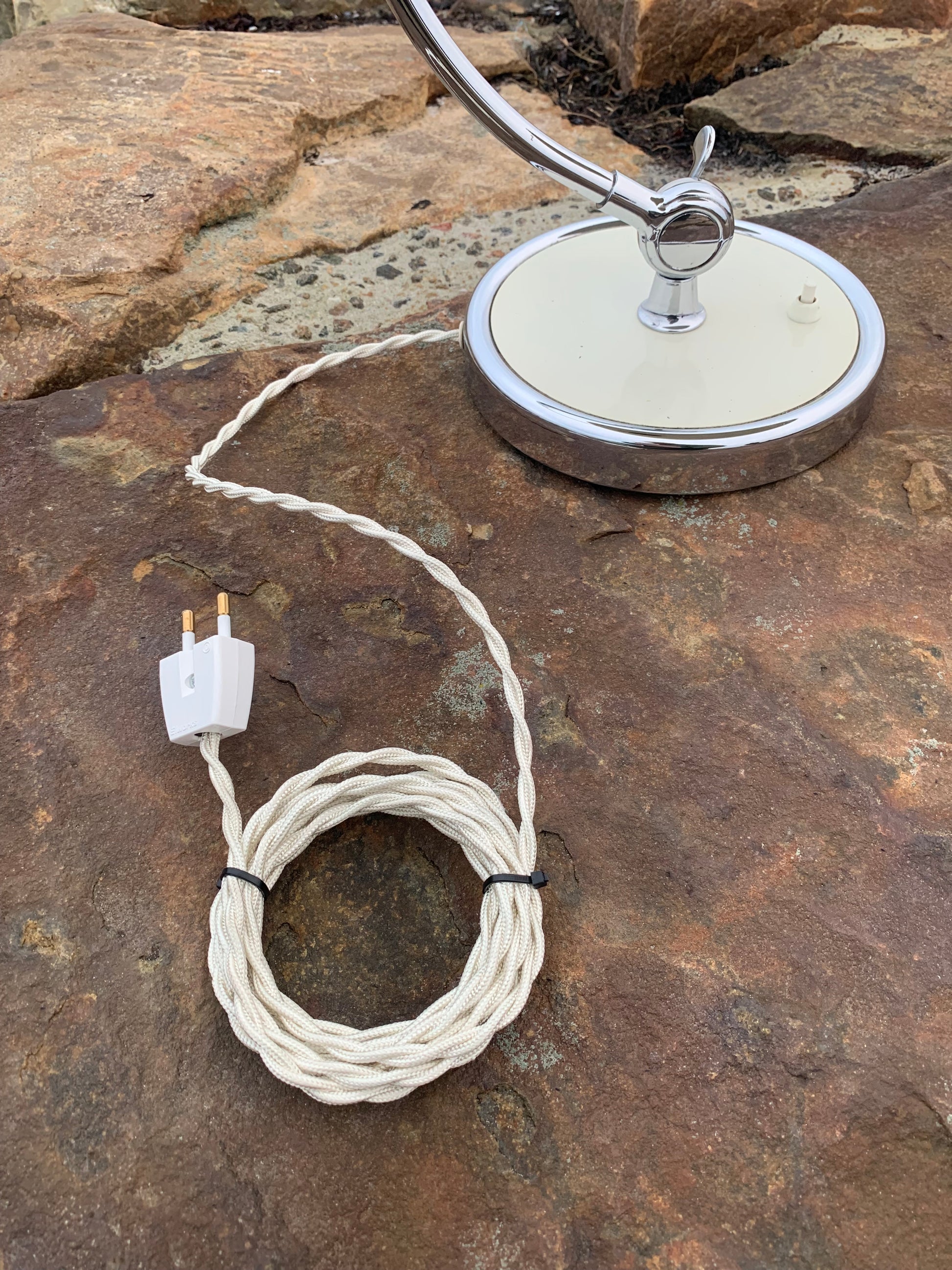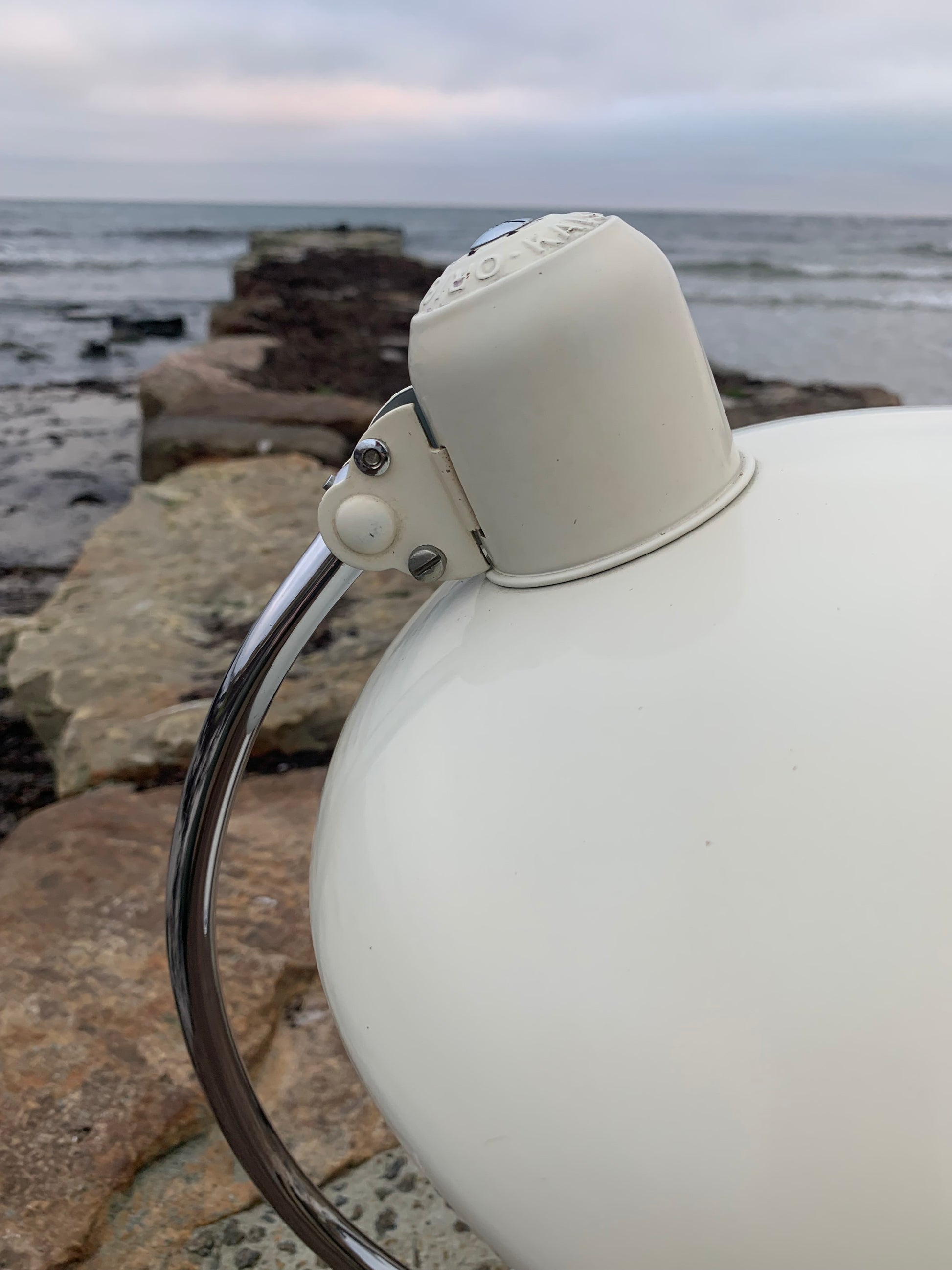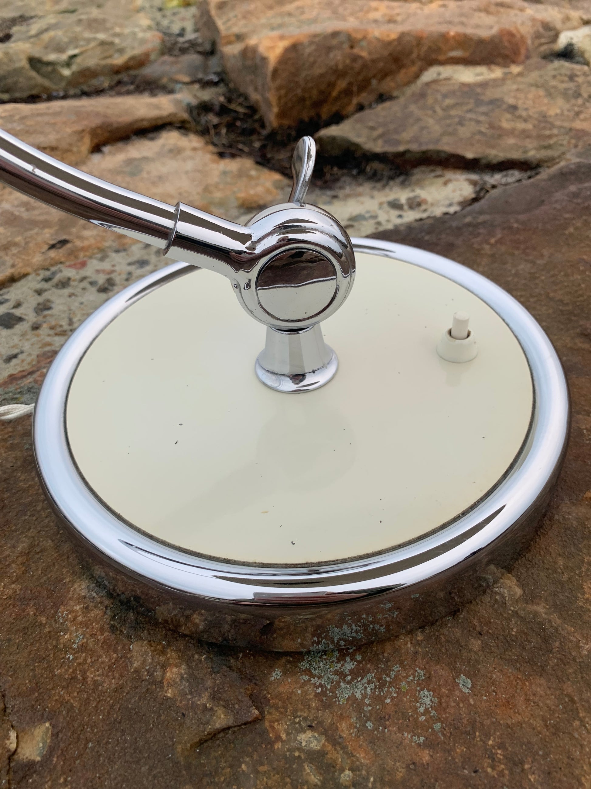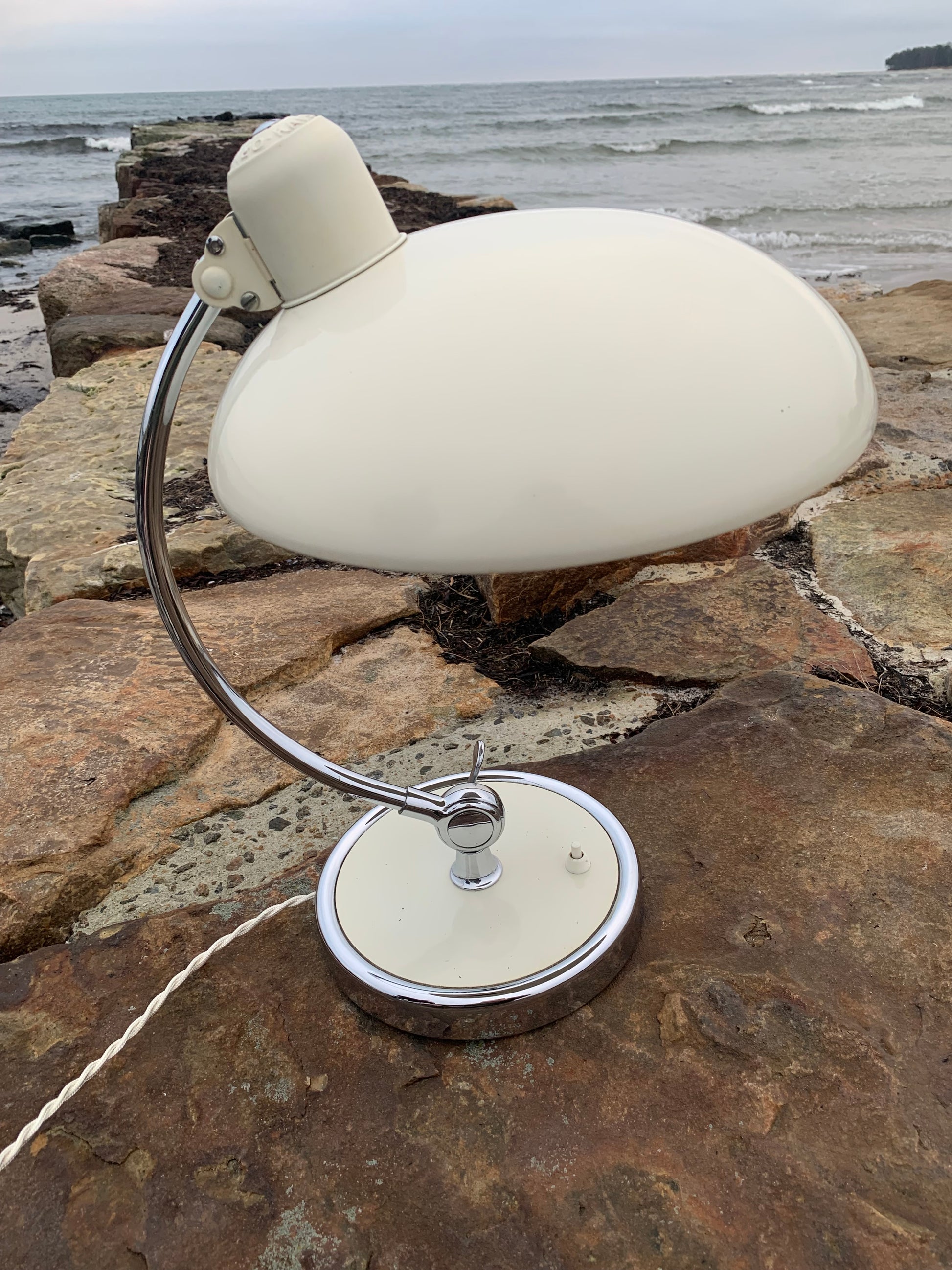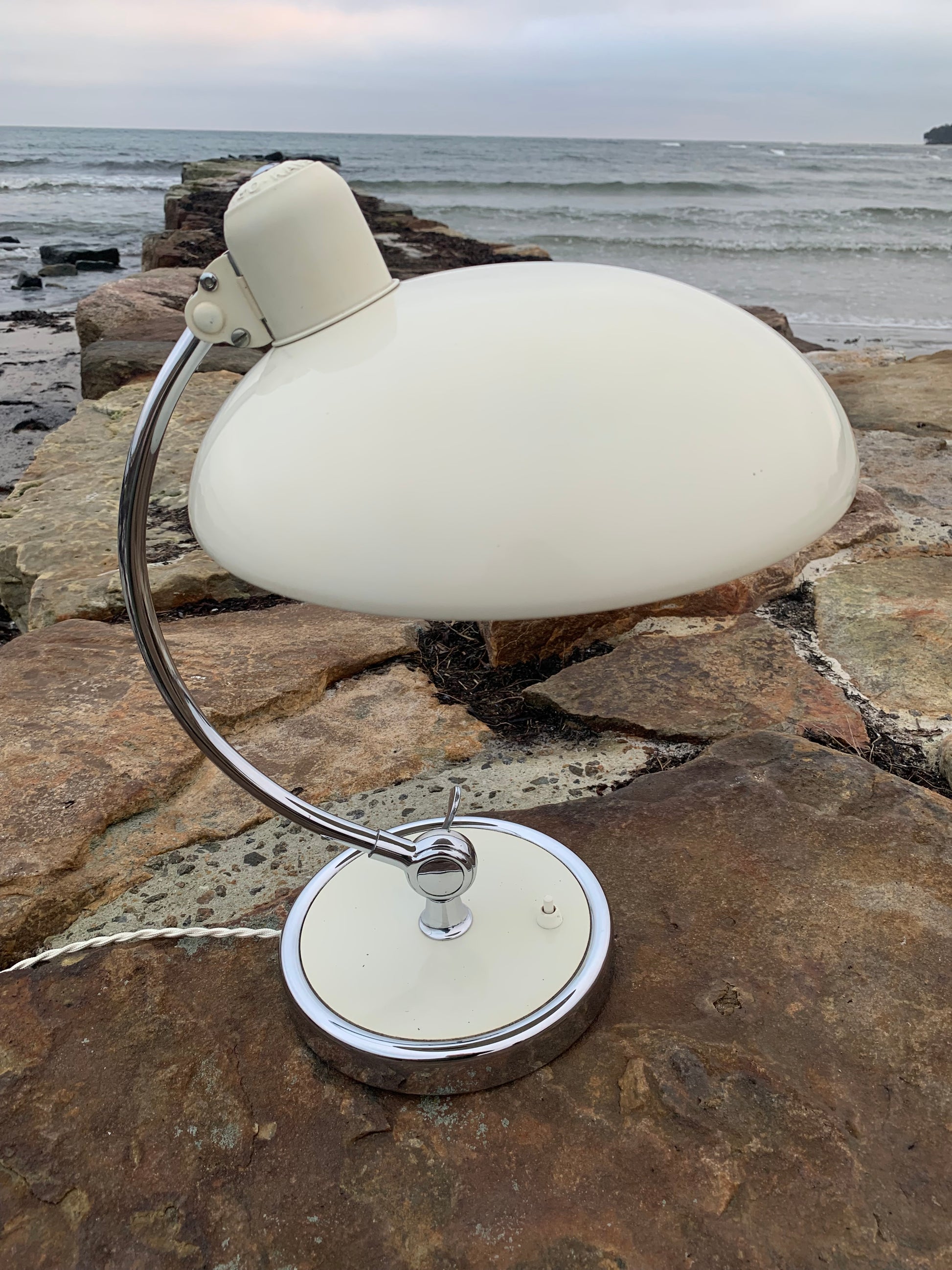 Dieses Exemplar befindet sich im Originalzustand mit Originallackierung und neuen Kabeln. Die Lampe weist altersbedingte Gebrauchsspuren auf, wie es bei einer solchen Lampe (unserer Meinung nach) üblich ist, ist aber insgesamt in einem sehr schönen Vintage-Zustand.