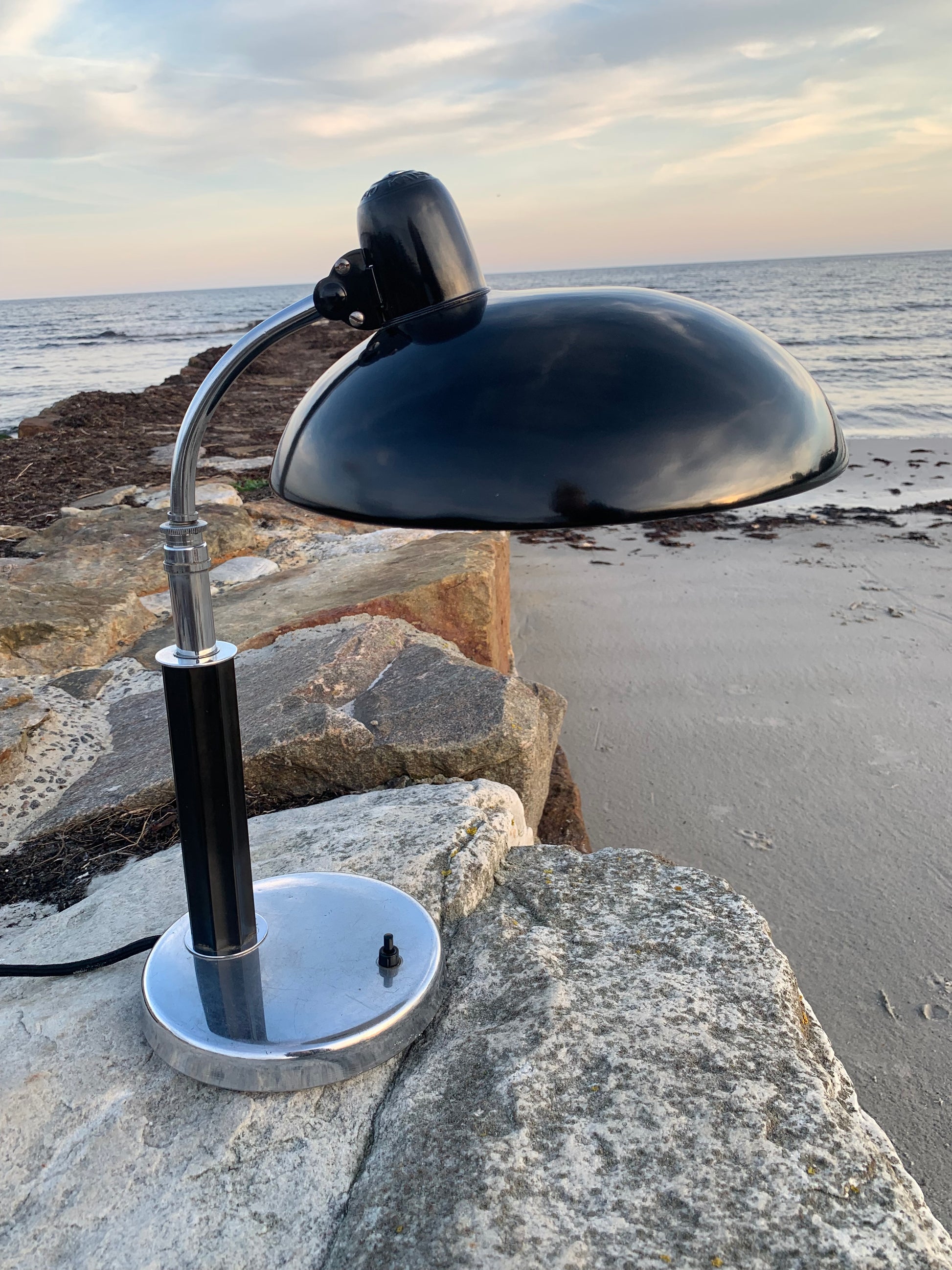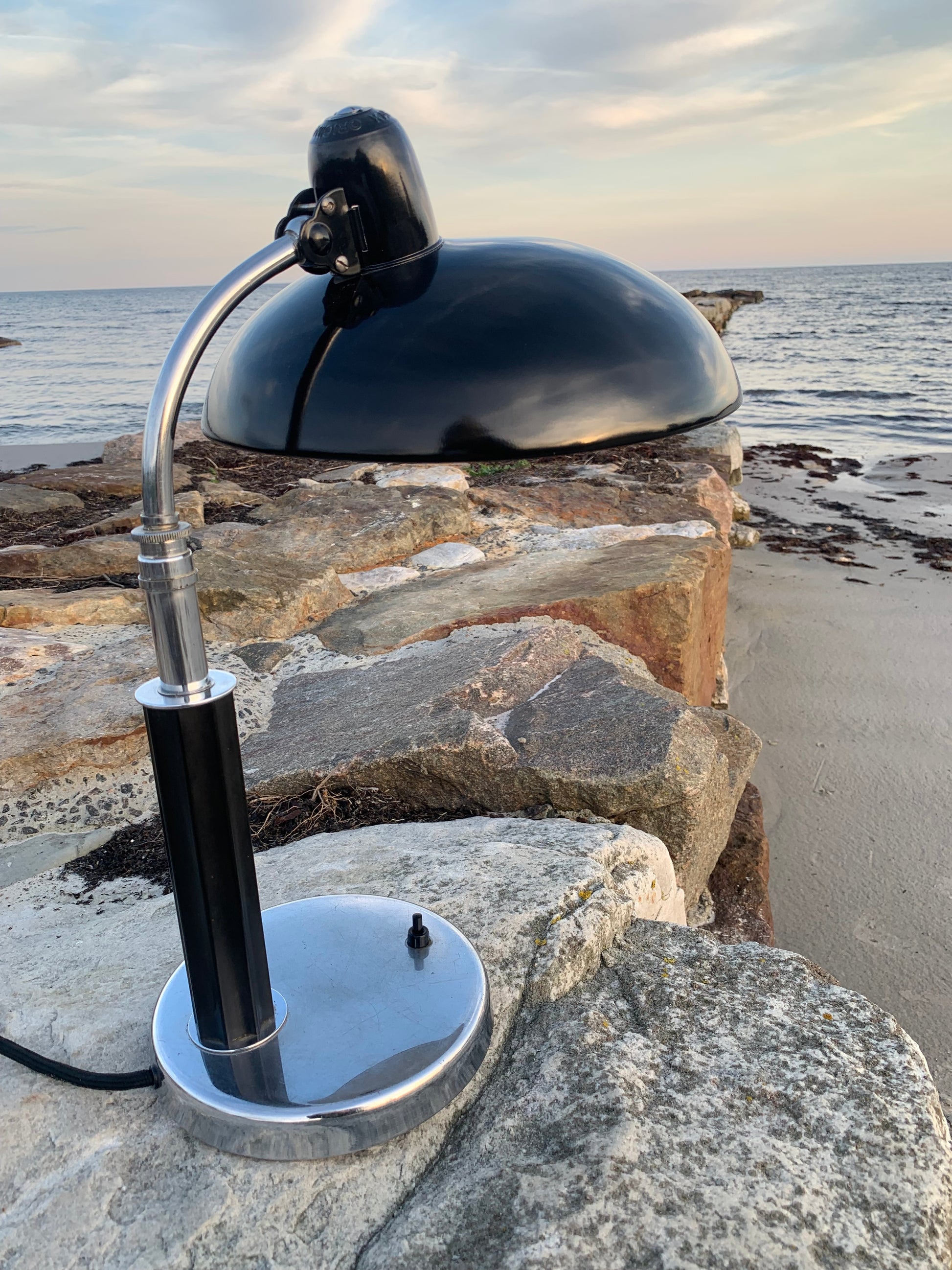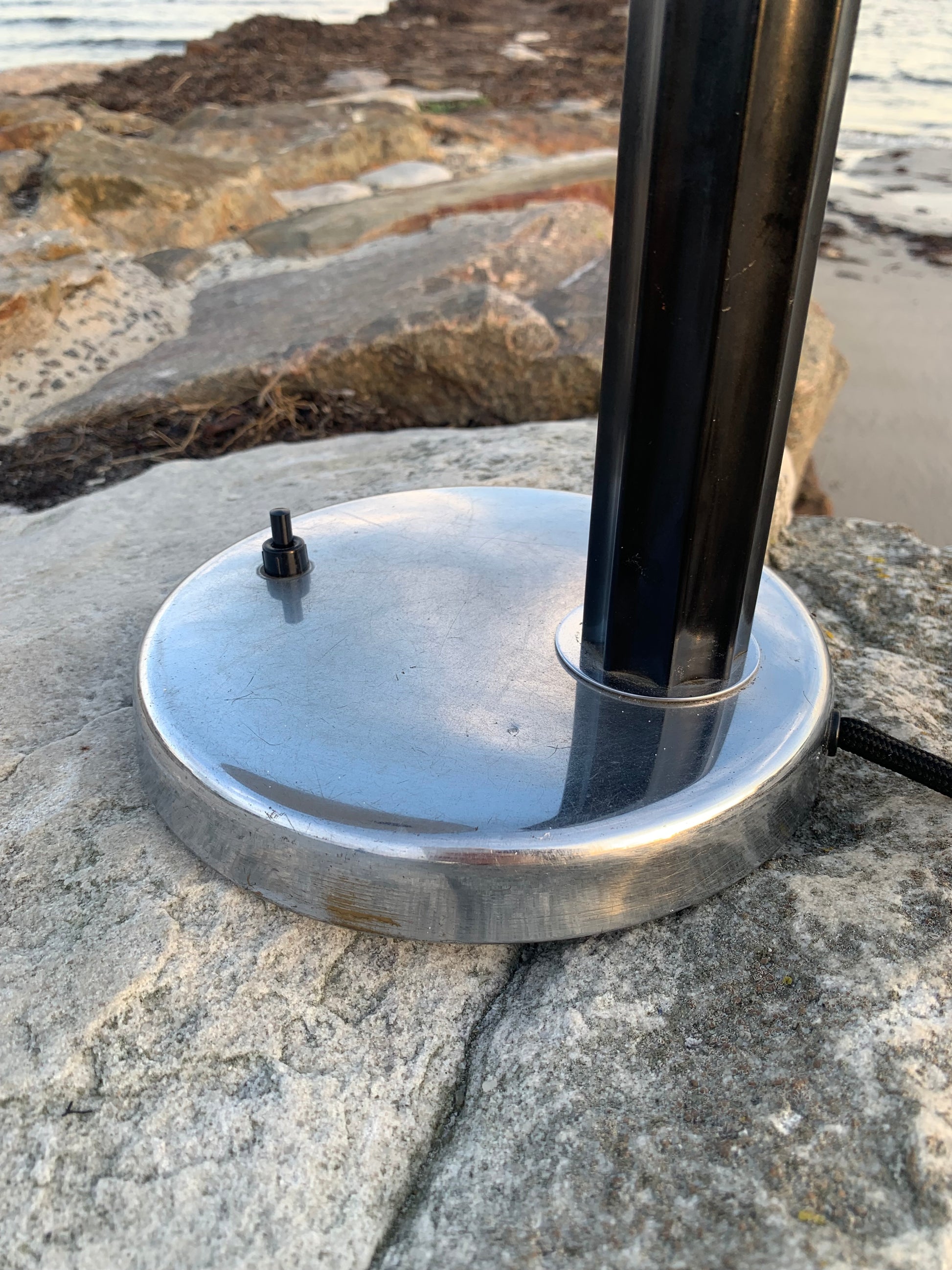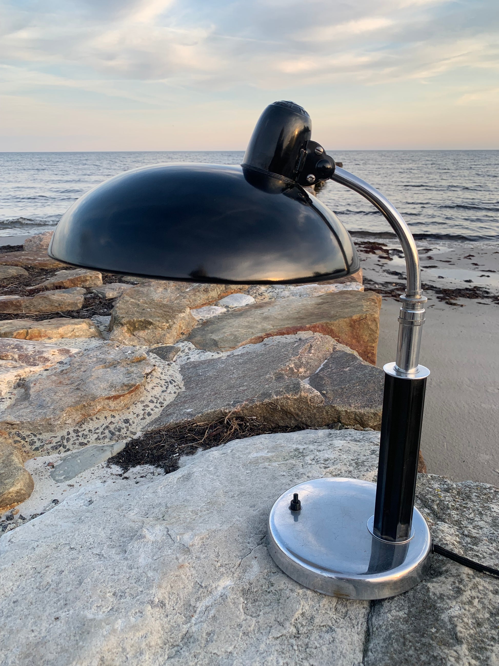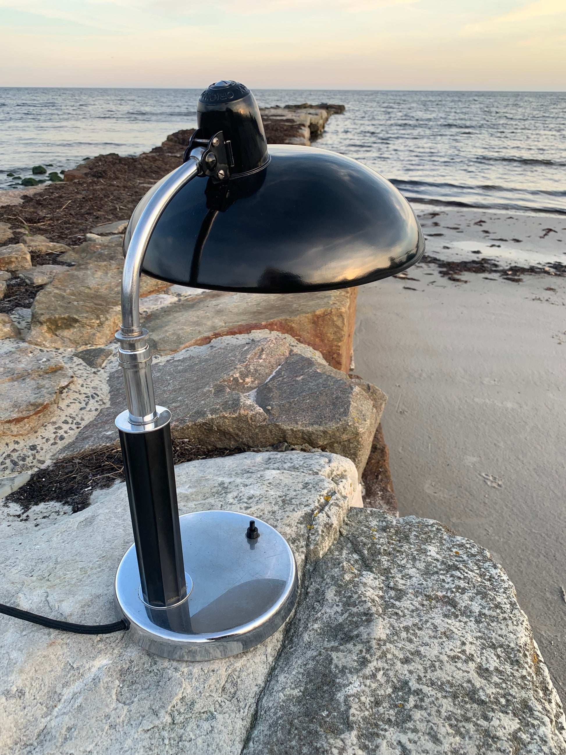 Diese Lampe stammt vermutlich aus der Mitte der 1930er Jahre und ist ein Unikat. Der untere Teil des „Arms“ besteht aus Bakelit. Die Lampe ist zudem höhenverstellbar. Die Lampe weist einige altersbedingte Gebrauchsspuren auf, die eine solche Lampe (unserer Meinung nach) haben sollte.