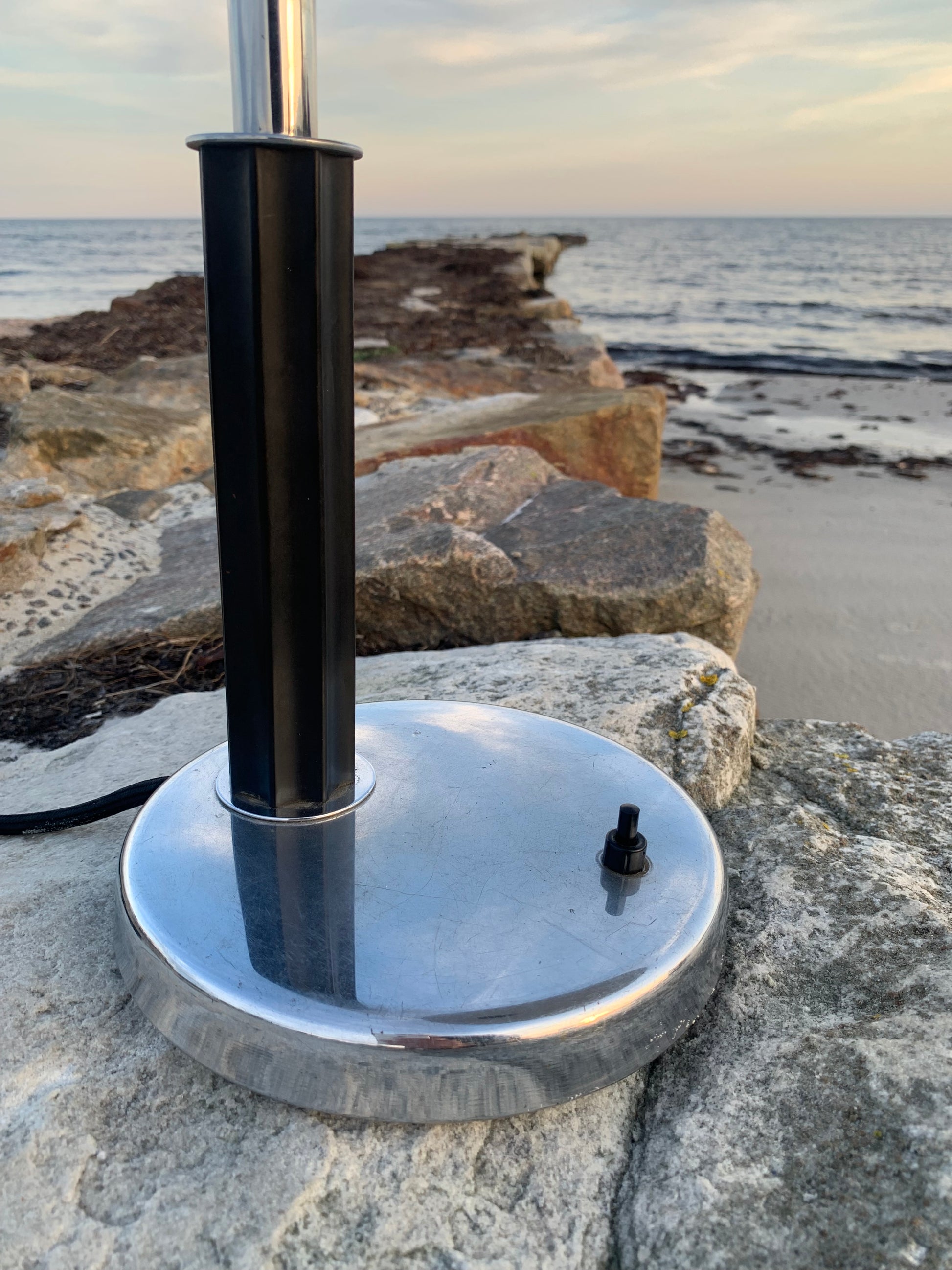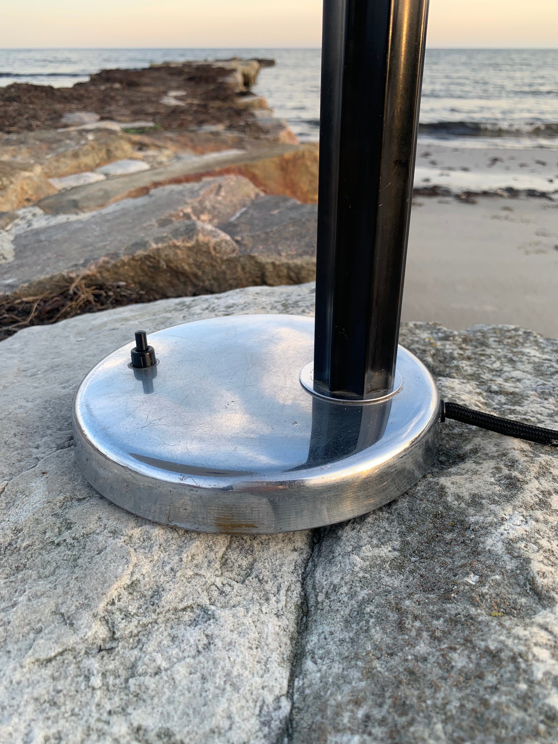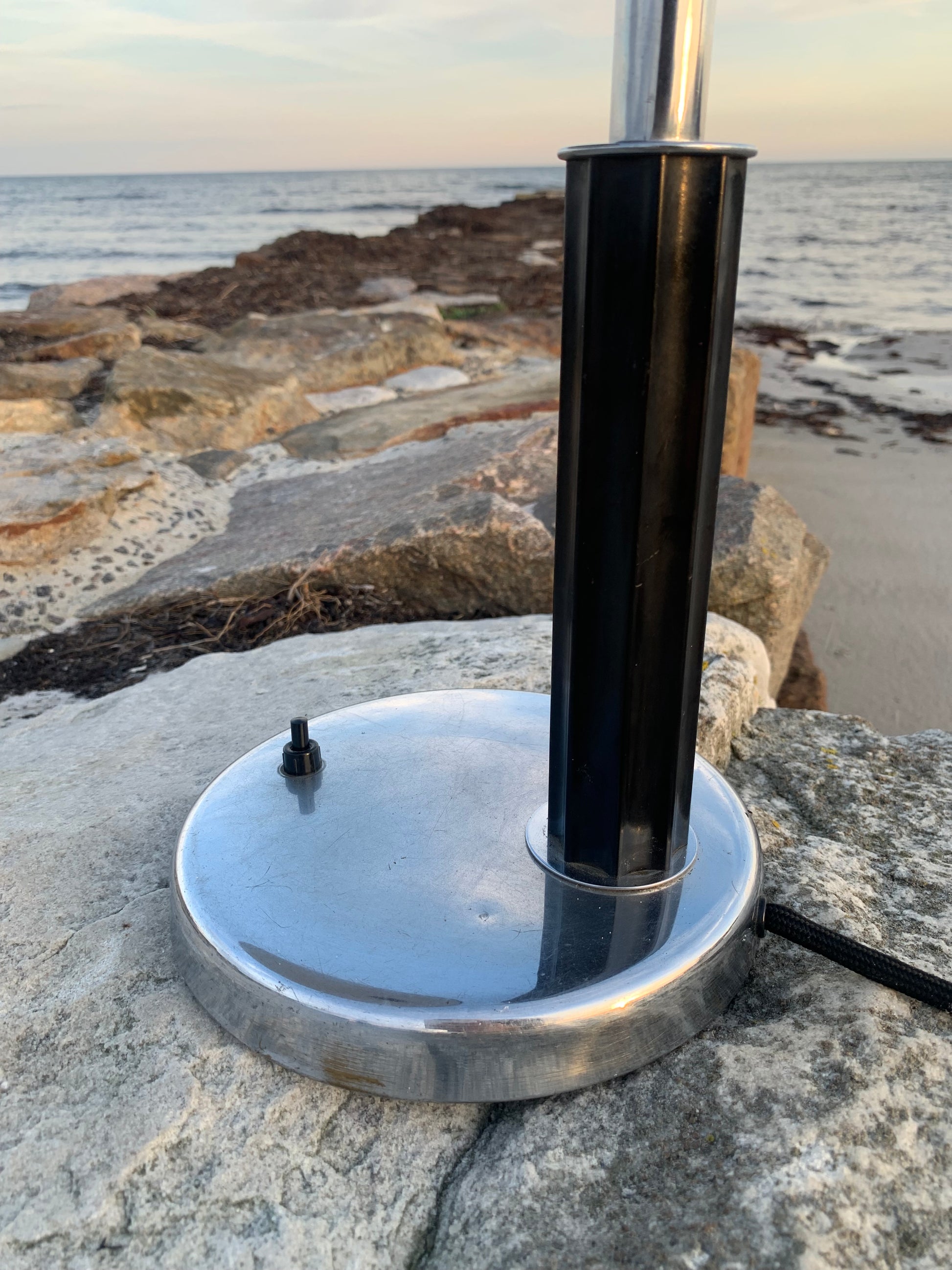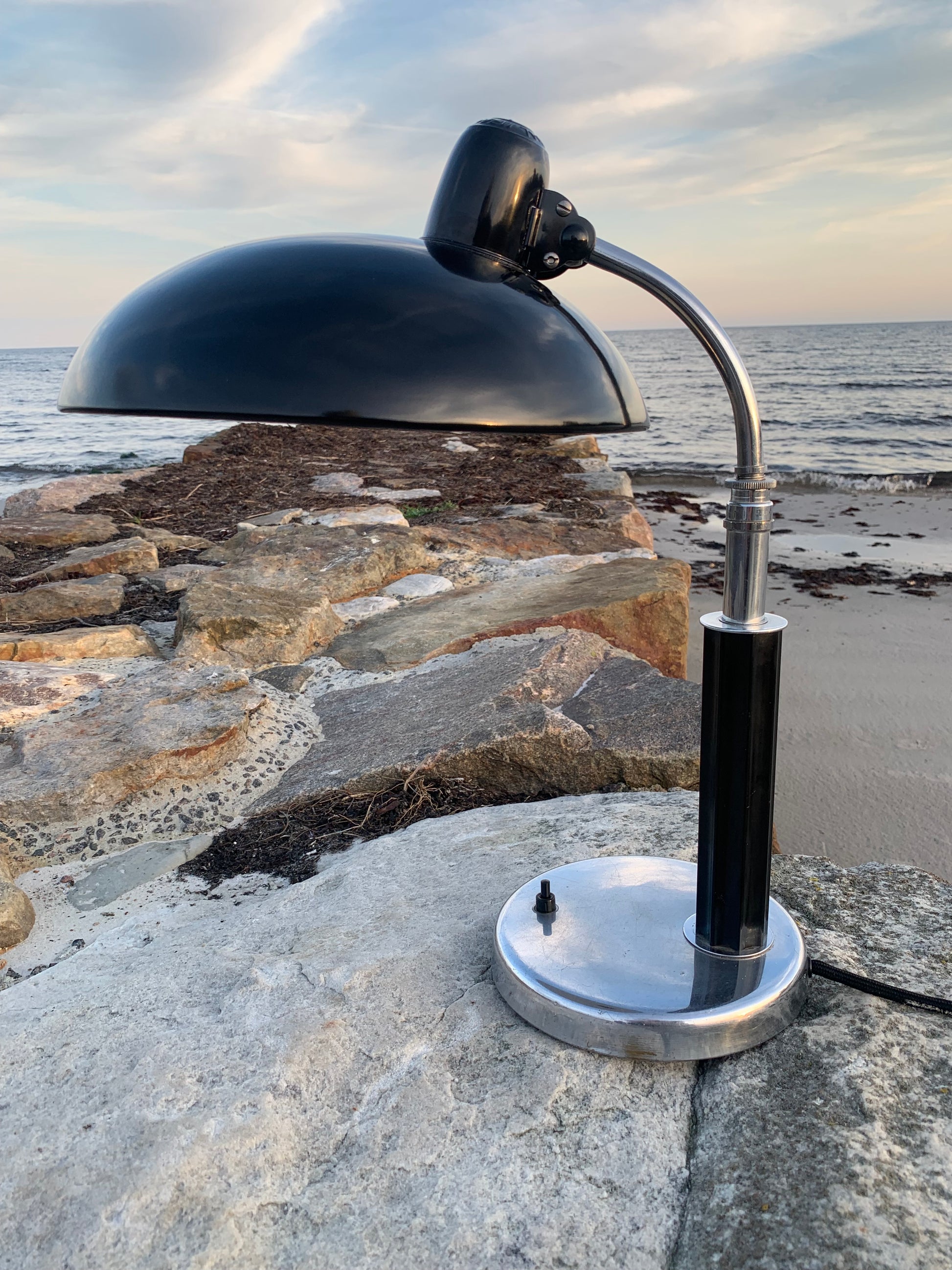 Diese Lampe stammt vermutlich aus der Mitte der 1930er Jahre und ist ein Unikat. Der untere Teil des „Arms“ besteht aus Bakelit. Die Lampe ist zudem höhenverstellbar. Die Lampe weist einige altersbedingte Gebrauchsspuren auf, die eine solche Lampe (unserer Meinung nach) haben sollte.