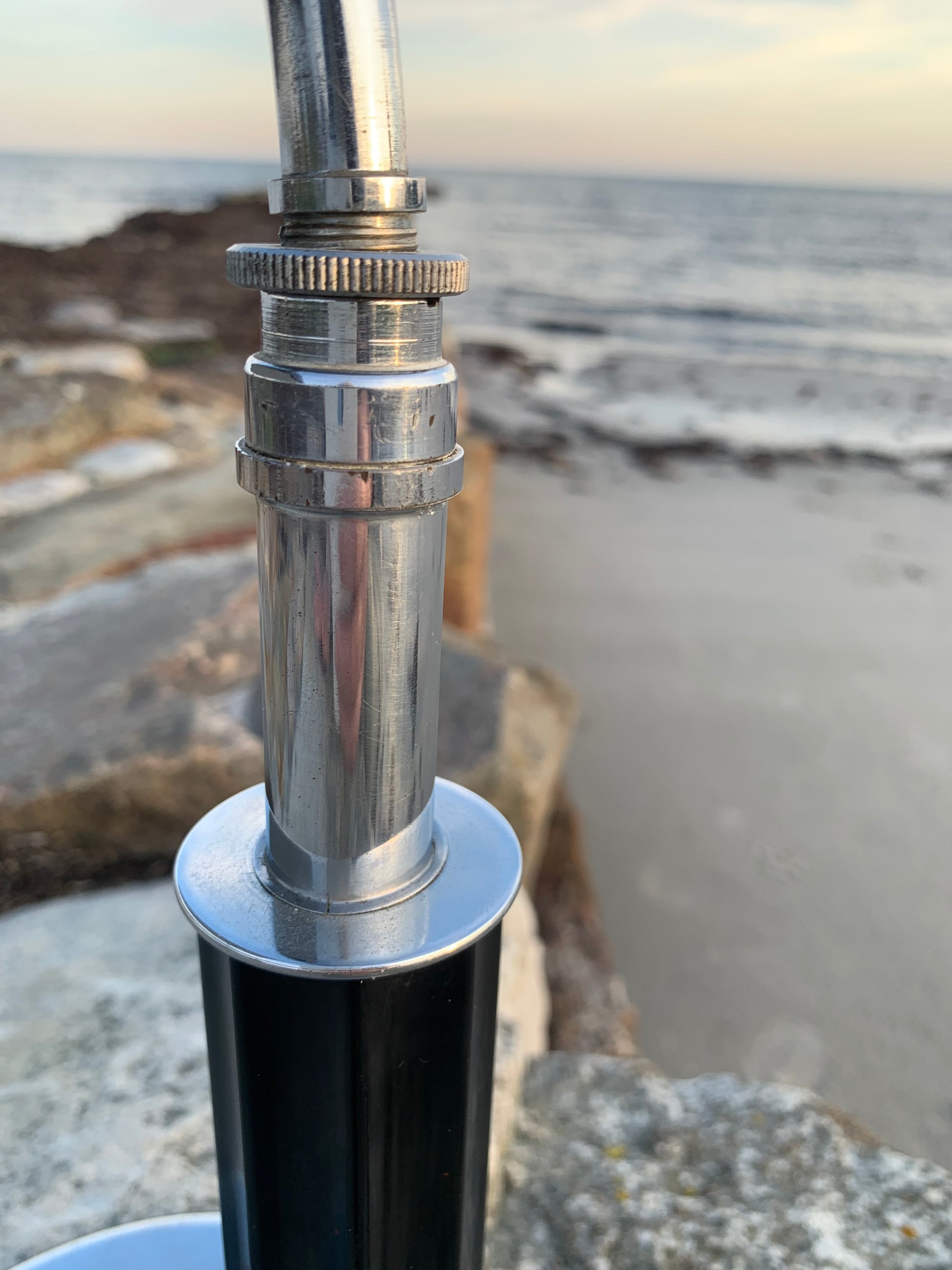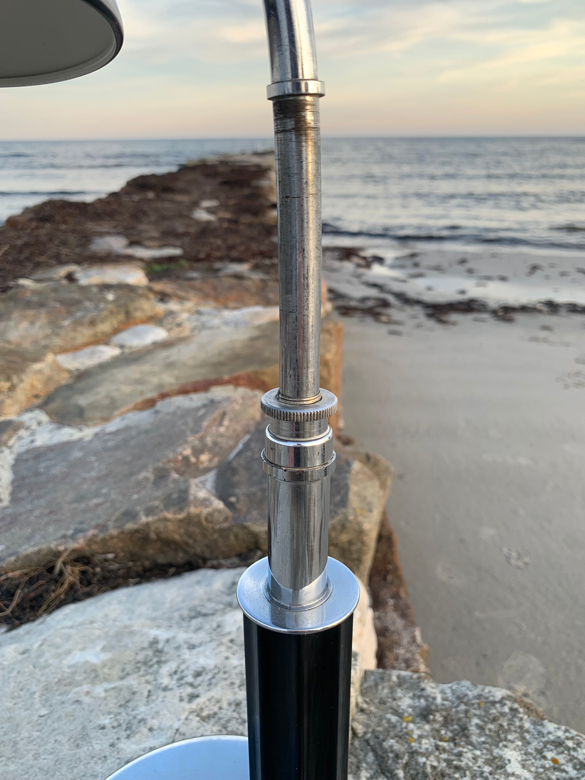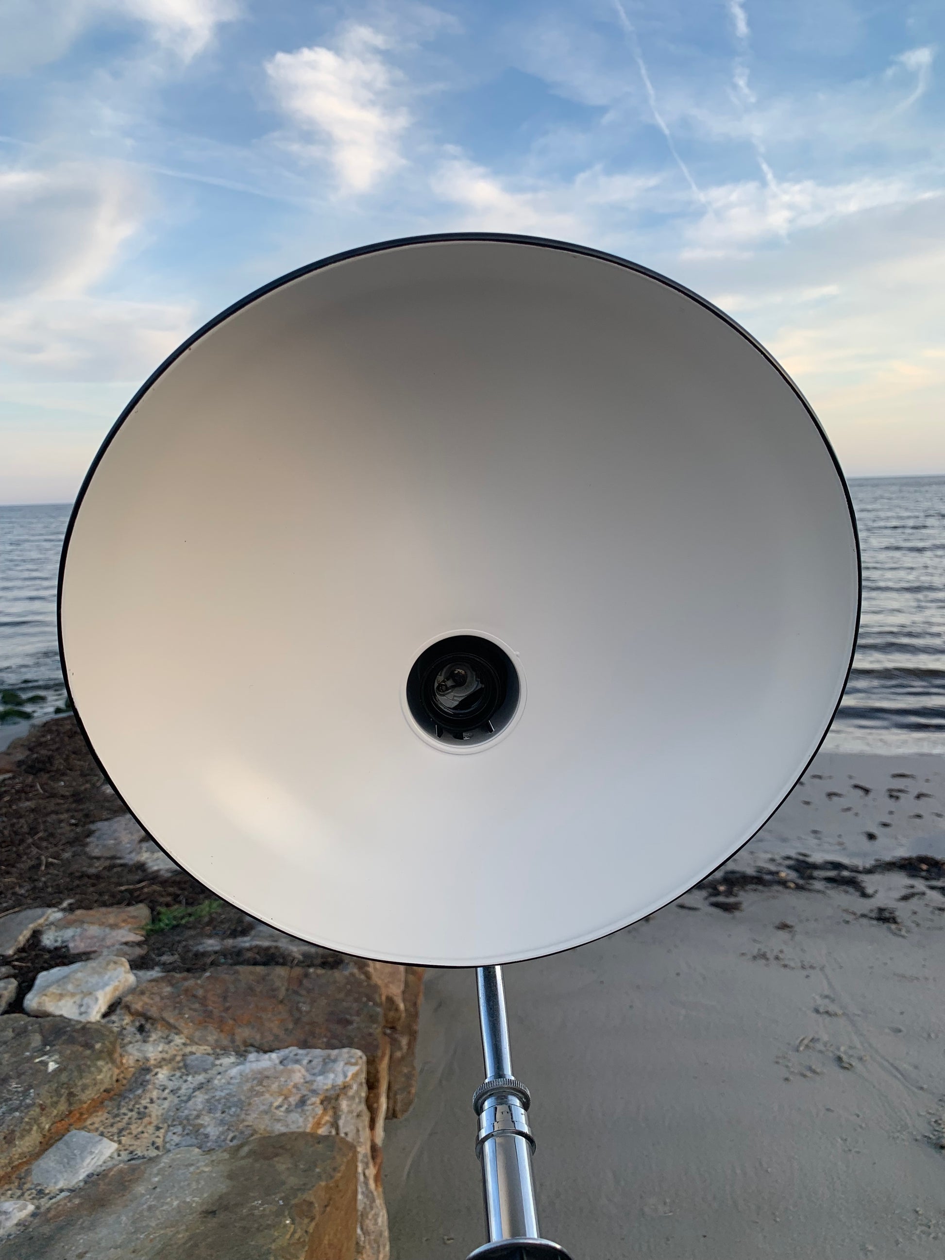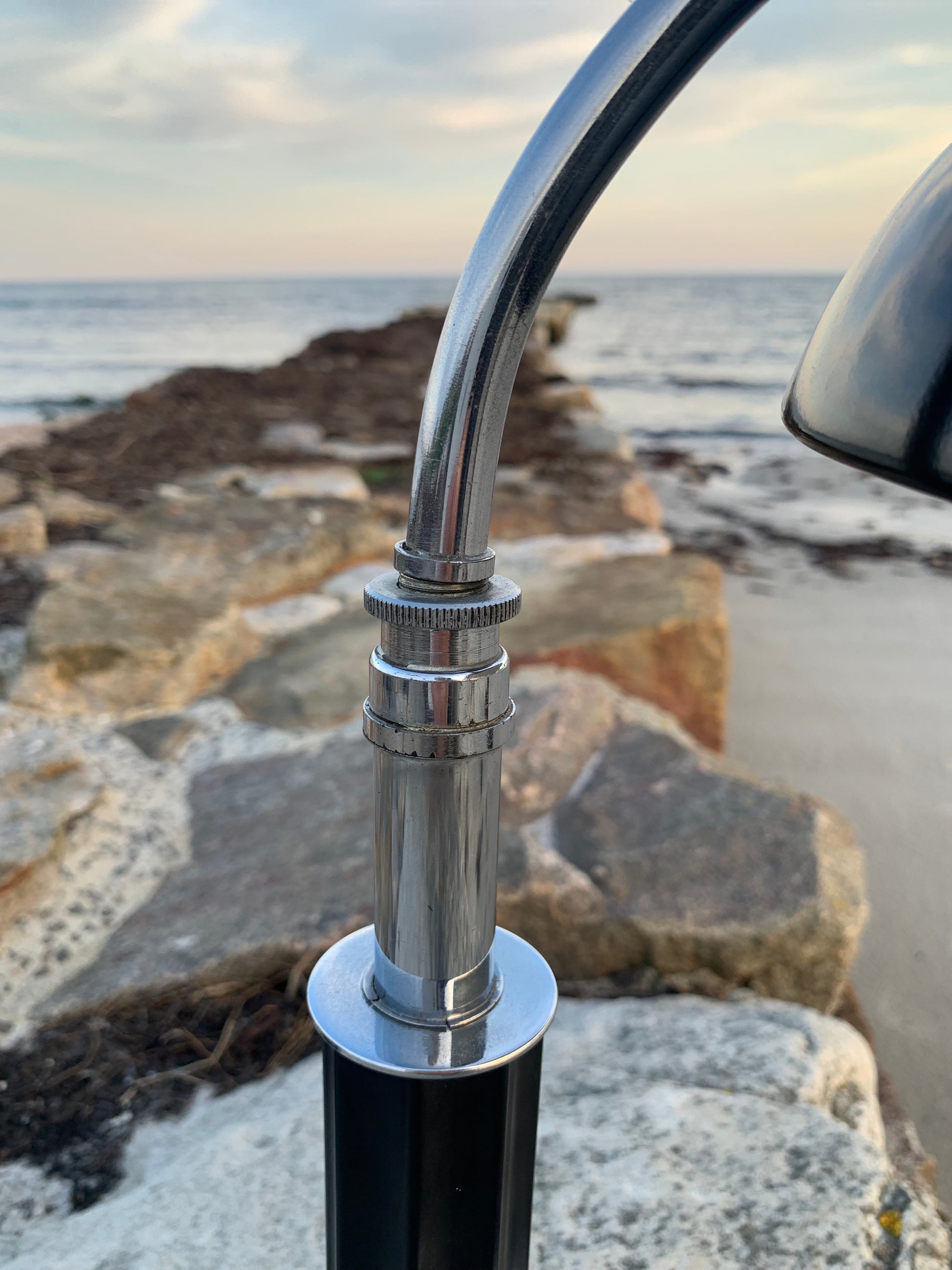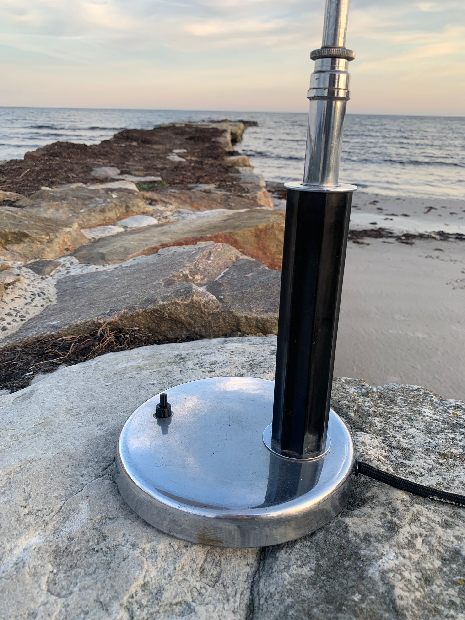 Diese Lampe stammt vermutlich aus der Mitte der 1930er Jahre und ist ein Unikat. Der untere Teil des „Arms“ besteht aus Bakelit. Die Lampe ist zudem höhenverstellbar. Die Lampe weist einige altersbedingte Gebrauchsspuren auf, die eine solche Lampe (unserer Meinung nach) haben sollte.