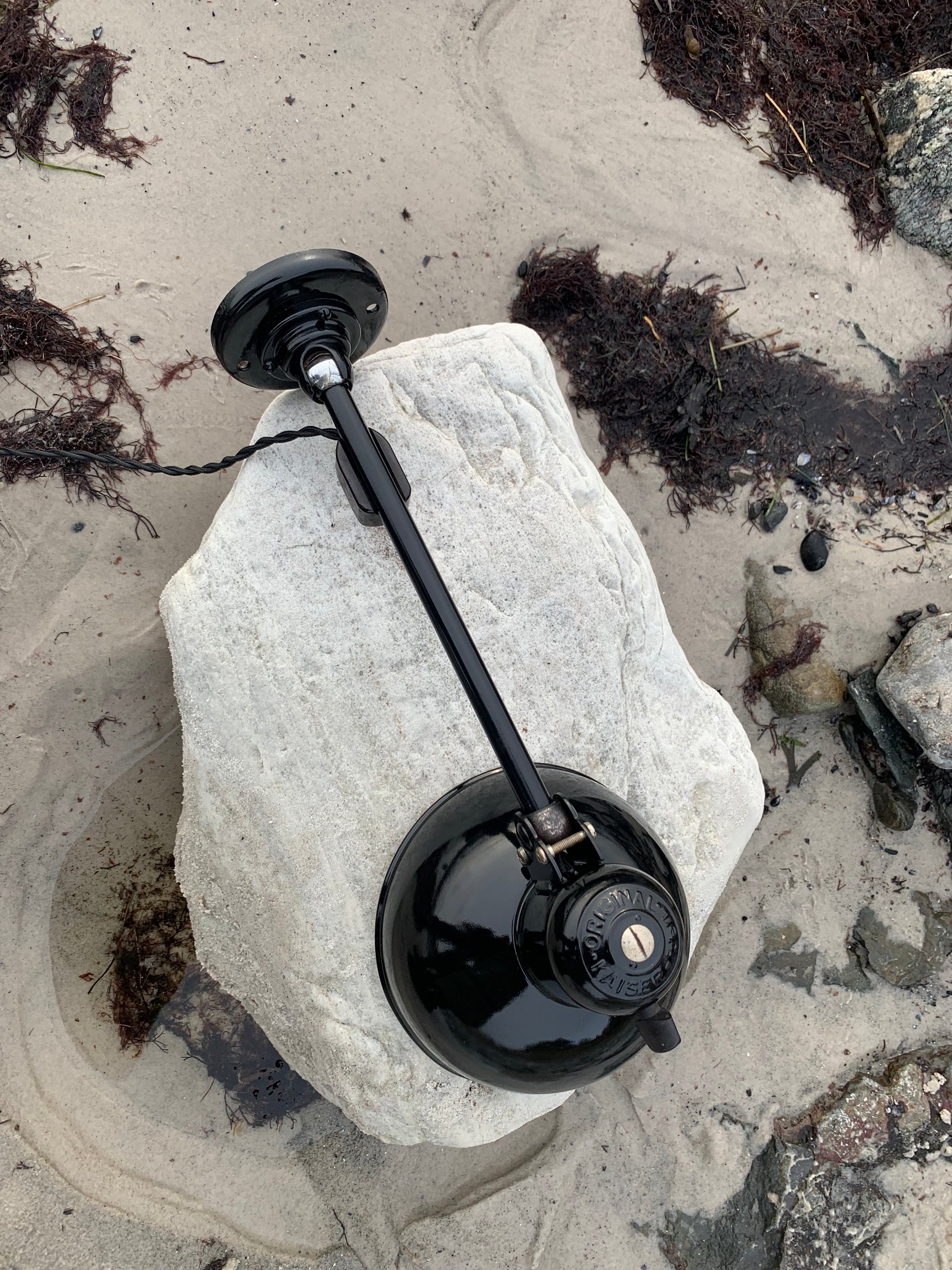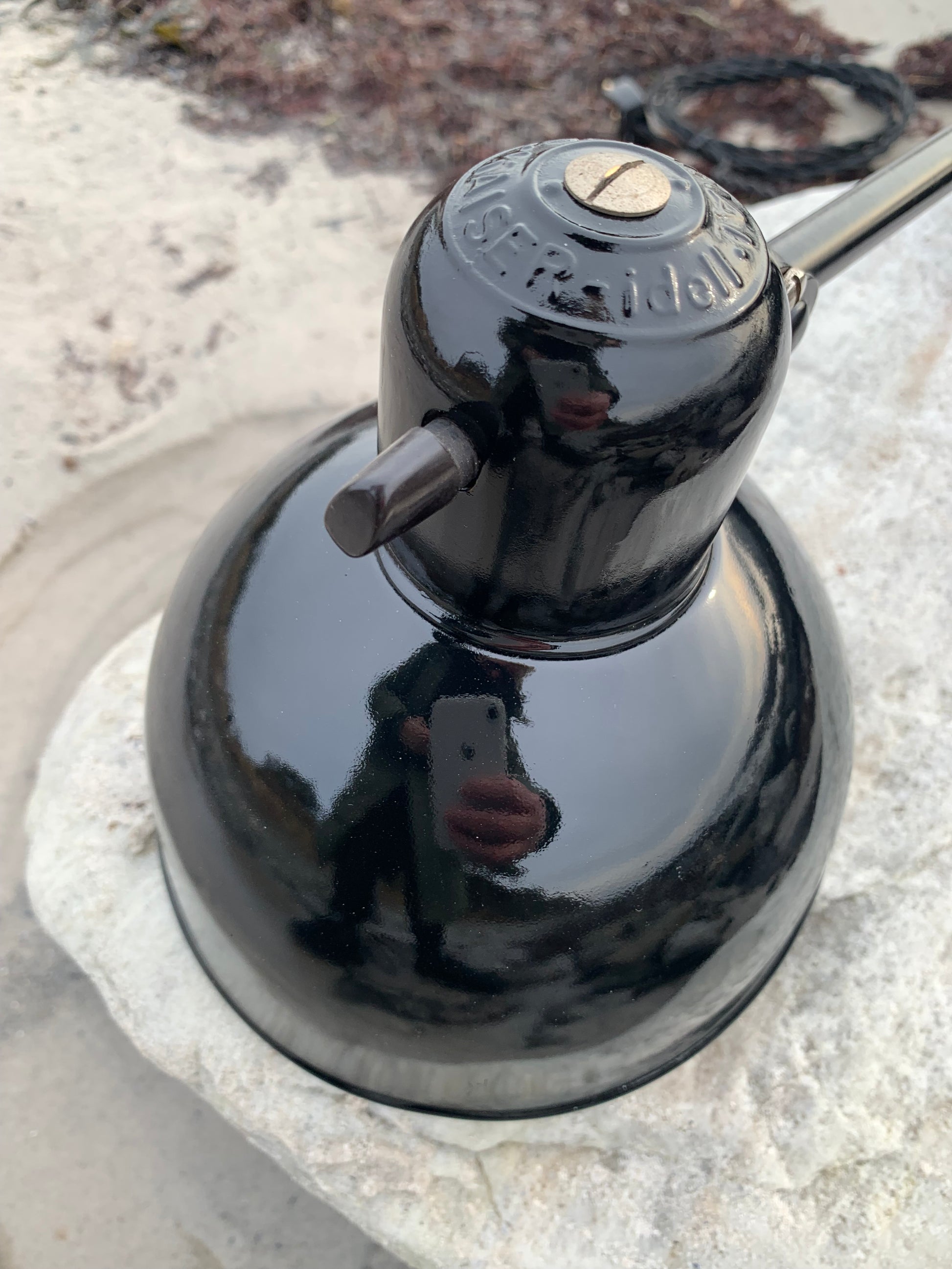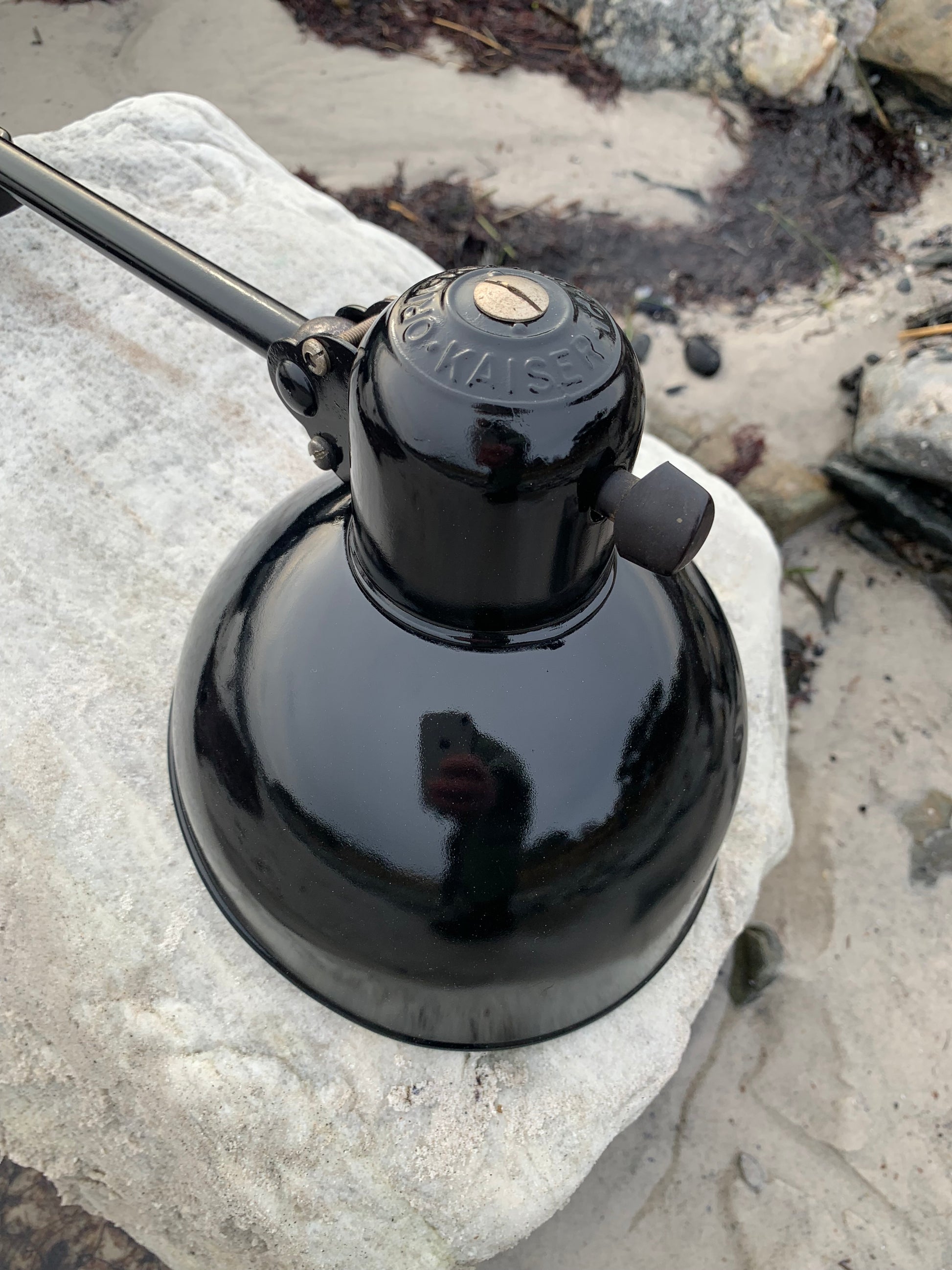 Wirklich schöne Kaiser Idell Lampe Modell 6723. Die Lampe wurde von Christian Dell entworfen und ist definitiv keine Lampe, die uns sehr oft begegnet. Einzigartig an der Leuchte ist ihr Kugelgelenk, weshalb die Leuchte in mehrere Richtungen geneigt werden kann. Die Lampe wurde mit einer neuen Lackierung und einem neuen Kabel generalüberholt.