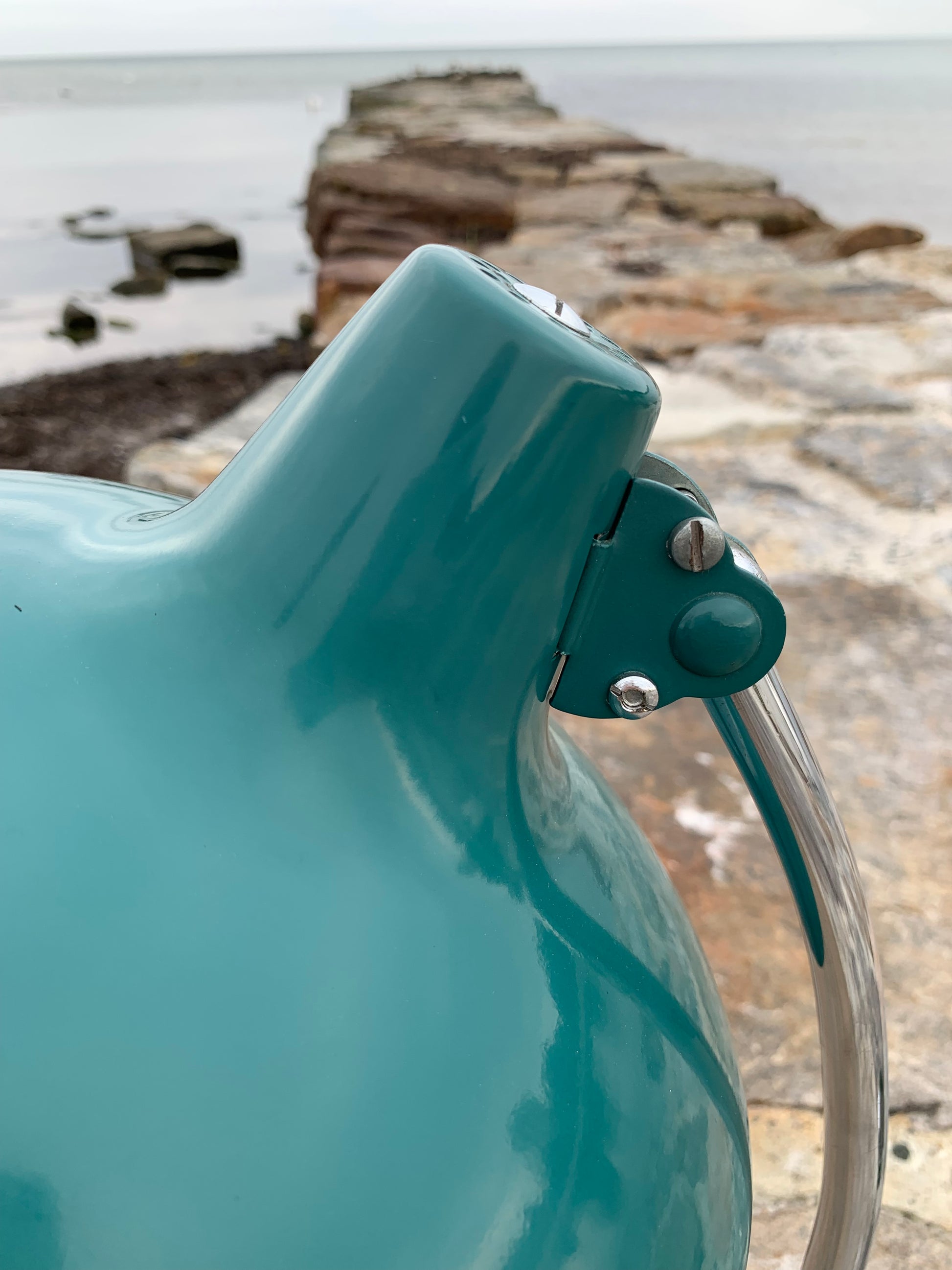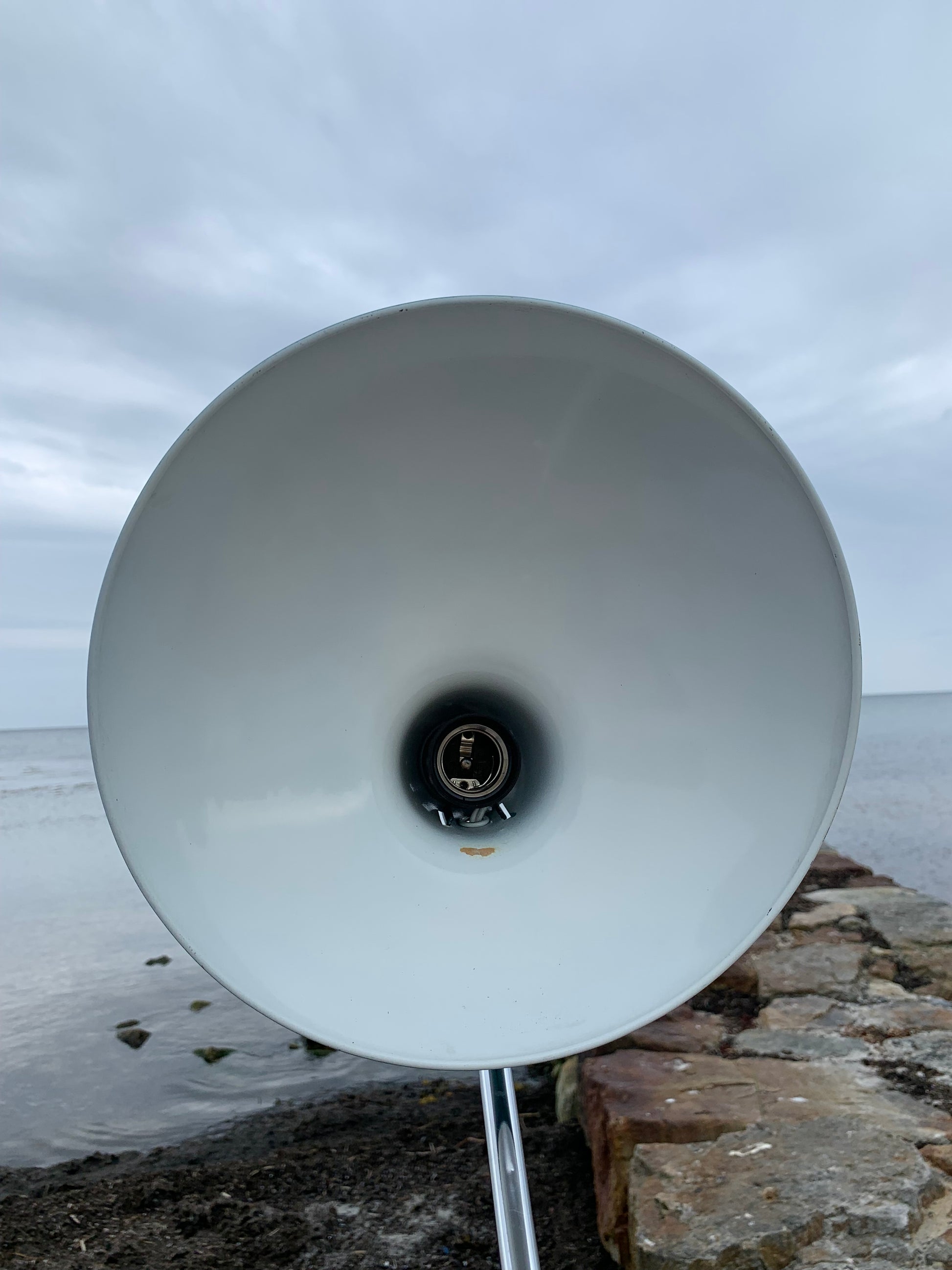 Dieses Exemplar erscheint mit der Originallackierung und neuen Kabeln. Die Lampe weist einige altersbedingte Gebrauchsspuren auf, die eine solche Lampe (unserer Meinung nach) aber haben muss.