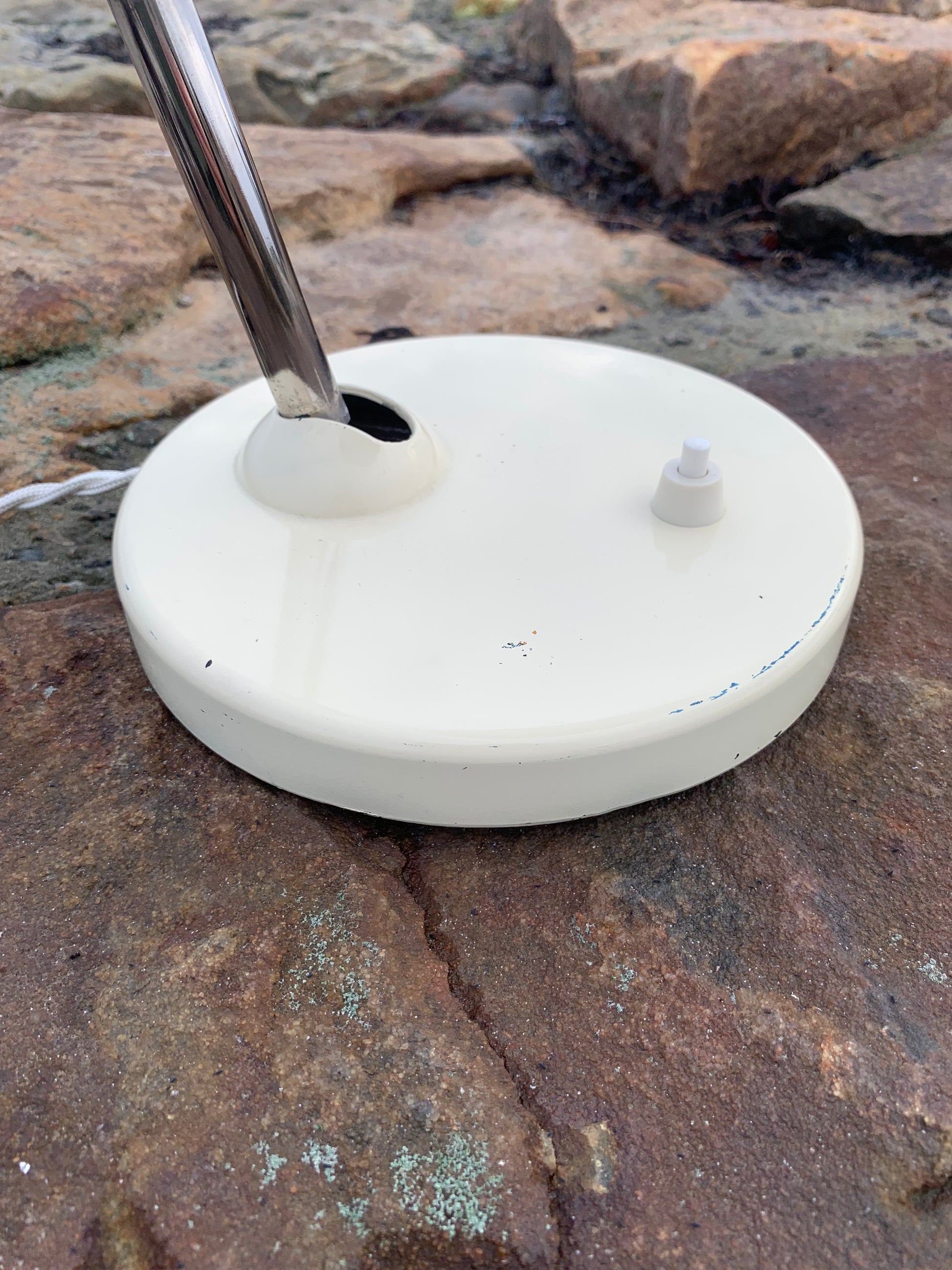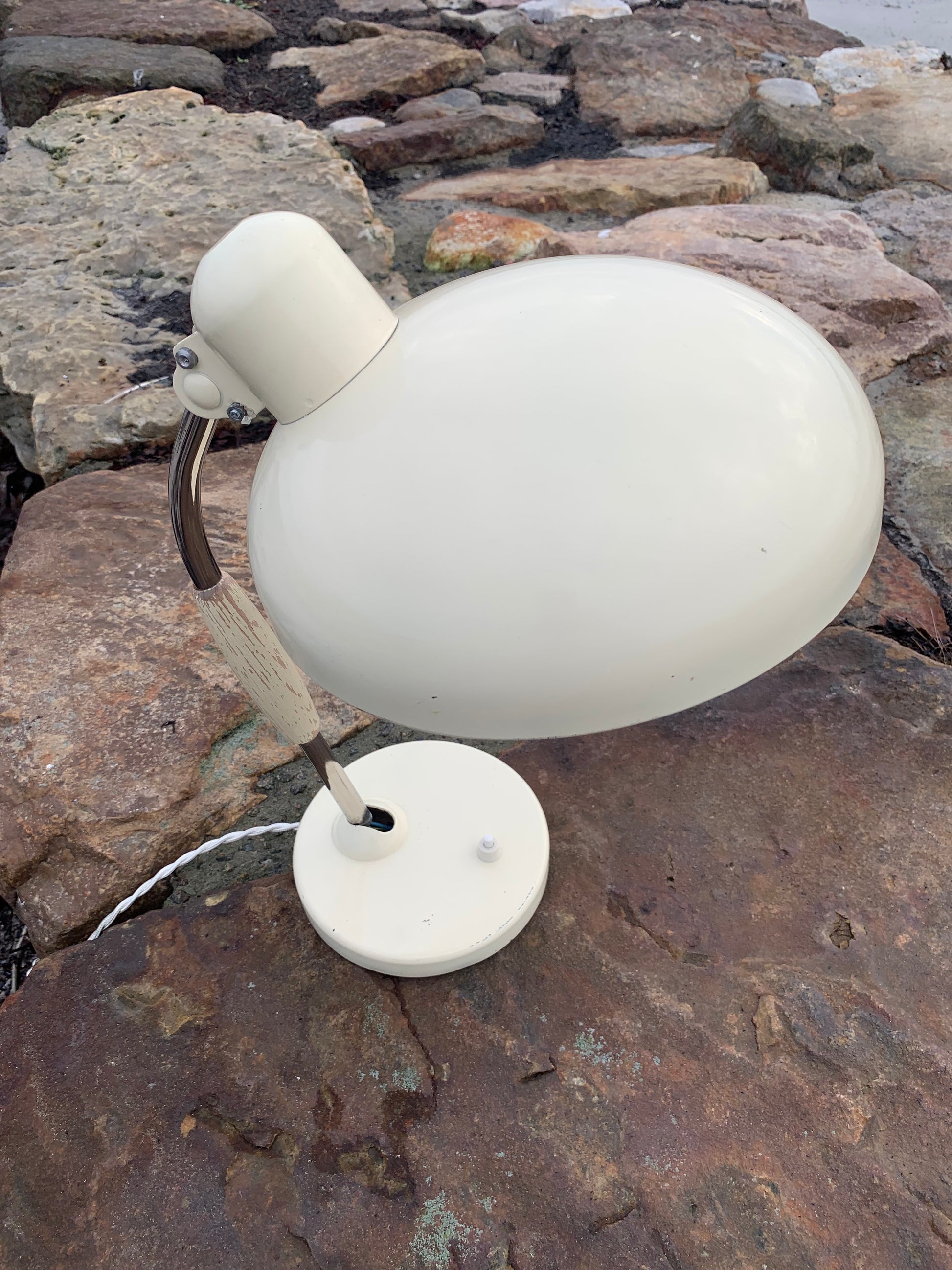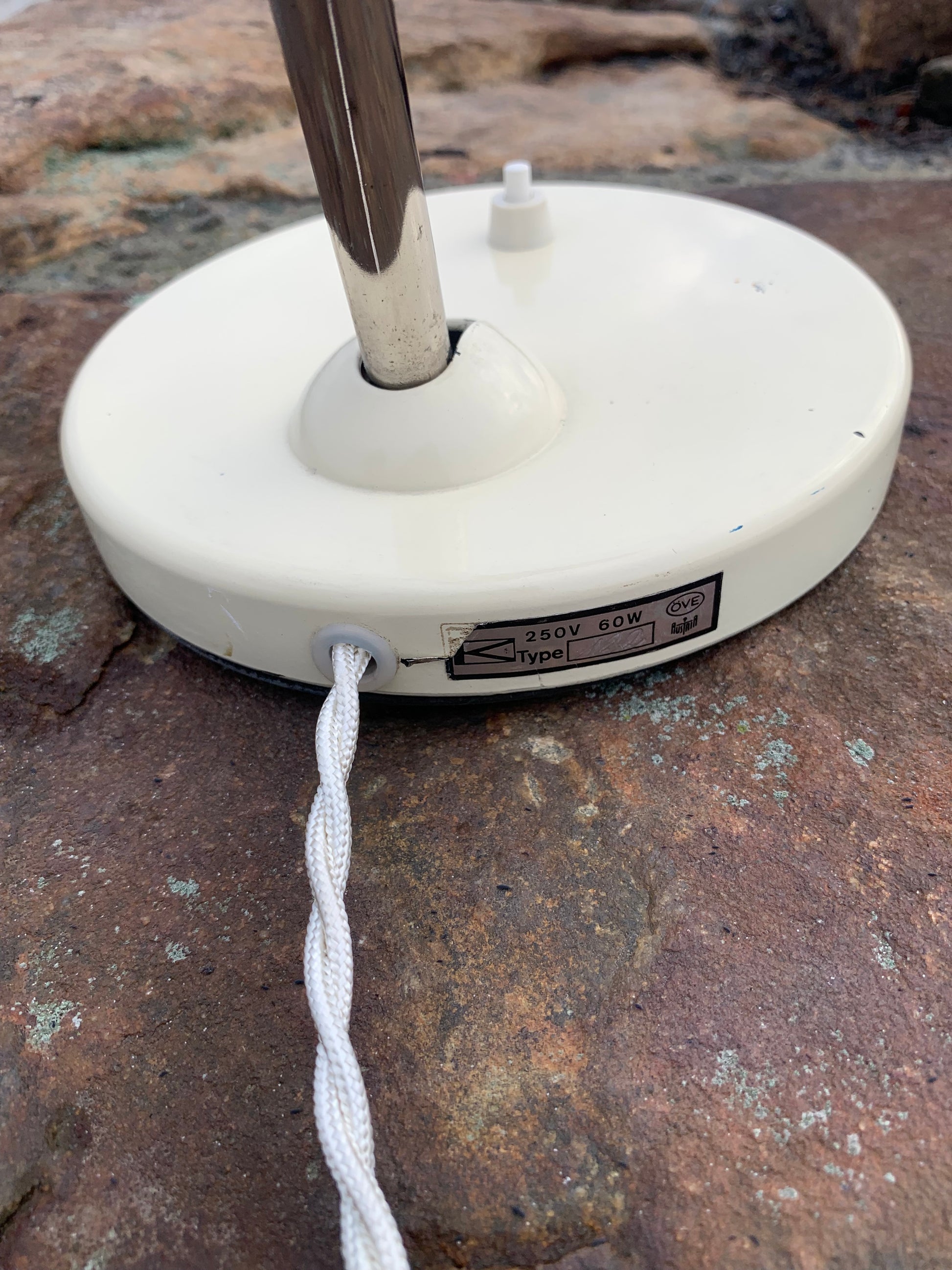 Wunderschöne Vintage-Lampe der österreichischen Firma Koranda. Dieses Modell wird Christian Dell zugeschrieben. Die Spuren der Zeit haben dem Lack der Lampe zugesetzt, sie scheint jedoch neu verkabelt zu sein und richtet sich an all jene, die das Perfekte im Unvollkommenen erkennen.