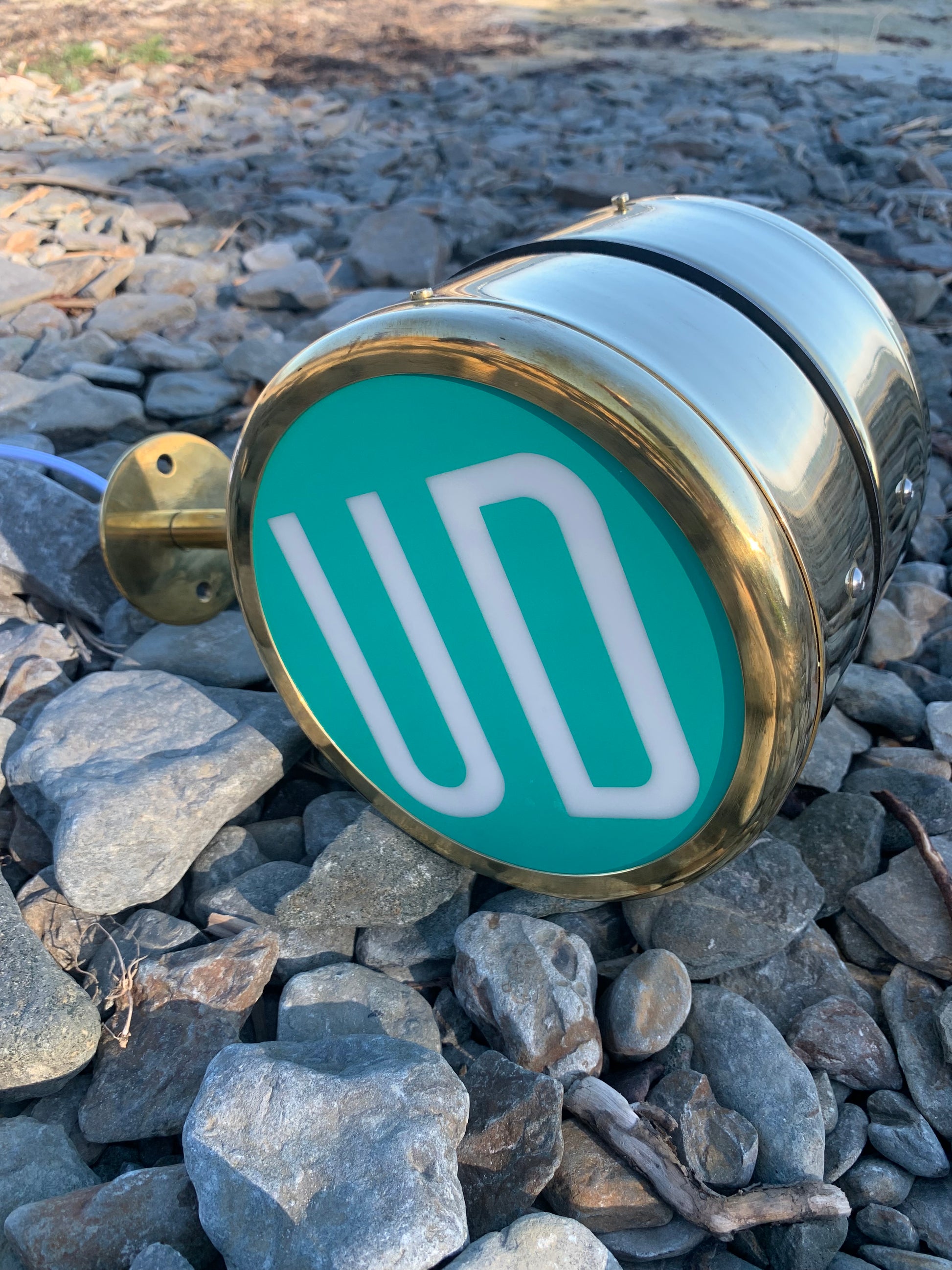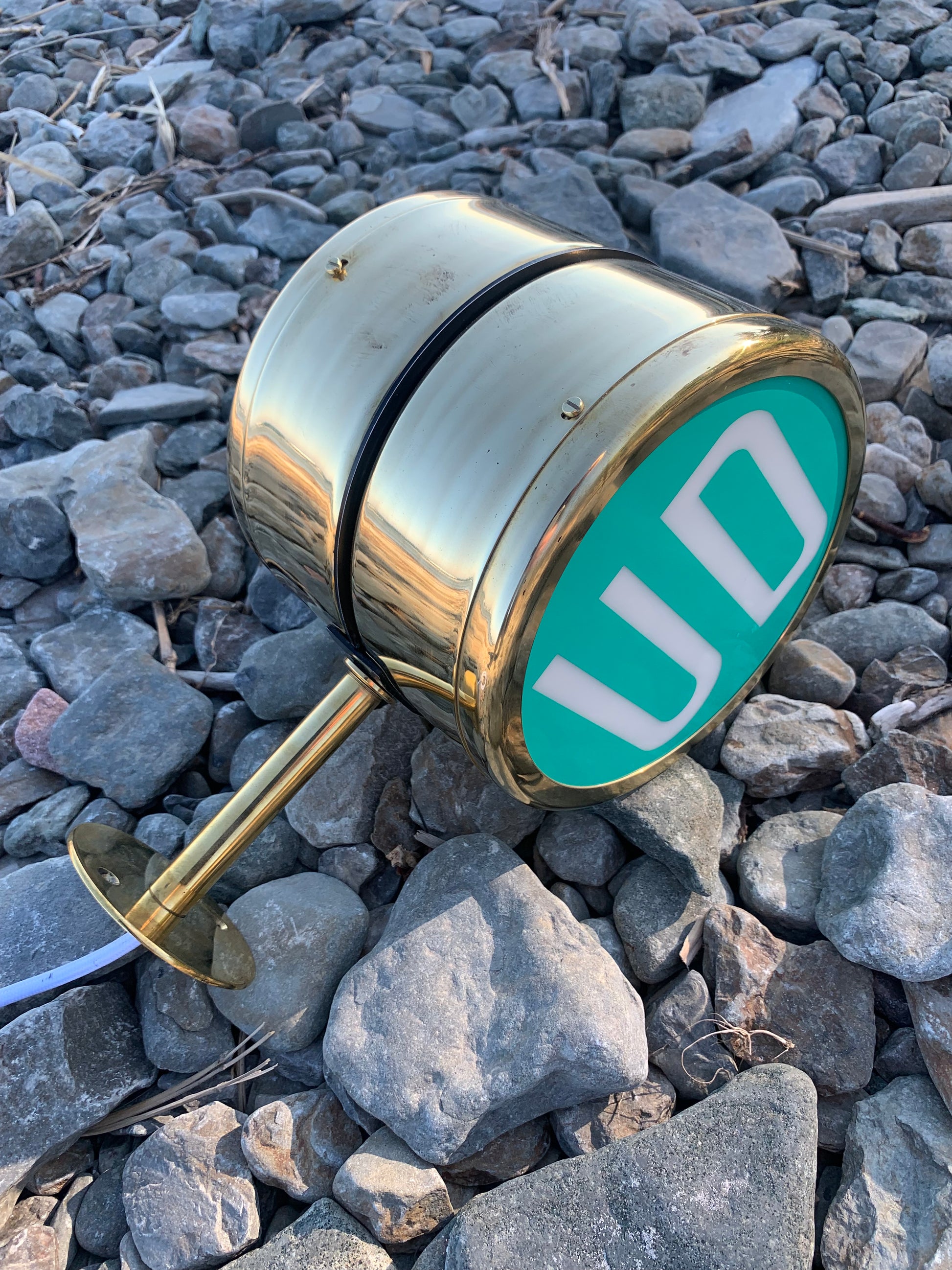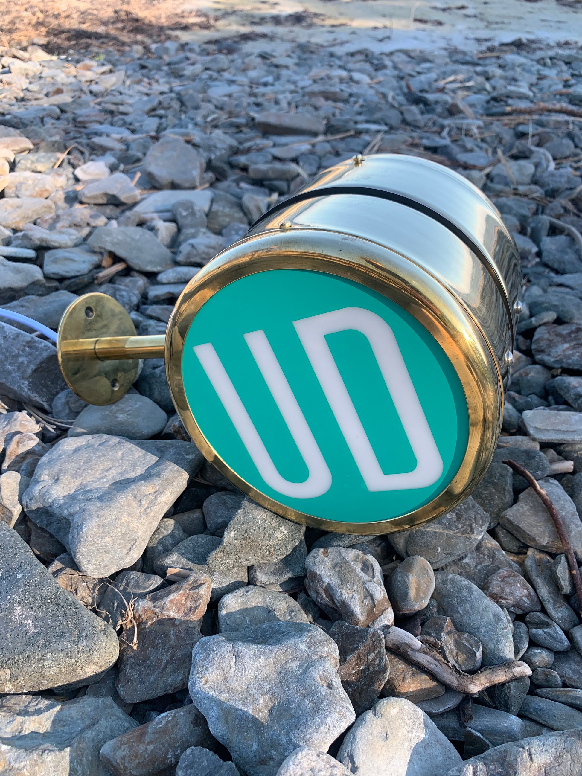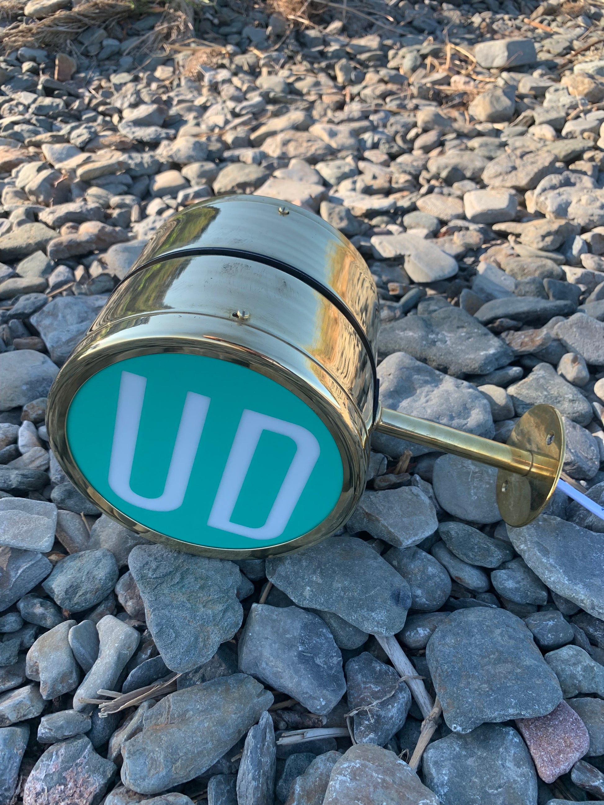 Eines der schönen alten doppelten beleuchteten Louis Poulsen UD-Schilder mit Messingrahmen und -arm. Diese Schilder kennt man von schönen Altbauten. Auf diesem Schild steht: OUT auf beiden Seiten.