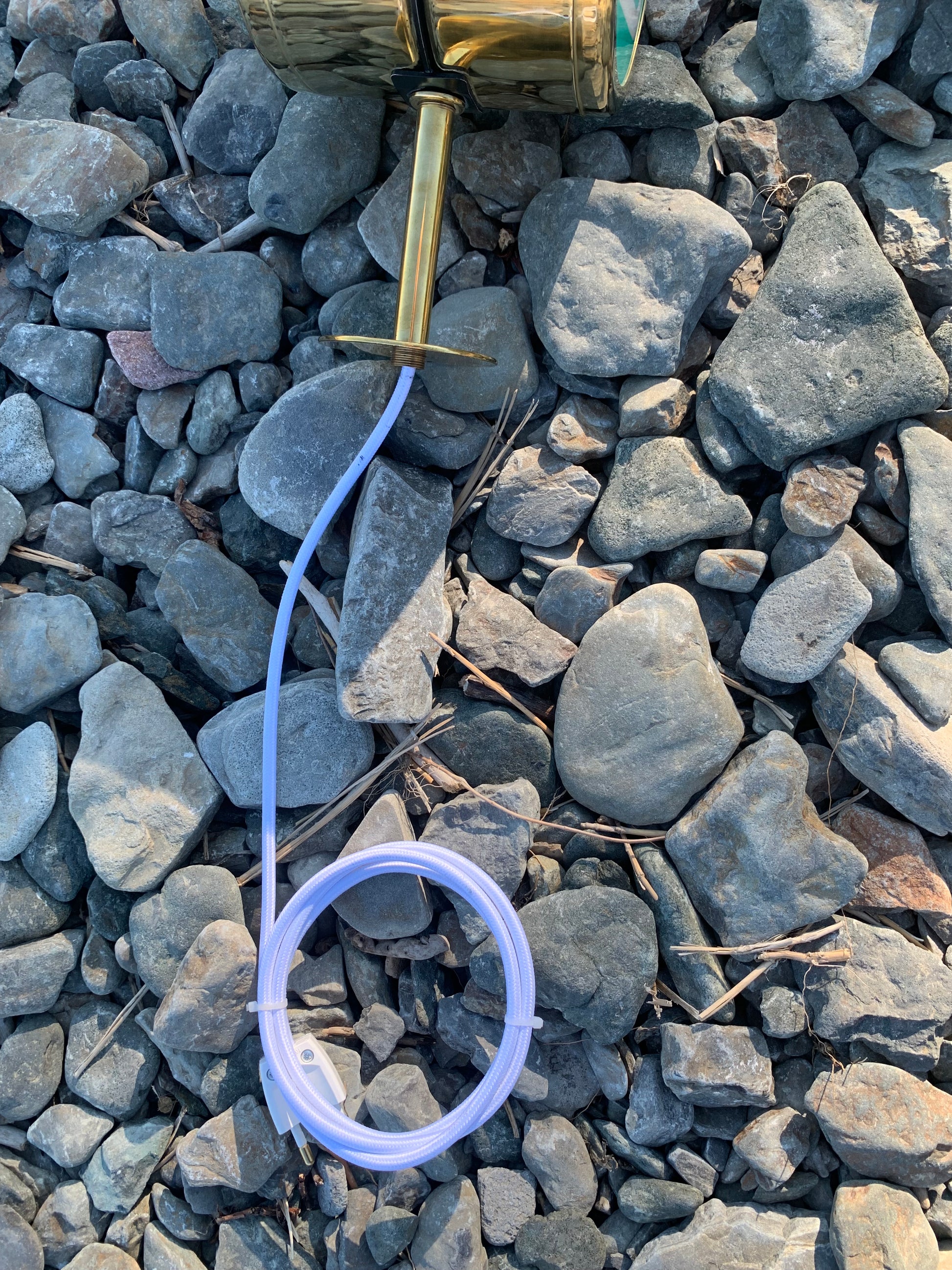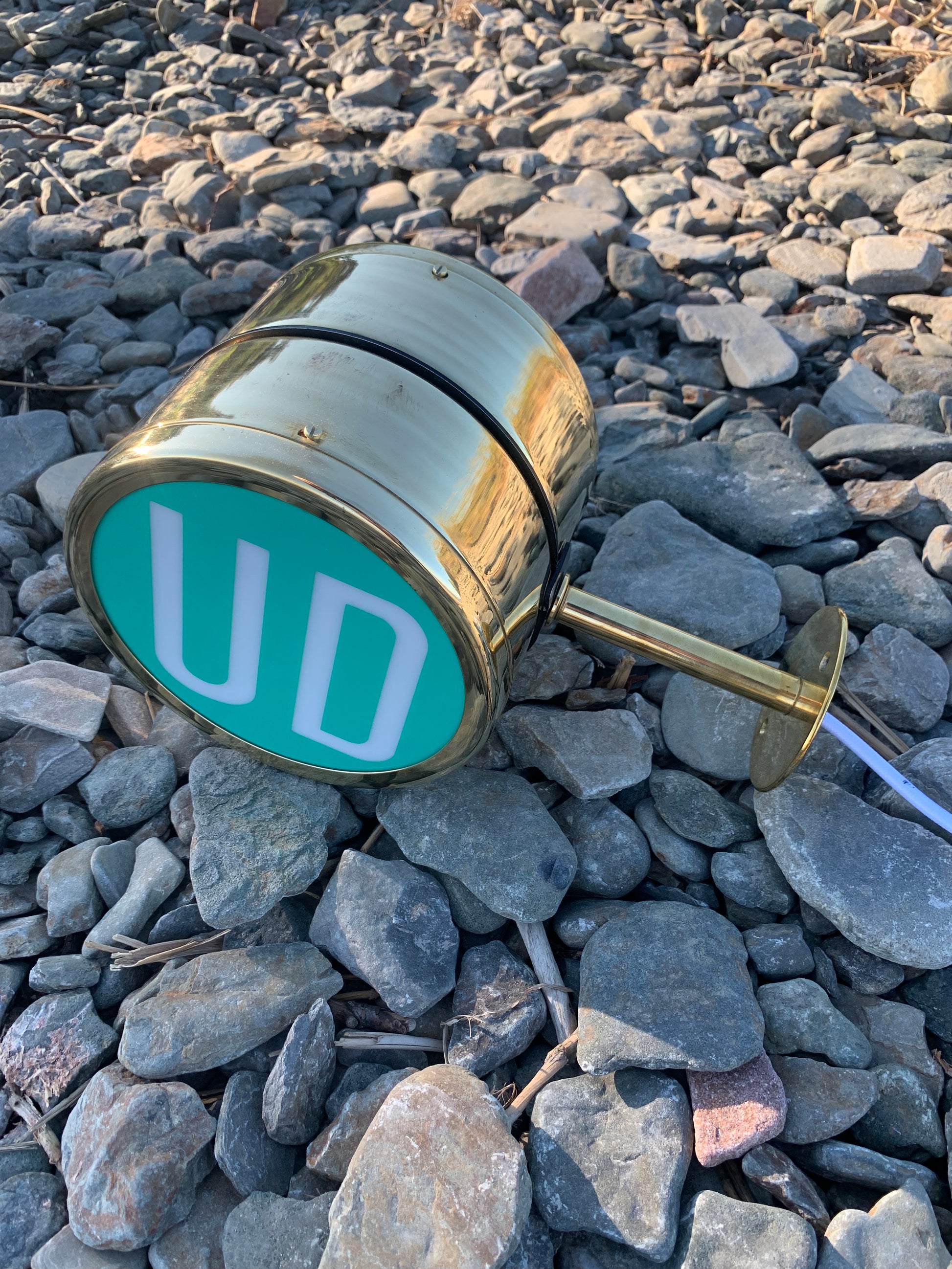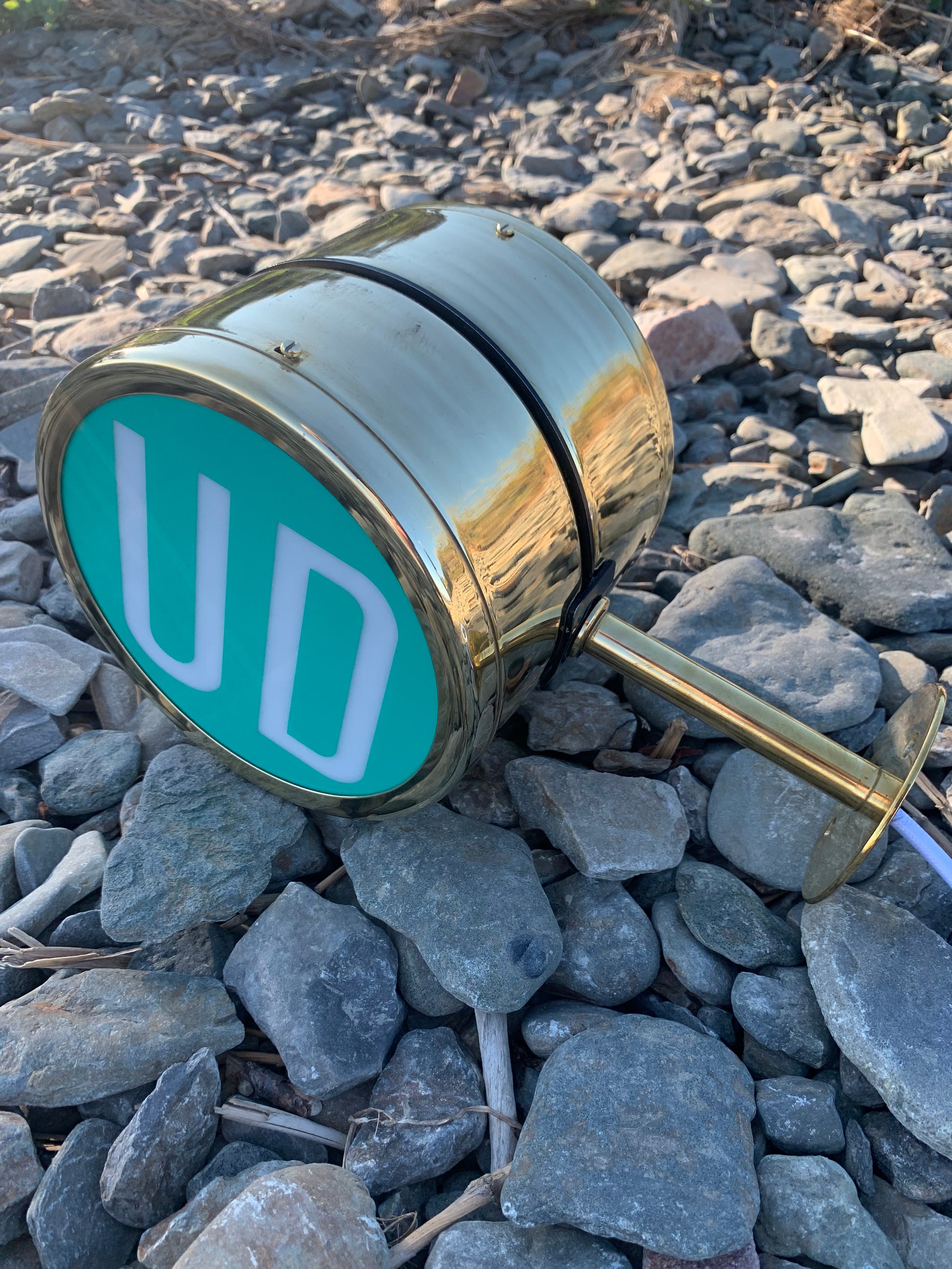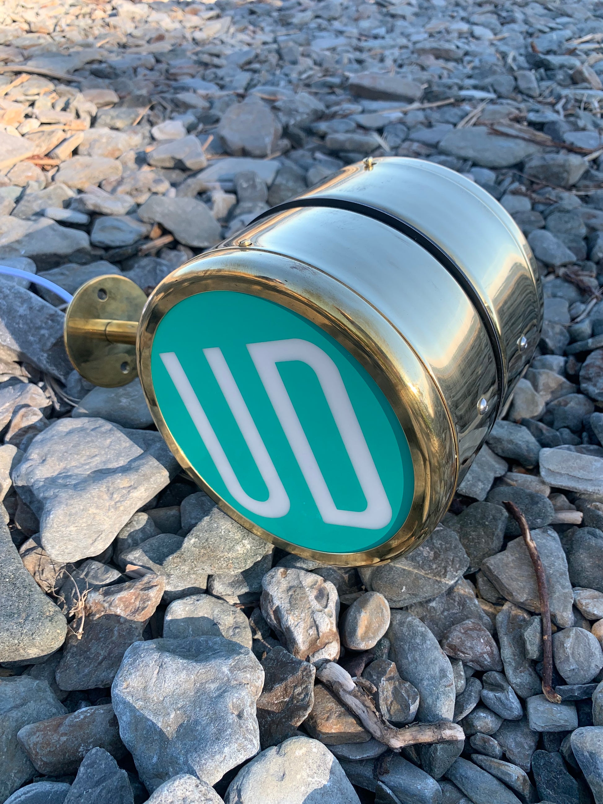 Eines der schönen alten doppelten beleuchteten Louis Poulsen UD-Schilder mit Messingrahmen und -arm. Diese Schilder kennt man von schönen Altbauten. Auf diesem Schild steht: OUT auf beiden Seiten.