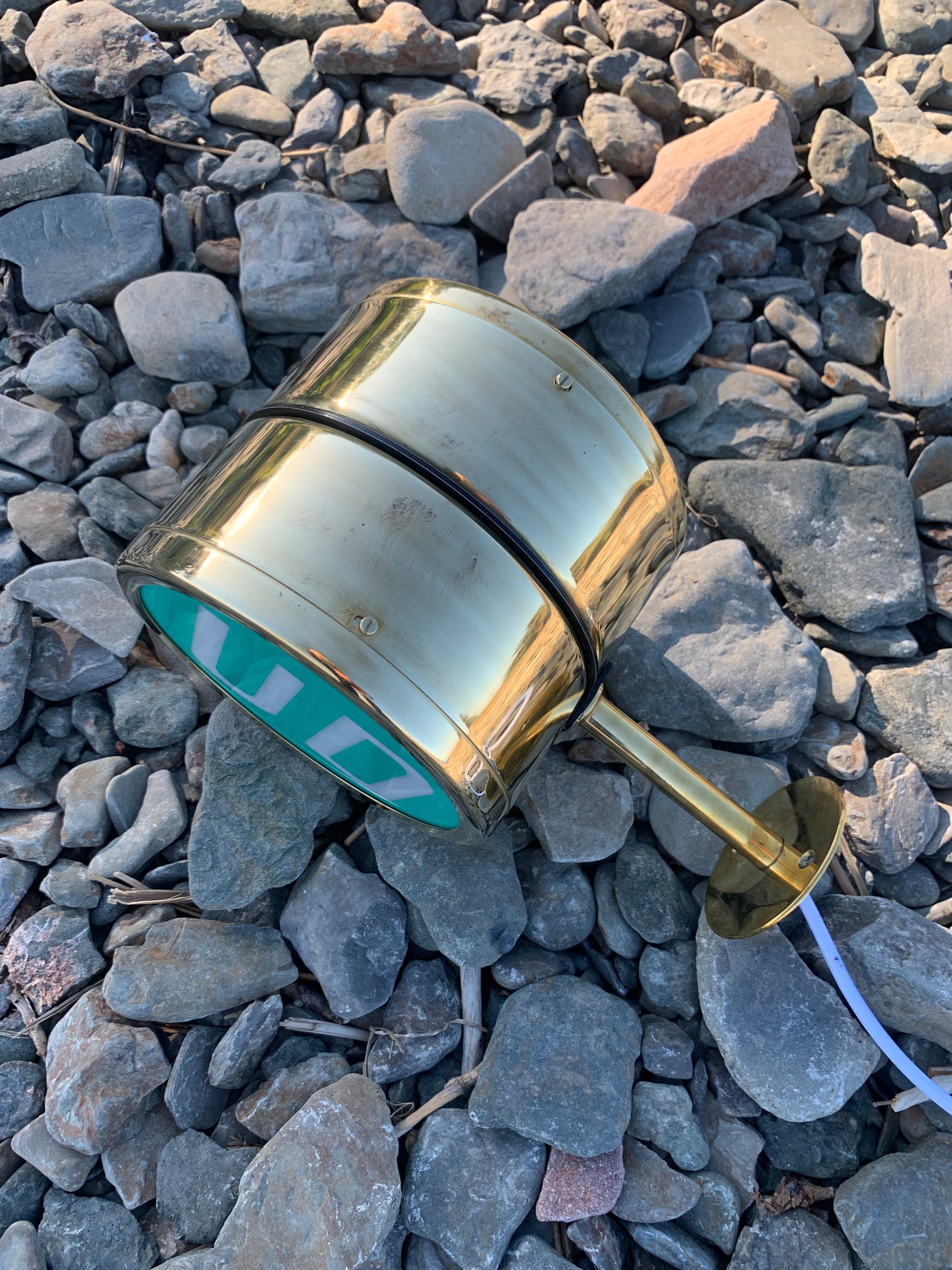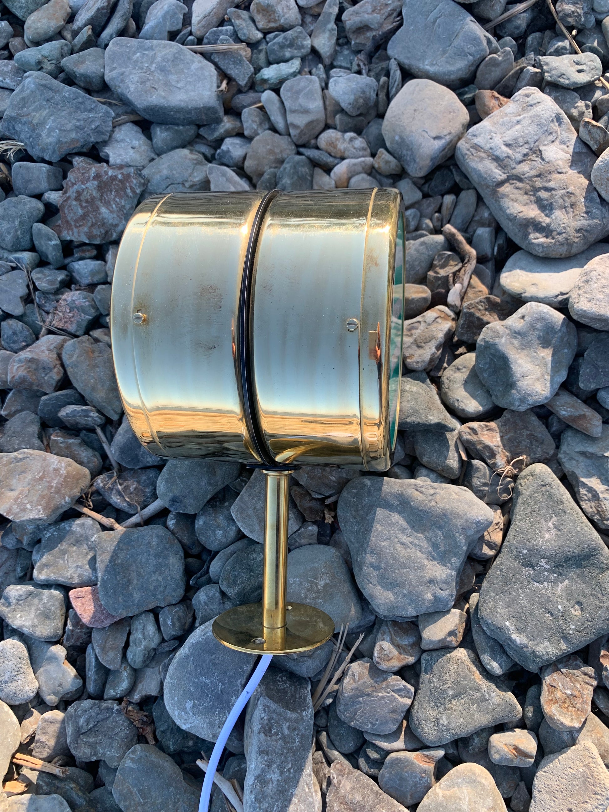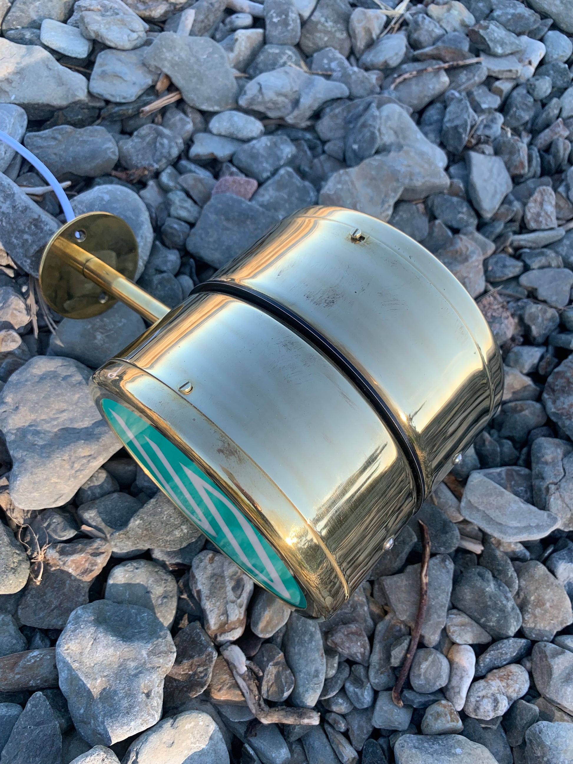 Geschichte: Notausgangsleuchte aus Messing hergestellt von Louis Poulsen. Der Entwurf der Lampe wird Vilhelm Lauritzen zugeschrieben.