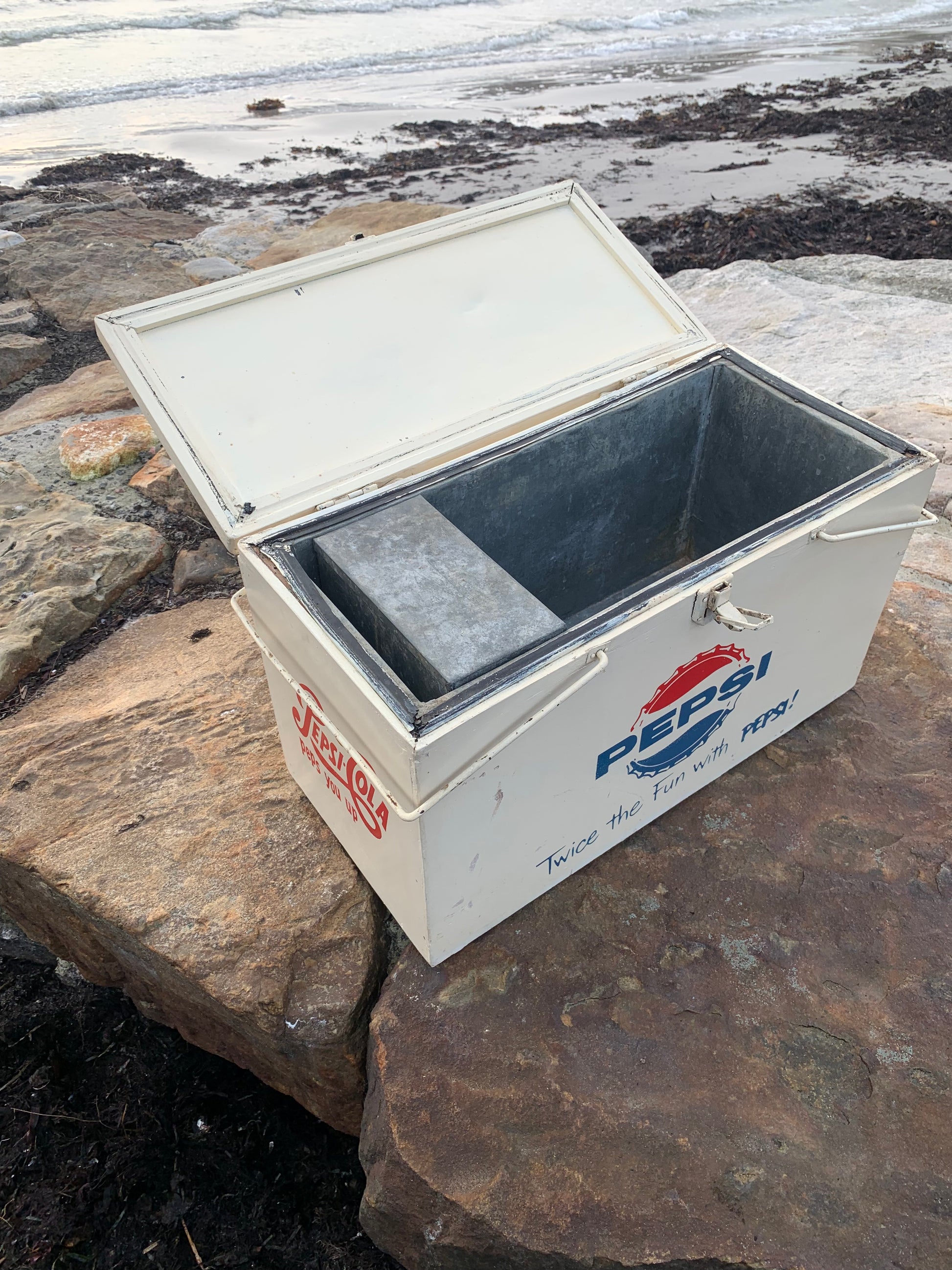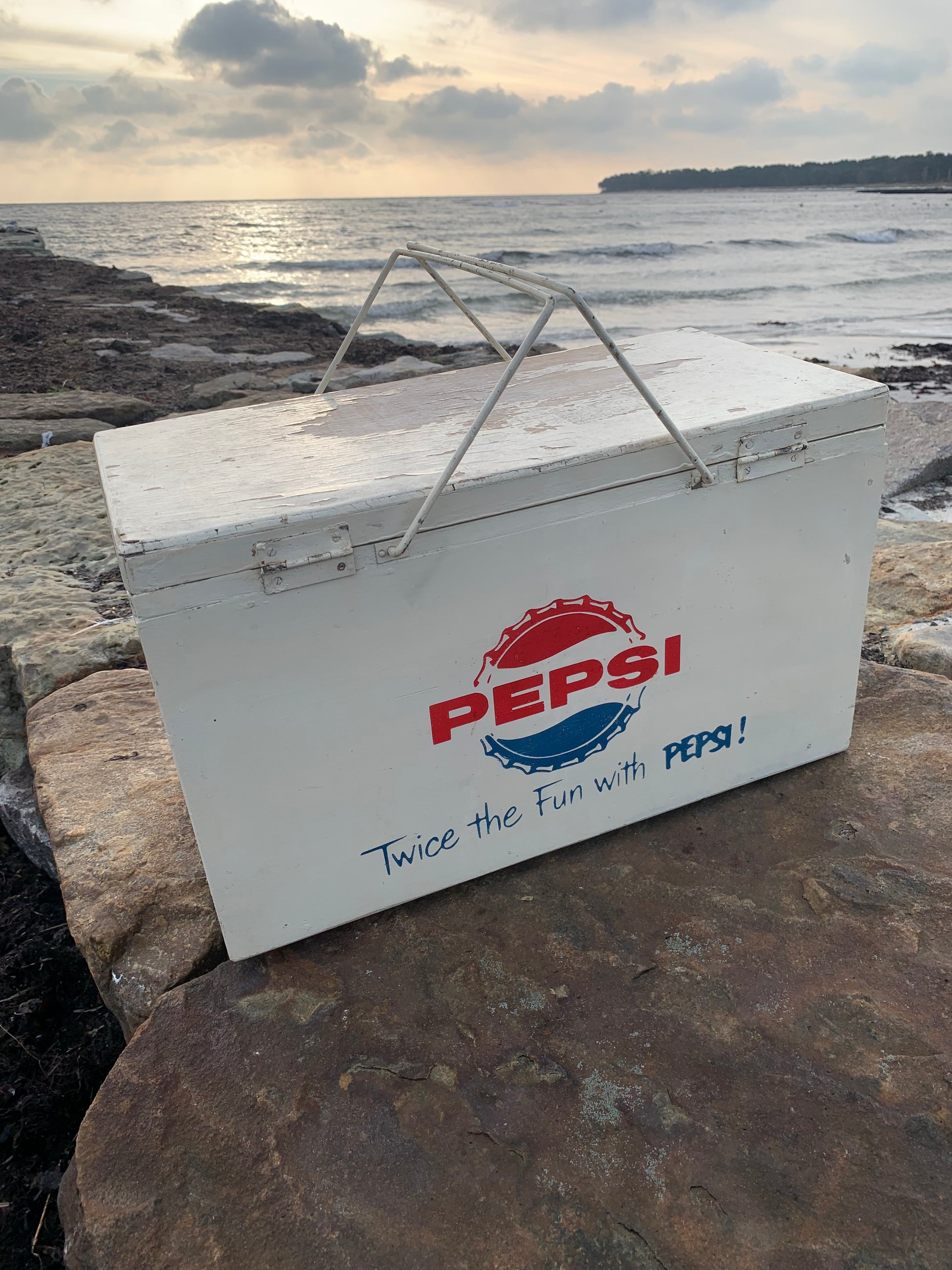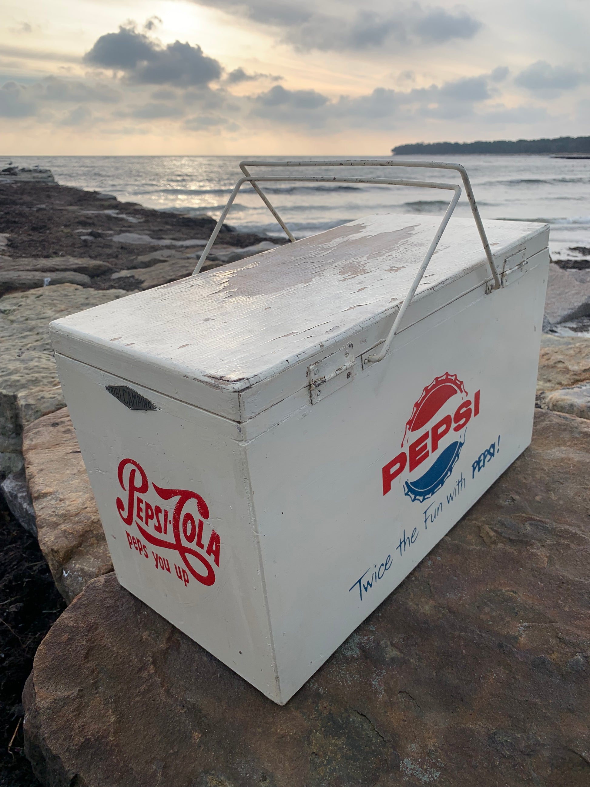 Ein wunderschöner, alter Pepsi-Kühler mit viel Charme und schöner Patina. Der Mann, von dem wir ihn gekauft haben, sagte uns, er stamme aus den 1960er Jahren.