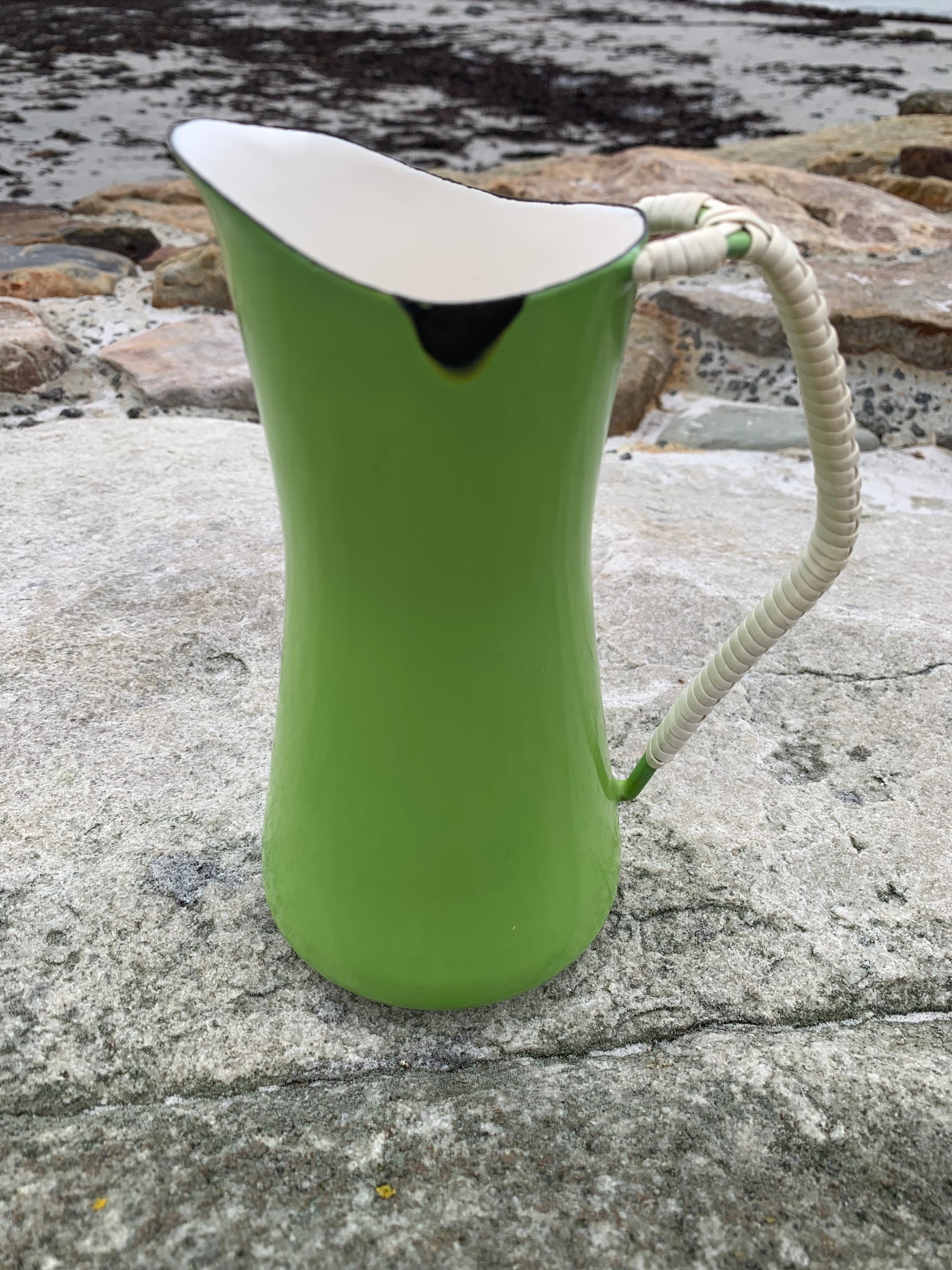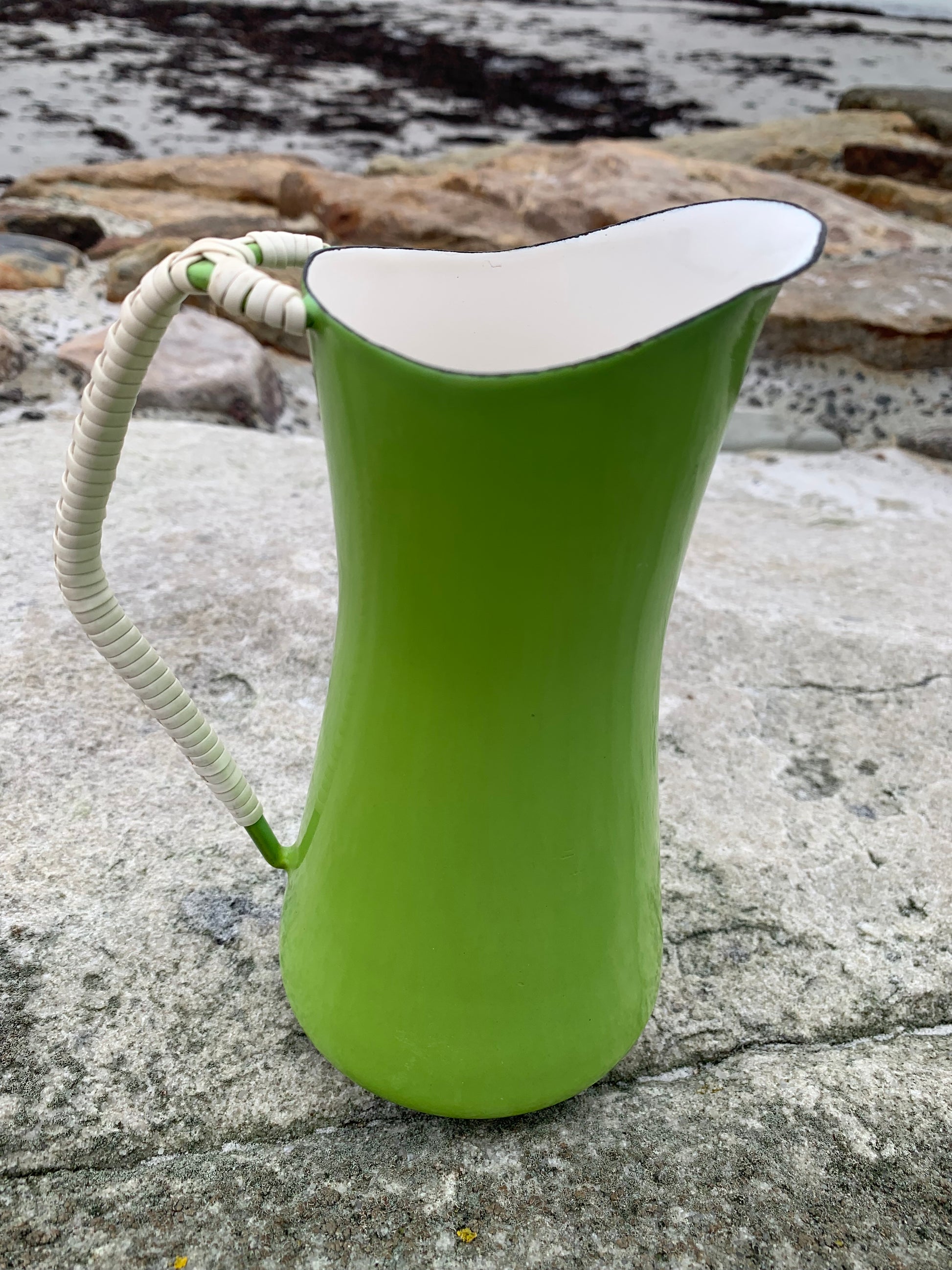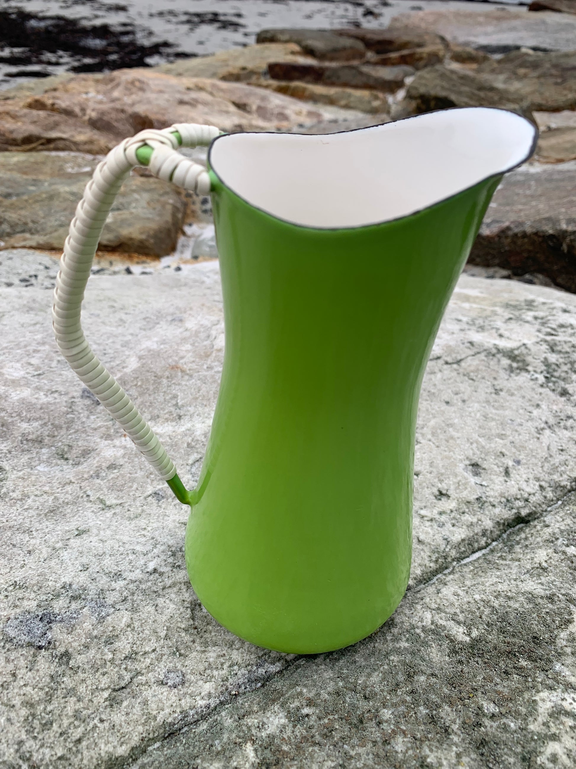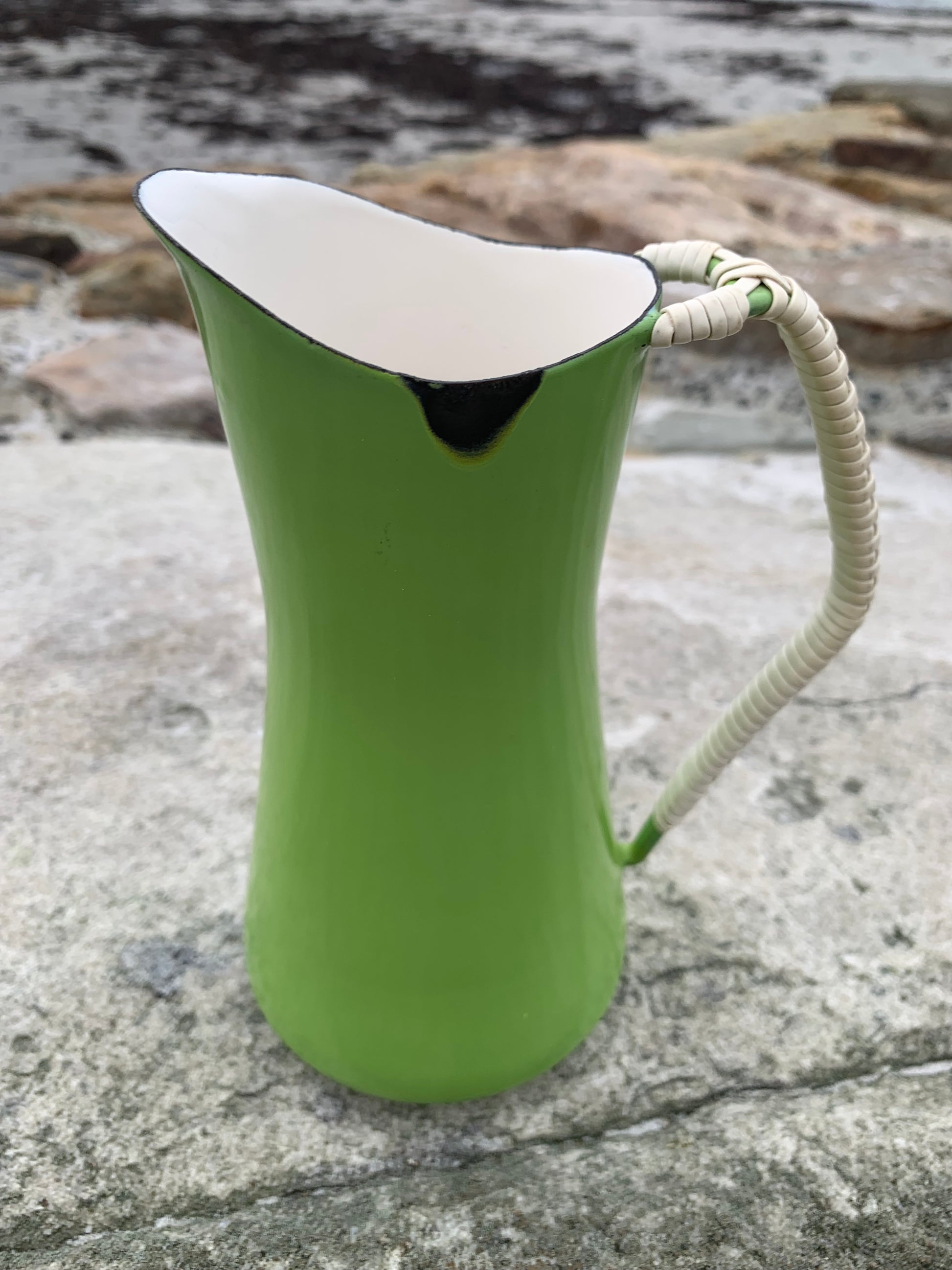 Wunderschöner Emaillekrug von Jens Harald Quistgaard. Der schöne Krug (mit dem bekannten geflochtenen Henkel) weist oben eine kleine Emailleabsplitterung auf (siehe Foto) und befindet sich ansonsten in einem sehr guten Vintage-Zustand.