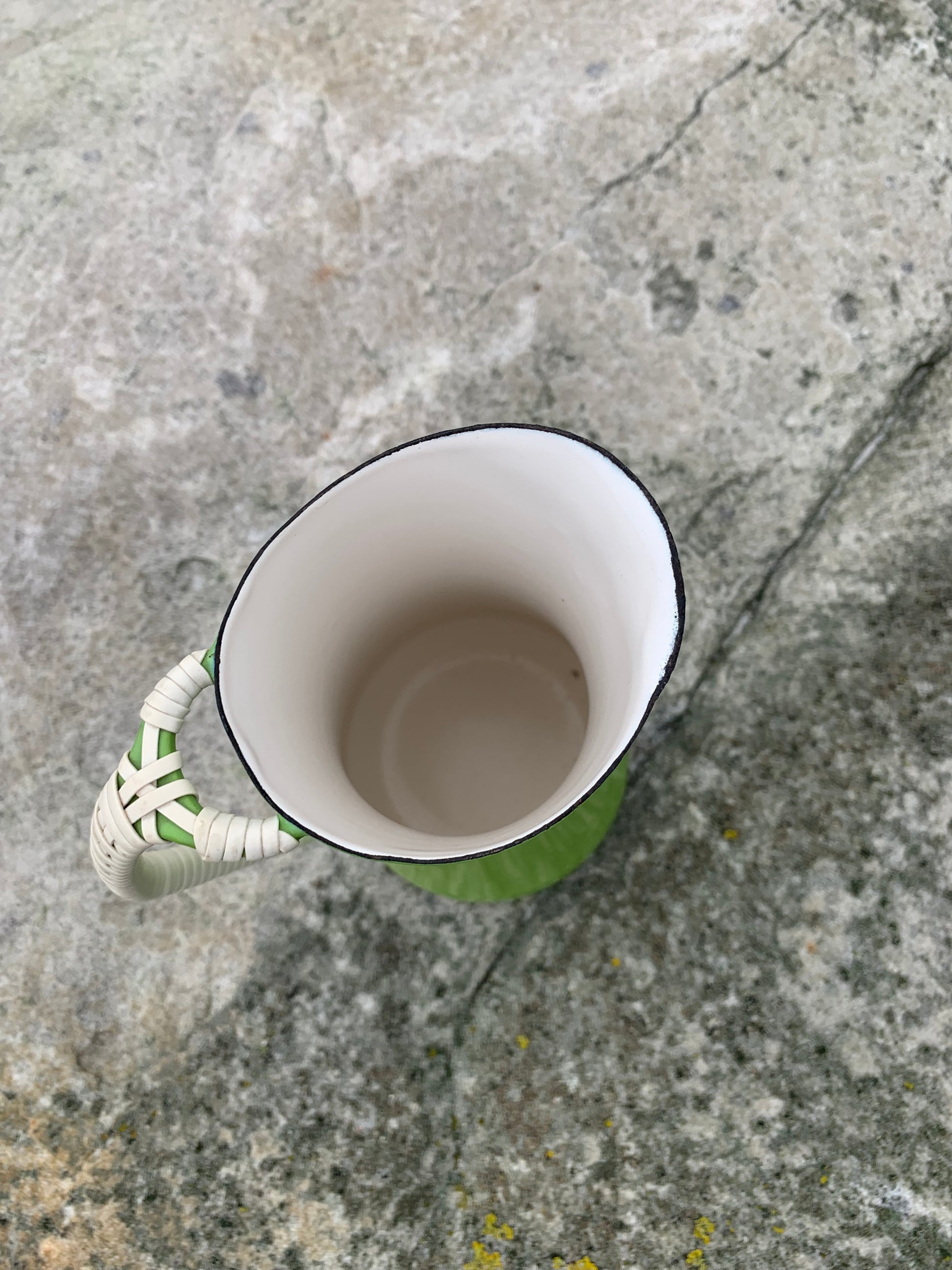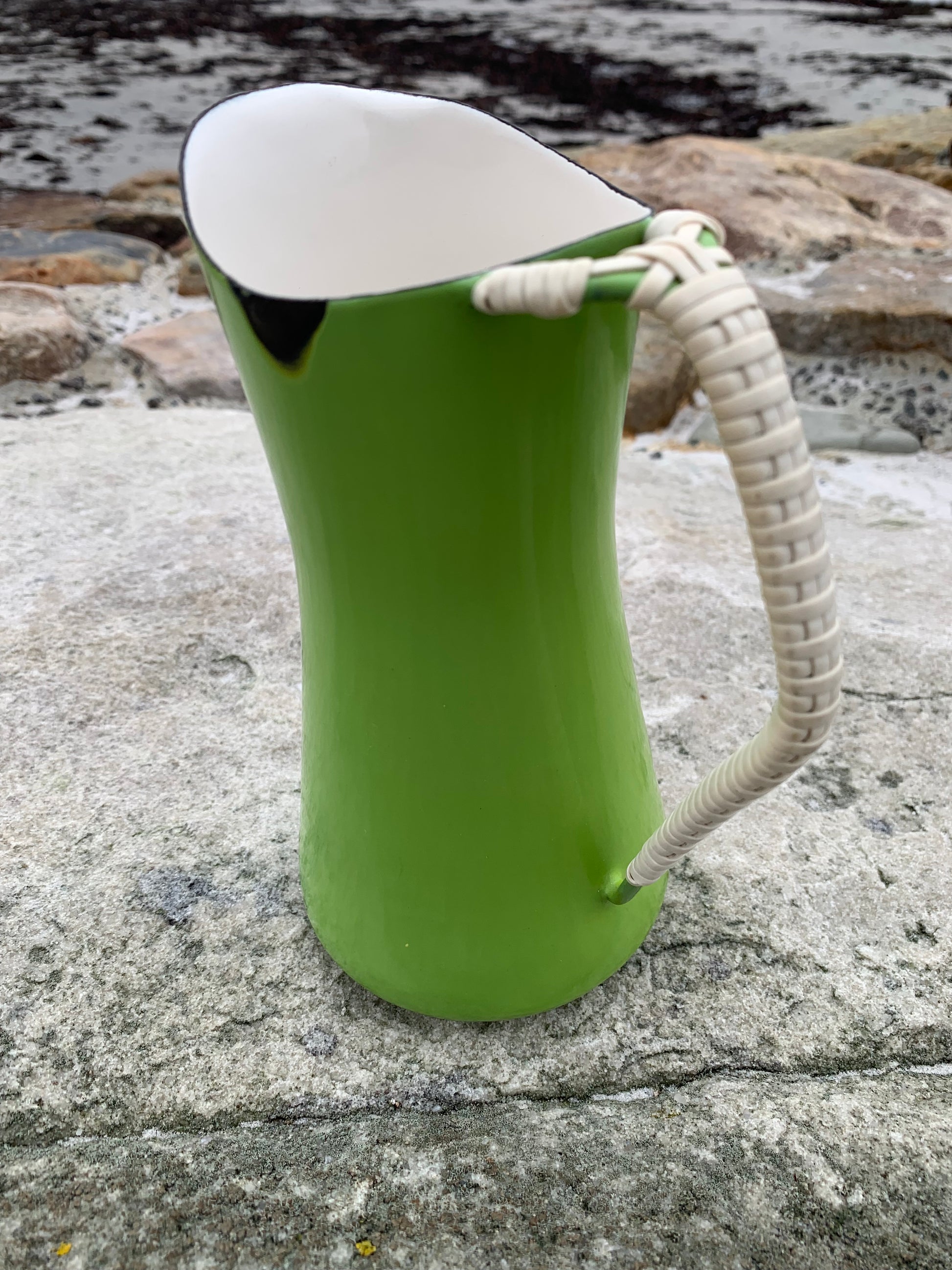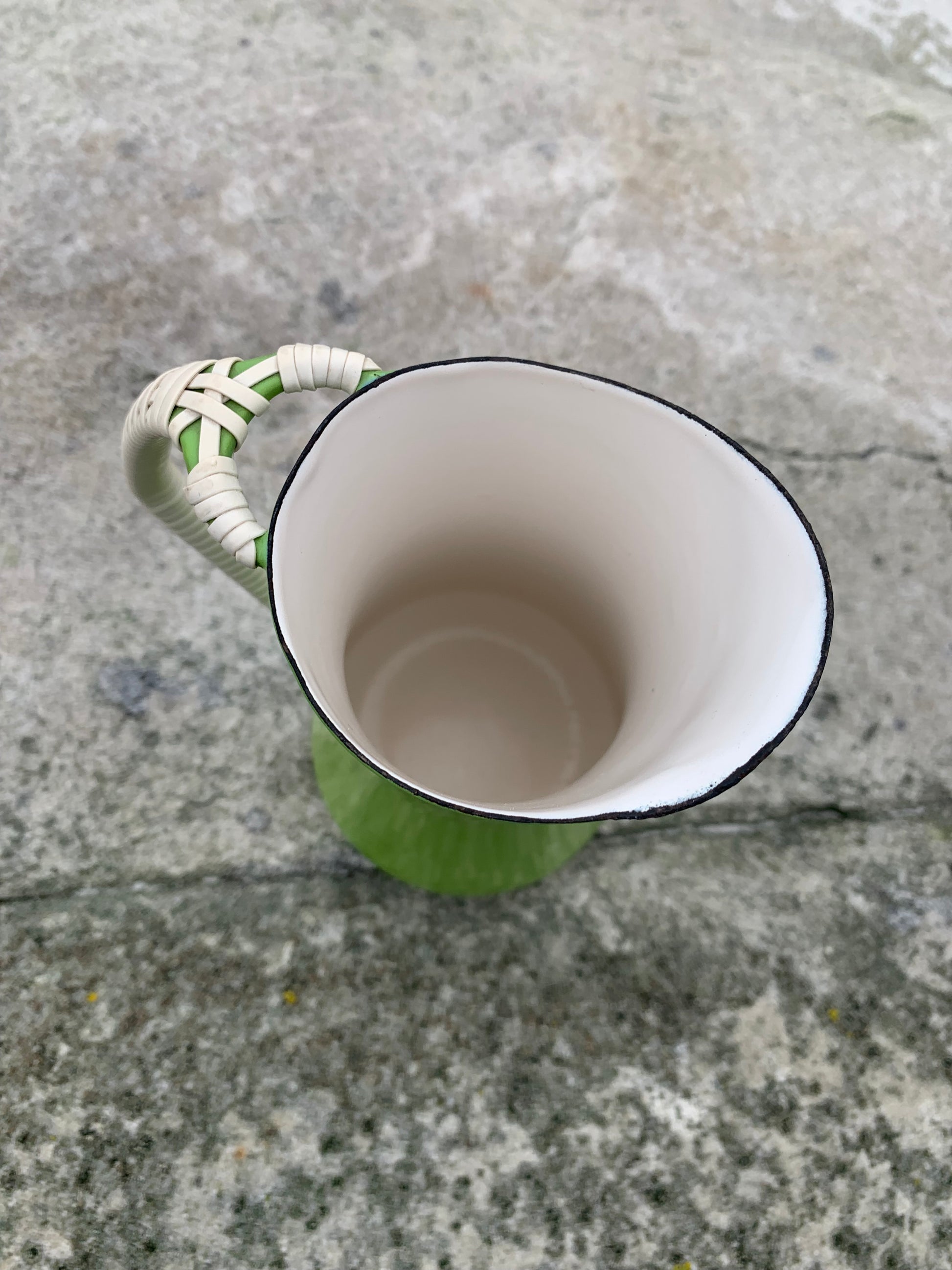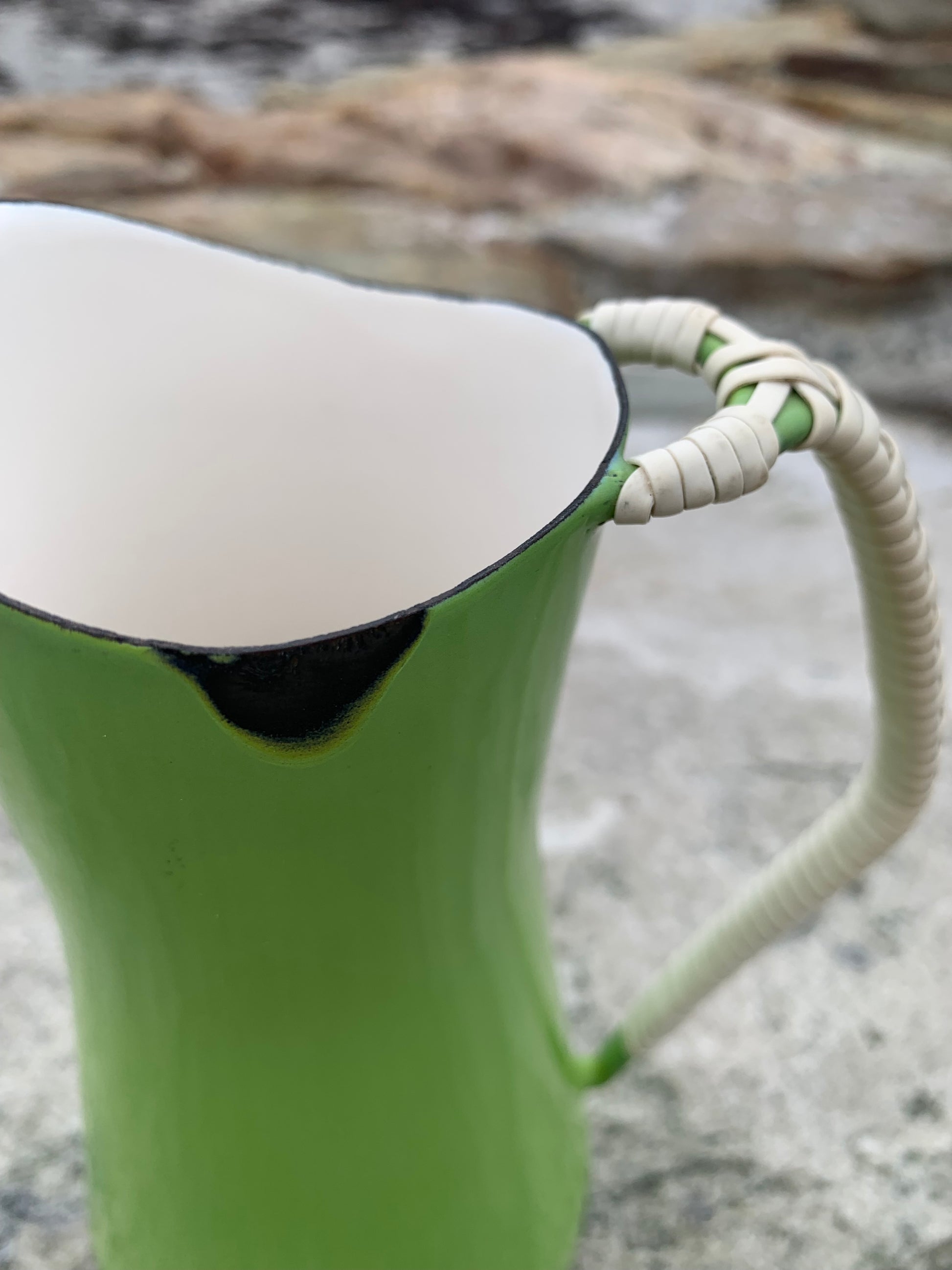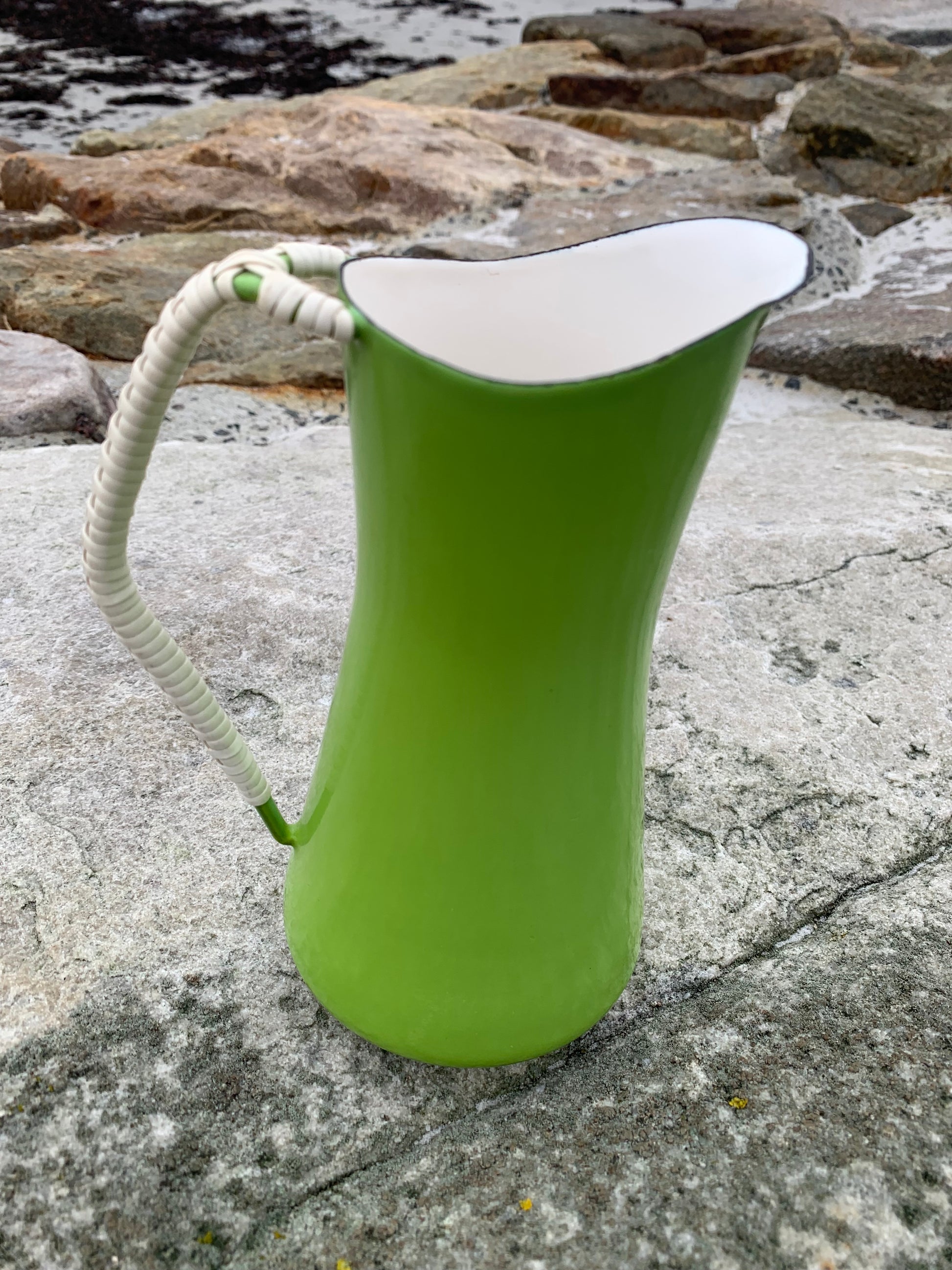 Wunderschöner Emaillekrug von Jens Harald Quistgaard. Der schöne Krug (mit dem bekannten geflochtenen Henkel) weist oben eine kleine Emailleabsplitterung auf (siehe Foto) und befindet sich ansonsten in einem sehr guten Vintage-Zustand.