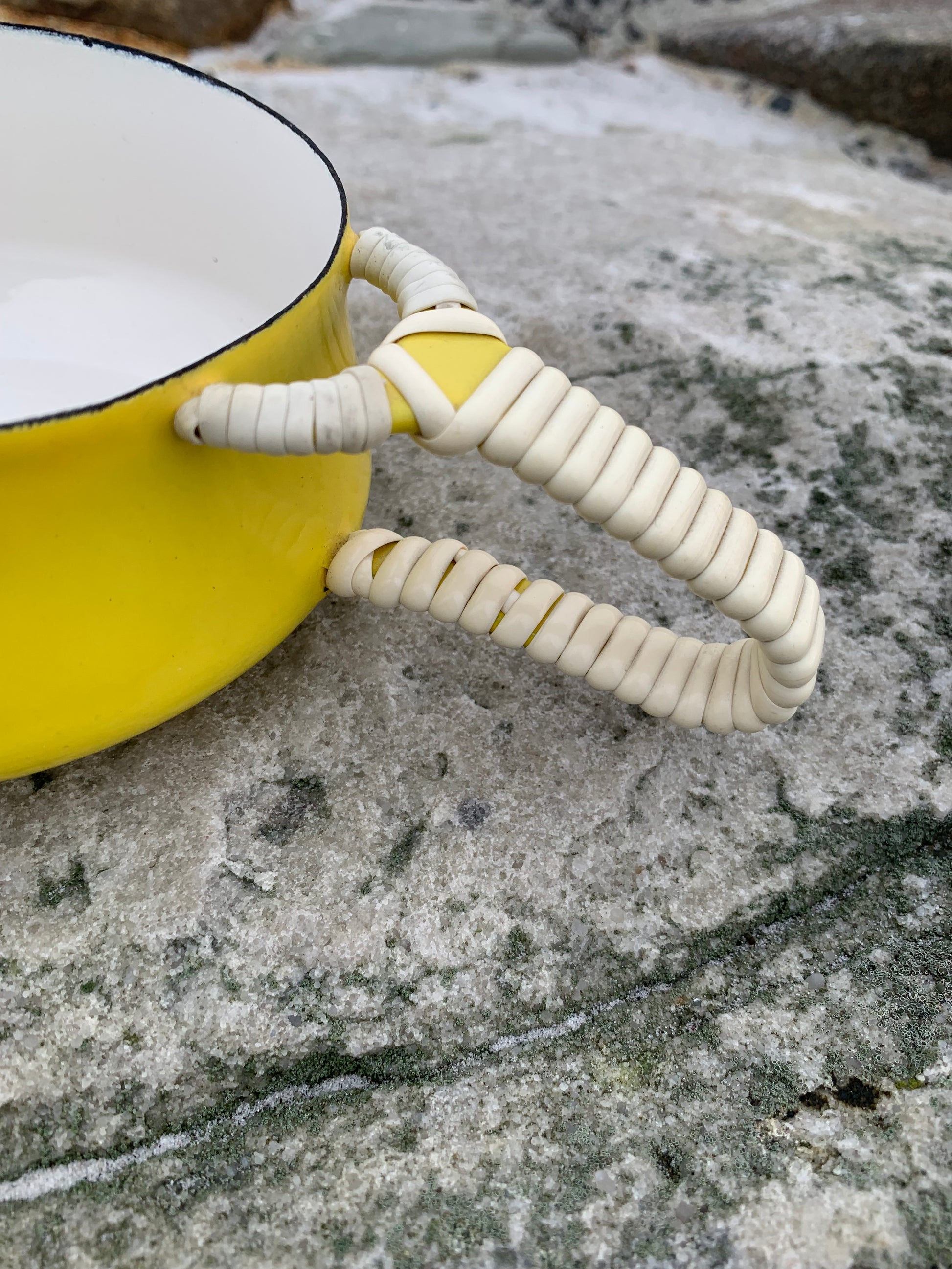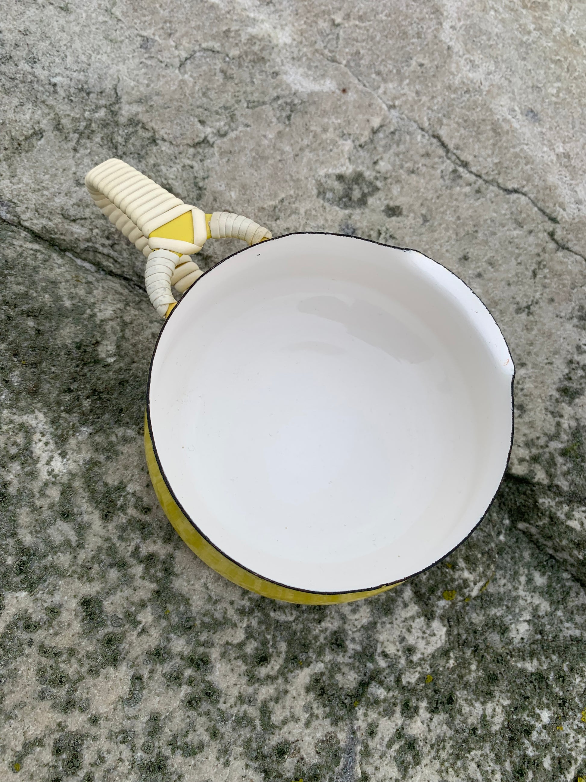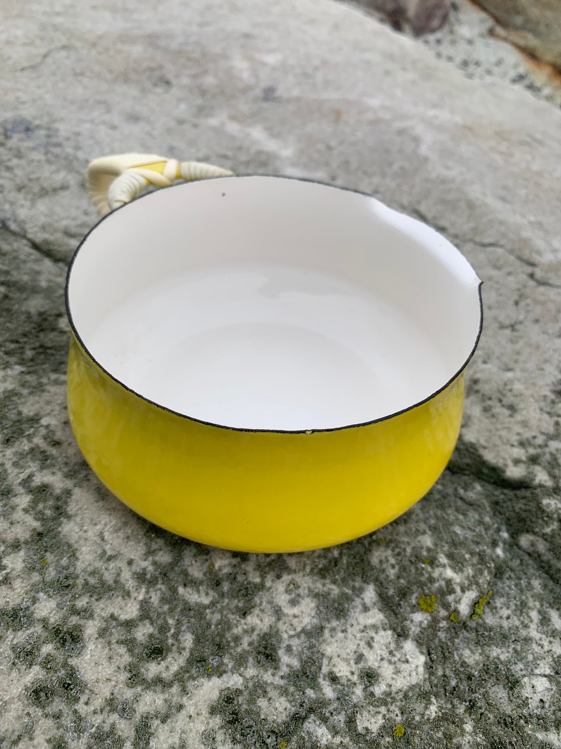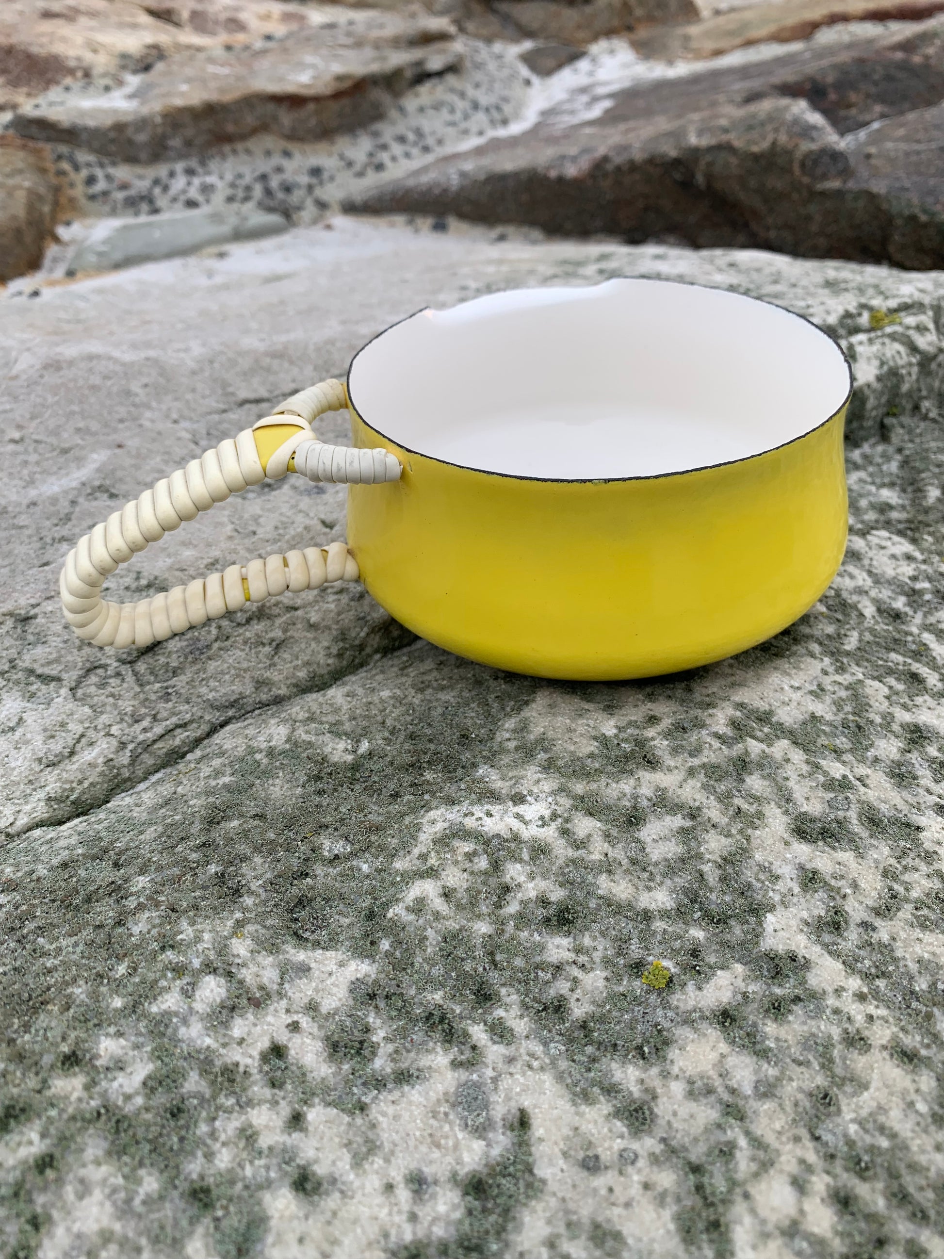 Ein außergewöhnlich schönes Exemplar der wunderschönen Emaille-Schüssel (Saucenschale) von Jens Harald Quistgaard. Die elegante gelbe Schüssel (mit dem bekannten Weidenkorbgriff) befindet sich in einem für ihr Alter seltenen, hervorragenden Zustand mit minimalen Gebrauchsspuren.
