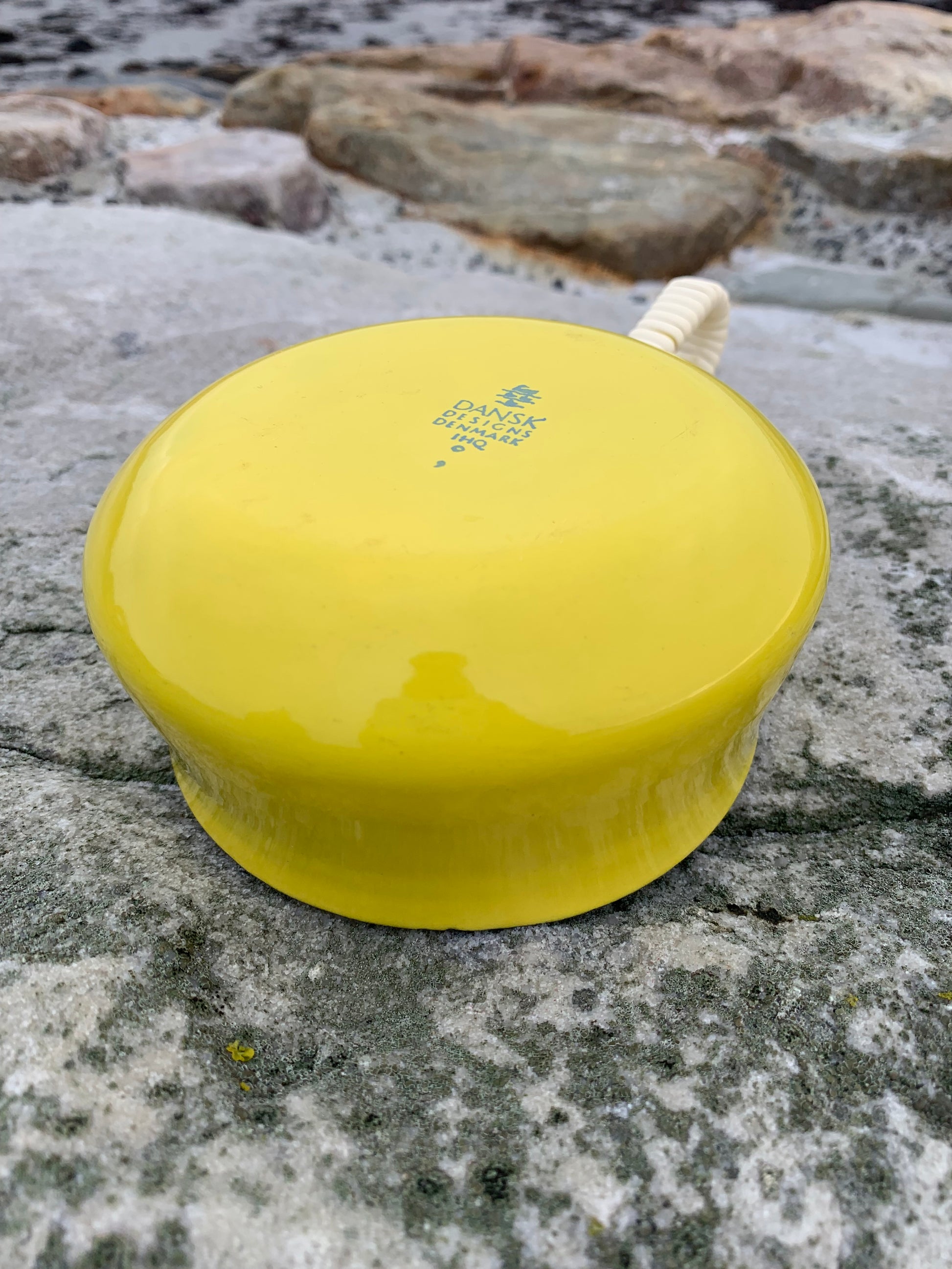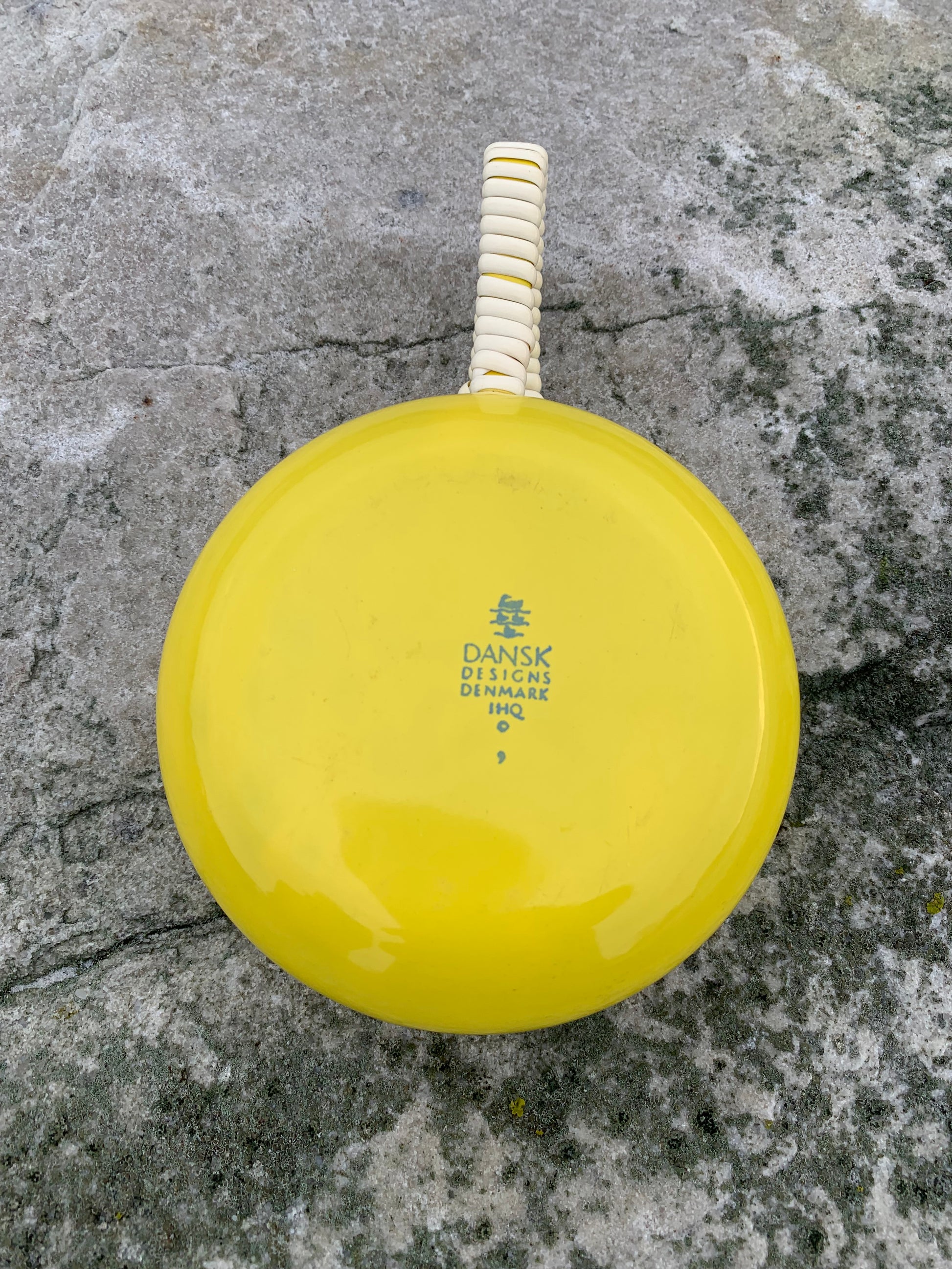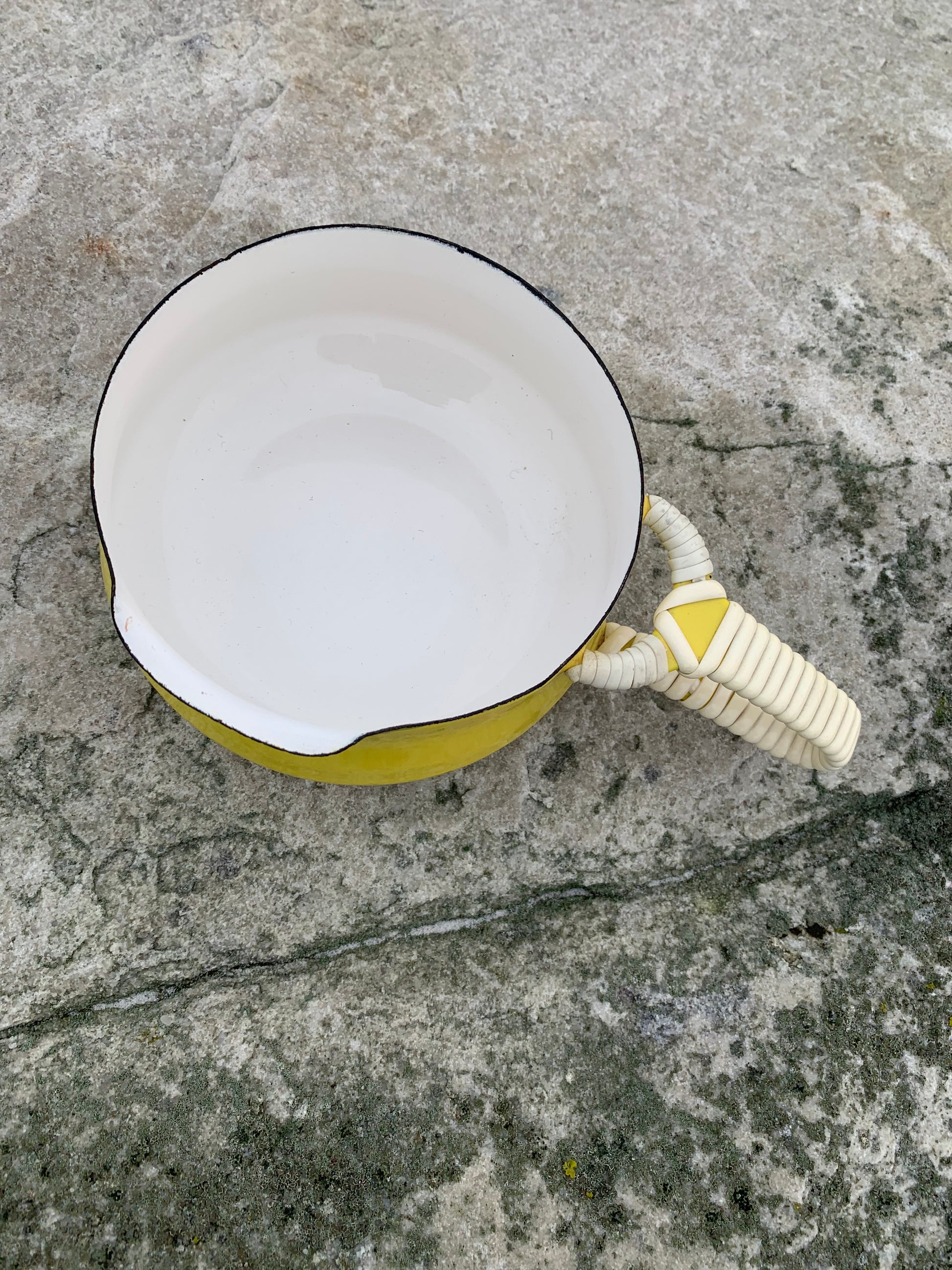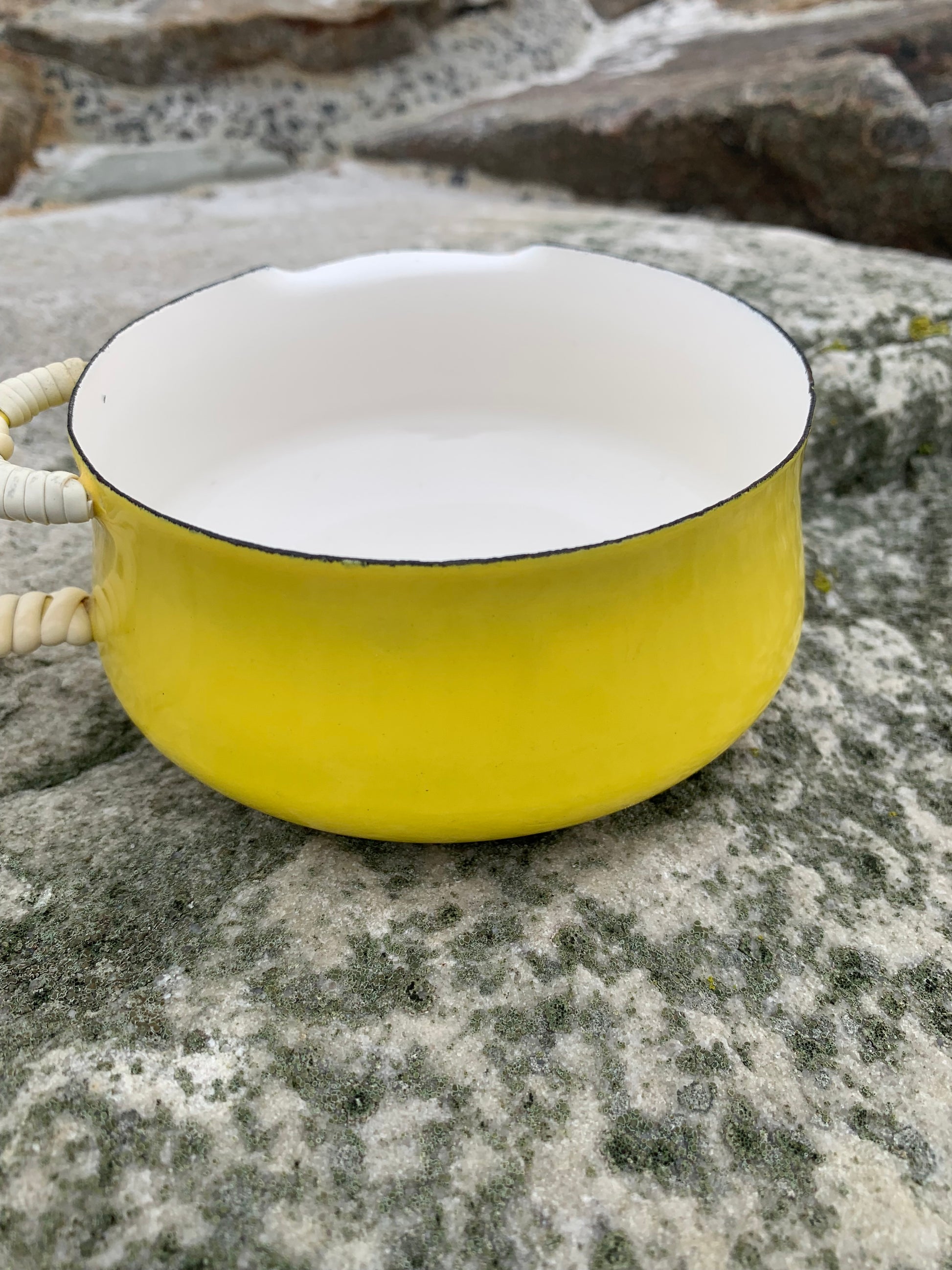 Ein außergewöhnlich schönes Exemplar der wunderschönen Emaille-Schüssel (Saucenschale) von Jens Harald Quistgaard. Die elegante gelbe Schüssel (mit dem bekannten Weidenkorbgriff) befindet sich in einem für ihr Alter seltenen, hervorragenden Zustand mit minimalen Gebrauchsspuren.