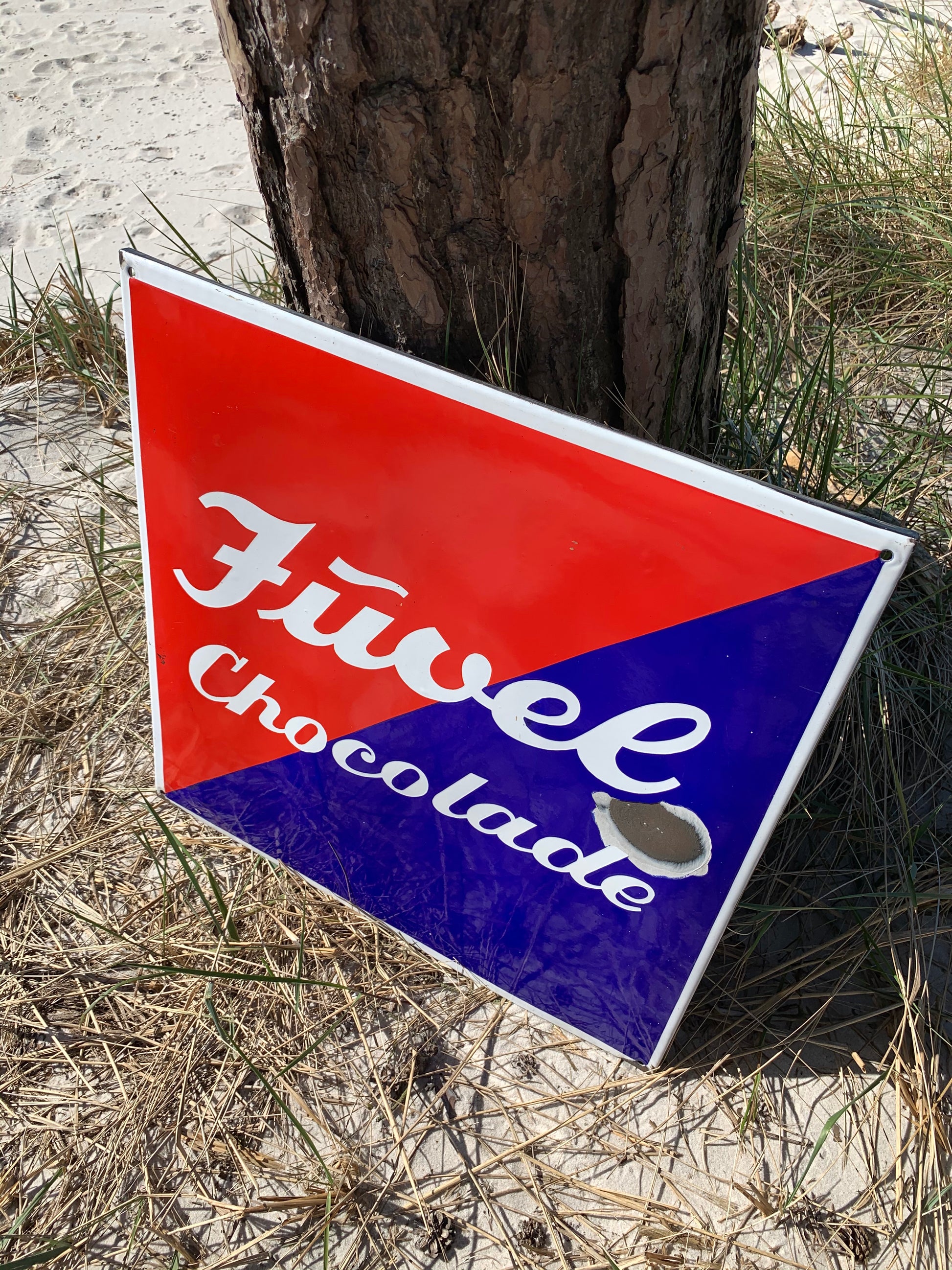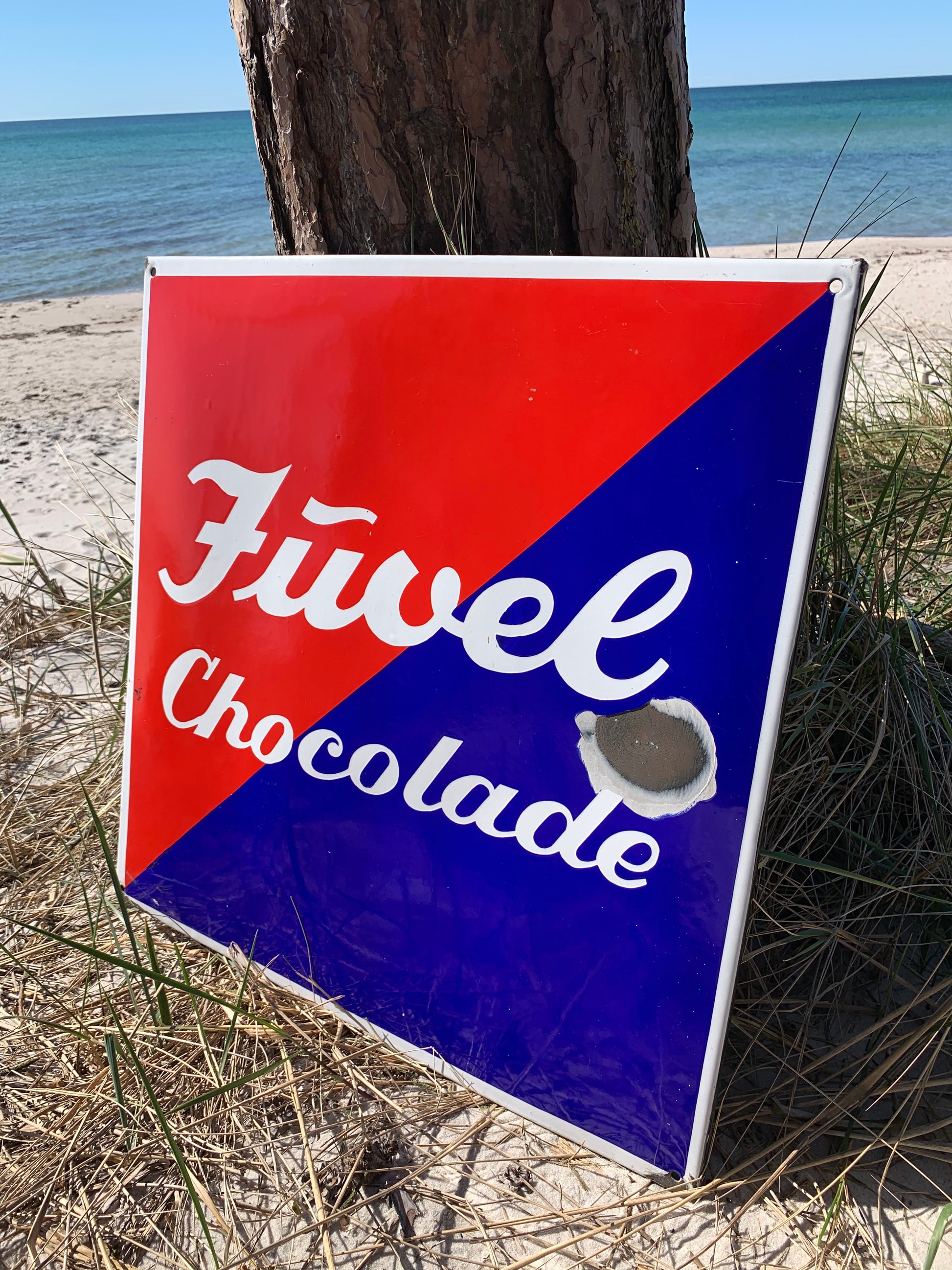 Schönes altes Emailleschild, das mit viel Original-Patina in Form von Chips und Kratzern erscheint. Das Schild ist von ca. 1950.