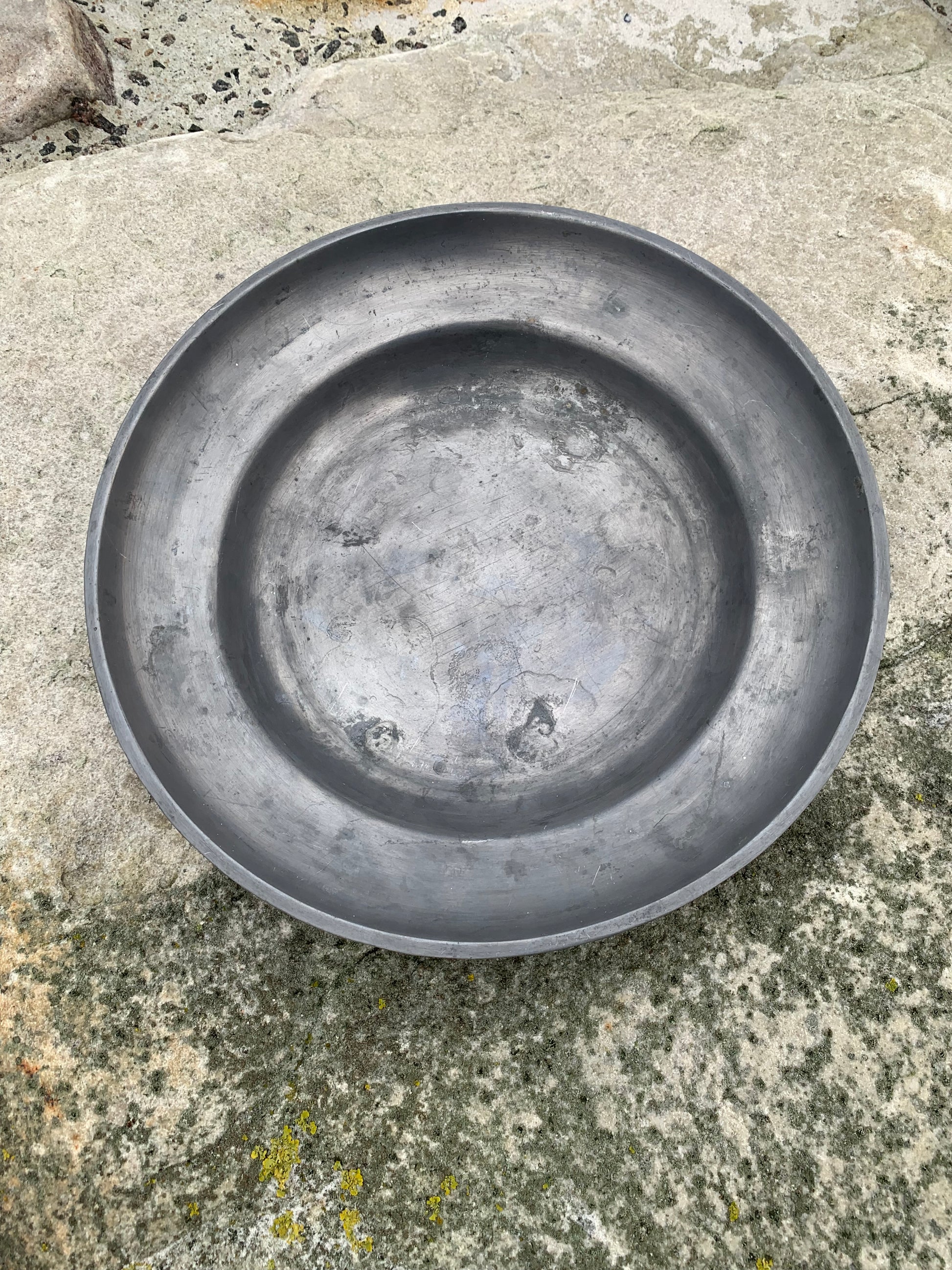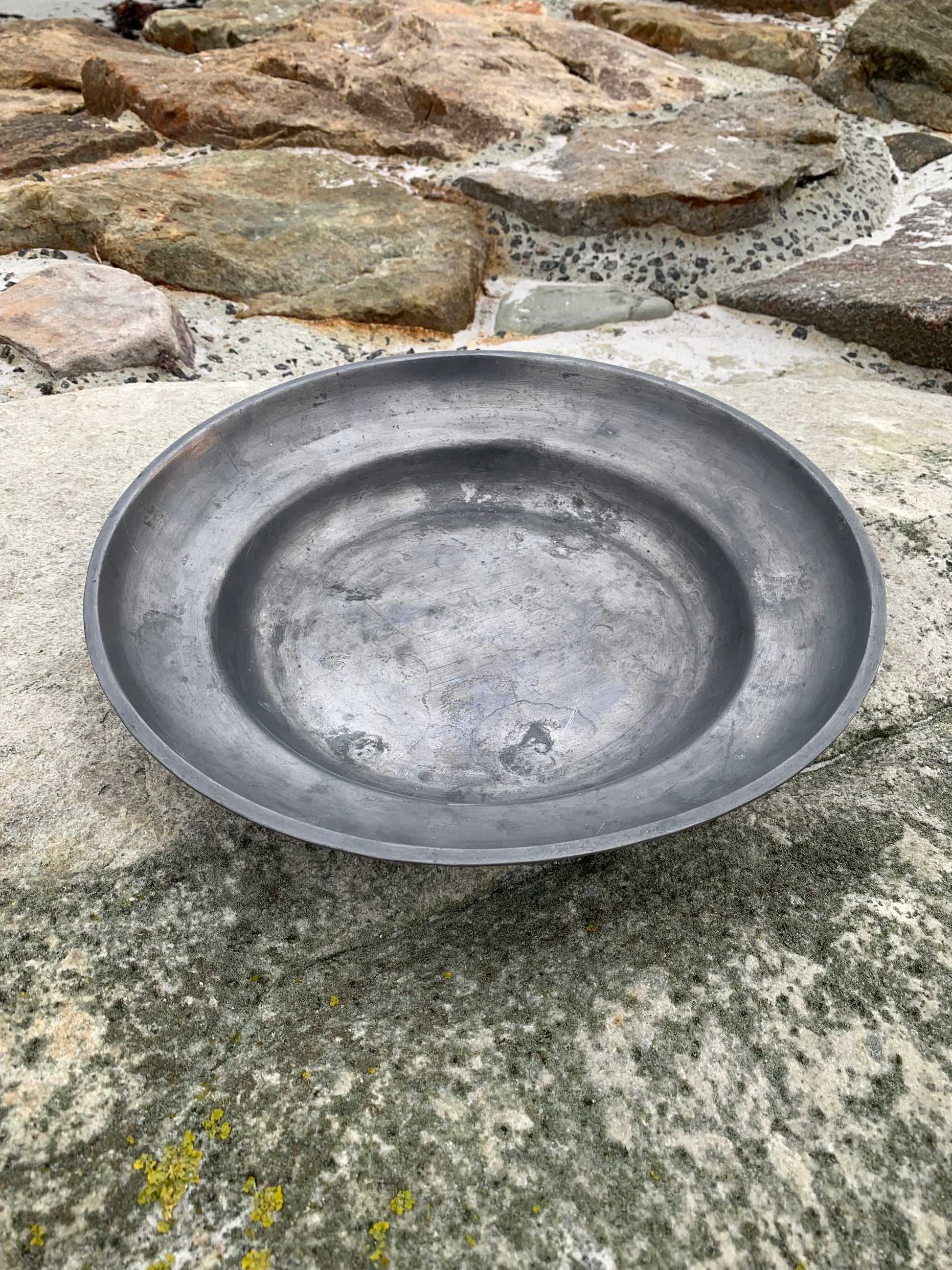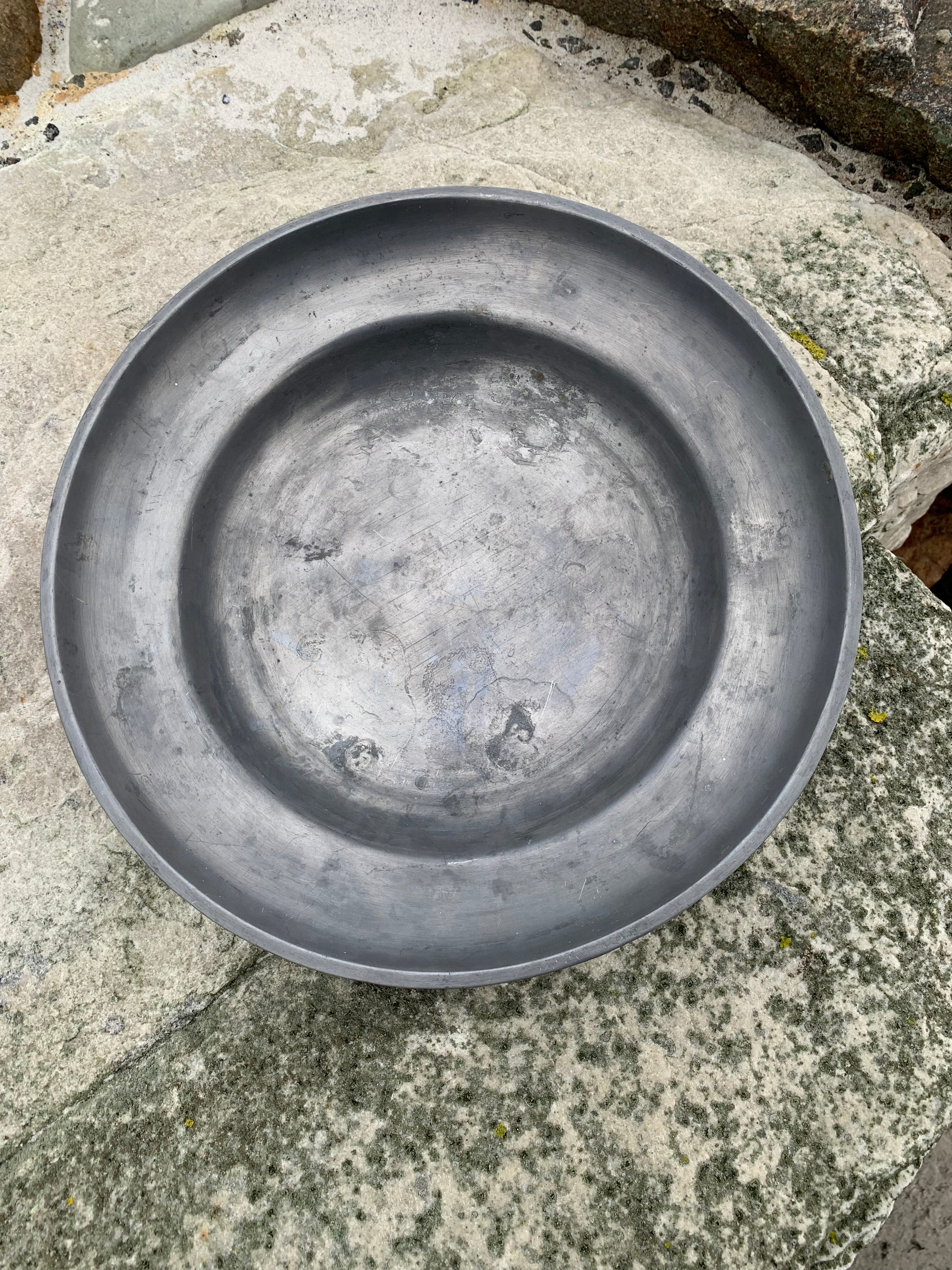 Wunderschöne alte Zinnschale mit viel Patina – sehr dekorativ und mit einem Stempel versehen.