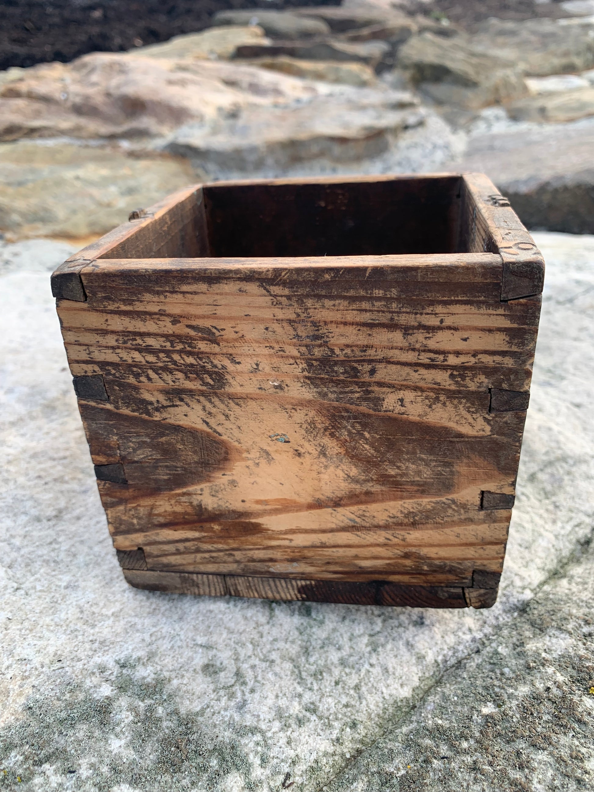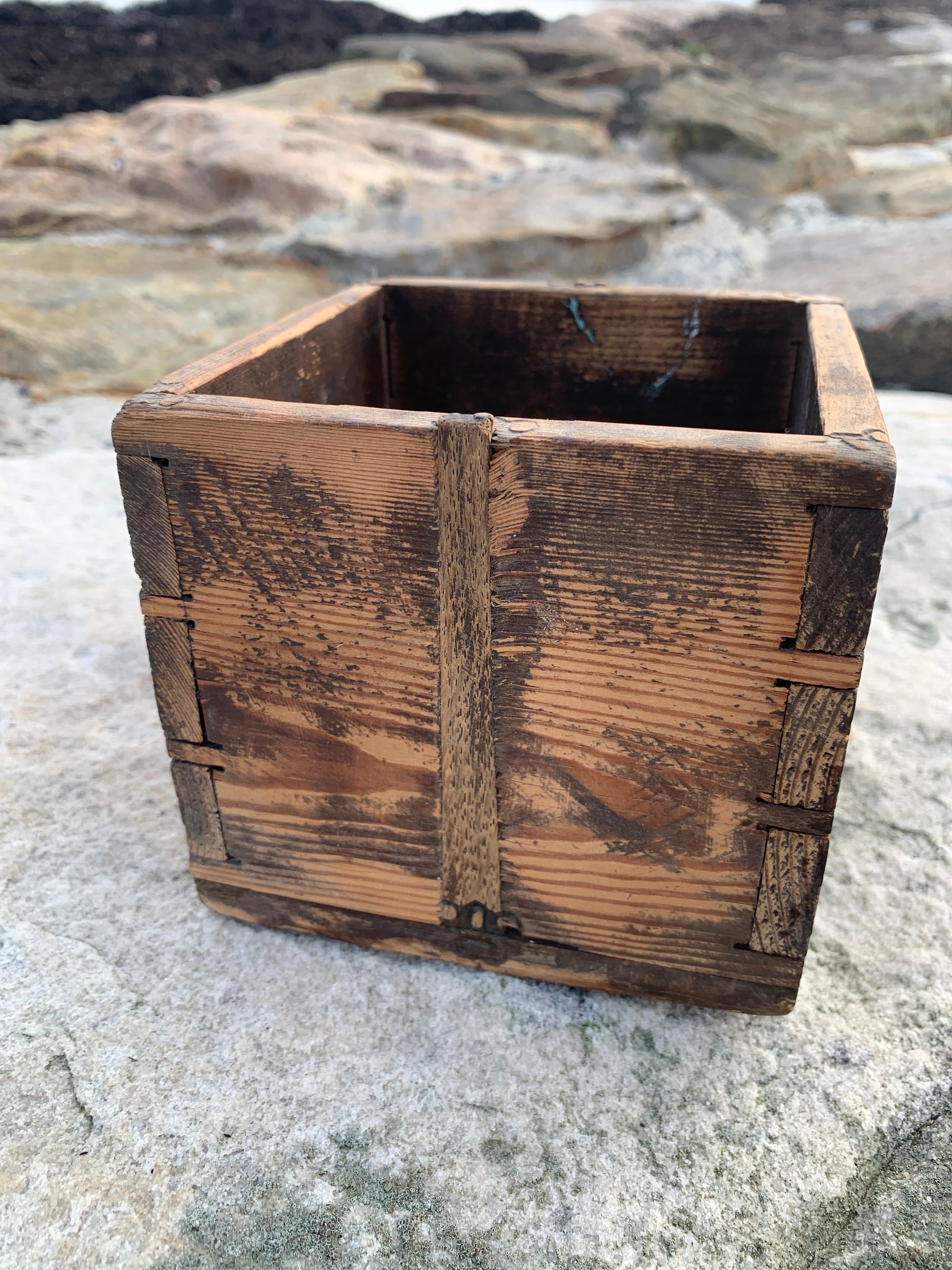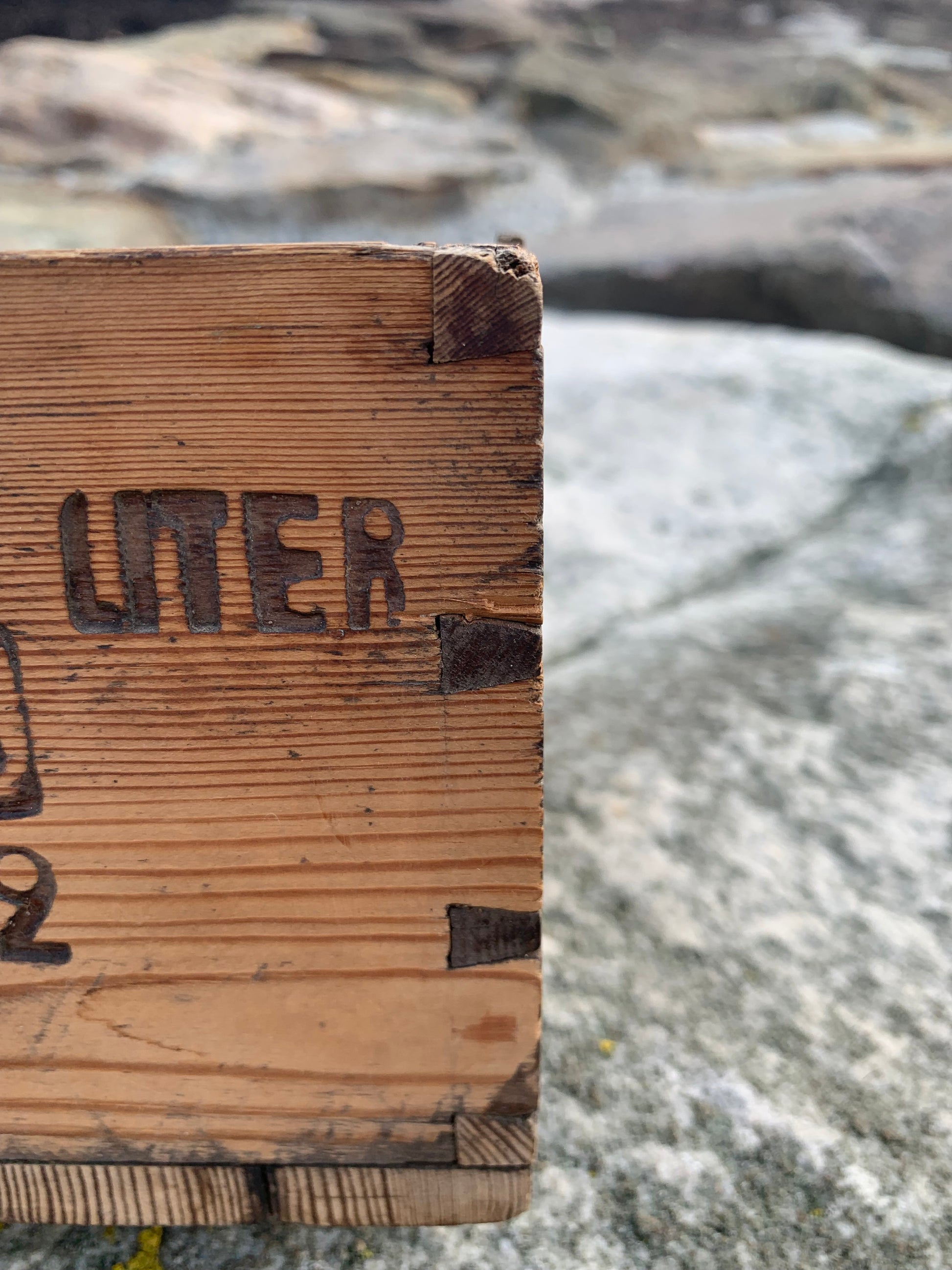 Wunderschöne, alte Holzkiste mit Gravur. Die Kiste stammt aus einer schwedischen Bäckerei, wo sie als Zielscheibe diente. Sie hat eine charmante Patina.