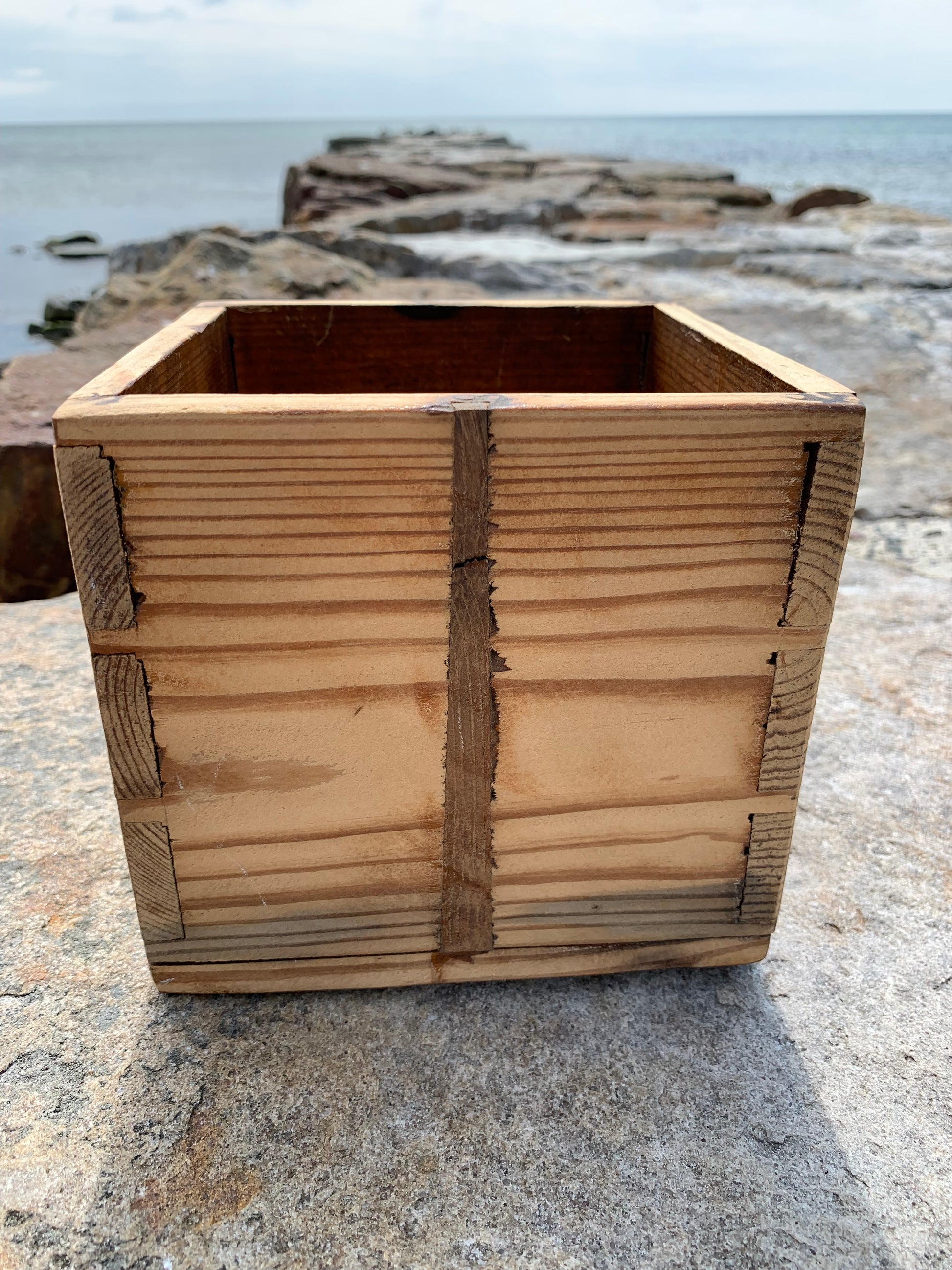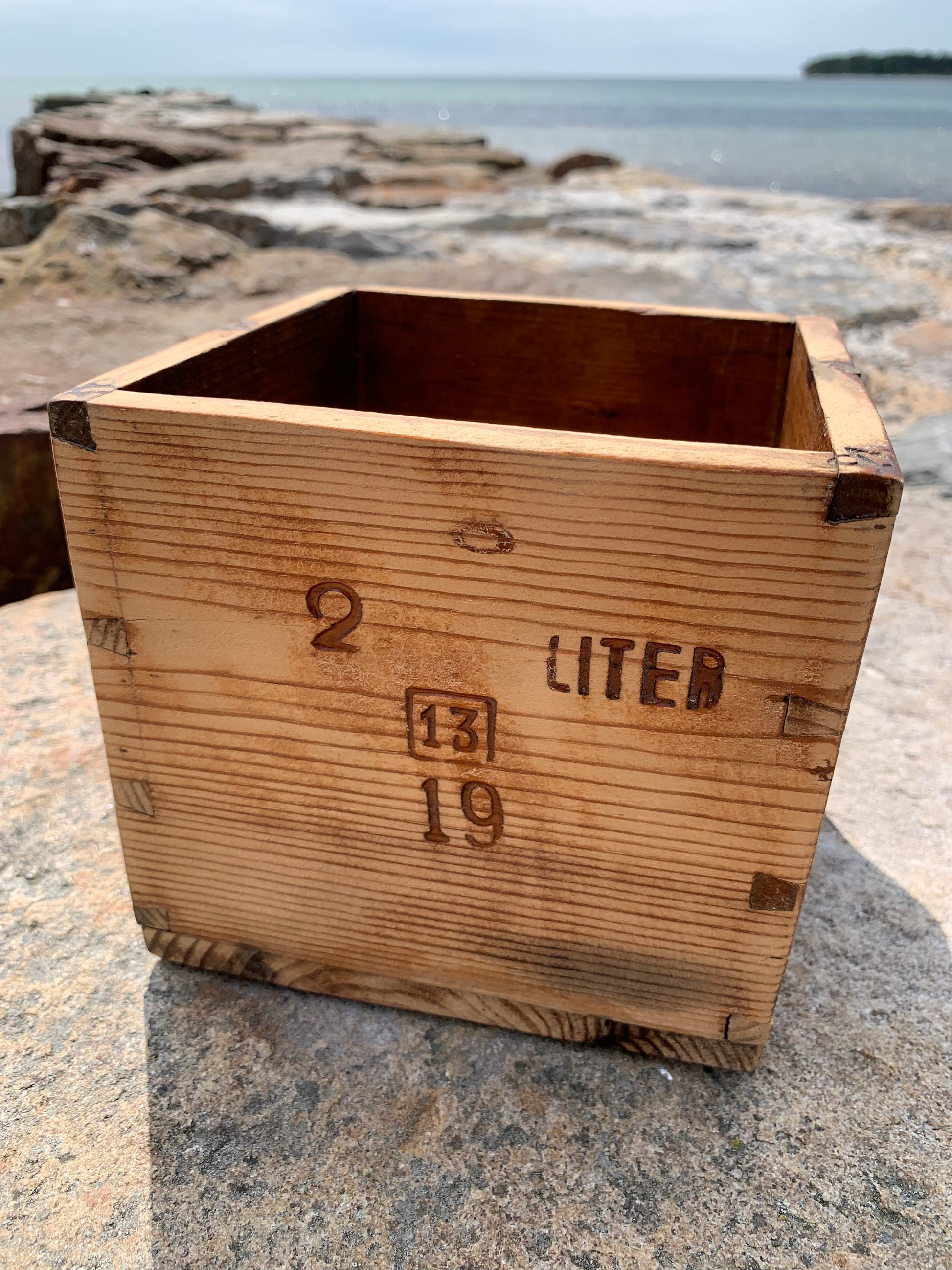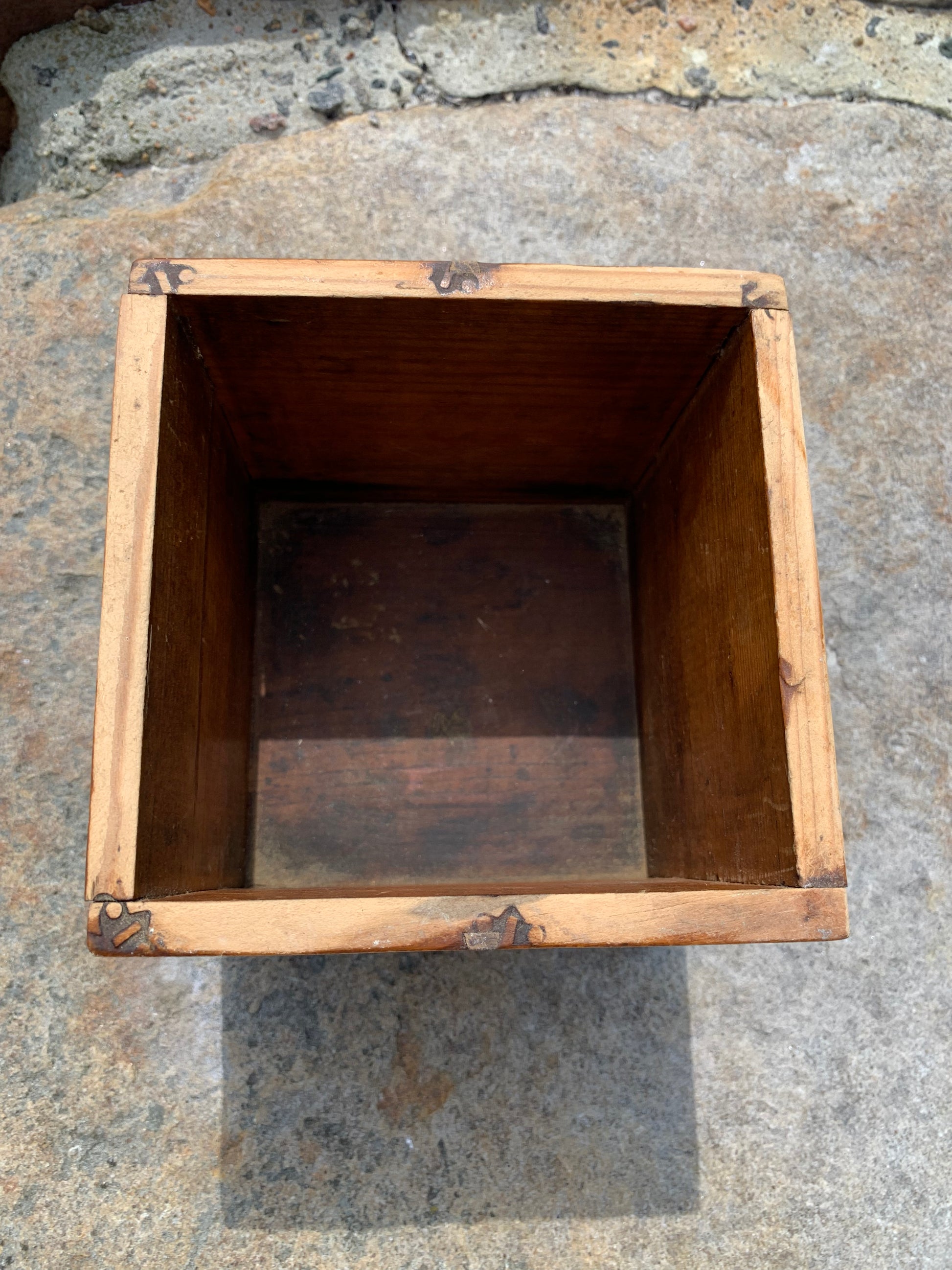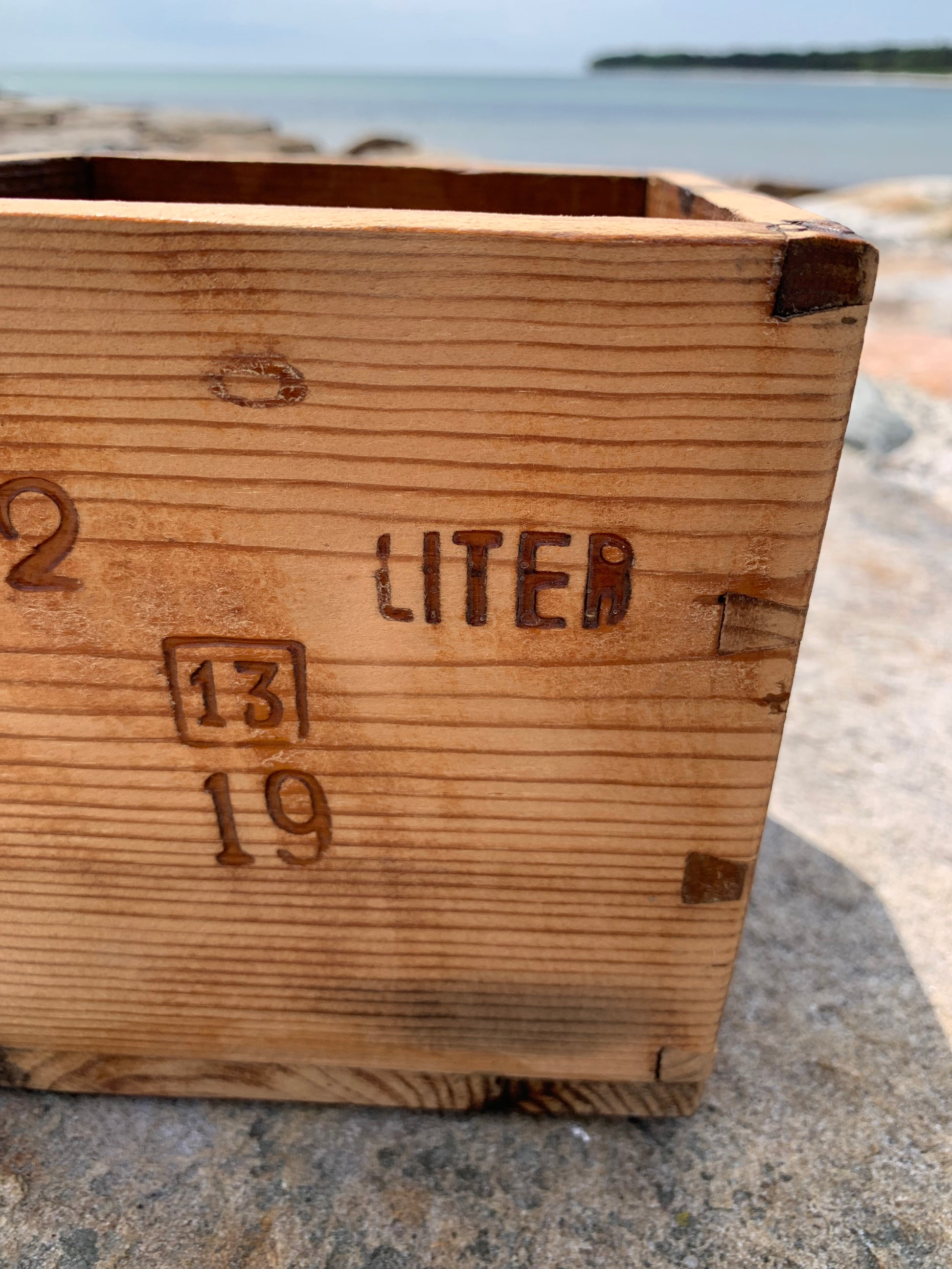Schöne alte Holzkiste mit Gravur. Die Kiste stammt aus einer schwedischen Bäckerei, wo sie als Zielscheibe verwendet wurde. Die Kiste hat eine schöne und charmante Patina.