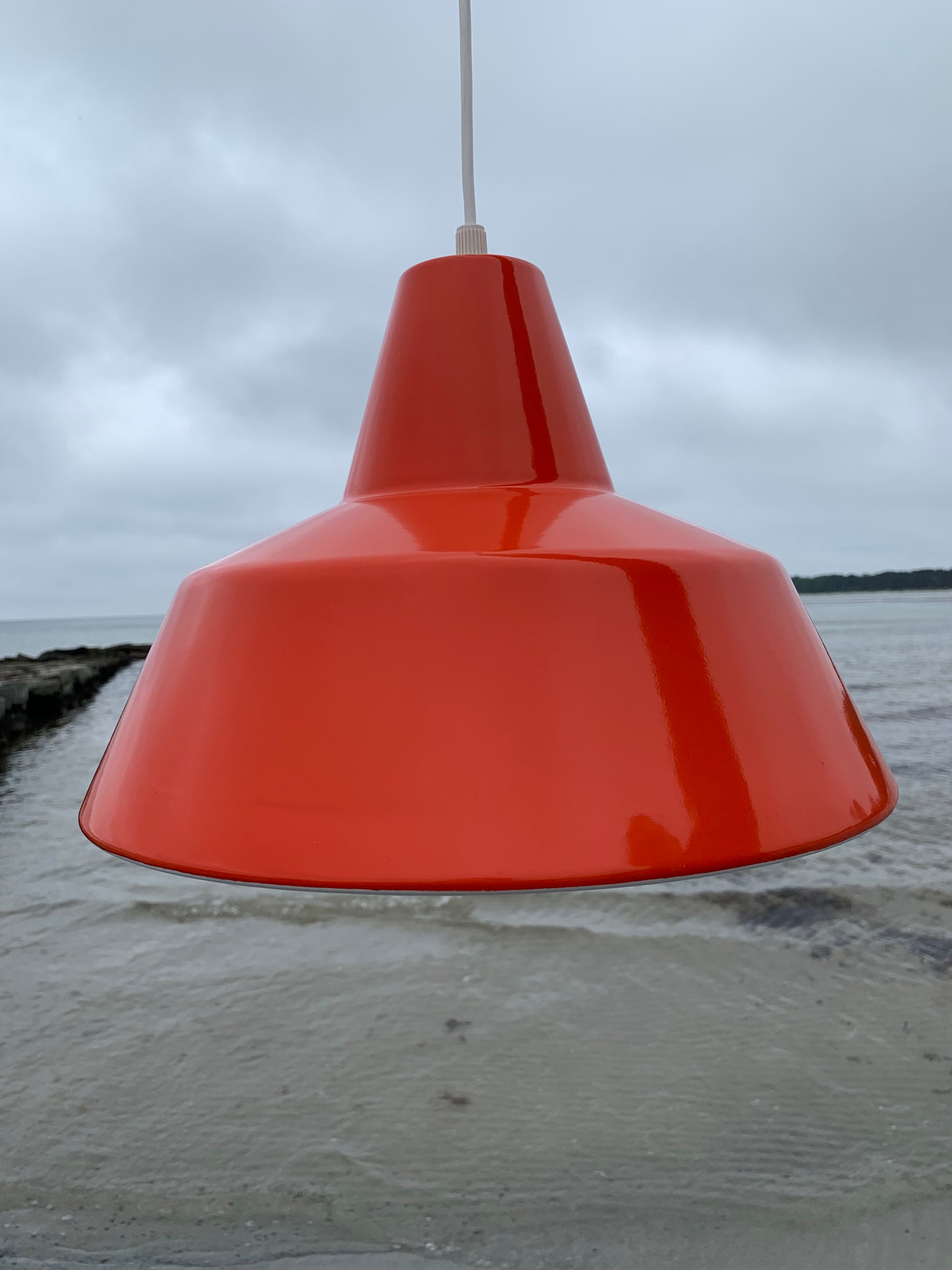Werkstattlampe in klassischer Ausführung. Die Lampe weist einige altersbedingte Gebrauchsspuren und einen einzelnen kleinen Chip auf (siehe Foto). Insgesamt ist es jedoch in einem sehr guten Vintage-Zustand.