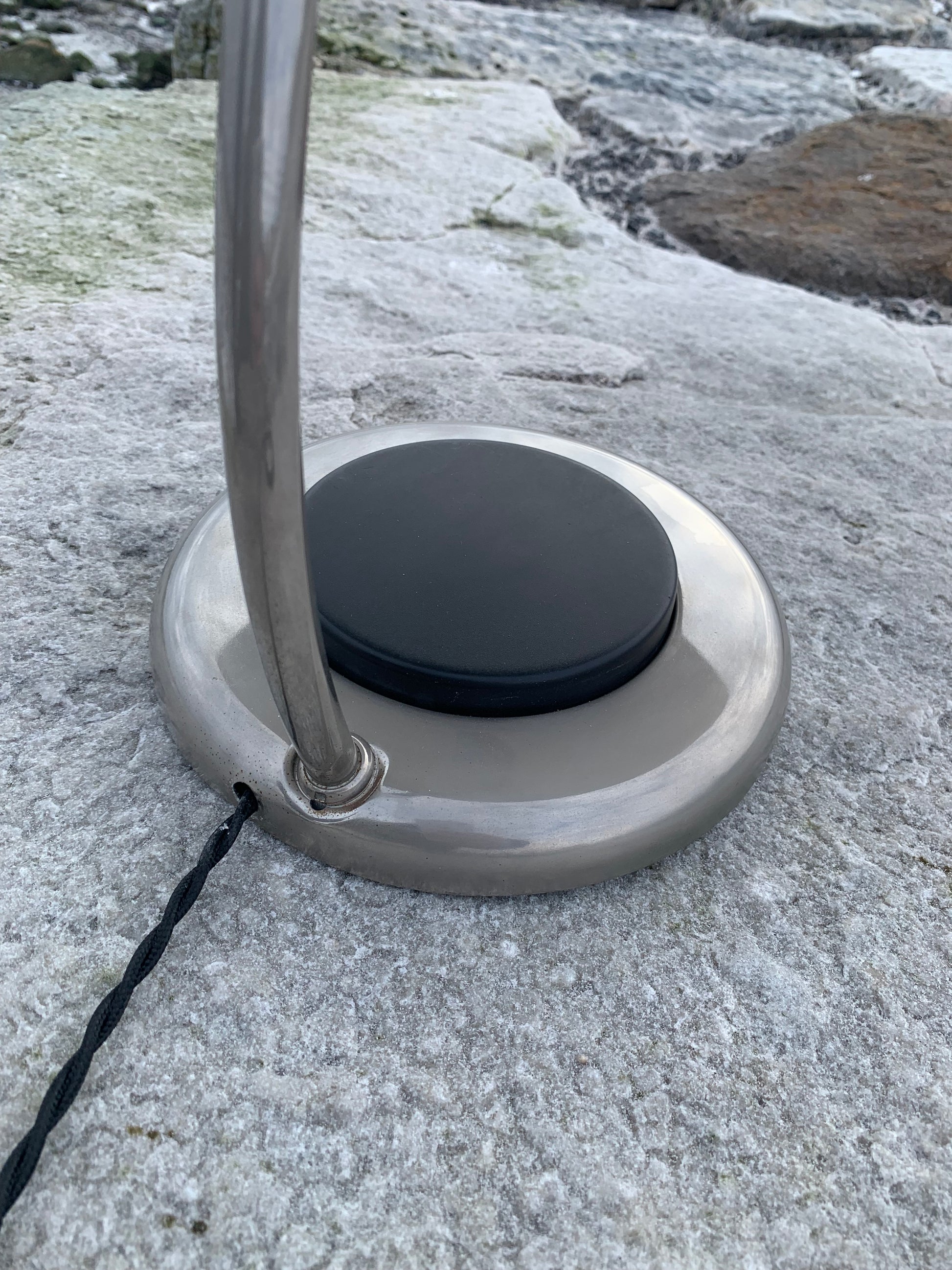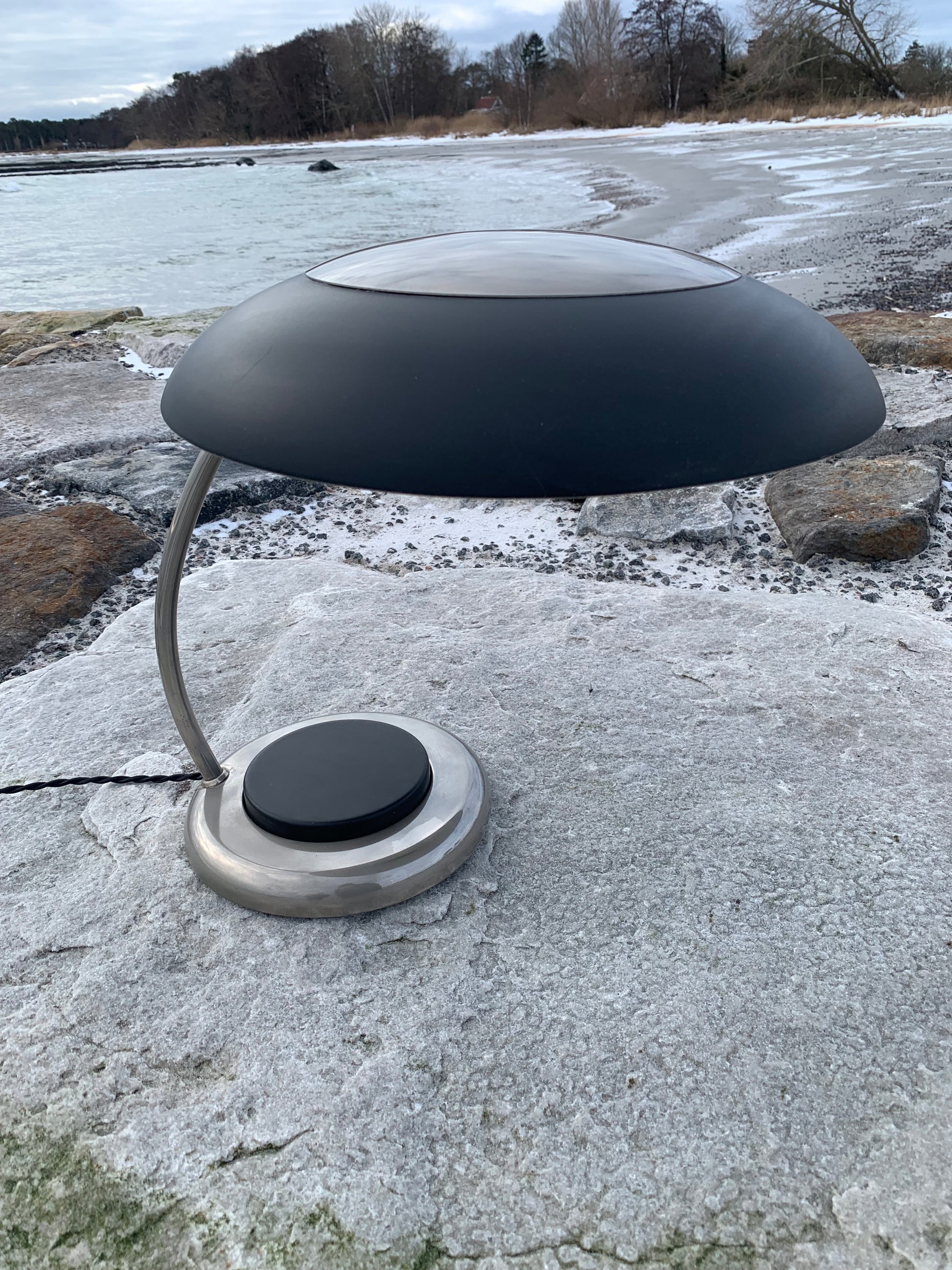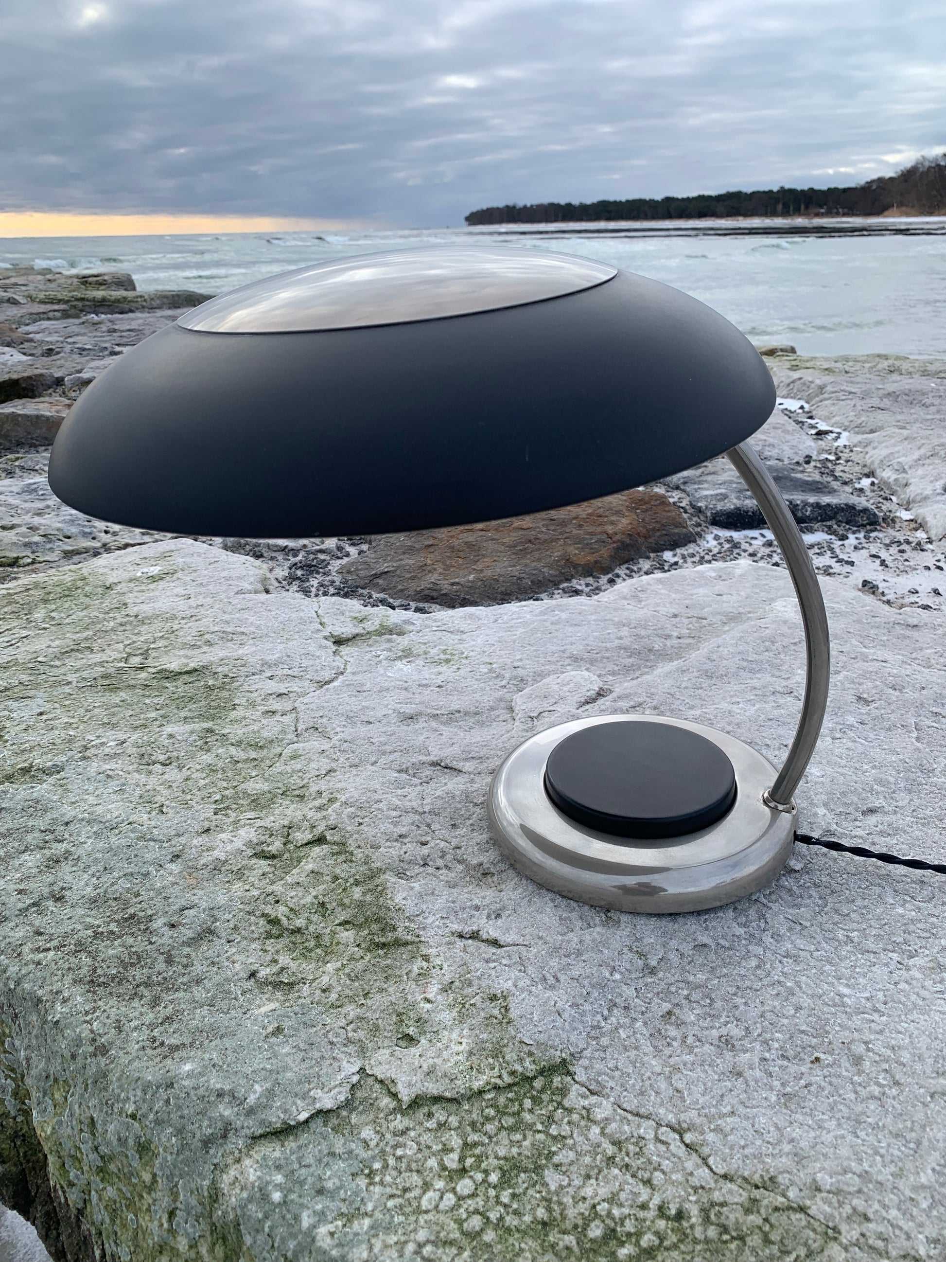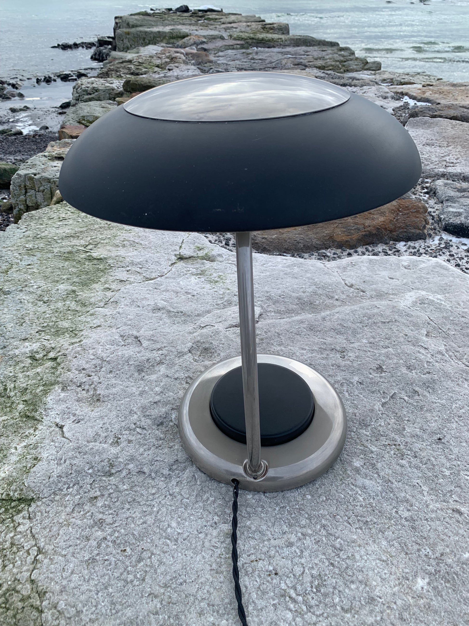 VEB NARVA LEUCHTENBAU LENGEFELD UFO-Lampe. Die Lampe stammt vermutlich aus den 1960er-Jahren und präsentiert sich in einem wunderschönen Zustand mit den altersbedingten Gebrauchsspuren, die man von einer Lampe dieses Alters erwarten würde. Ein witziges, seltenes und schönes Detail ist der sehr große Druckschalter (zum Einschalten der Lampe), der fast den gesamten Lampenfuß einnimmt. Insgesamt befindet sich die Lampe in einem sehr schönen Vintage-Zustand.